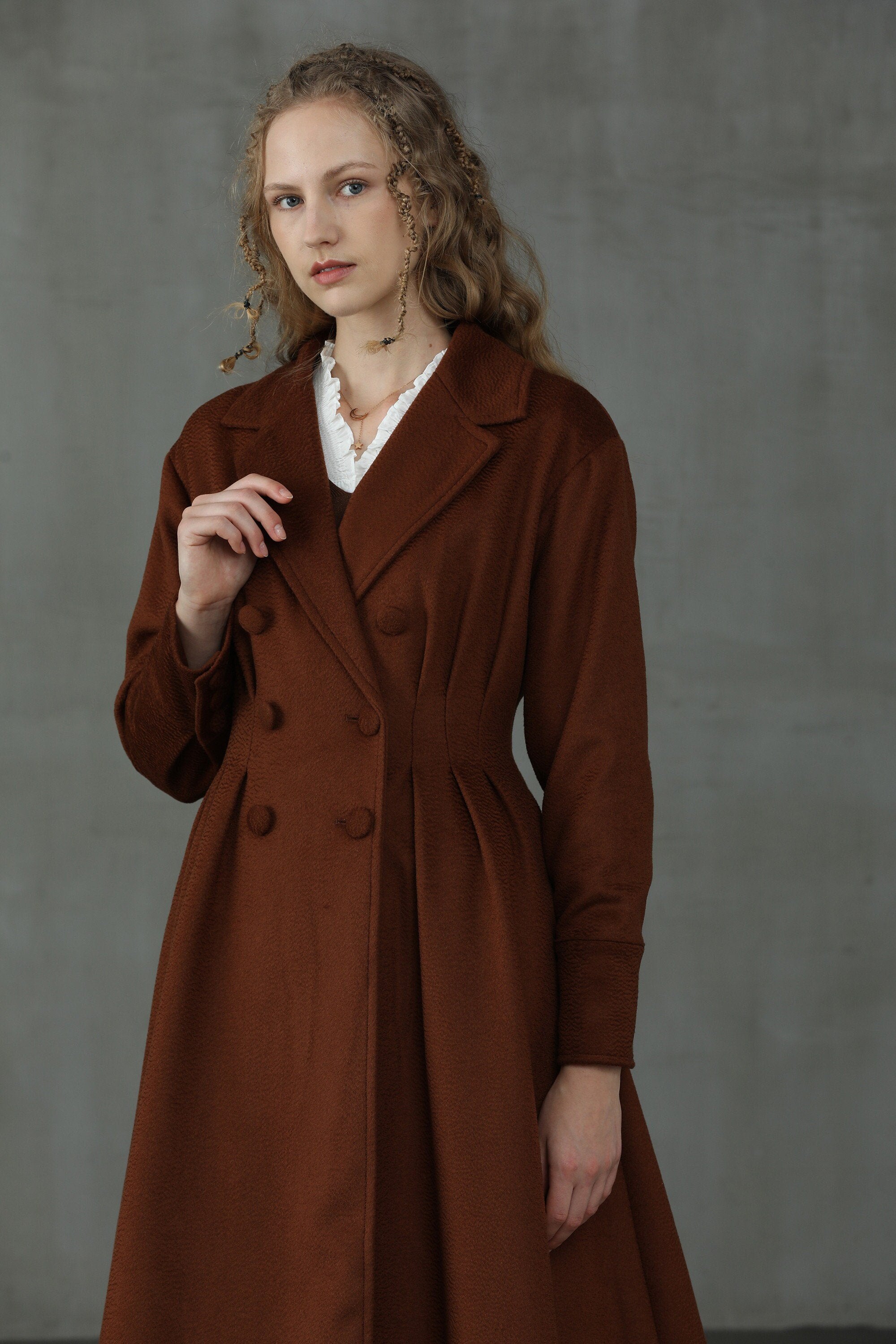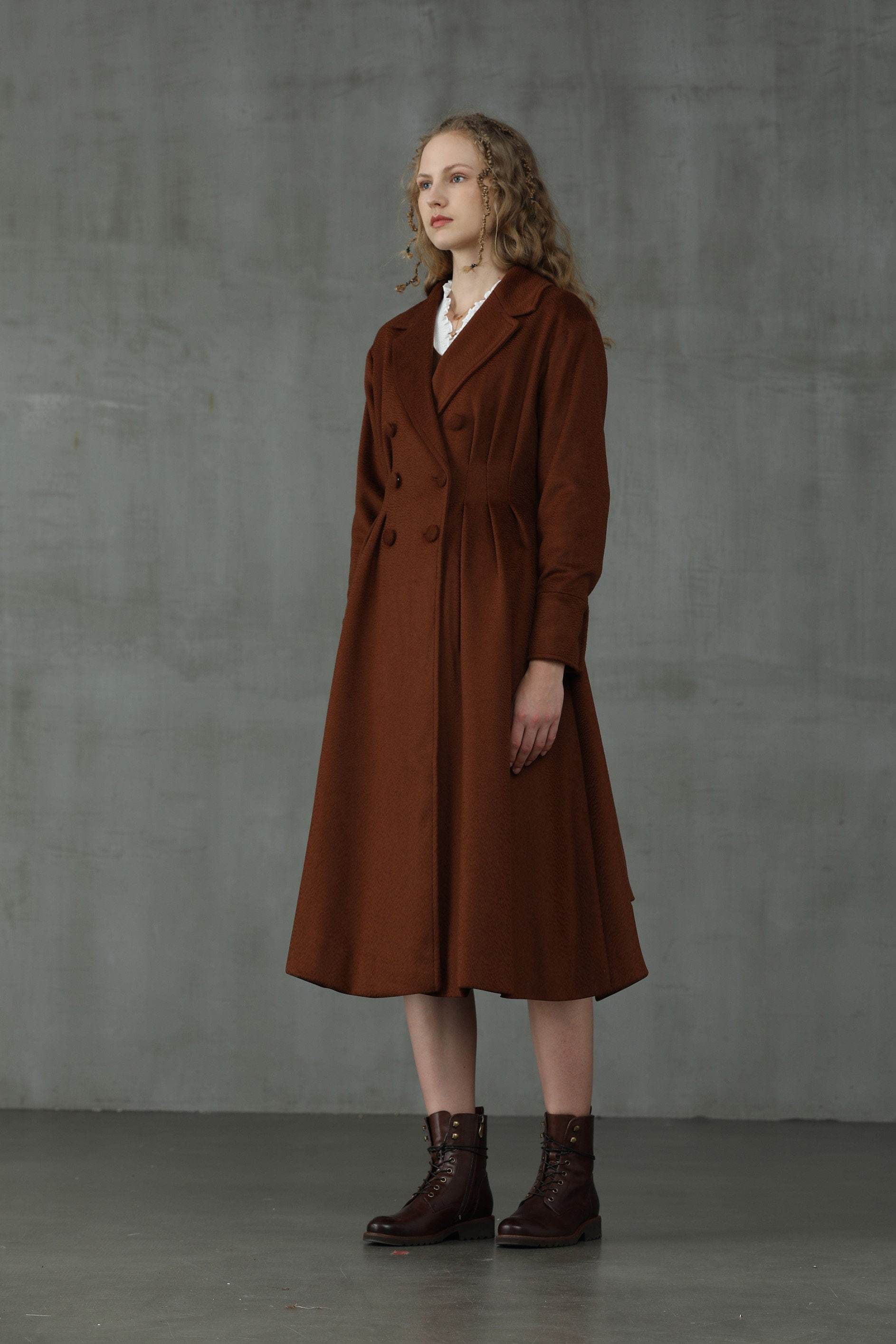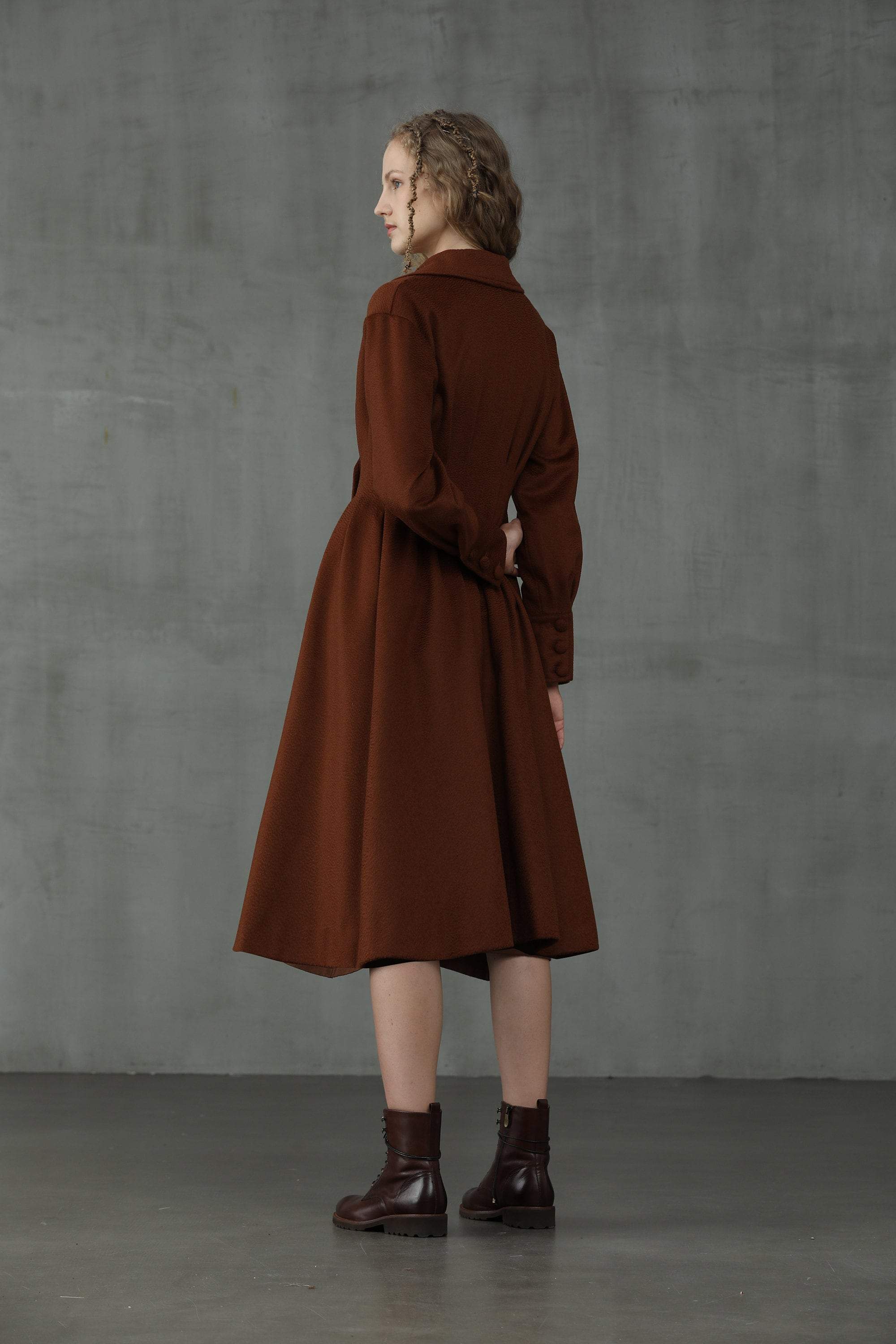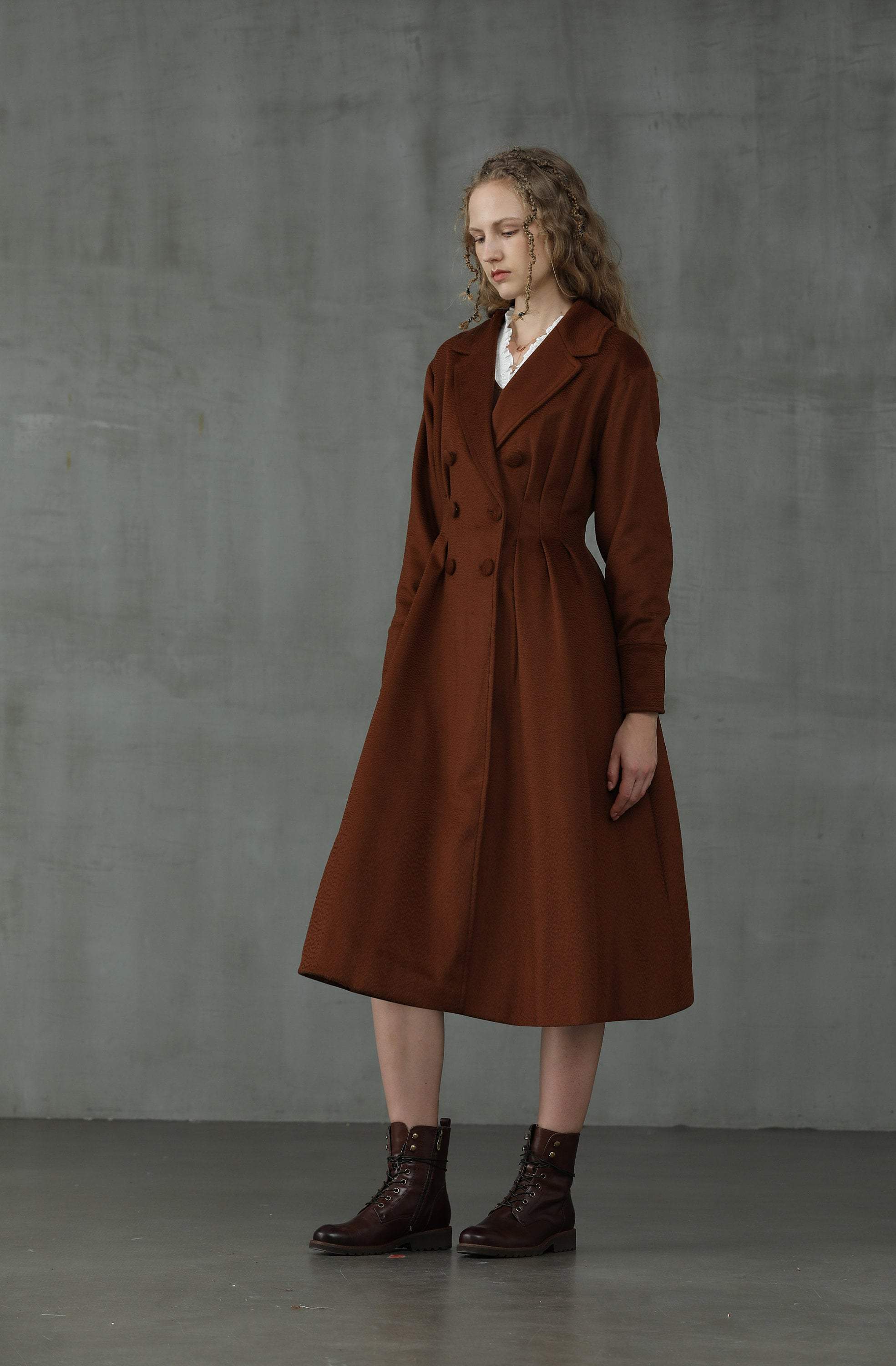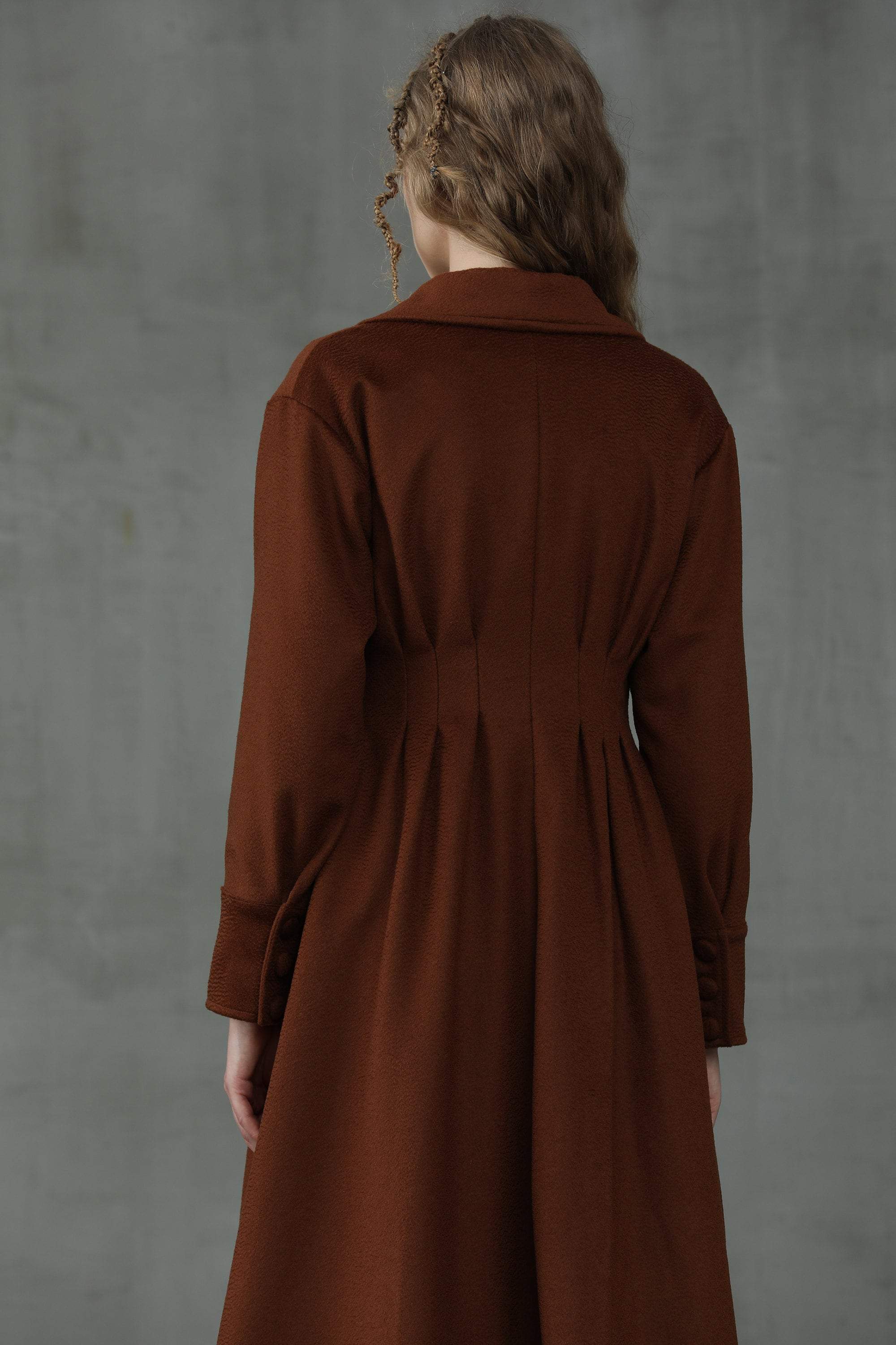 This trench coat has been crafted from 100% napping wool in a brick brown hue that, coupled with an flared cut, adds an unconventional finishing touch to the design.