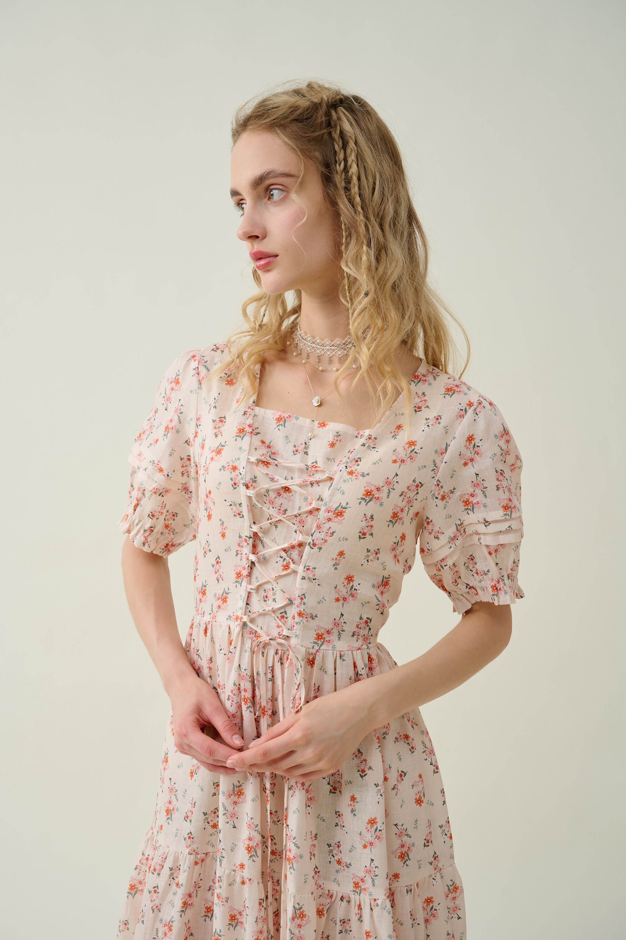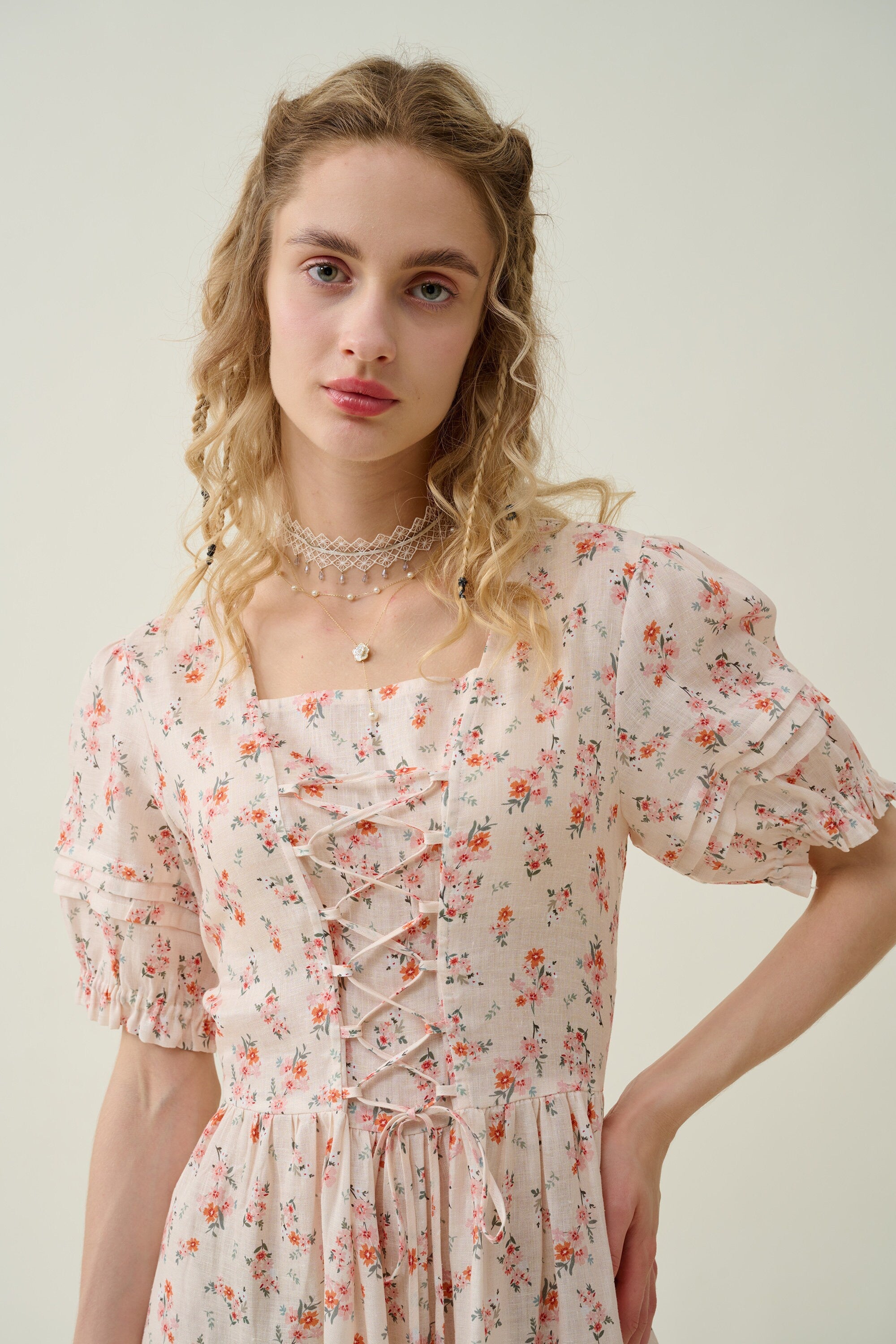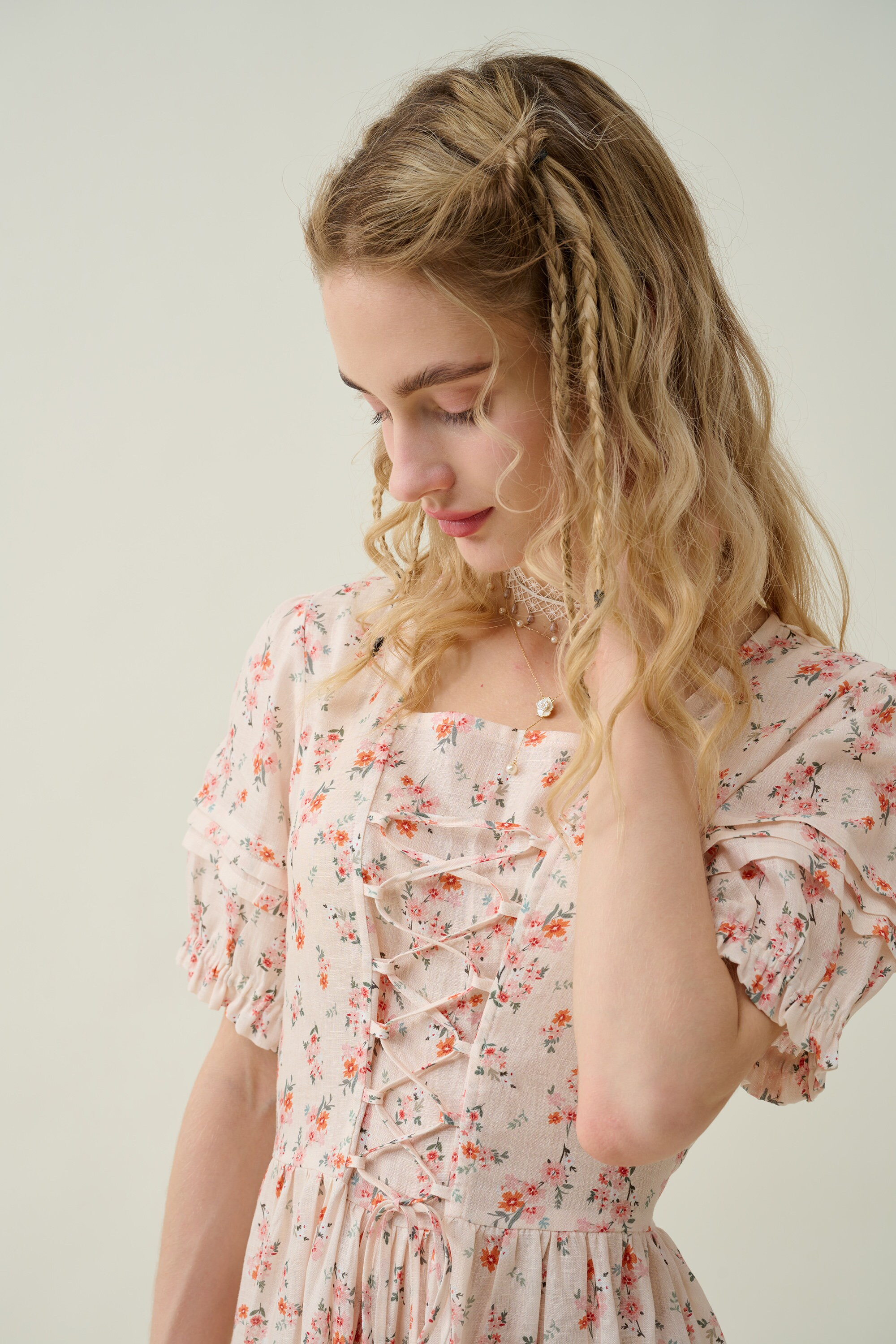 Cut in a breezy, tiered silhouette, it has delicate puffed sleeves and lace up detailing for a whimsical, romantic look.