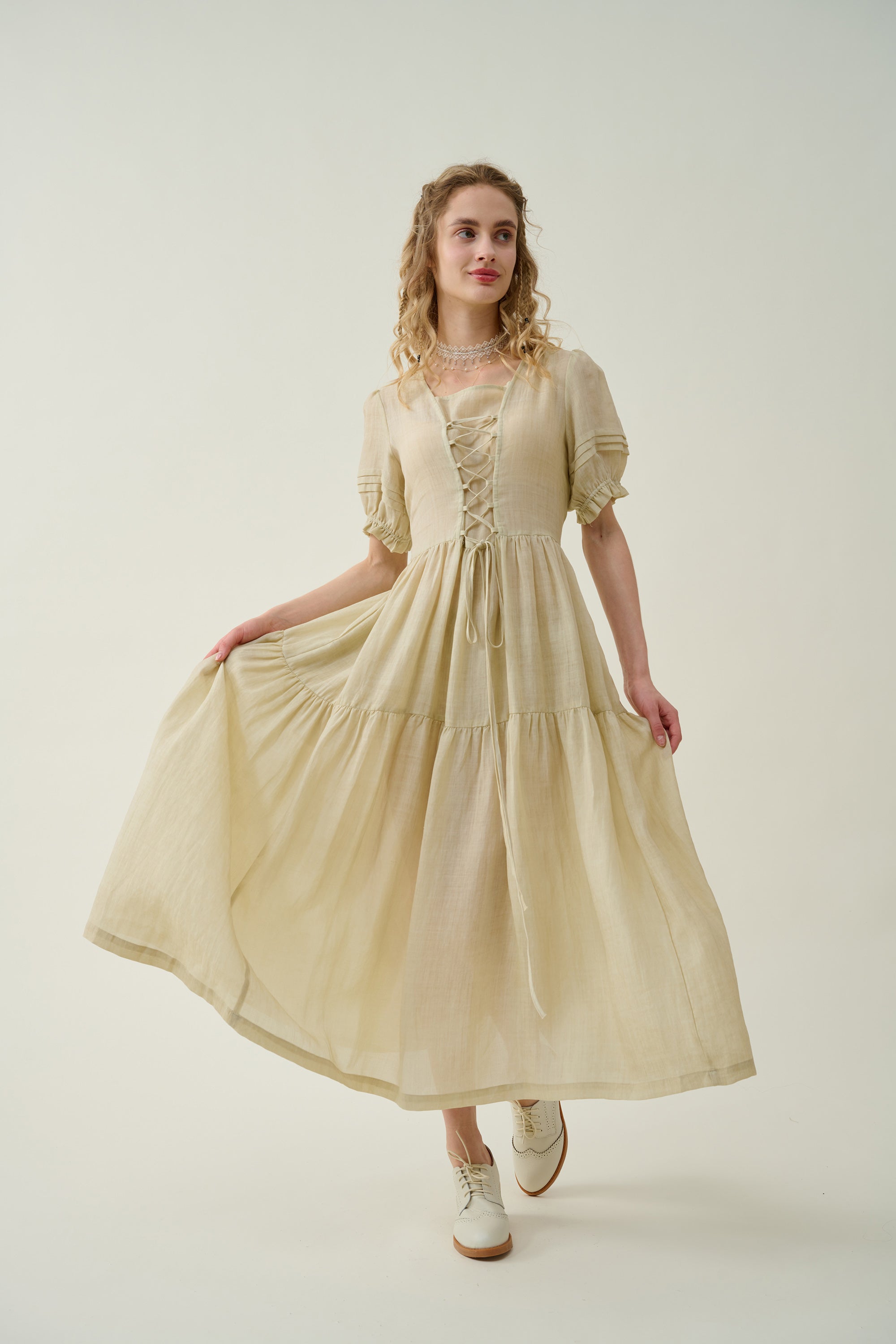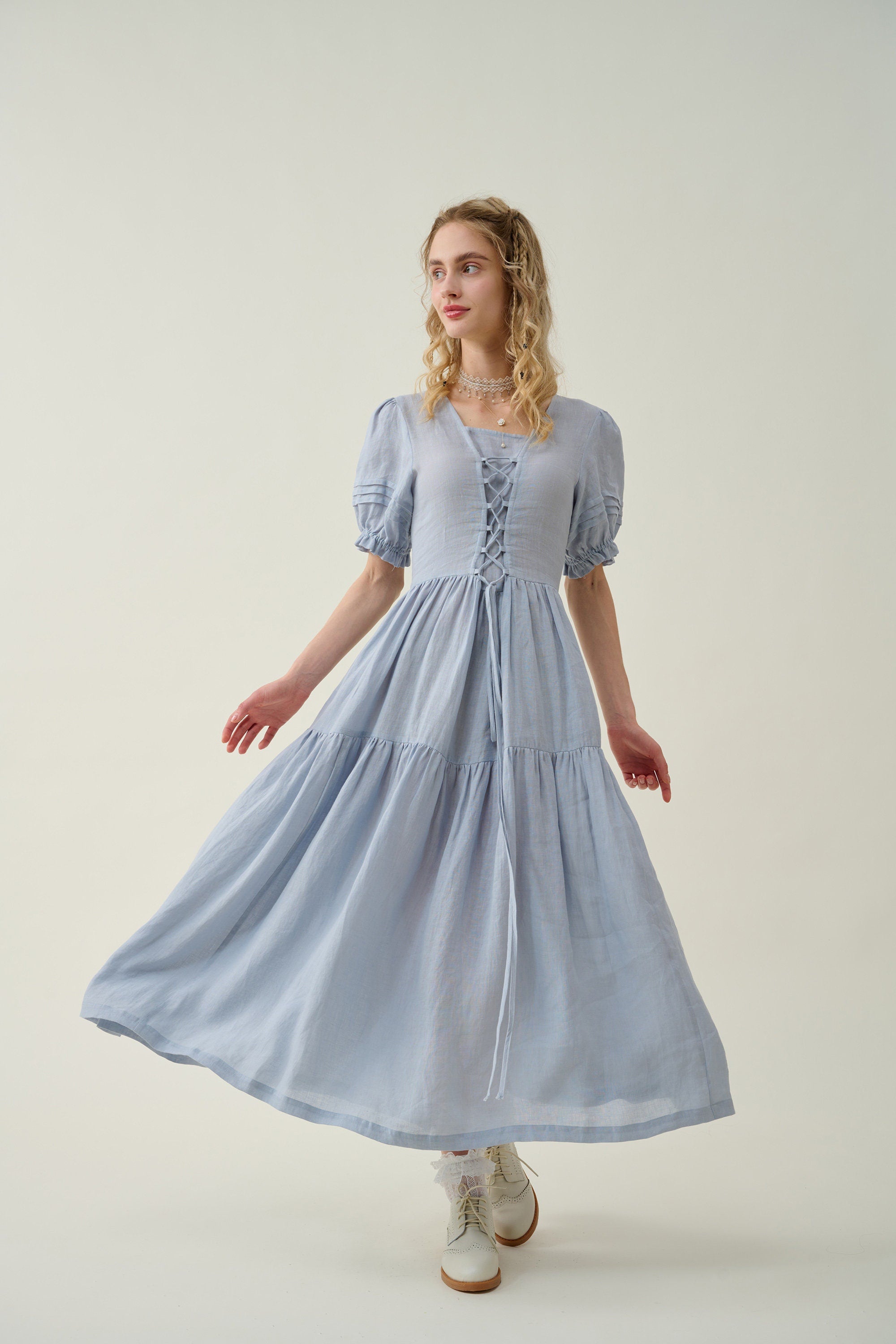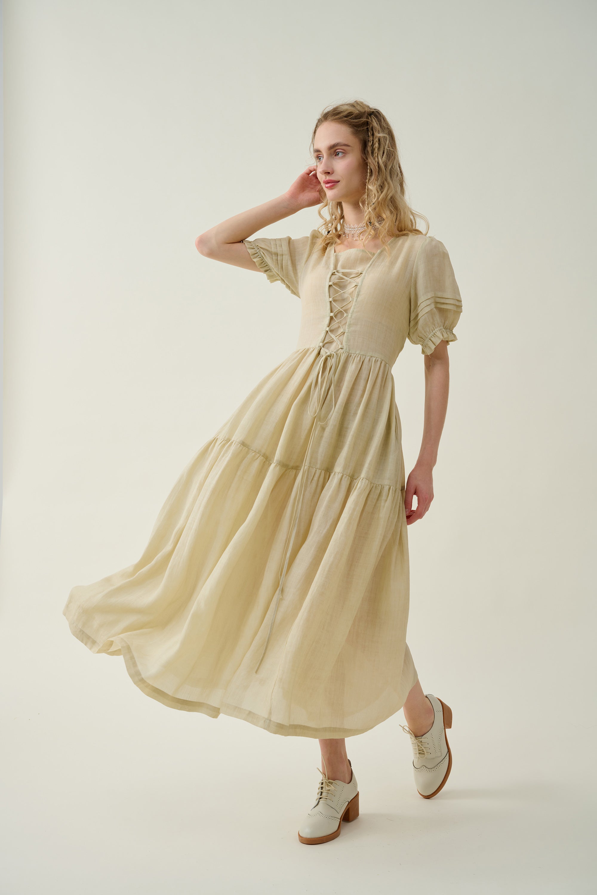 Cut in a breezy, tiered silhouette, it has delicate puffed sleeves and lace up detailing for a whimsical, romantic look.