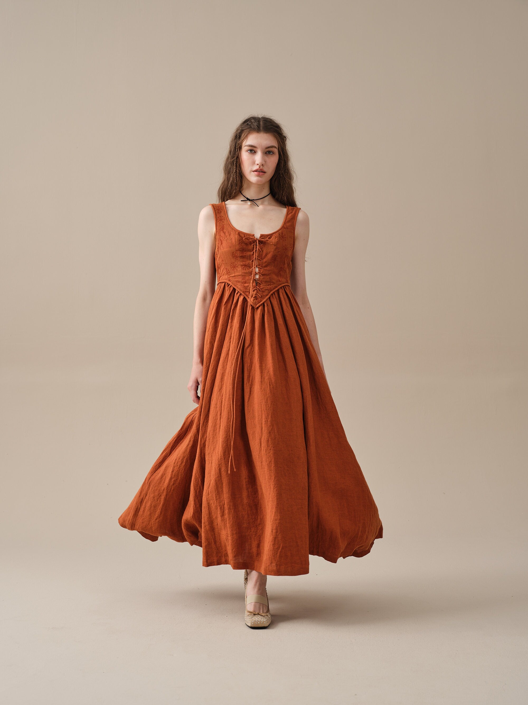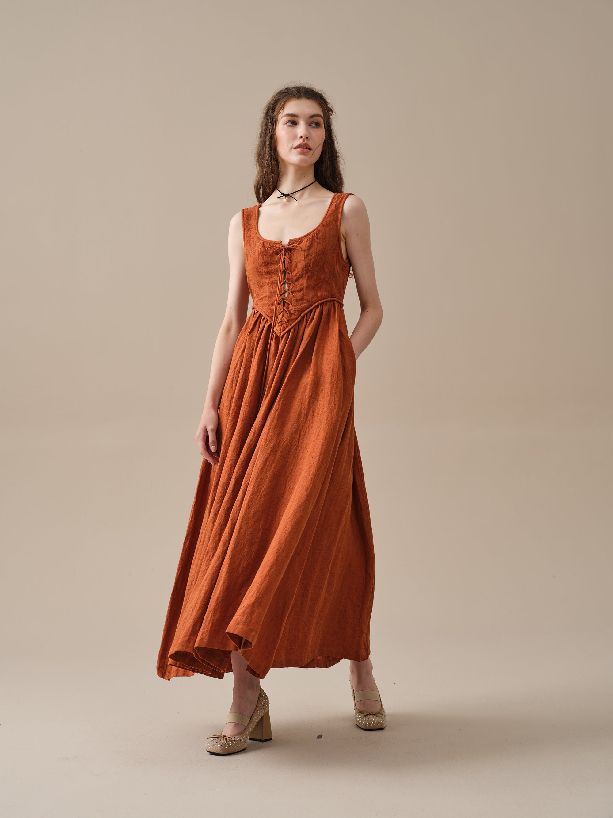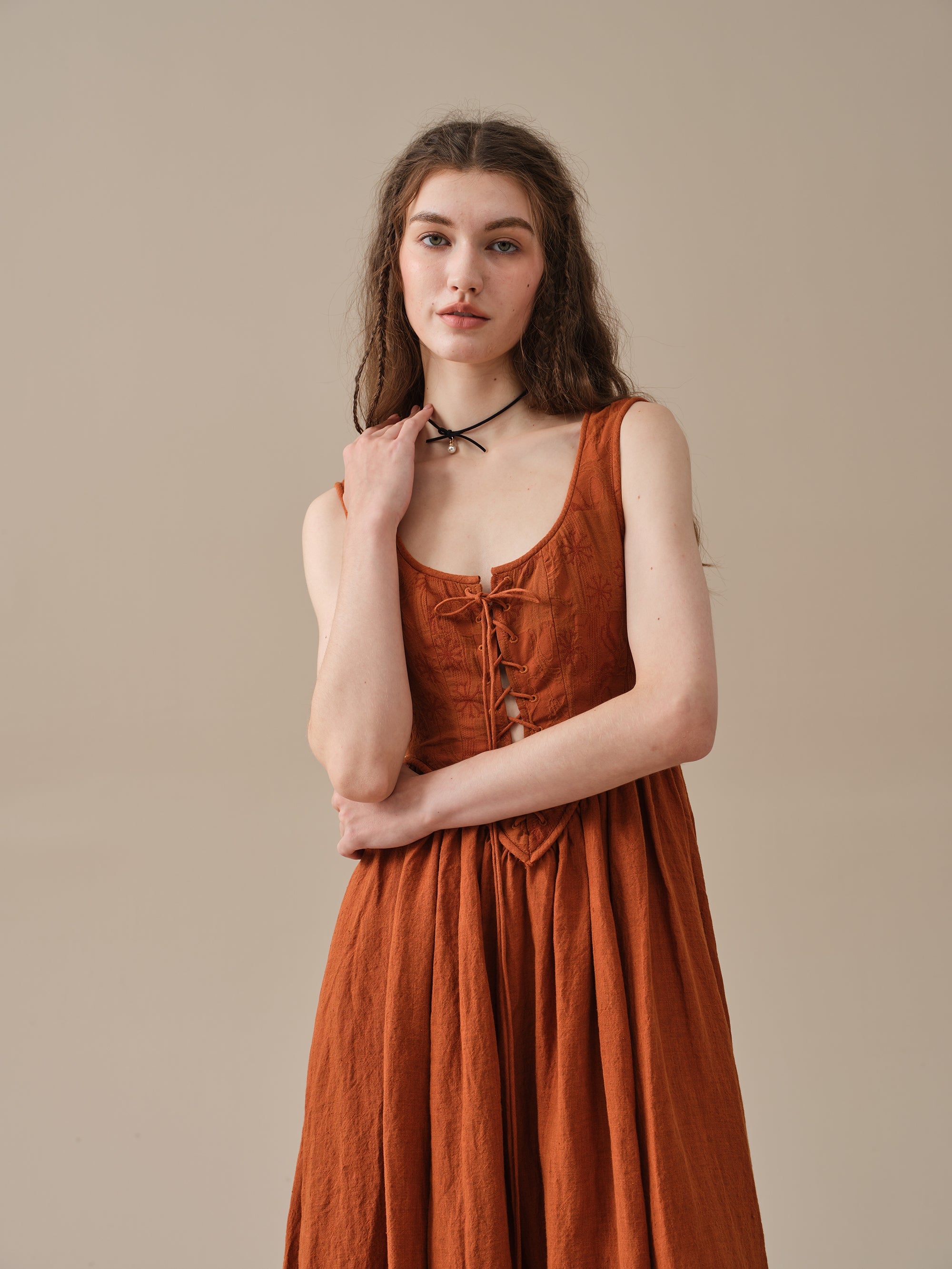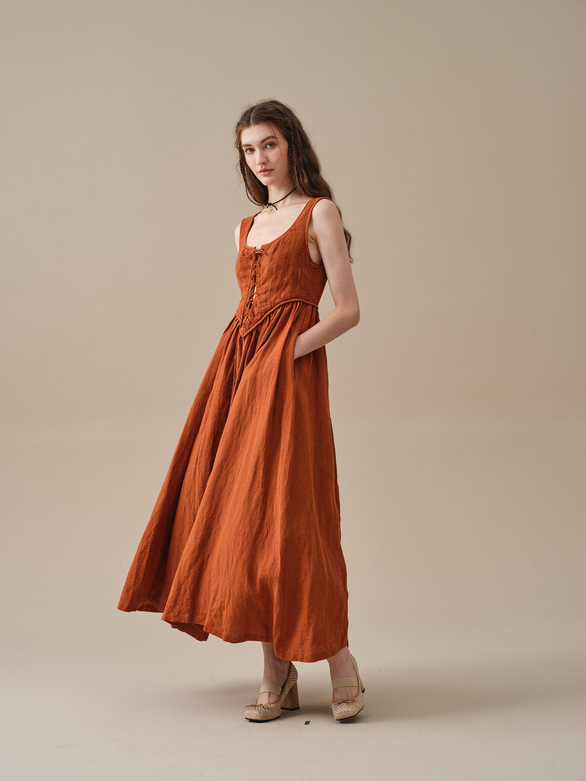 The delicate texture of the linen fabric brings an ethereal charm to this dress, allowing it to flow effortlessly with the body's movements. the lace up detail adds a romantic touch to the piece.
