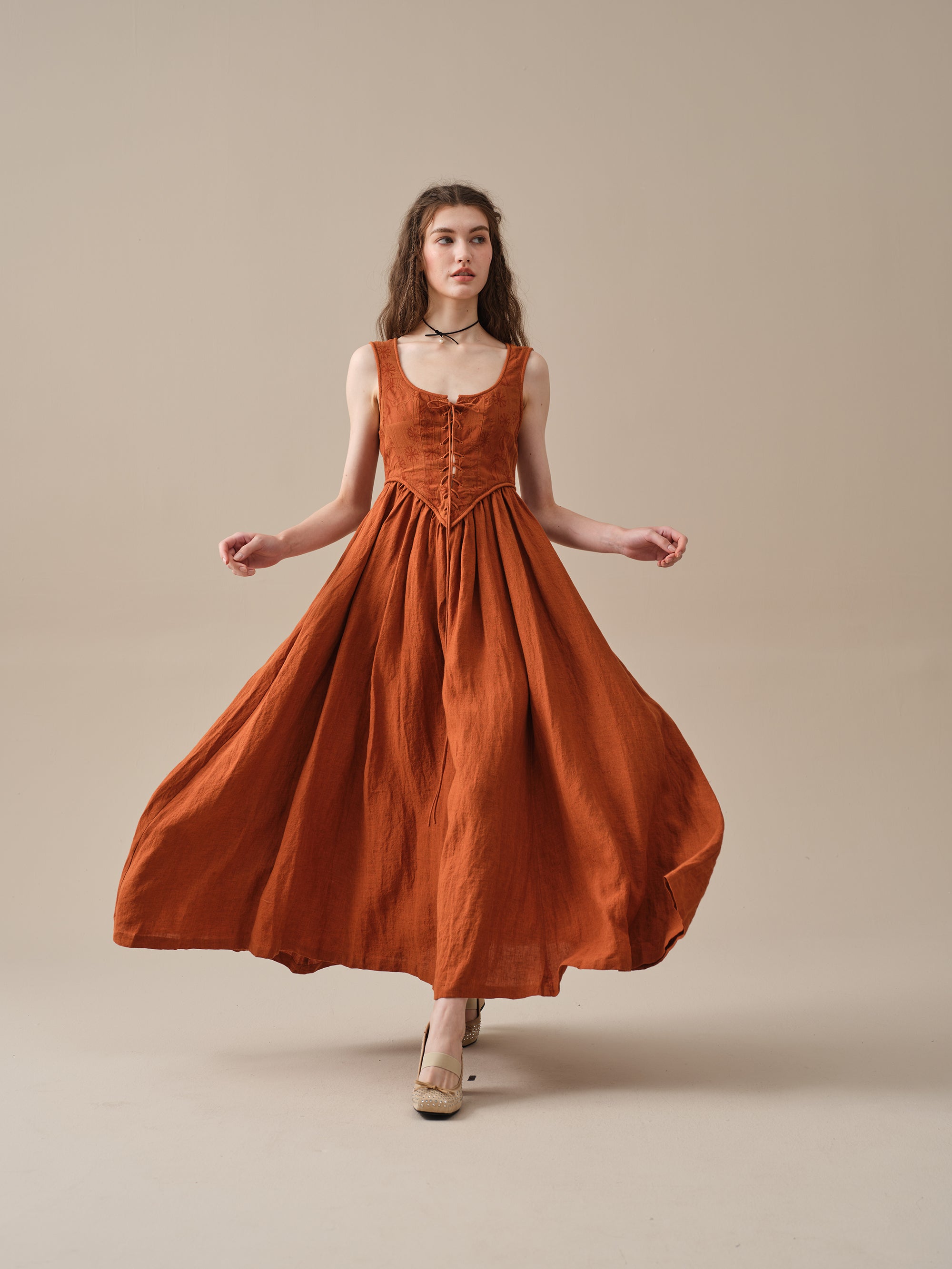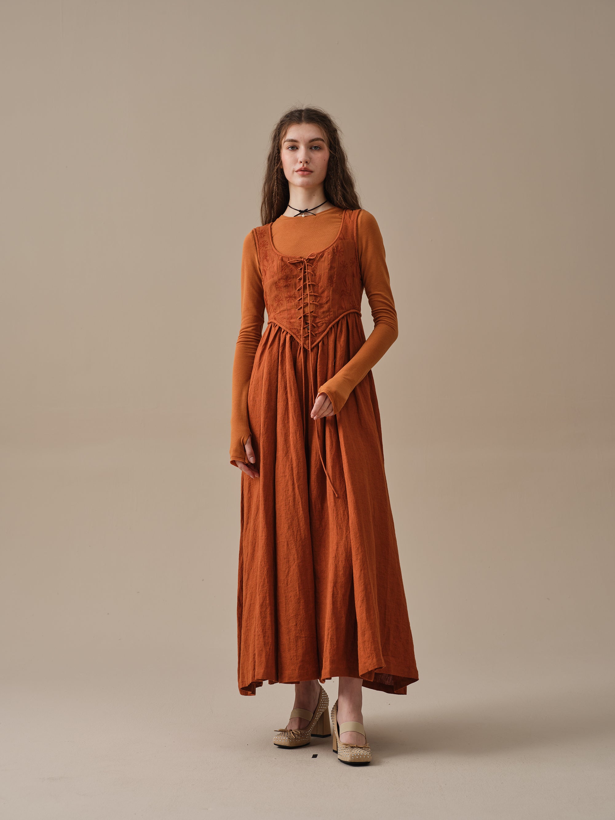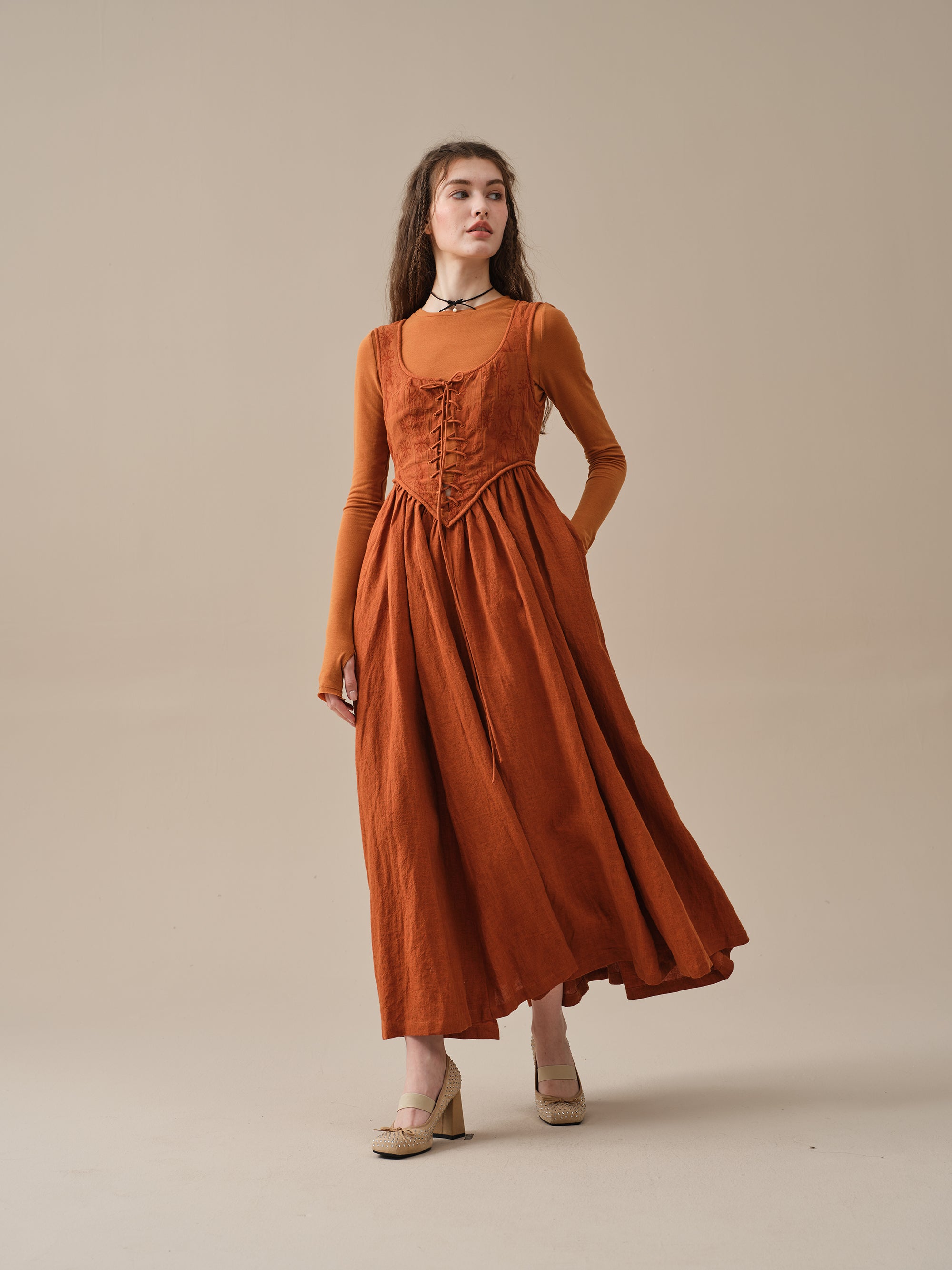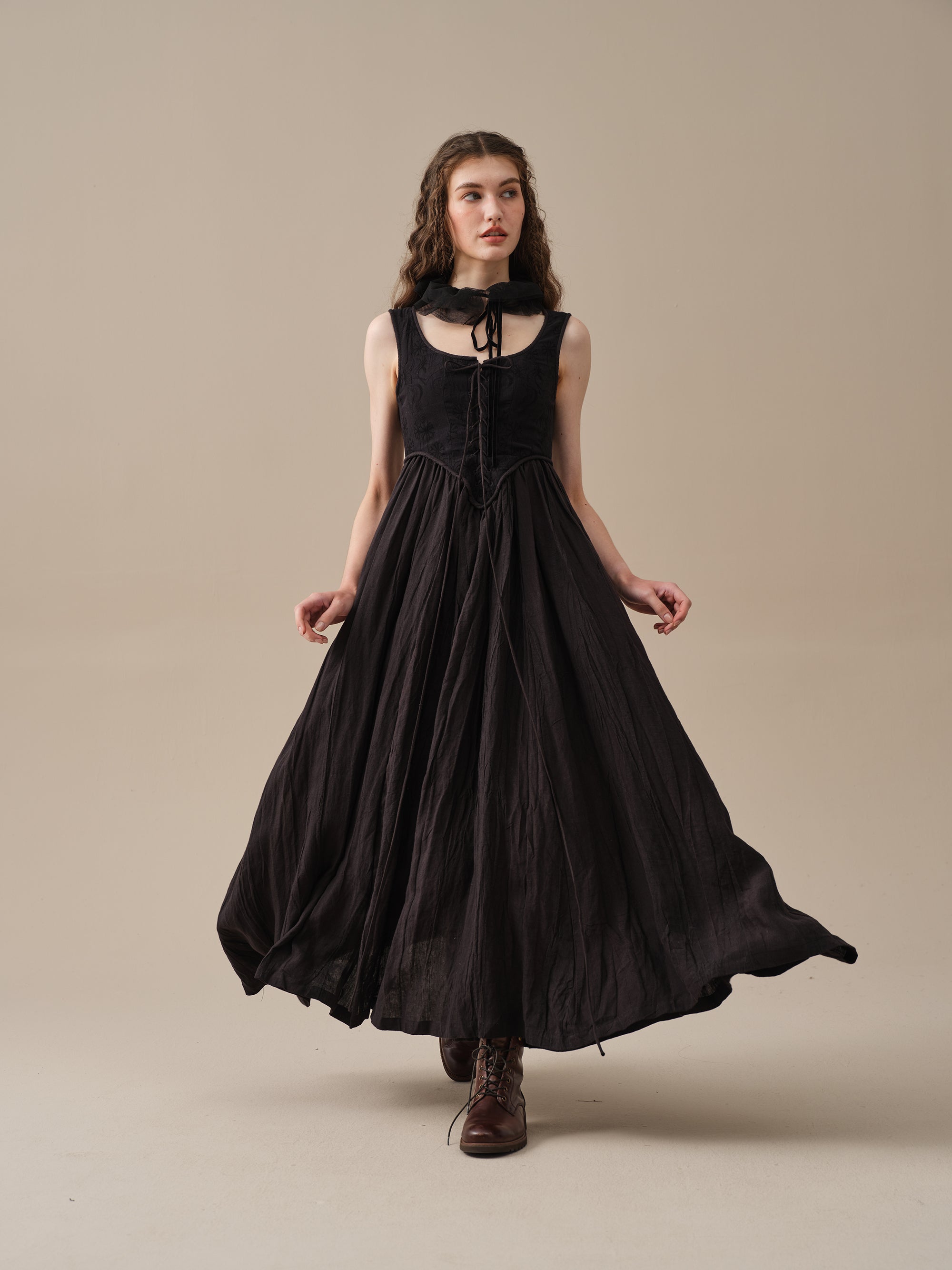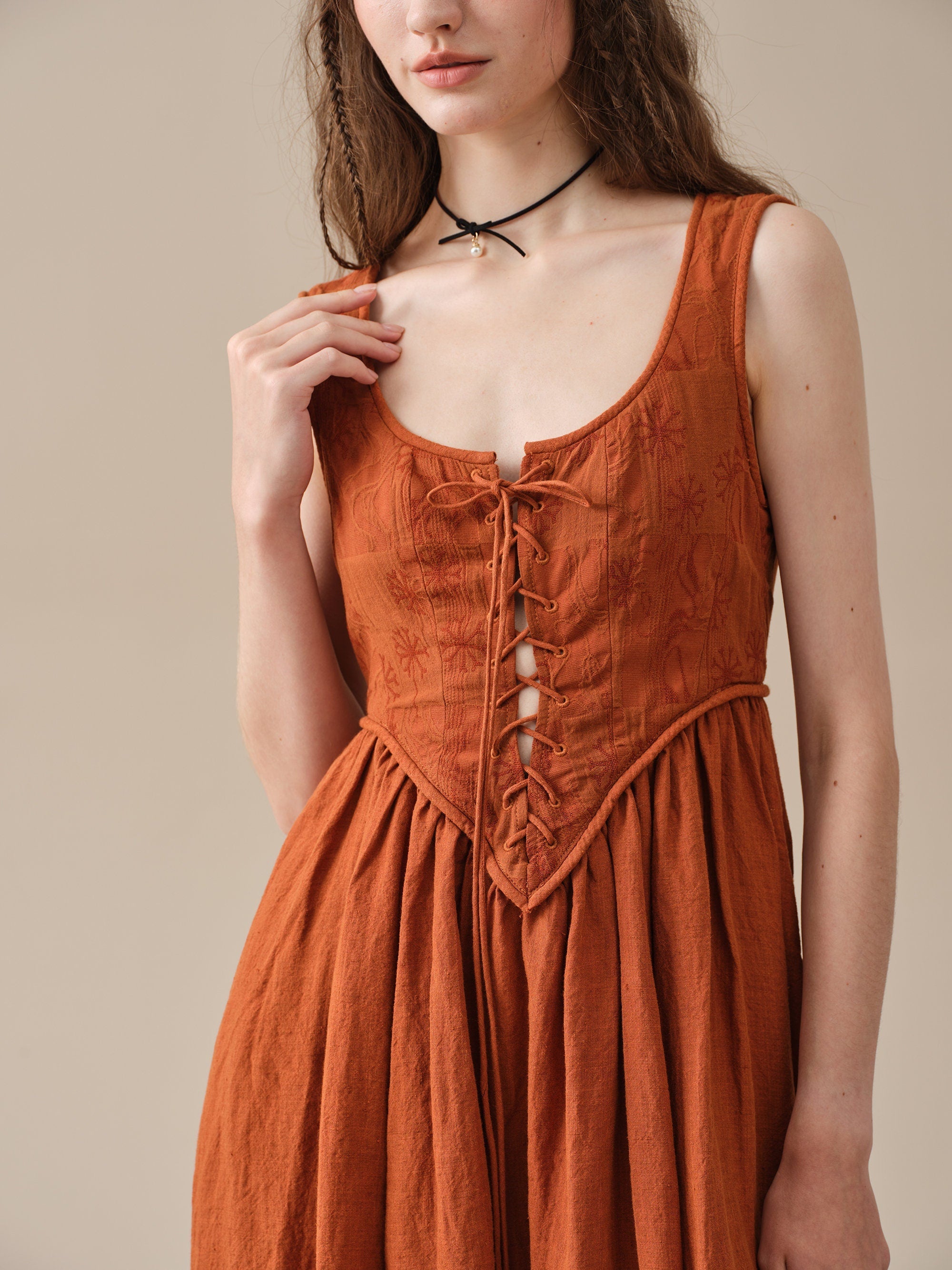 The delicate texture of the linen fabric brings an ethereal charm to this dress, allowing it to flow effortlessly with the body's movements. the lace up detail adds a romantic touch to the piece.