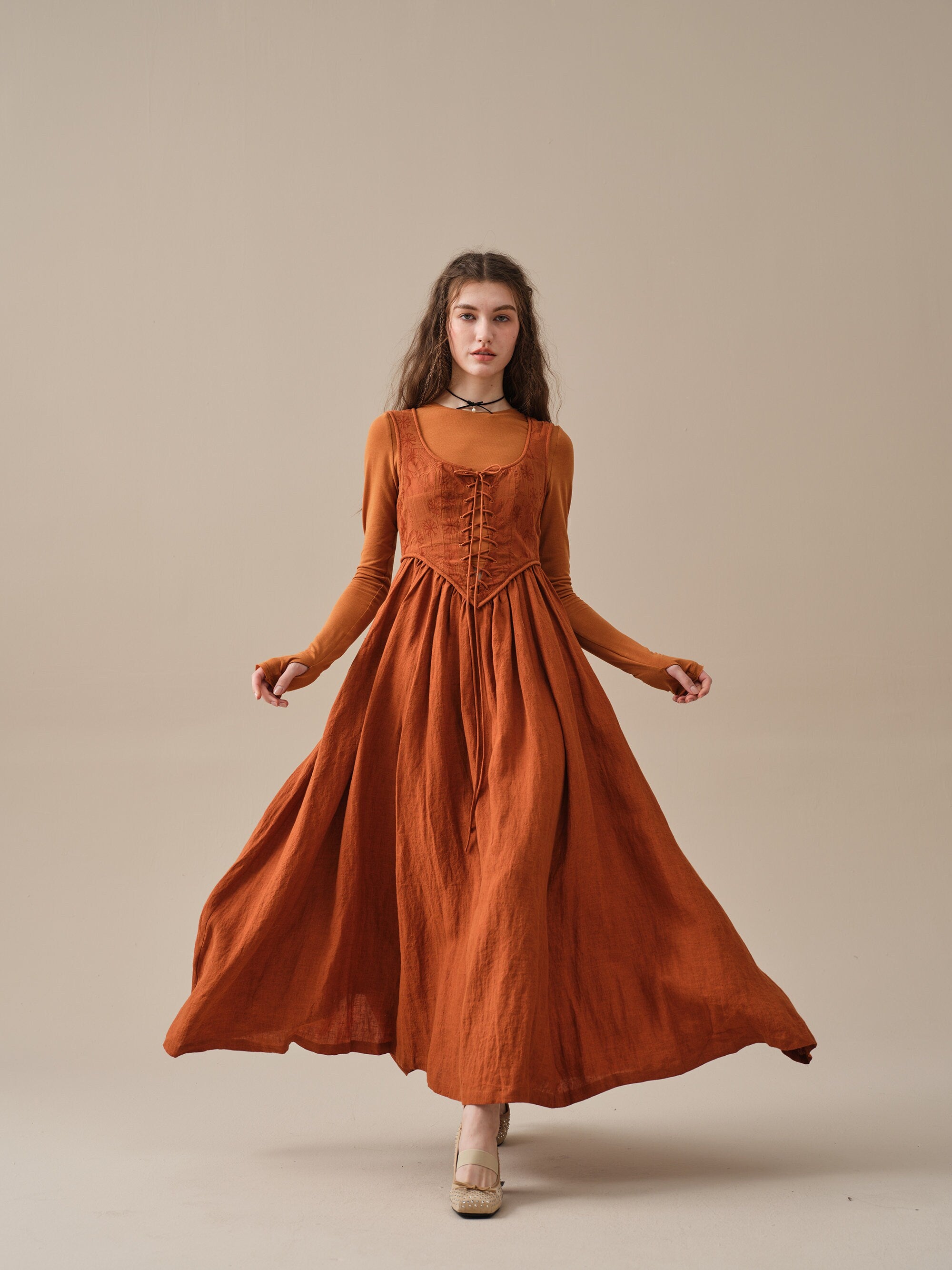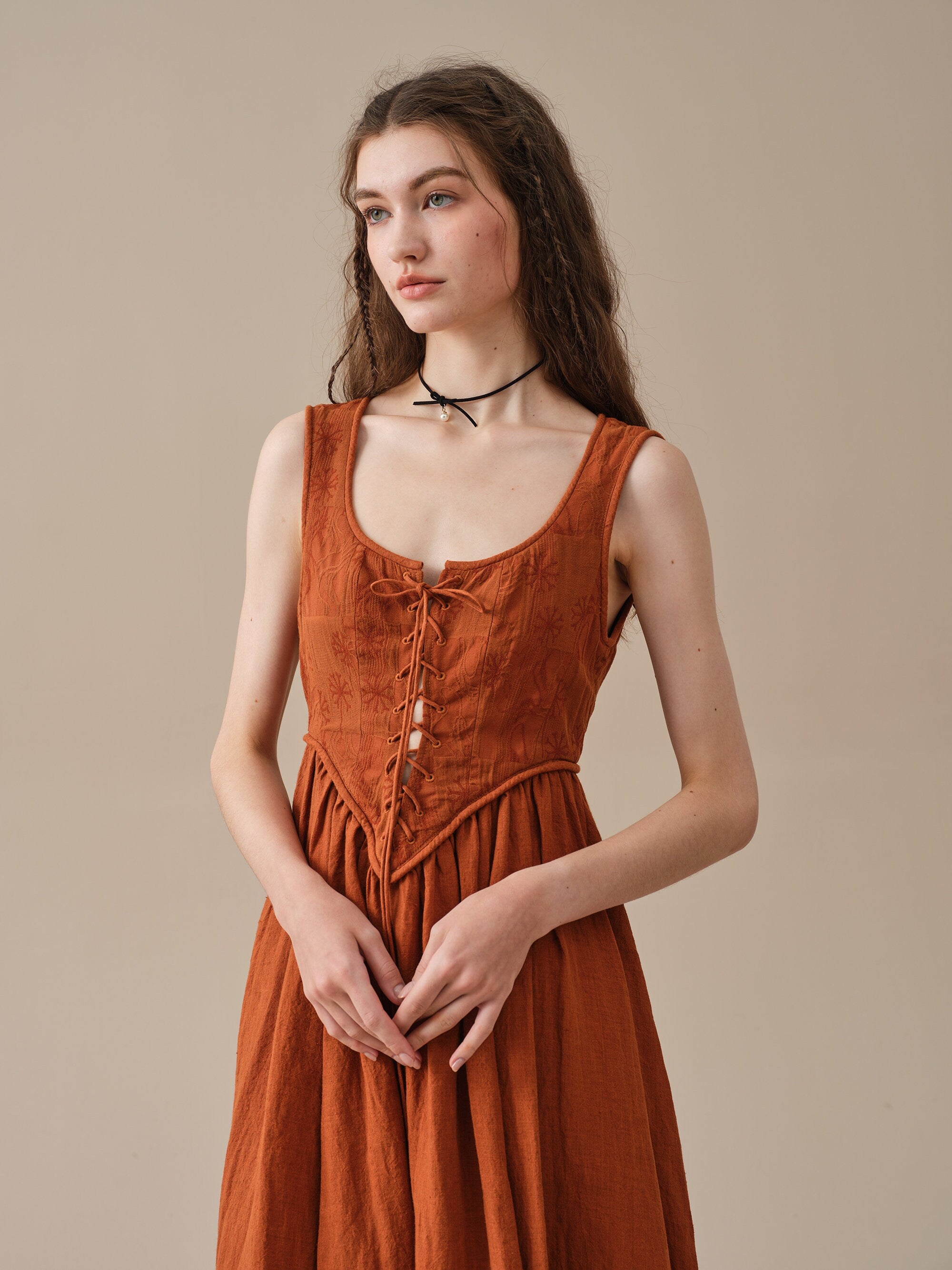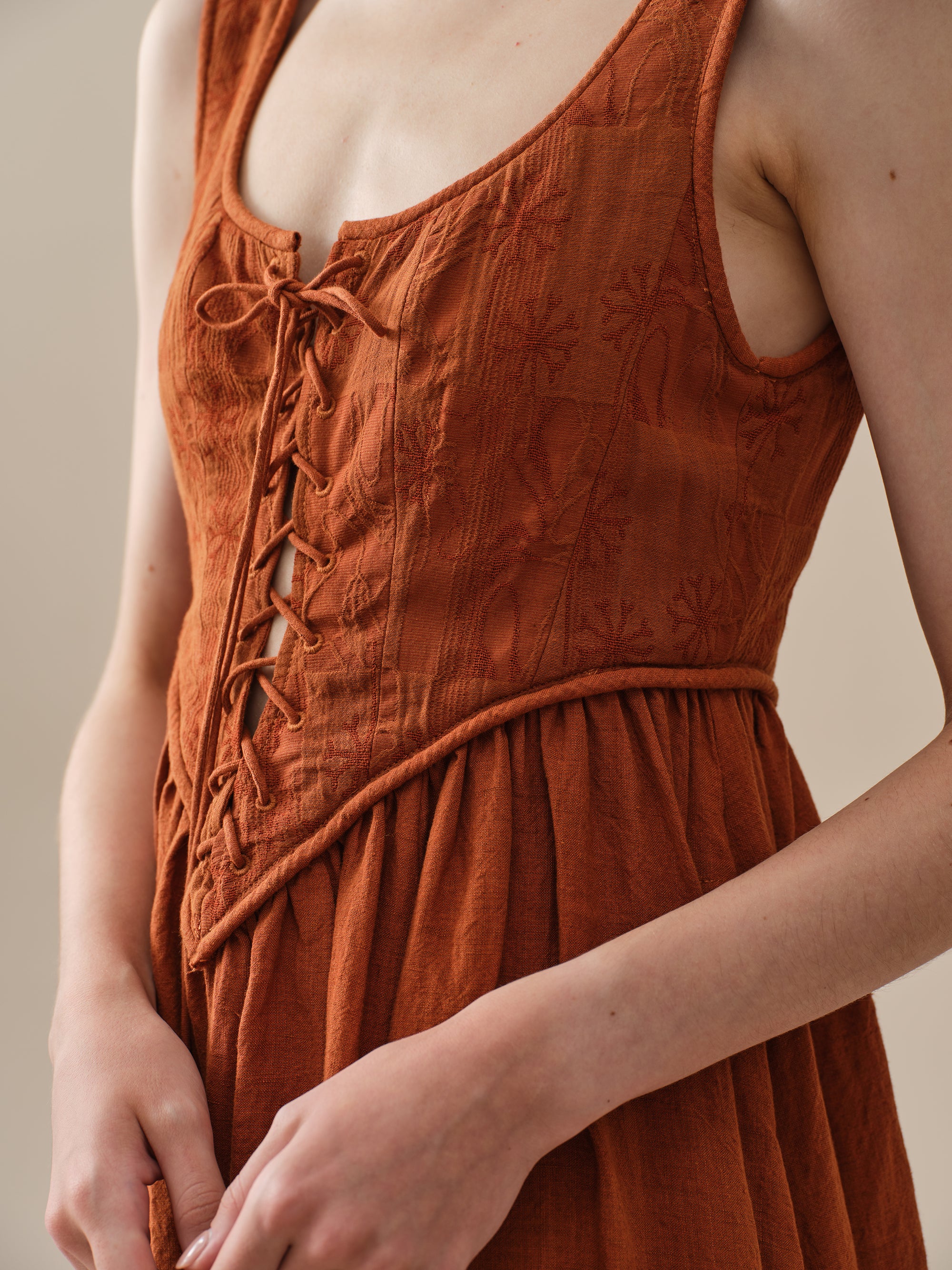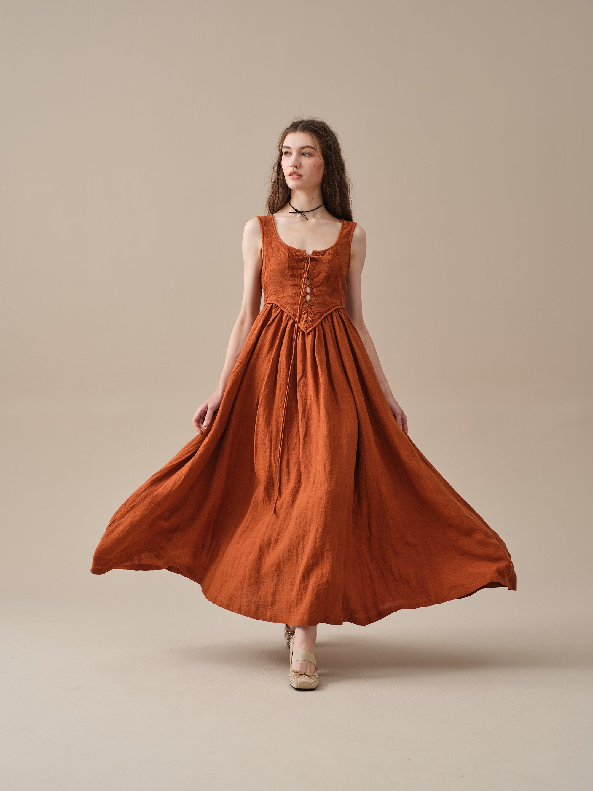 The delicate texture of the linen fabric brings an ethereal charm to this dress, allowing it to flow effortlessly with the body's movements. the lace up detail adds a romantic touch to the piece.