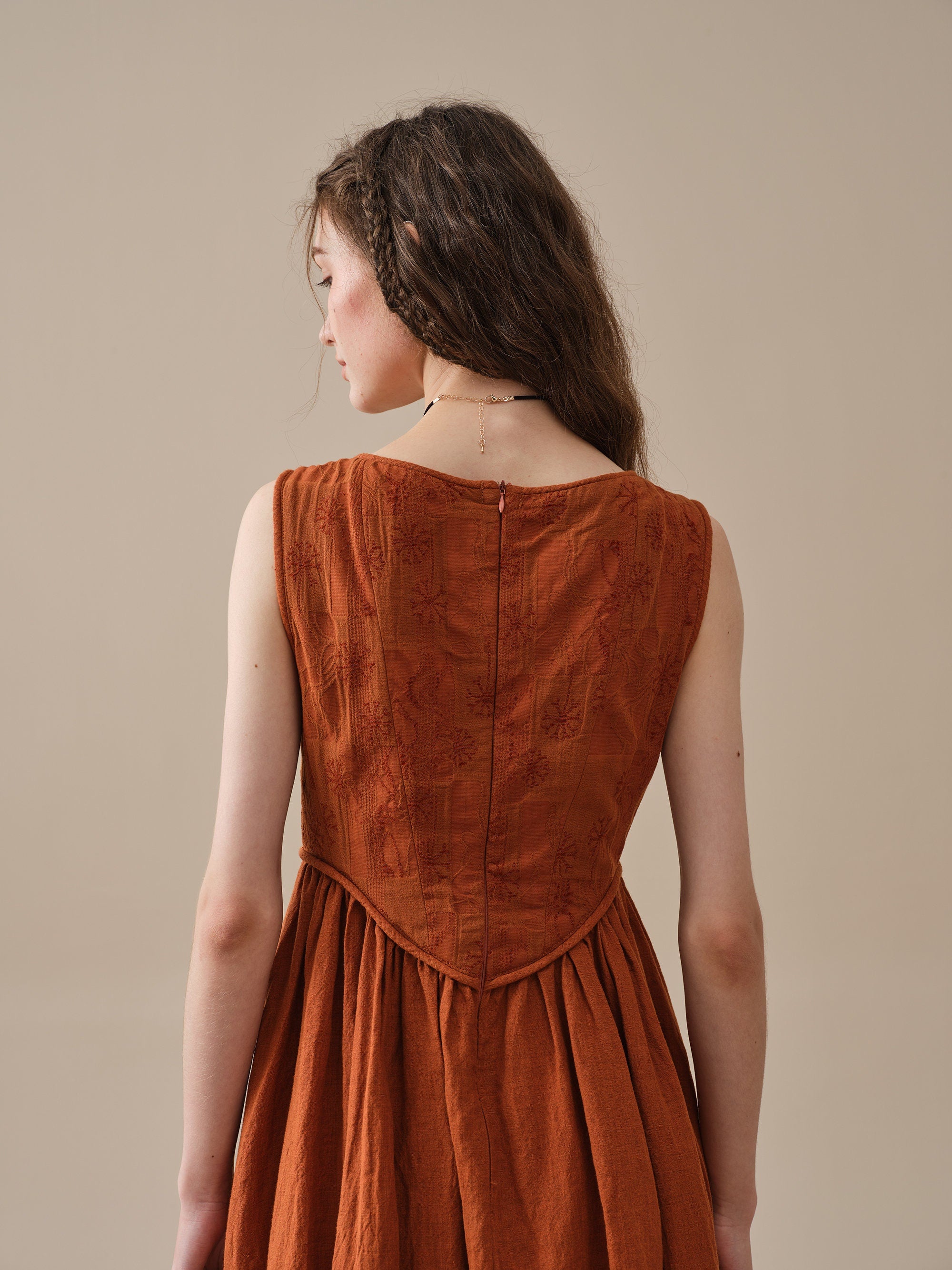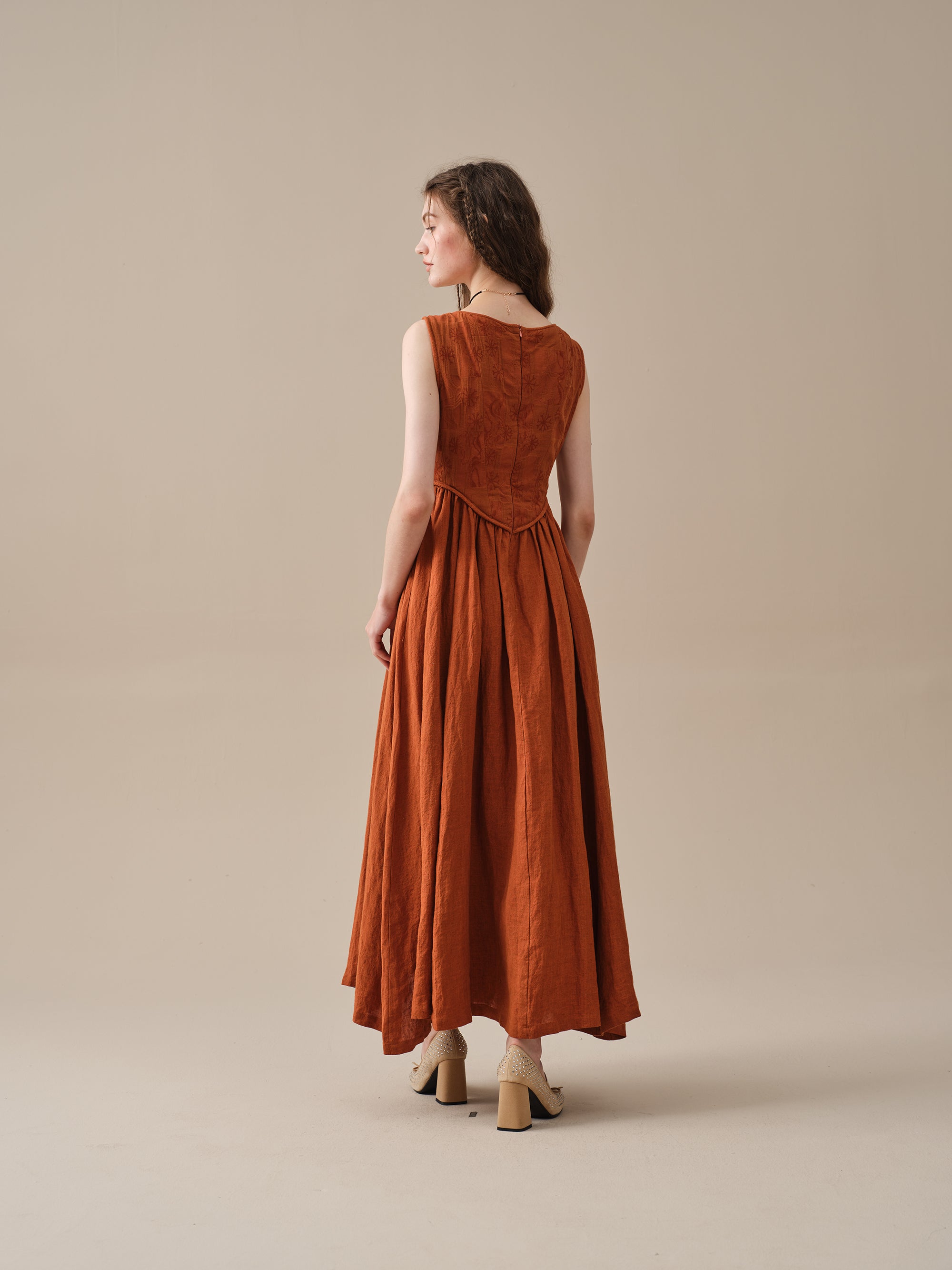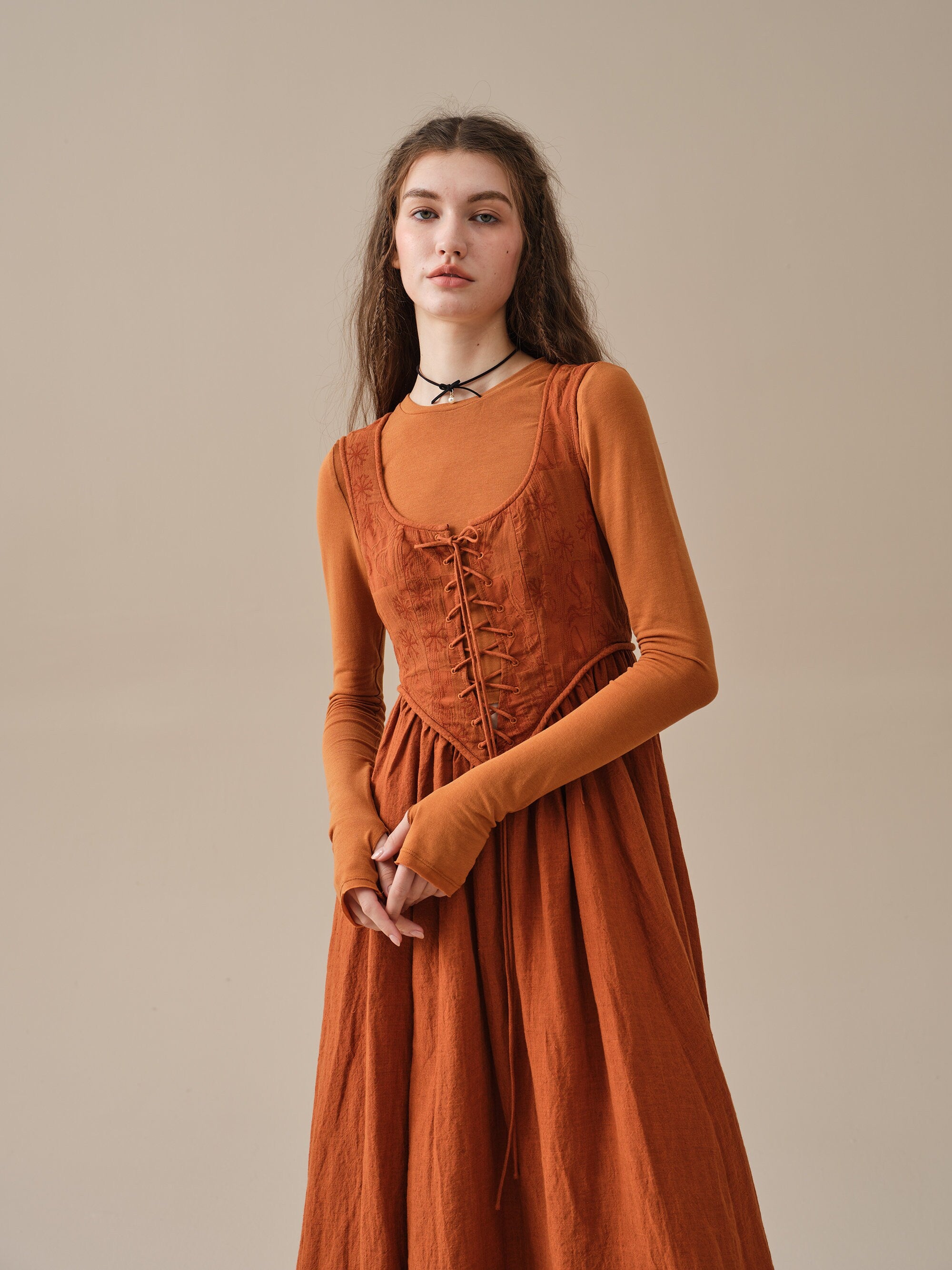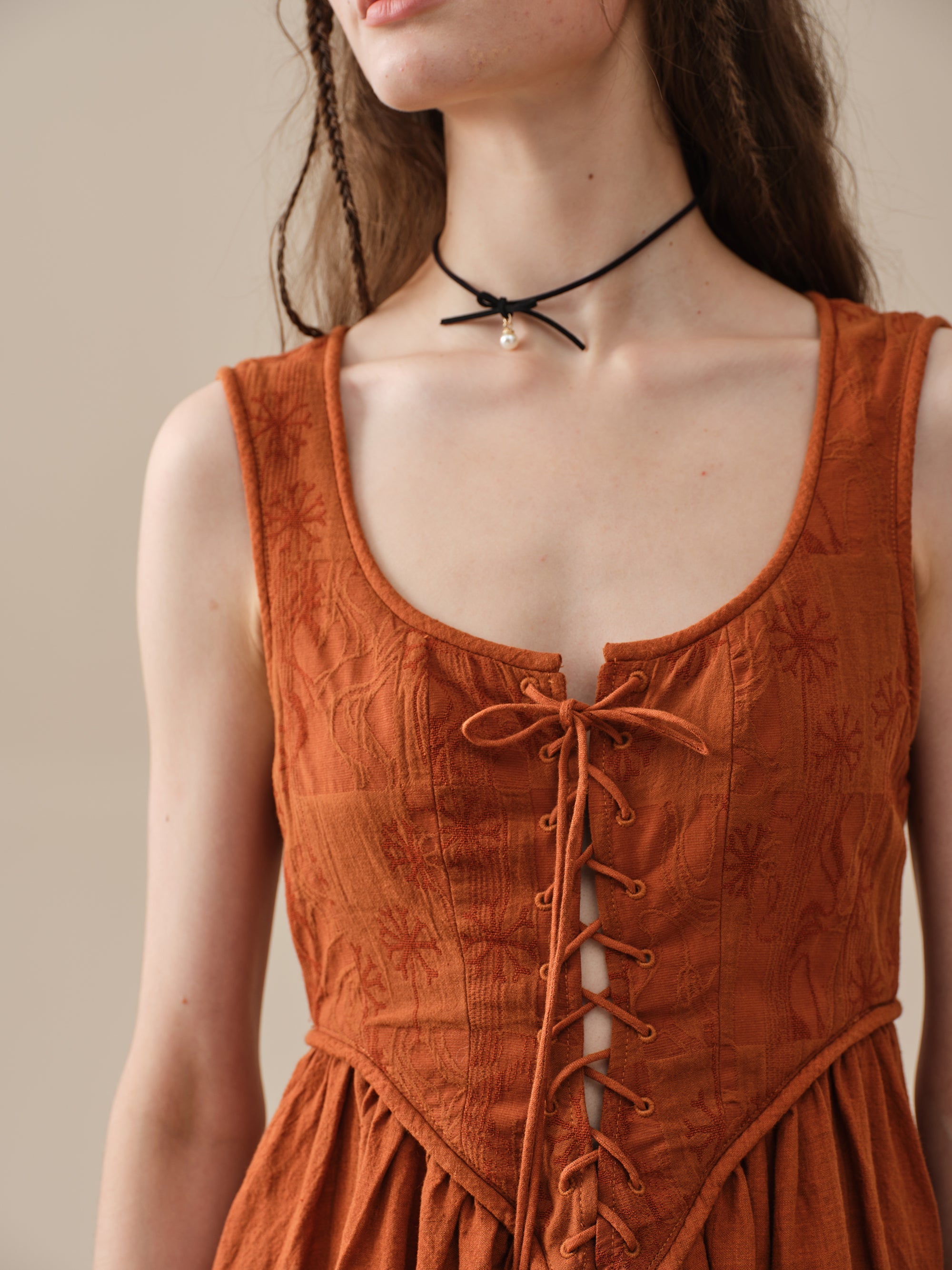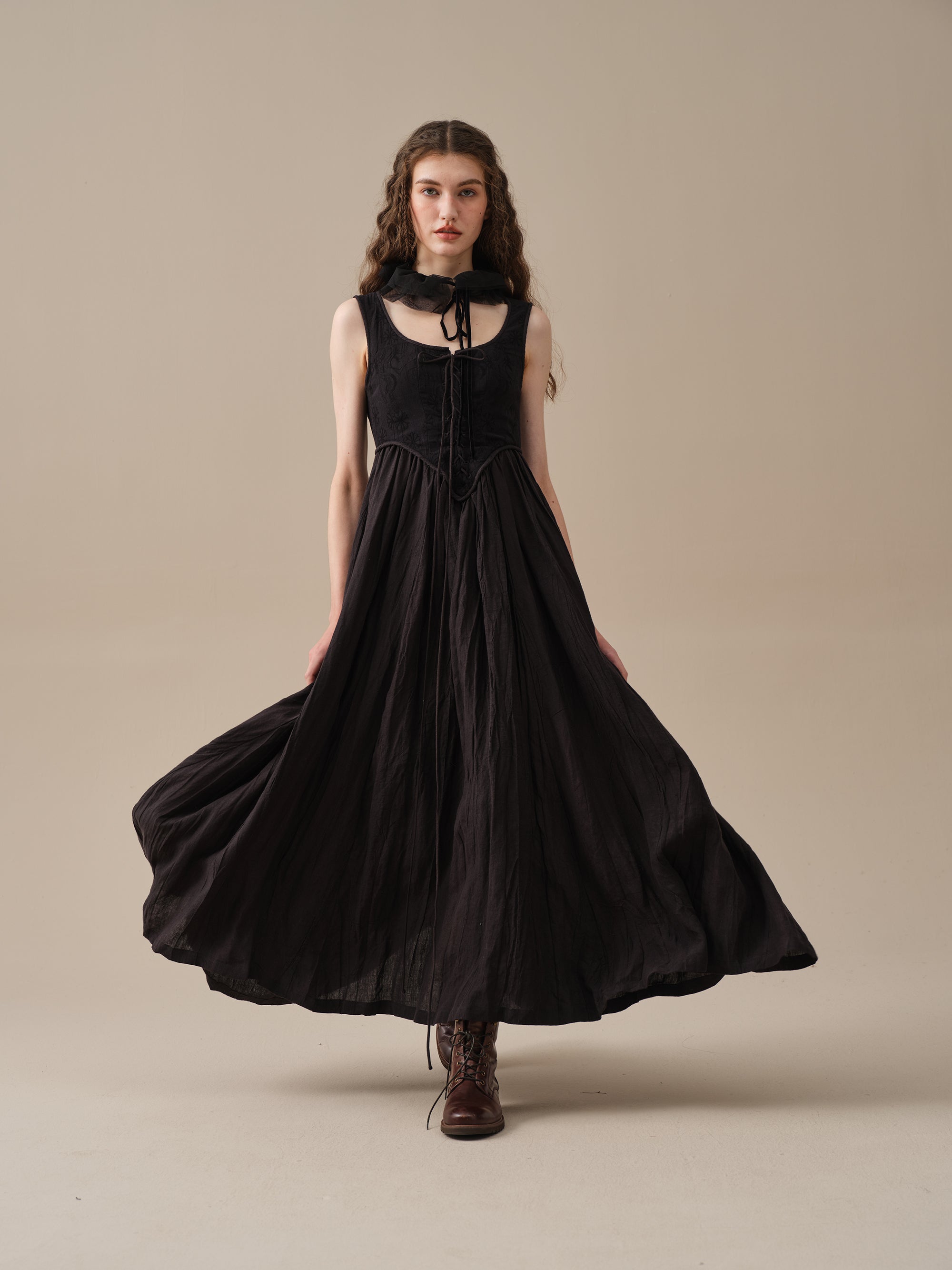 The delicate texture of the linen fabric brings an ethereal charm to this dress, allowing it to flow effortlessly with the body's movements. the lace up detail adds a romantic touch to the piece.