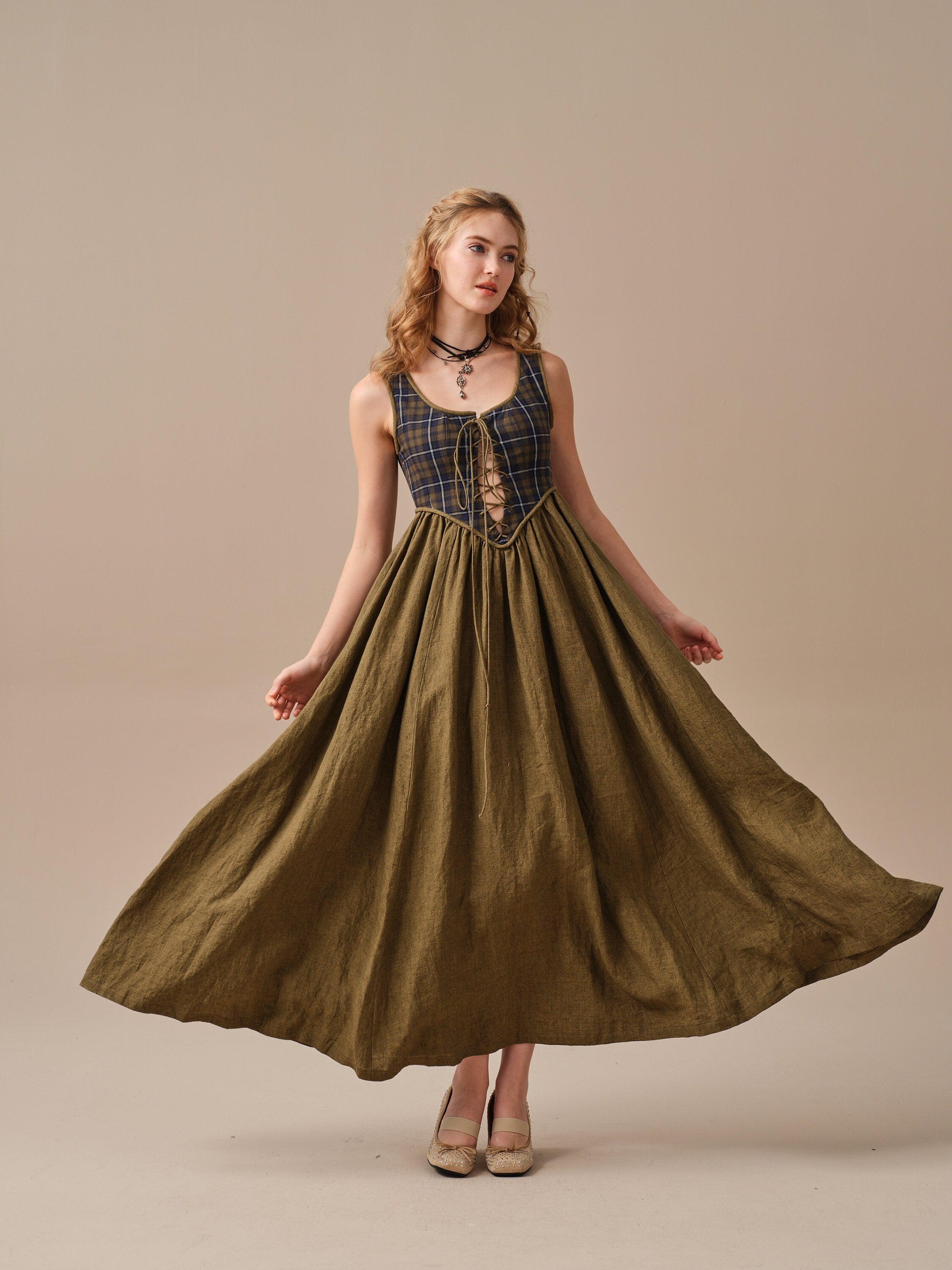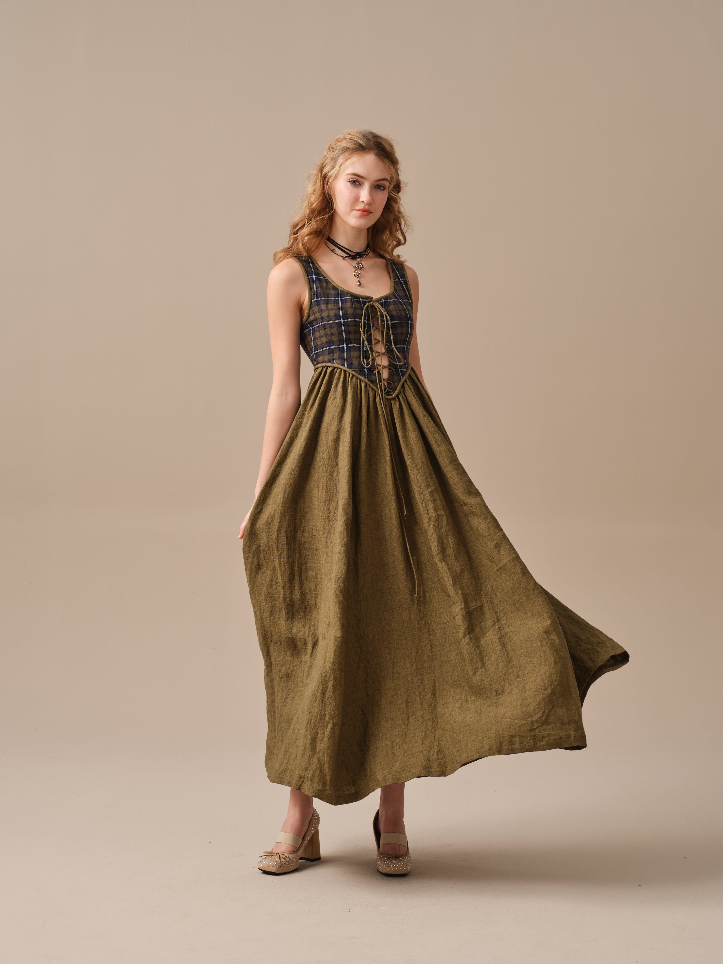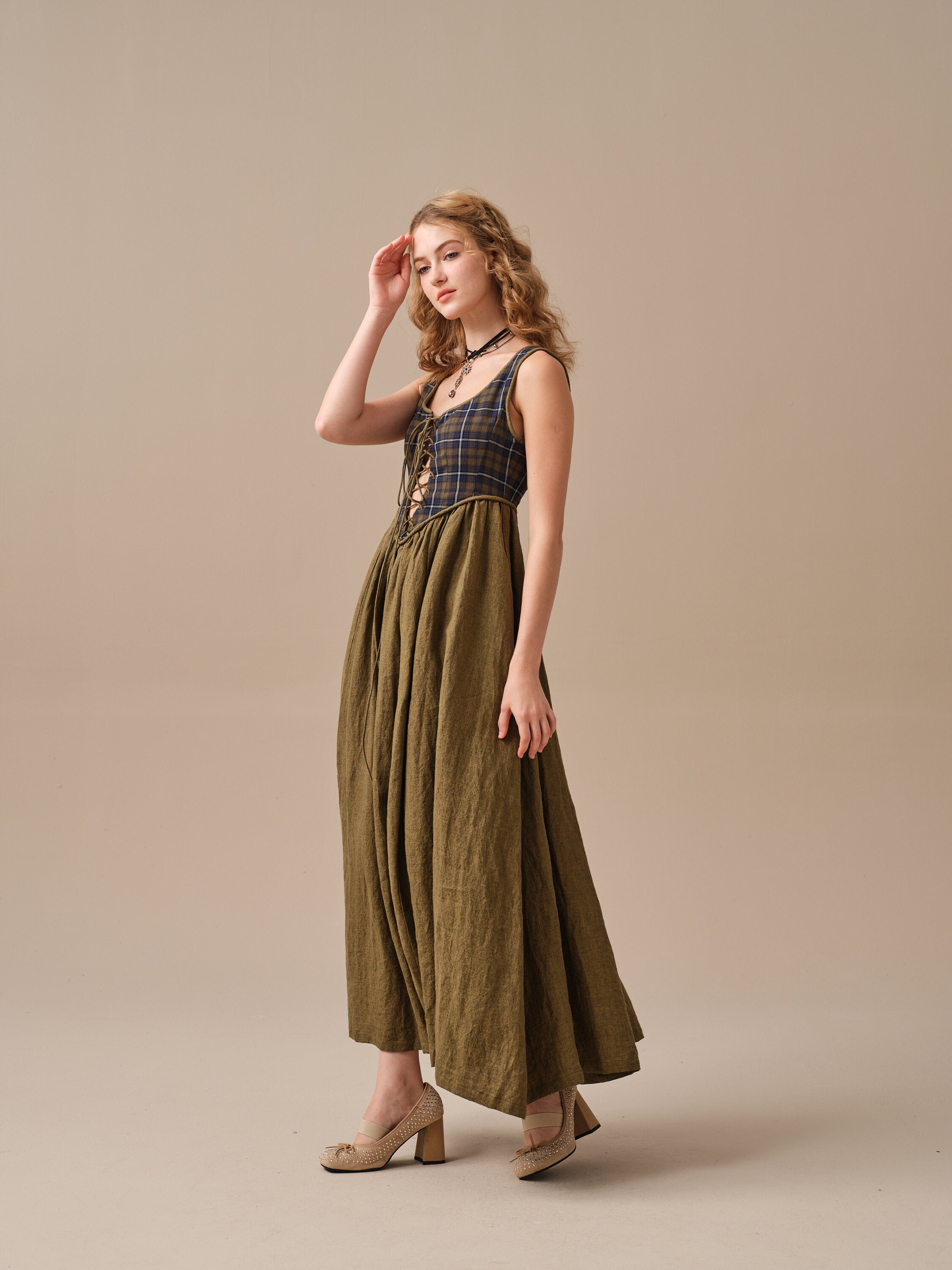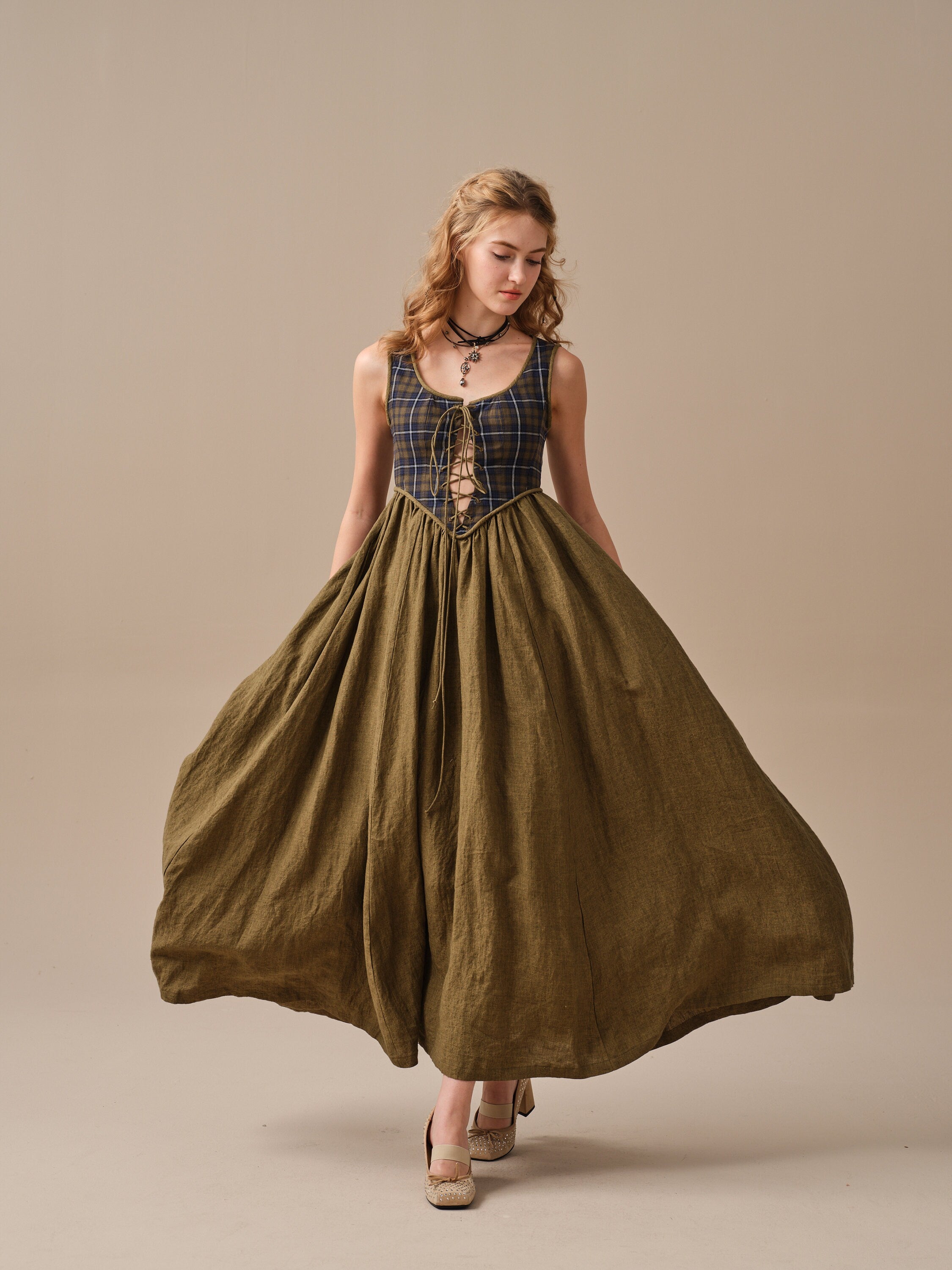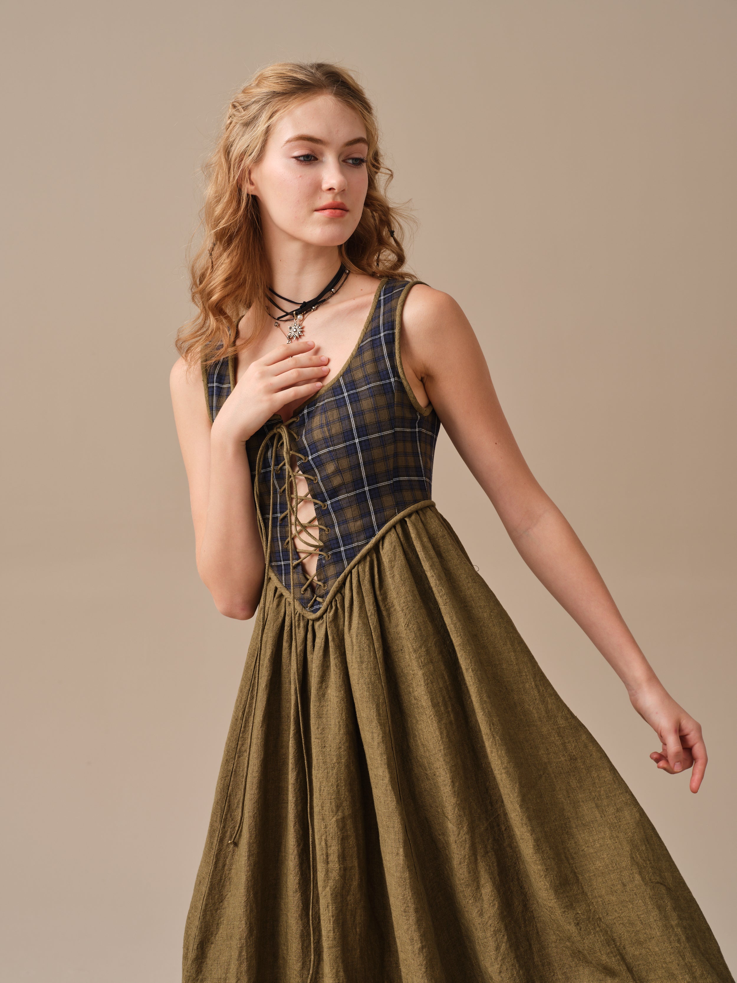 The delicate texture of the linen fabric brings an ethereal charm to this dress, allowing it to flow effortlessly with the body's movements. the lace up detail adds a romantic touch to the piece.