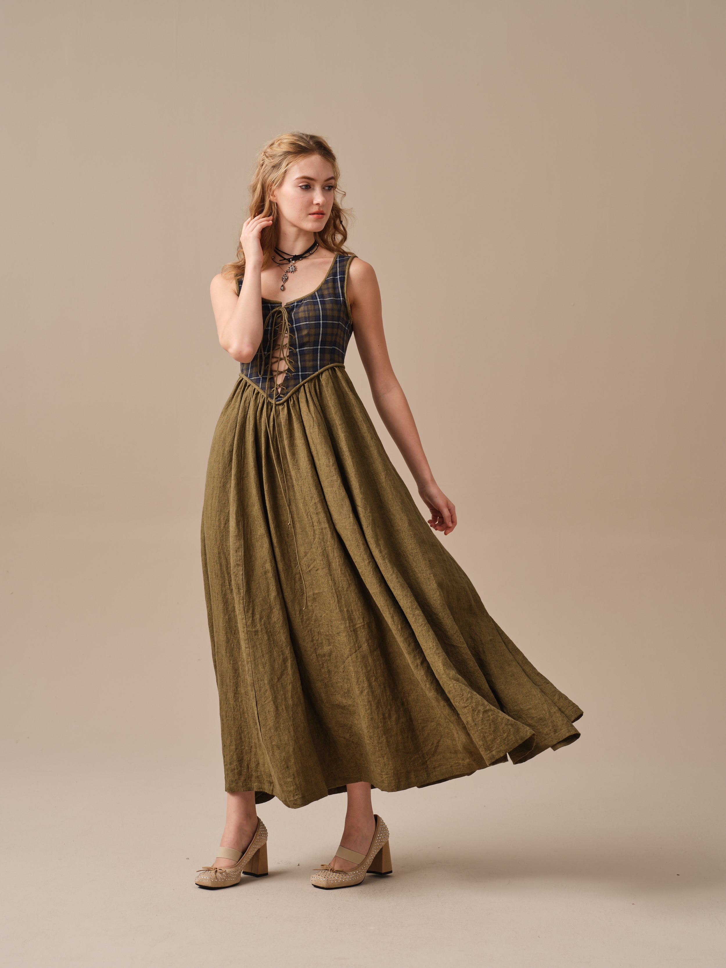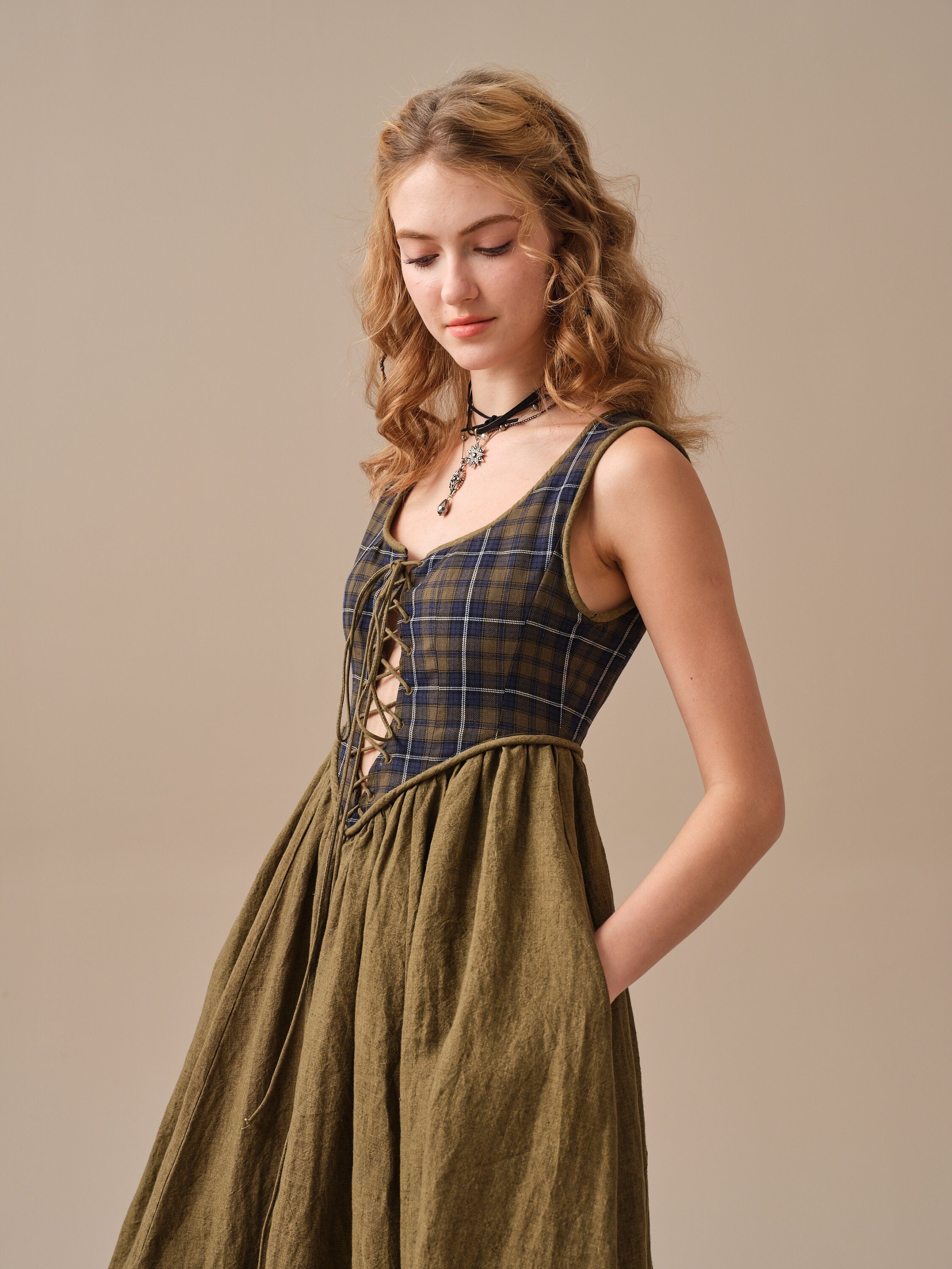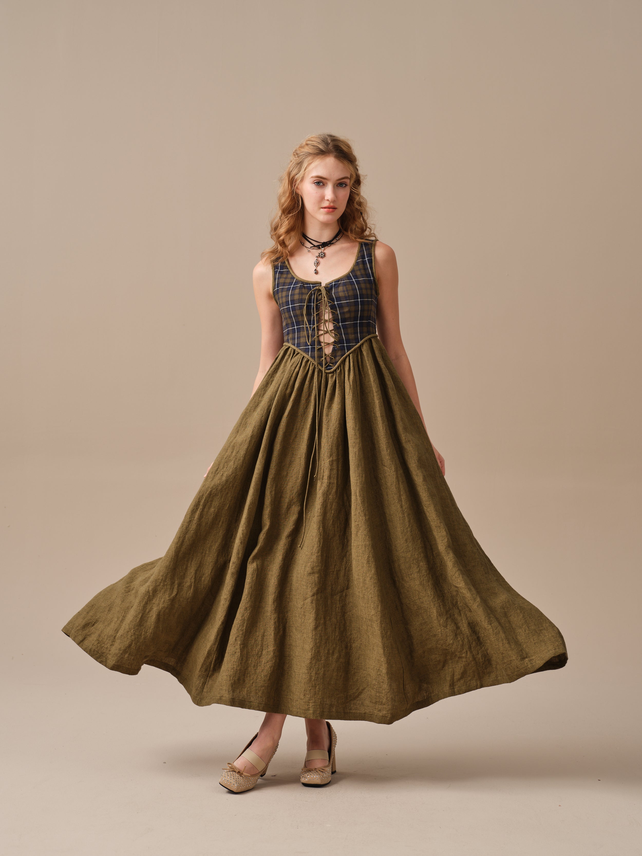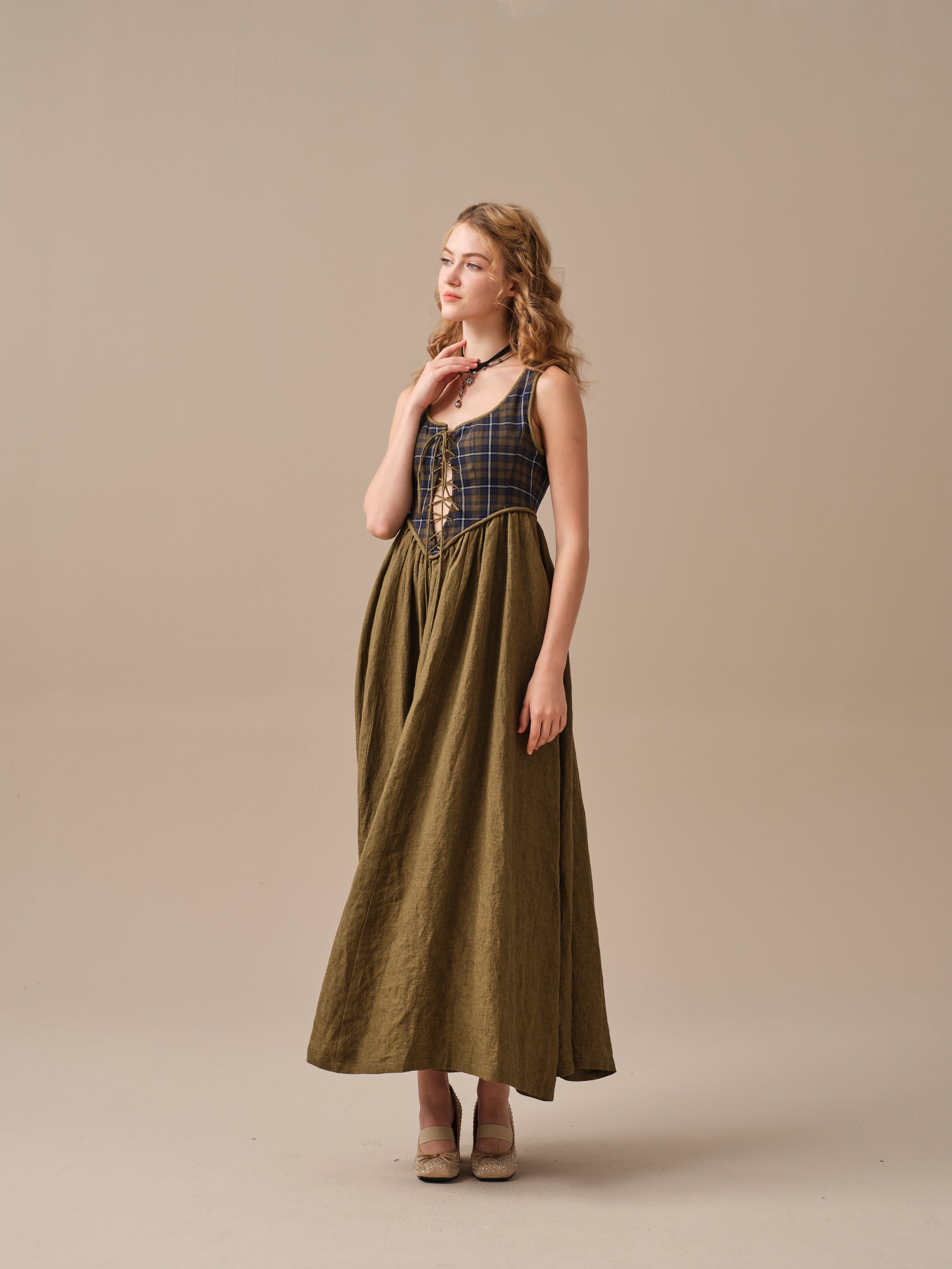 The delicate texture of the linen fabric brings an ethereal charm to this dress, allowing it to flow effortlessly with the body's movements. the lace up detail adds a romantic touch to the piece.