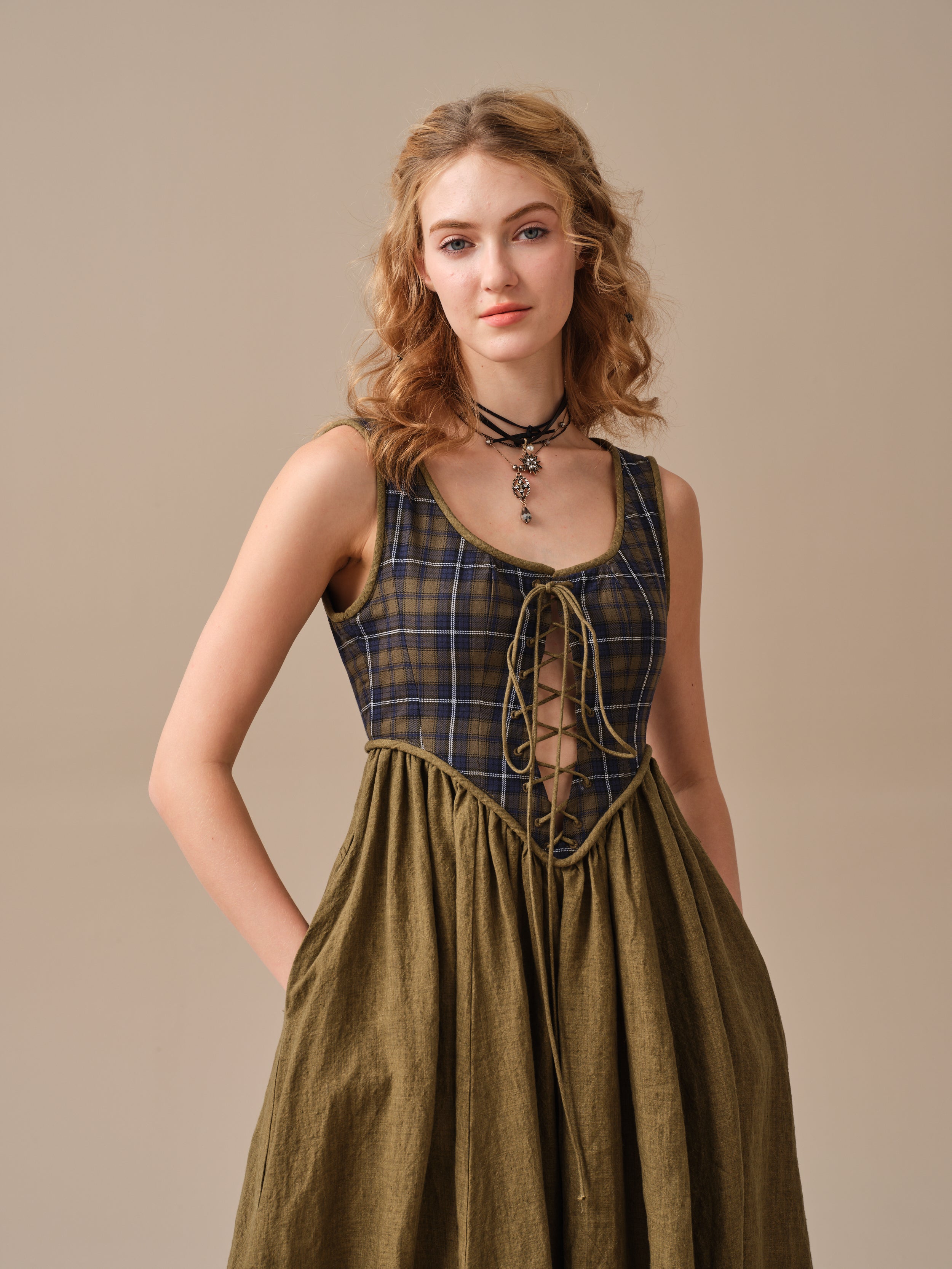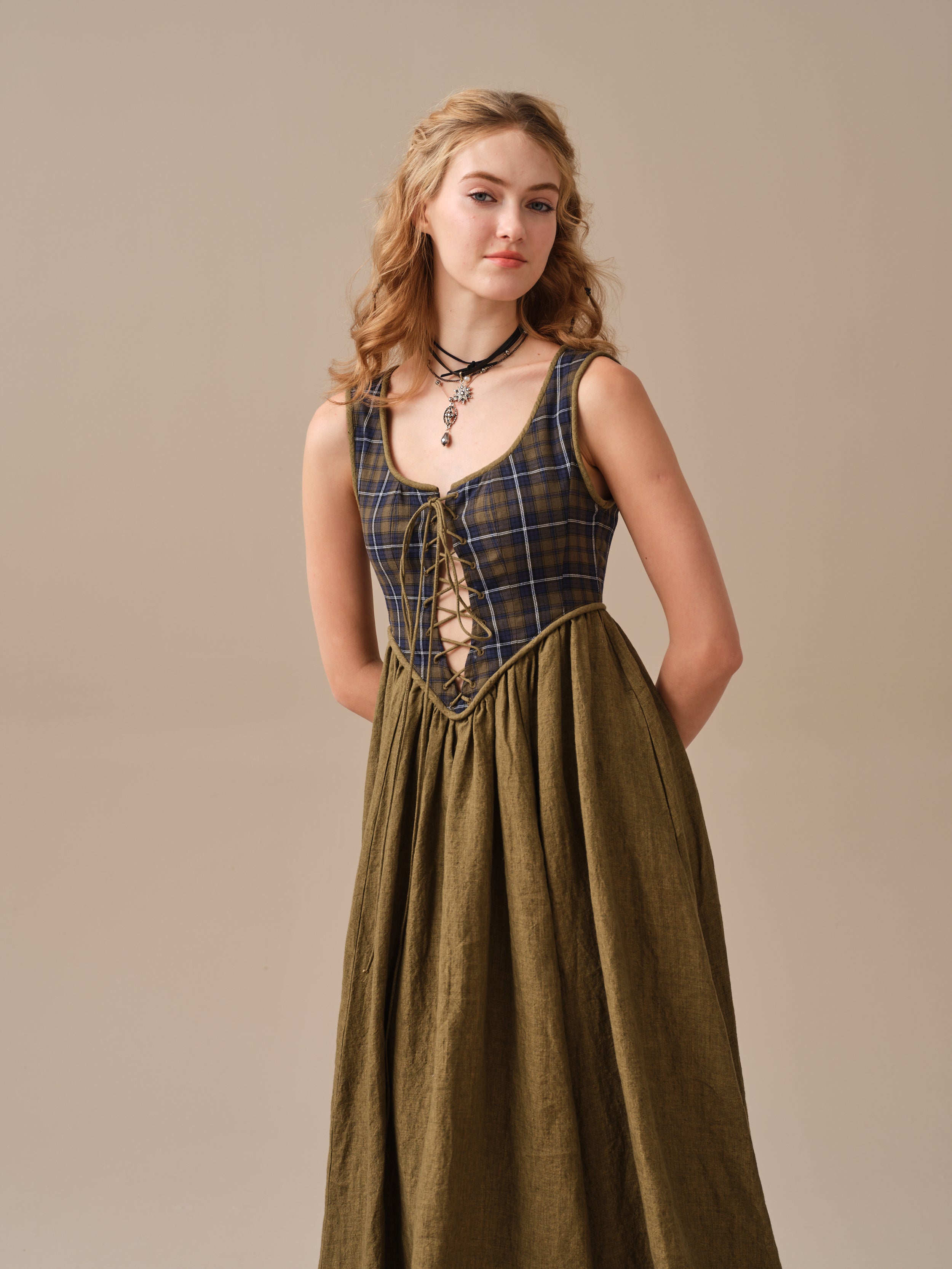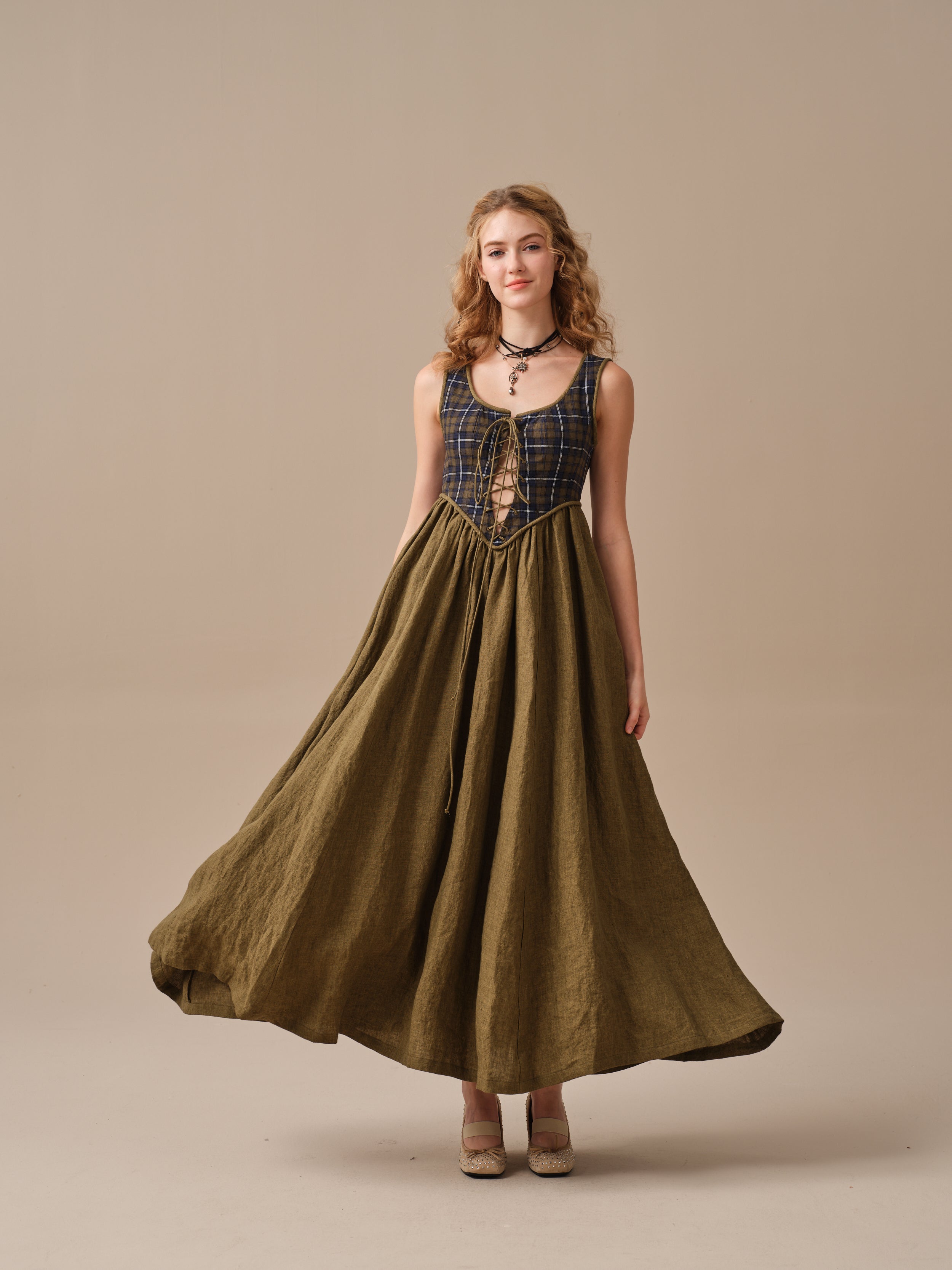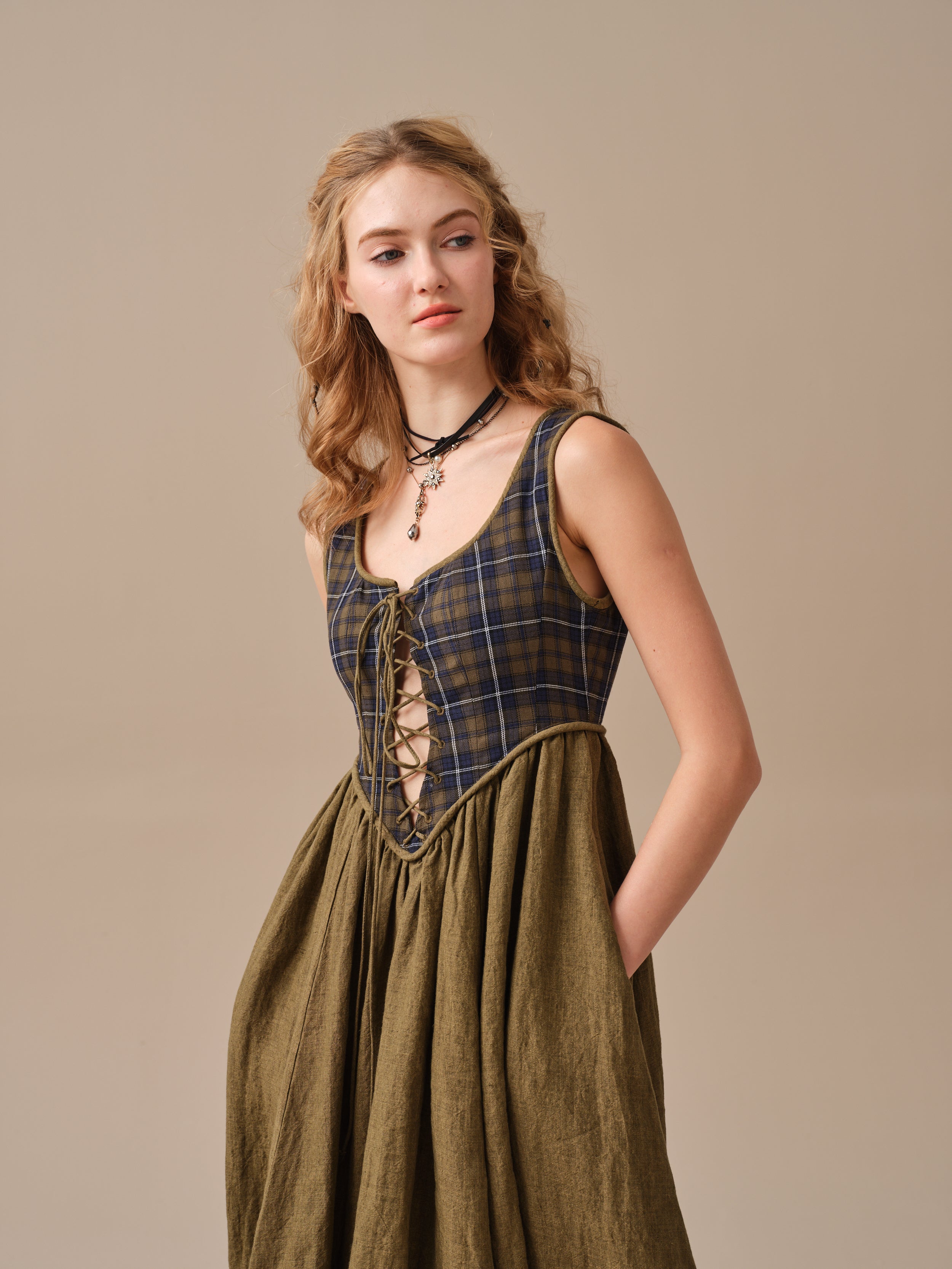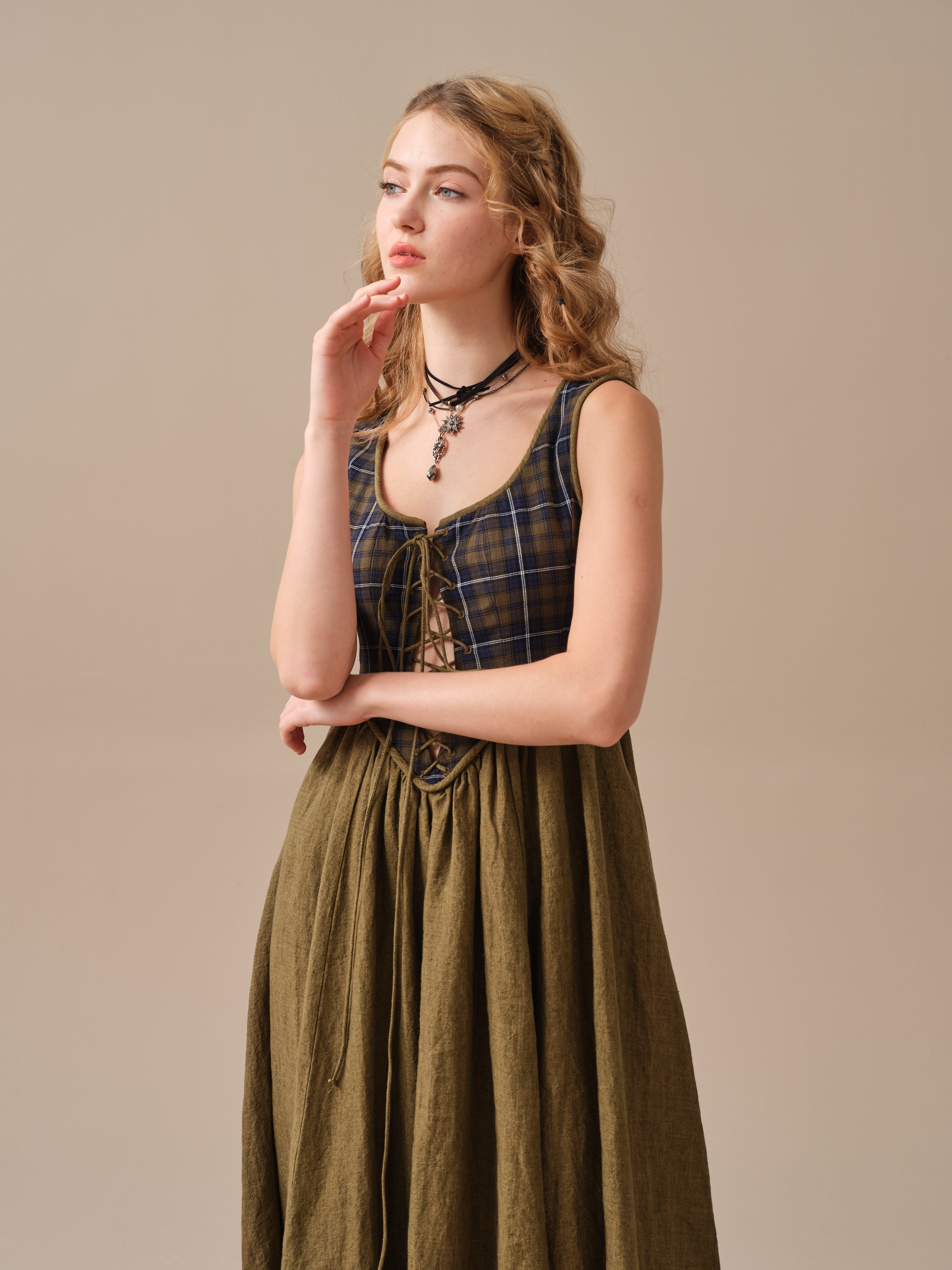 The delicate texture of the linen fabric brings an ethereal charm to this dress, allowing it to flow effortlessly with the body's movements. the lace up detail adds a romantic touch to the piece.