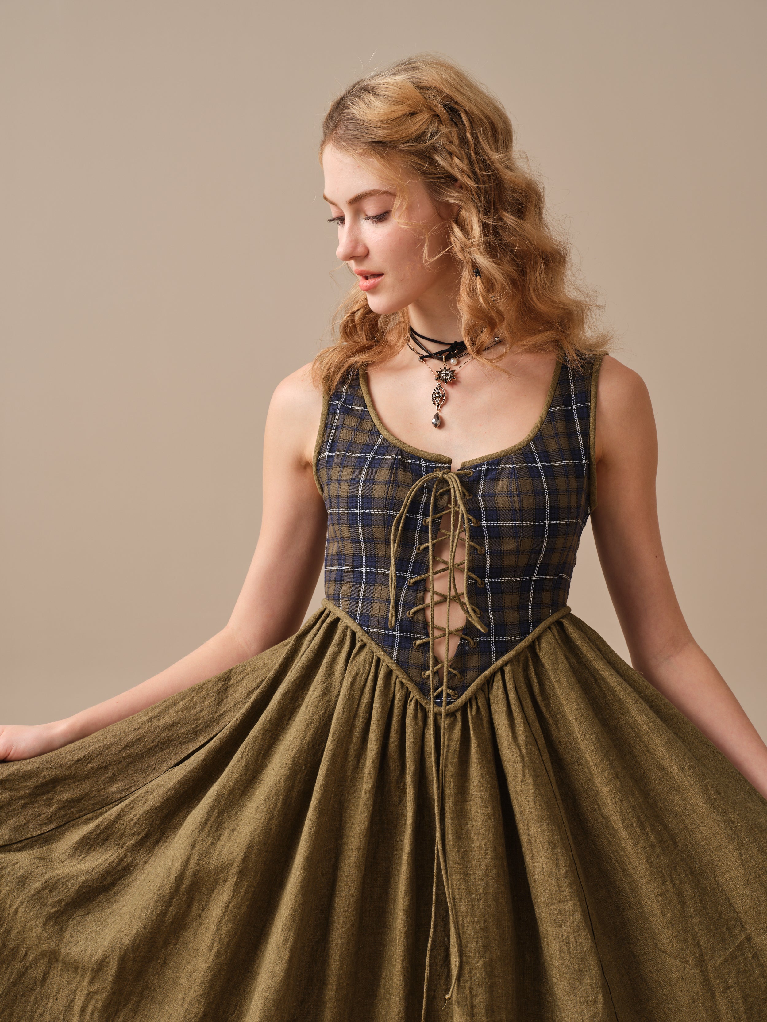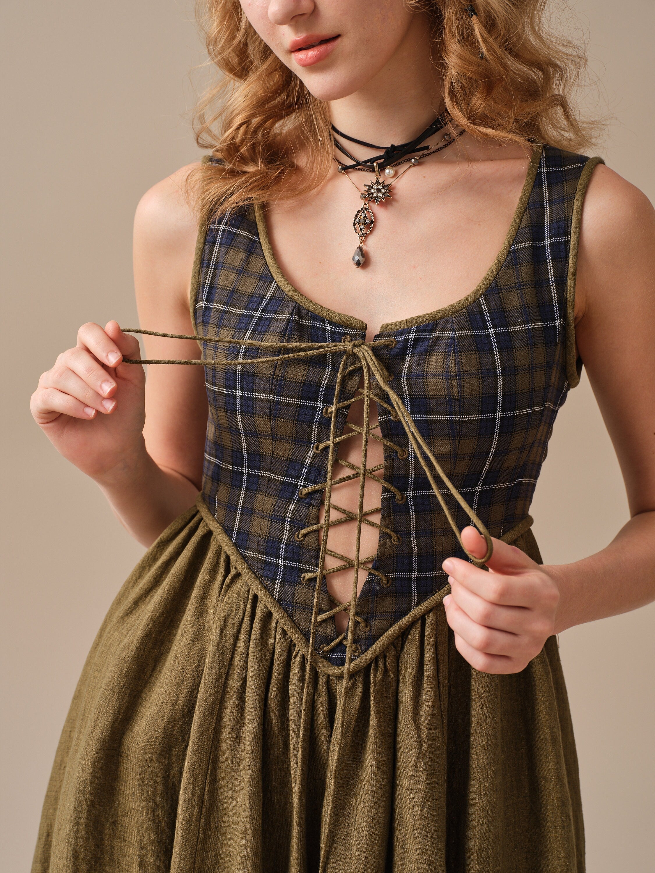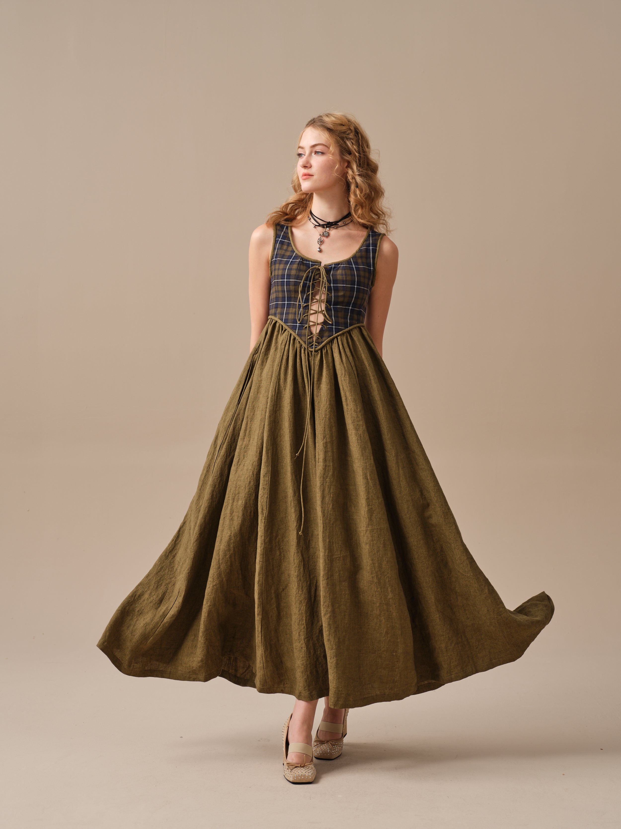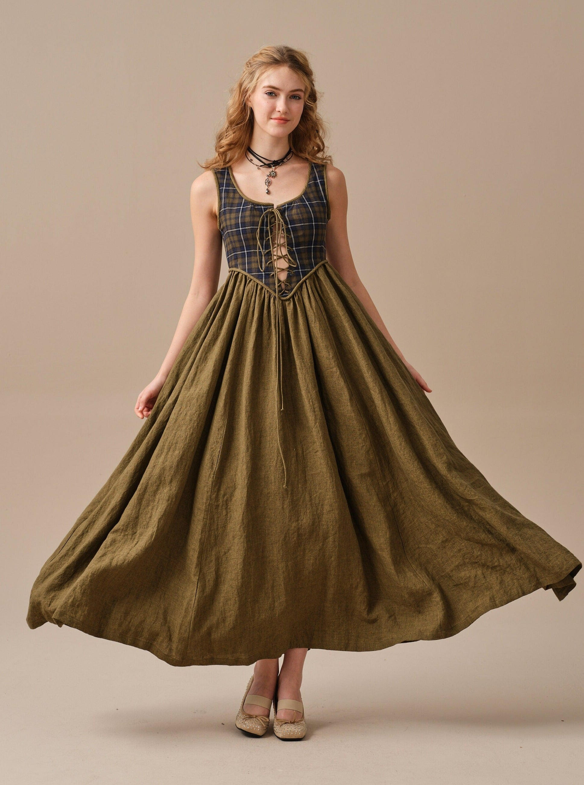 The delicate texture of the linen fabric brings an ethereal charm to this dress, allowing it to flow effortlessly with the body's movements. the lace up detail adds a romantic touch to the piece.