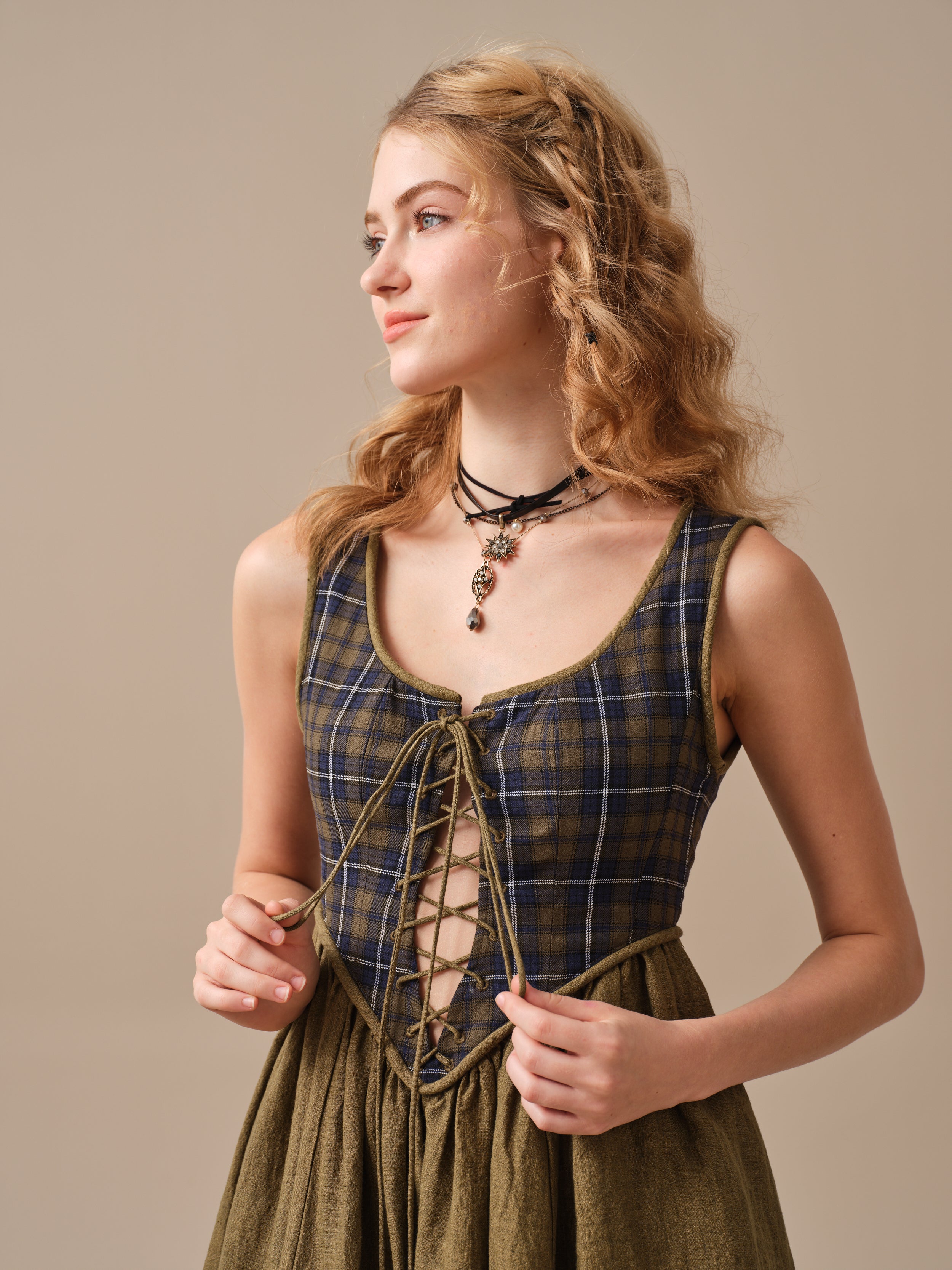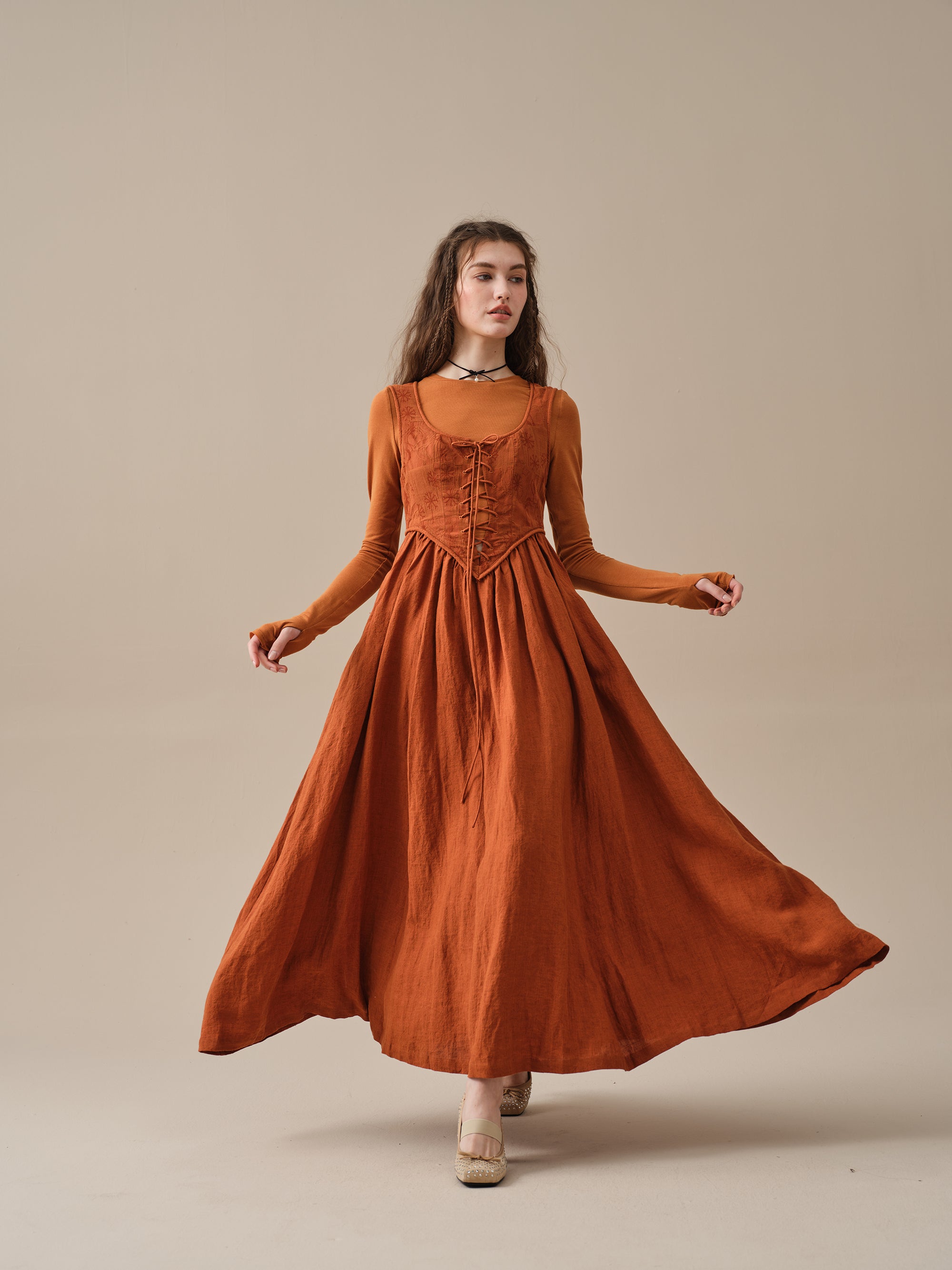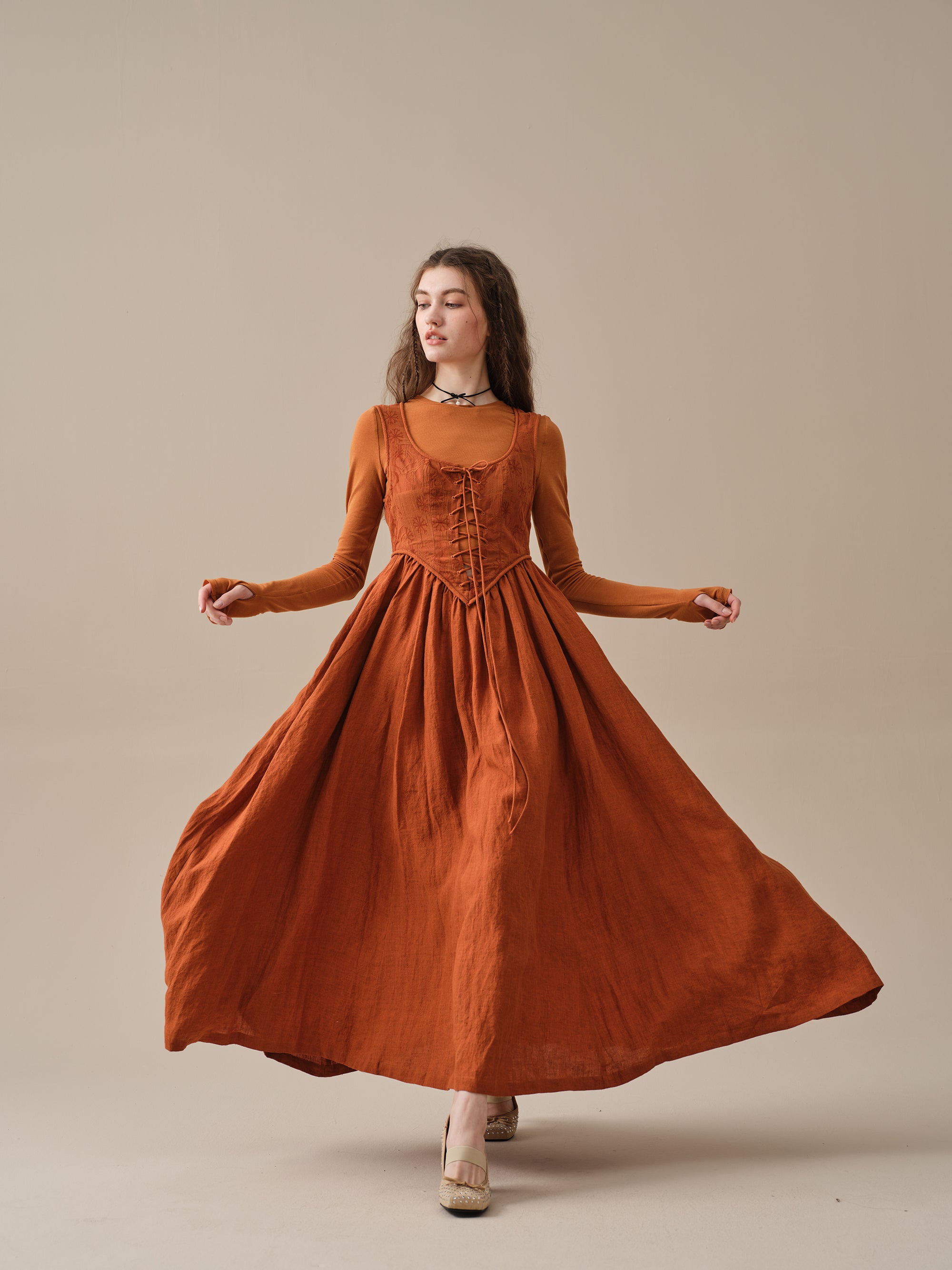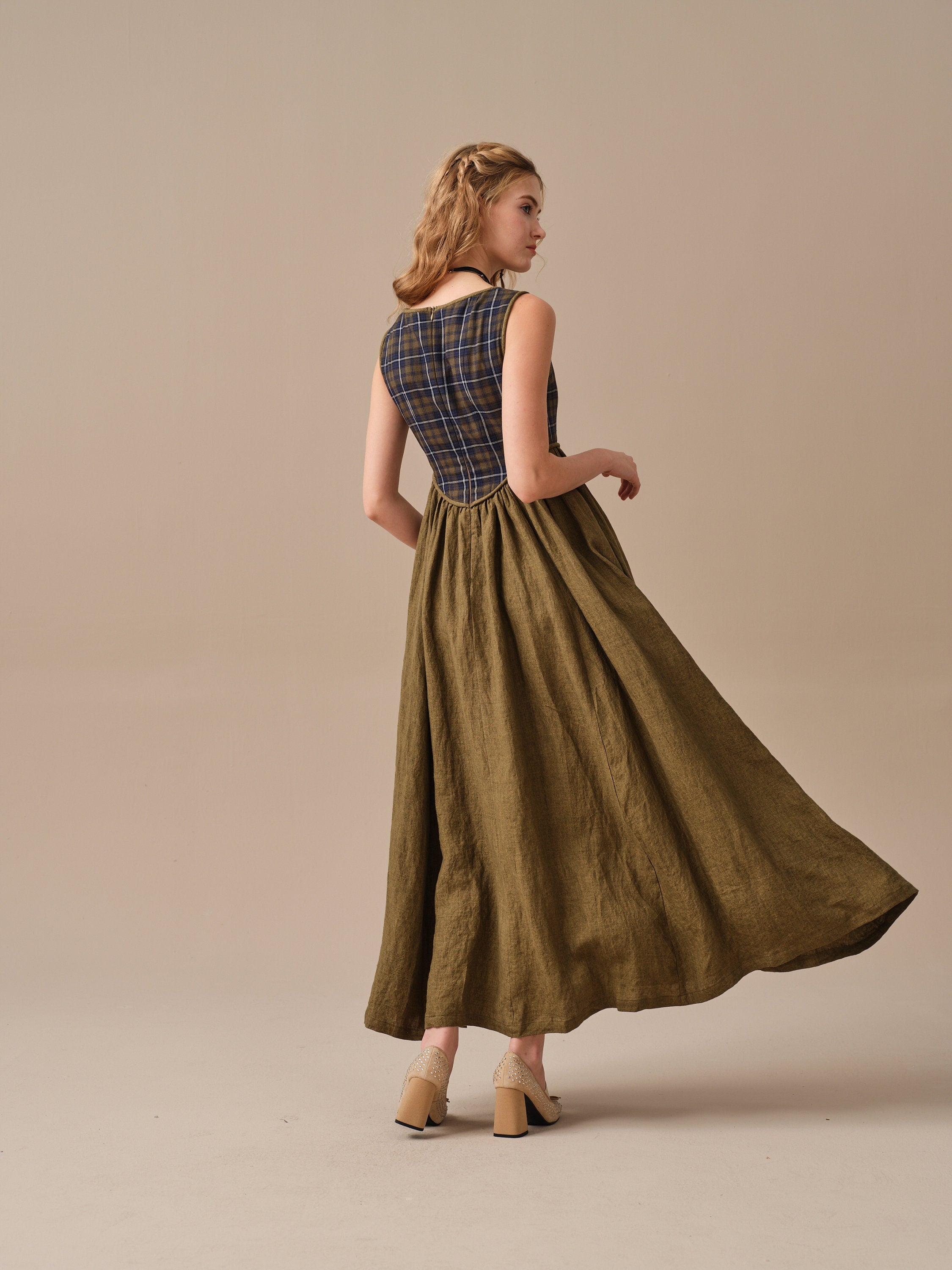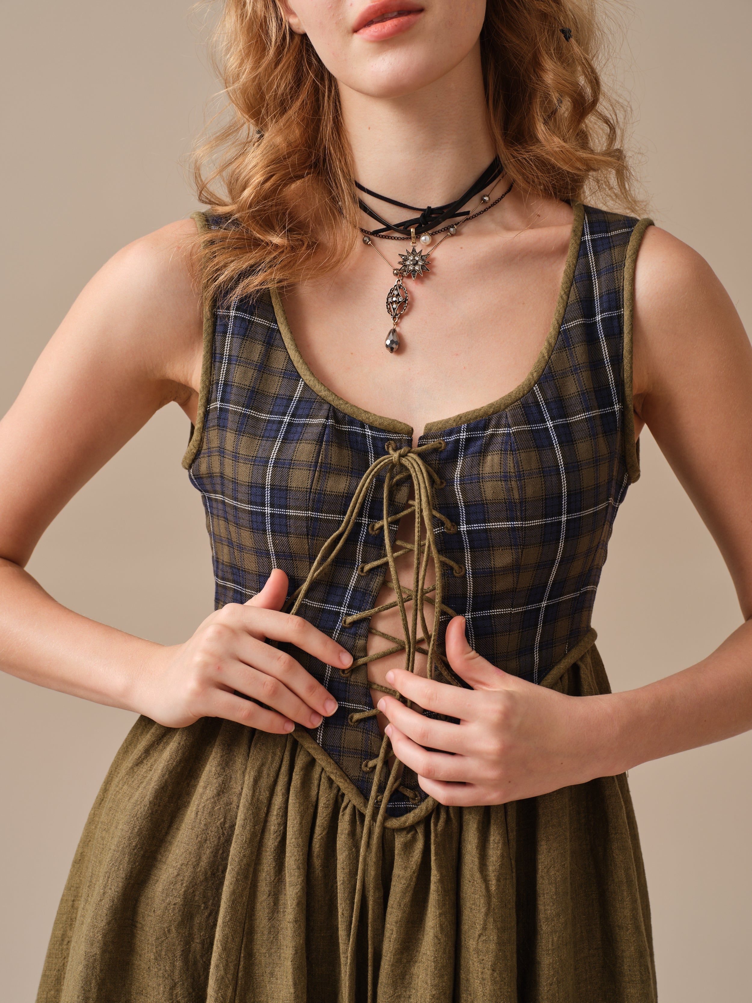 The delicate texture of the linen fabric brings an ethereal charm to this dress, allowing it to flow effortlessly with the body's movements. the lace up detail adds a romantic touch to the piece.