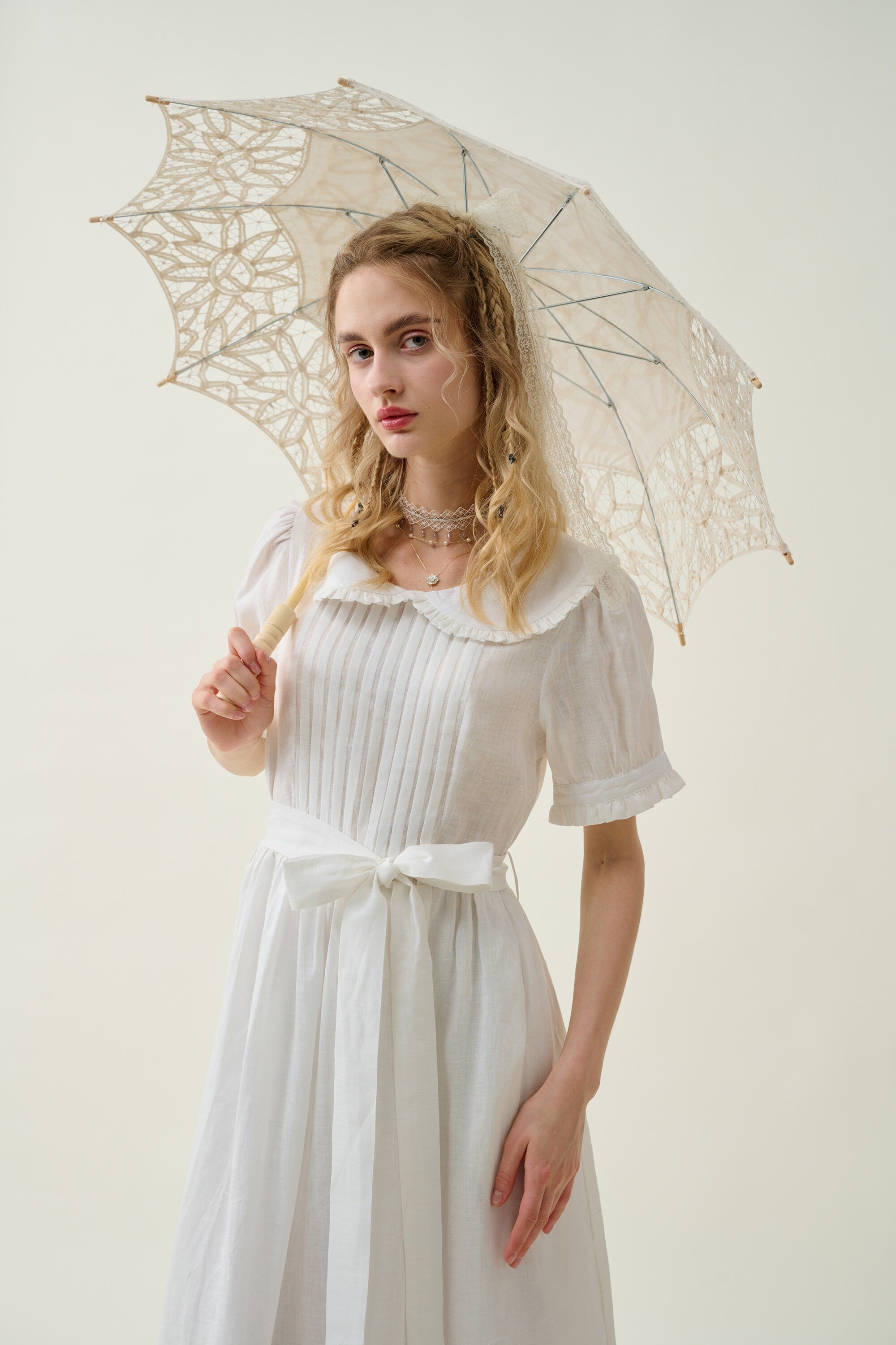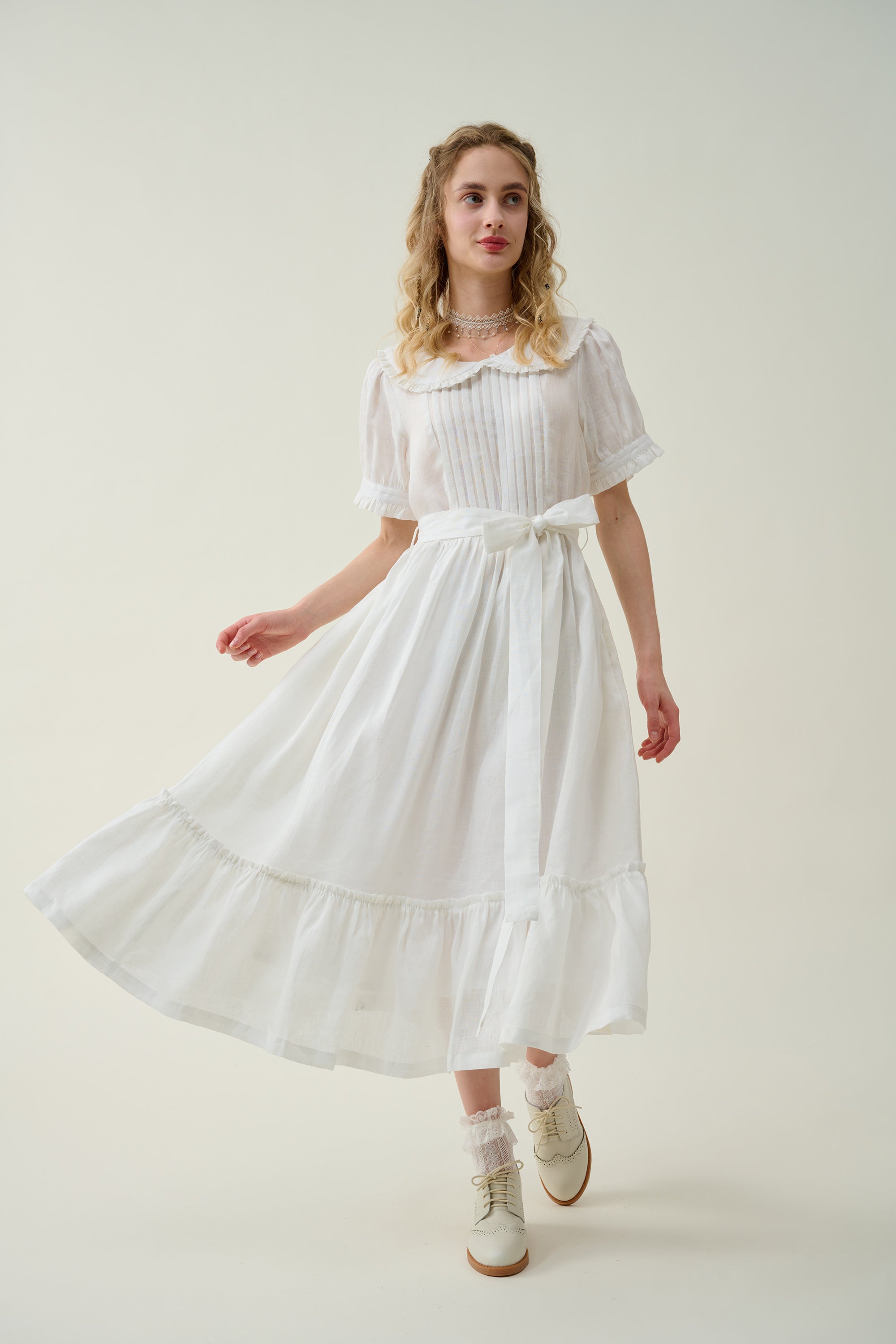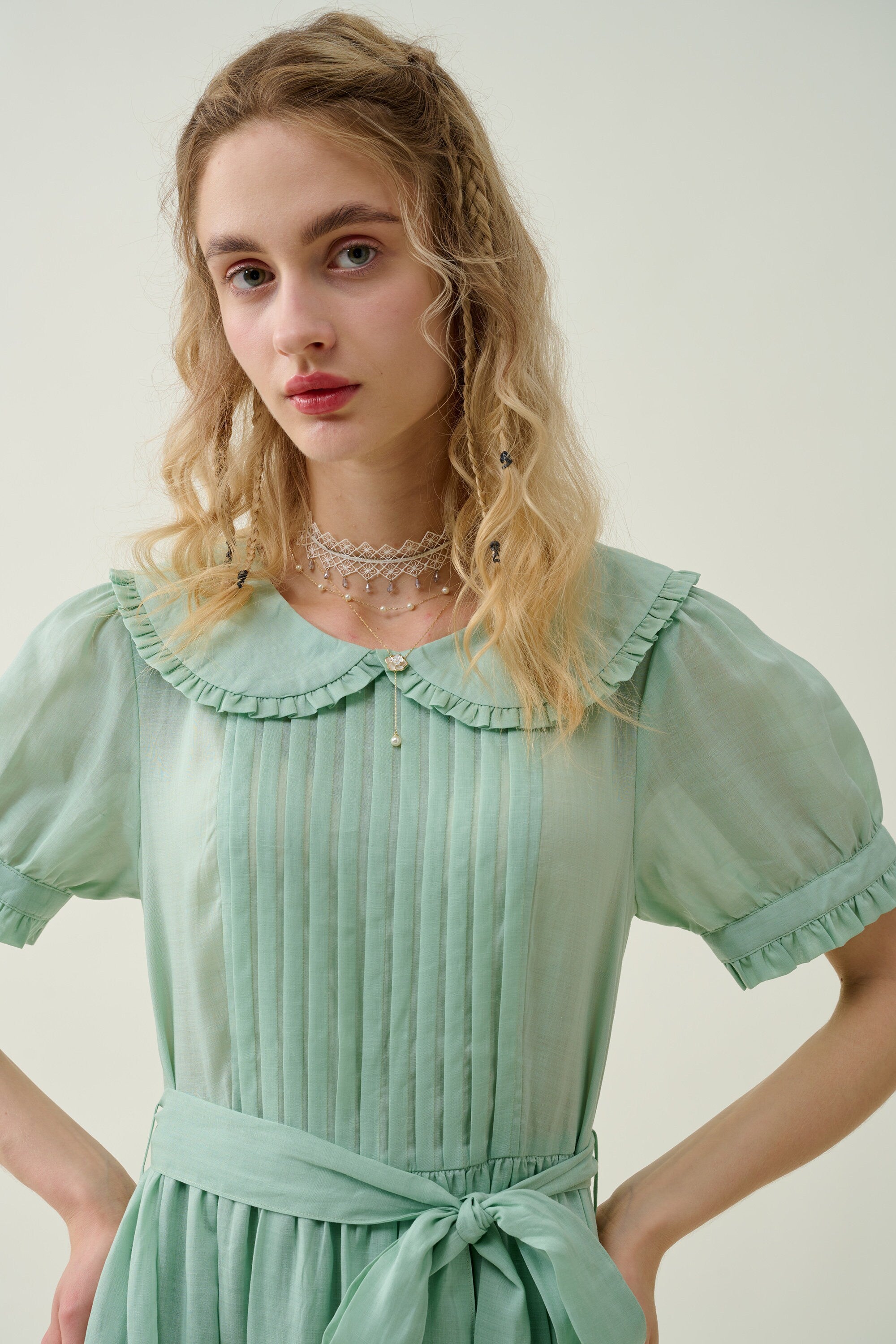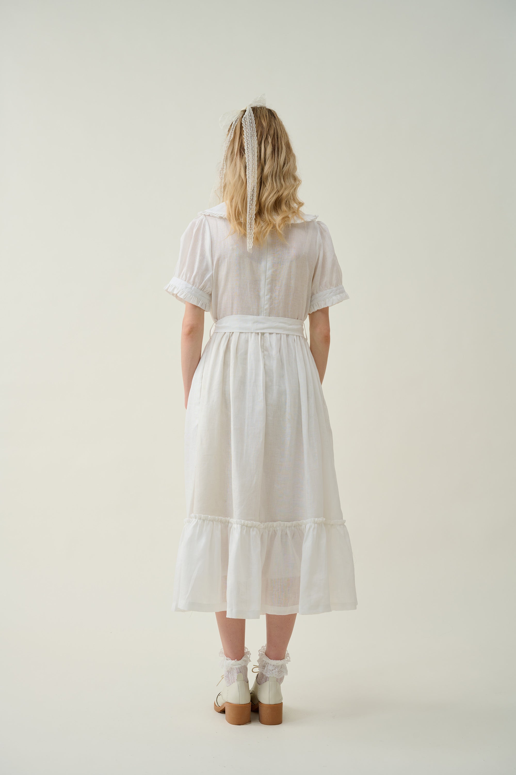 It's made from light linen in an elegant A-line shape. The puff short sleeves and Peter Pan collar are decorated with pretty ruffles, retro and romantic. It's finished with pleated detailing and a tiered skirt for volume.