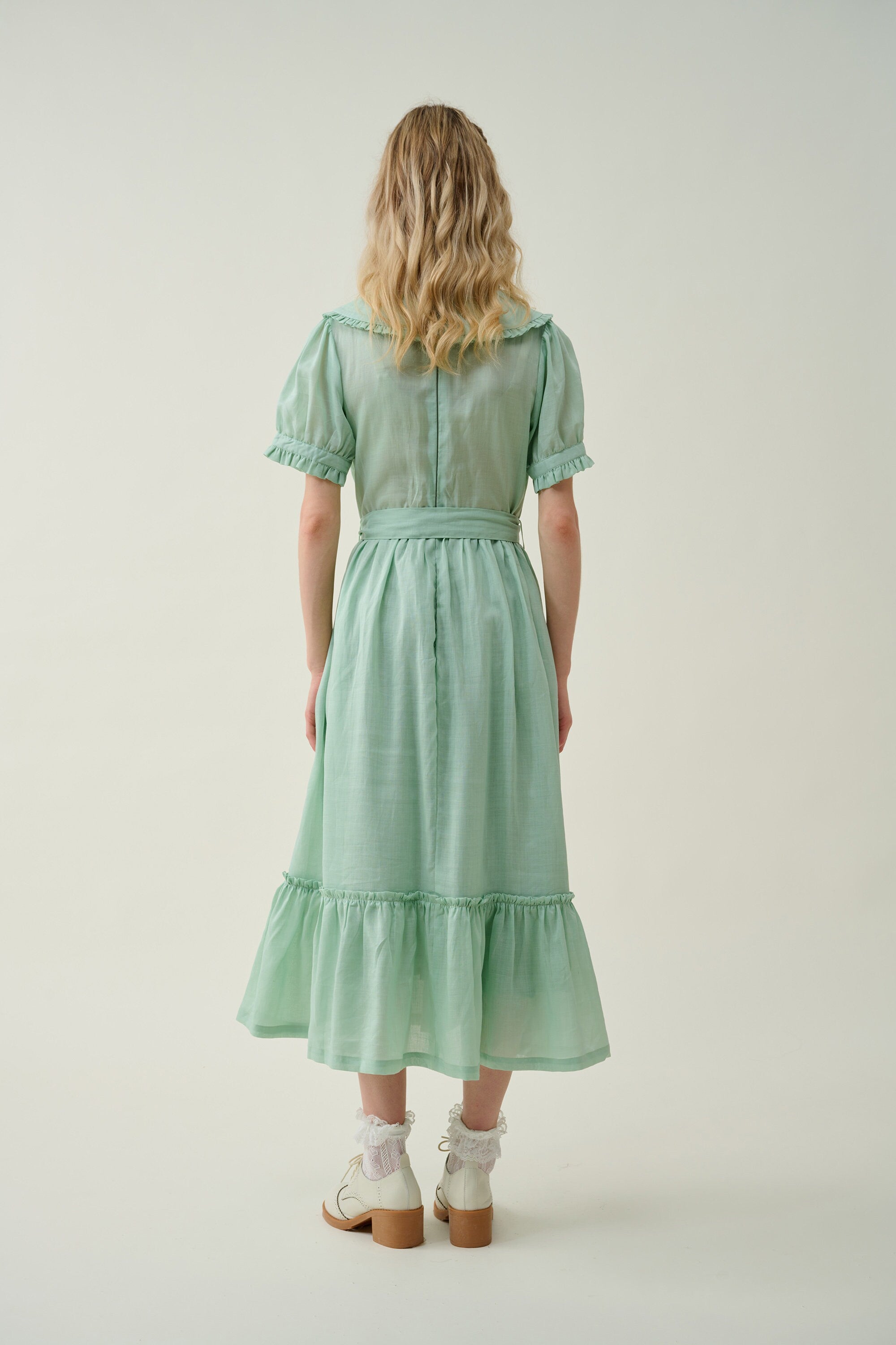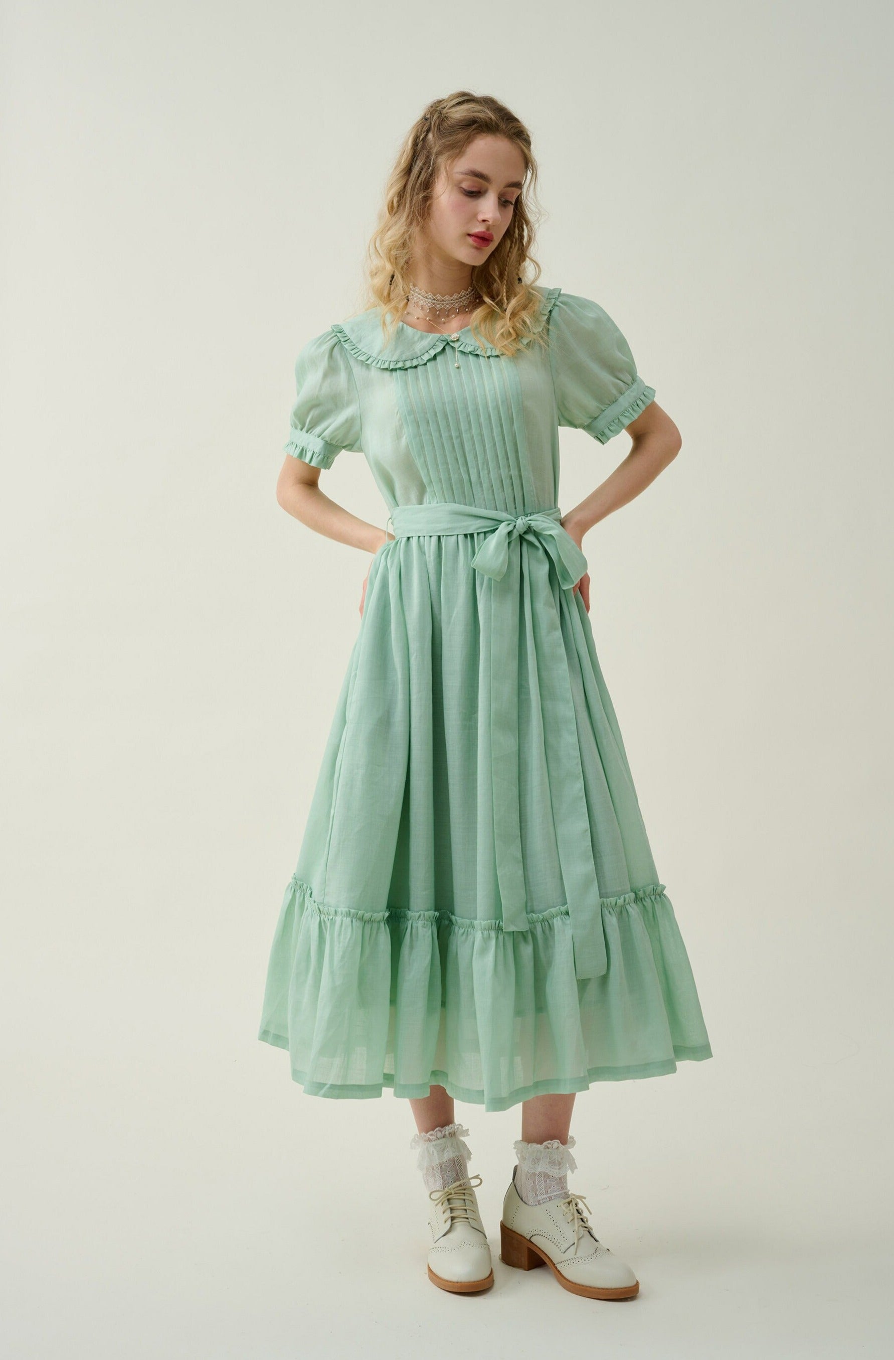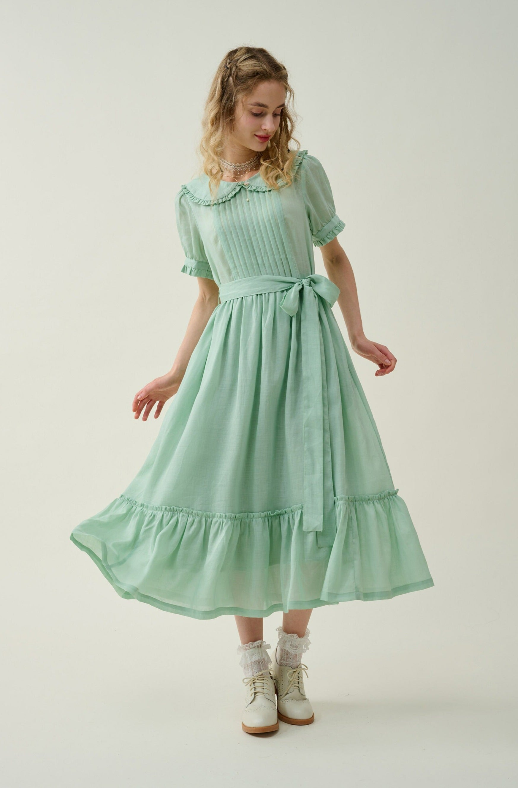 It's made from light linen in an elegant A-line shape. The puff short sleeves and Peter Pan collar are decorated with pretty ruffles, retro and romantic. It's finished with pleated detailing and a tiered skirt for volume.