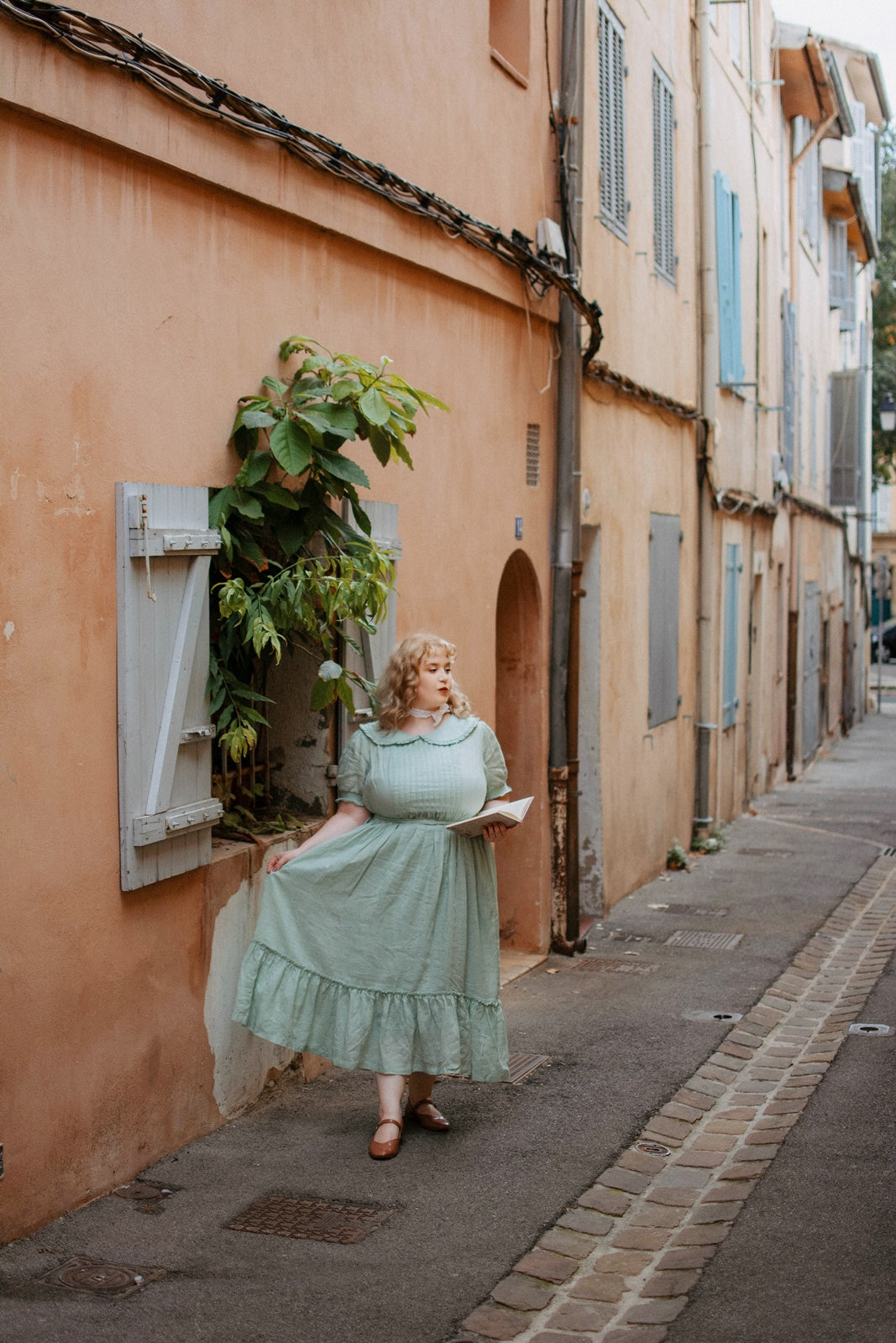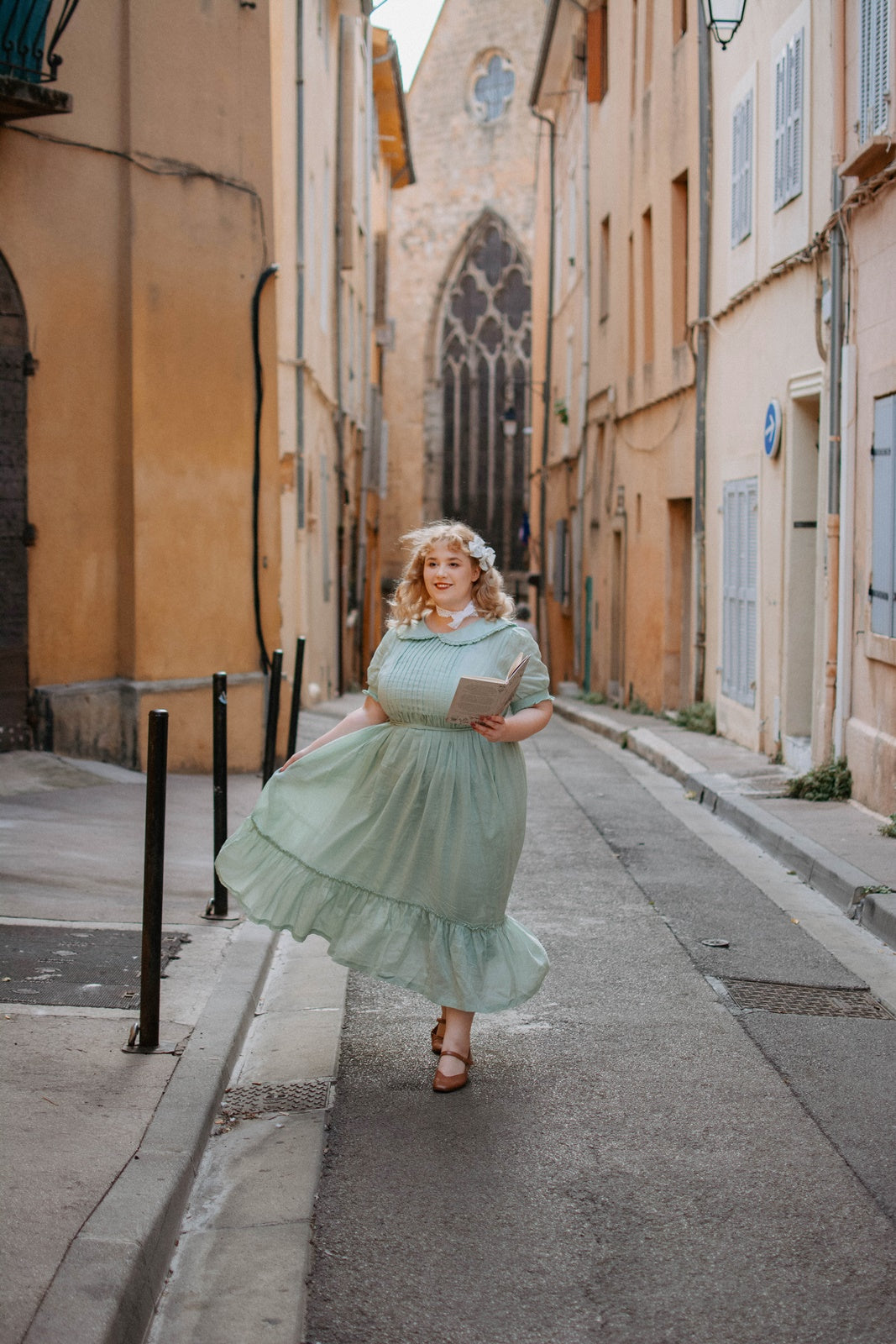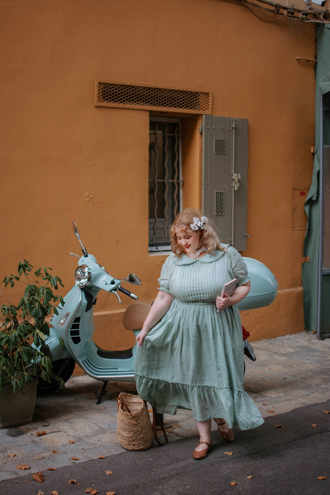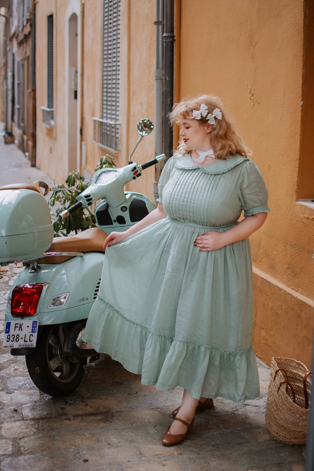 It's made from light linen in an elegant A-line shape. The puff short sleeves and Peter Pan collar are decorated with pretty ruffles, retro and romantic. It's finished with pleated detailing and a tiered skirt for volume.