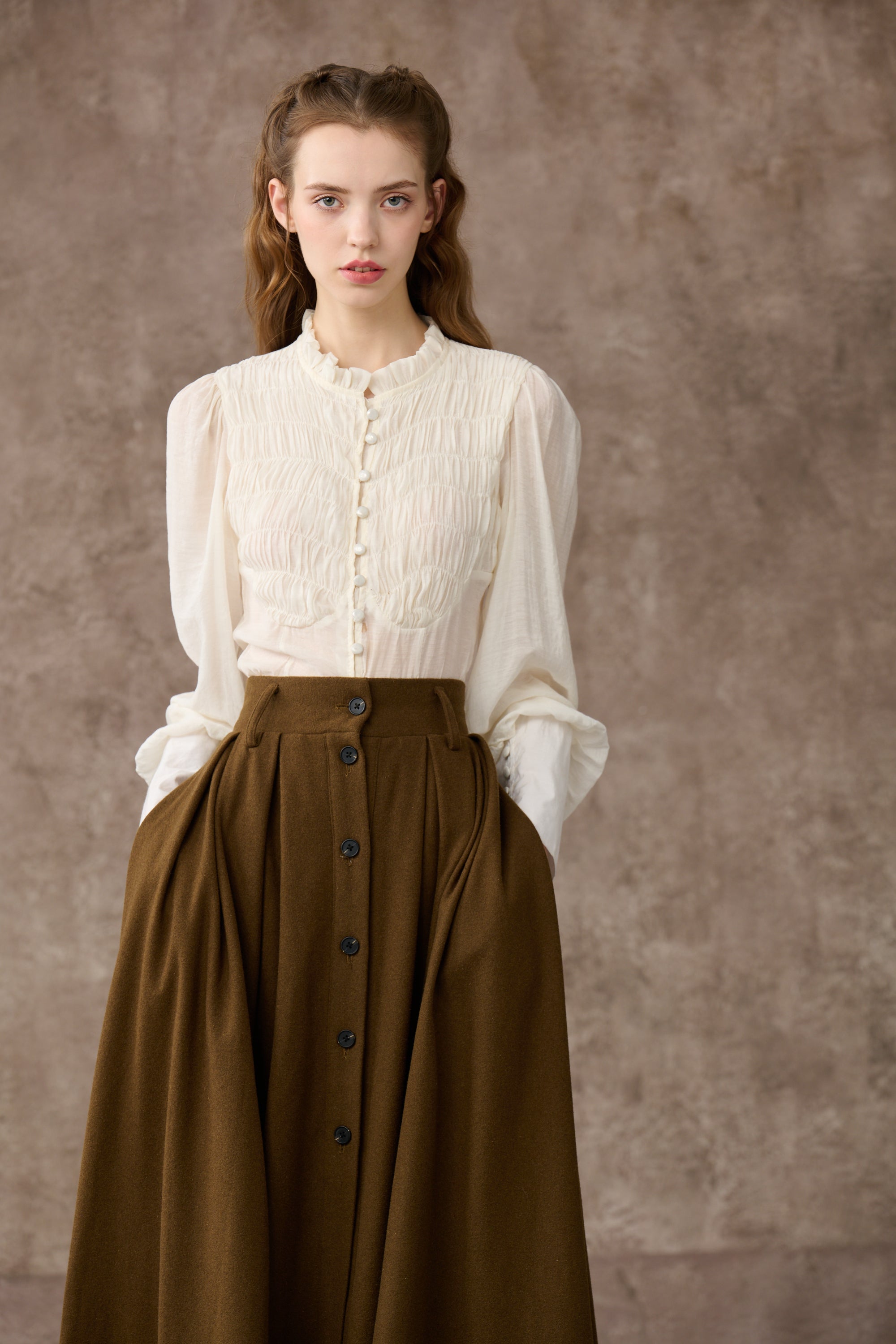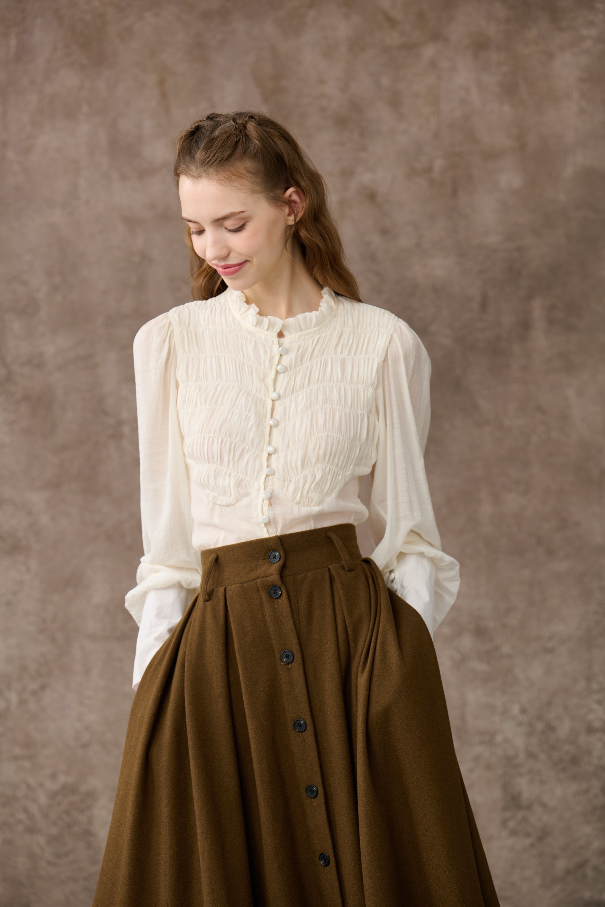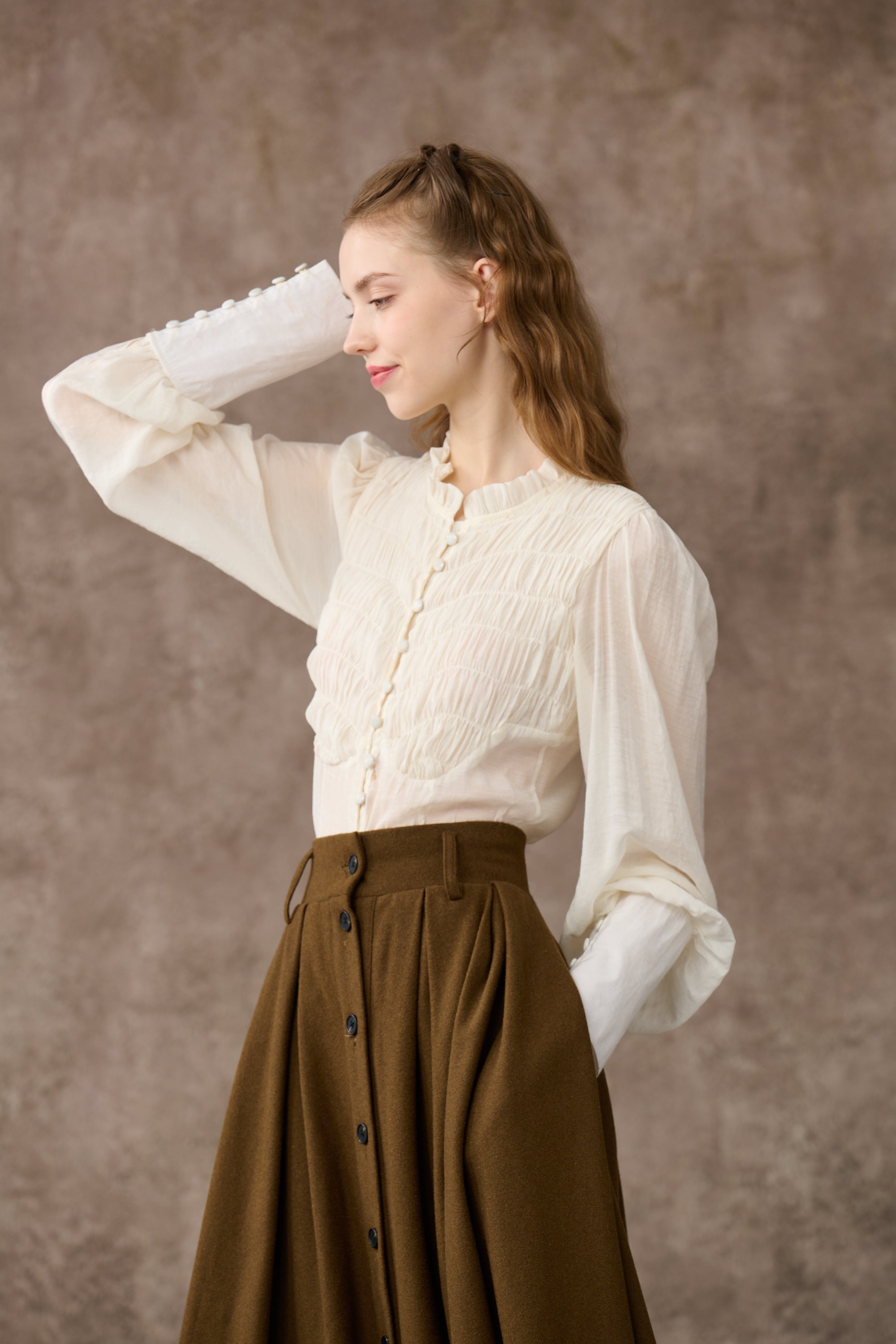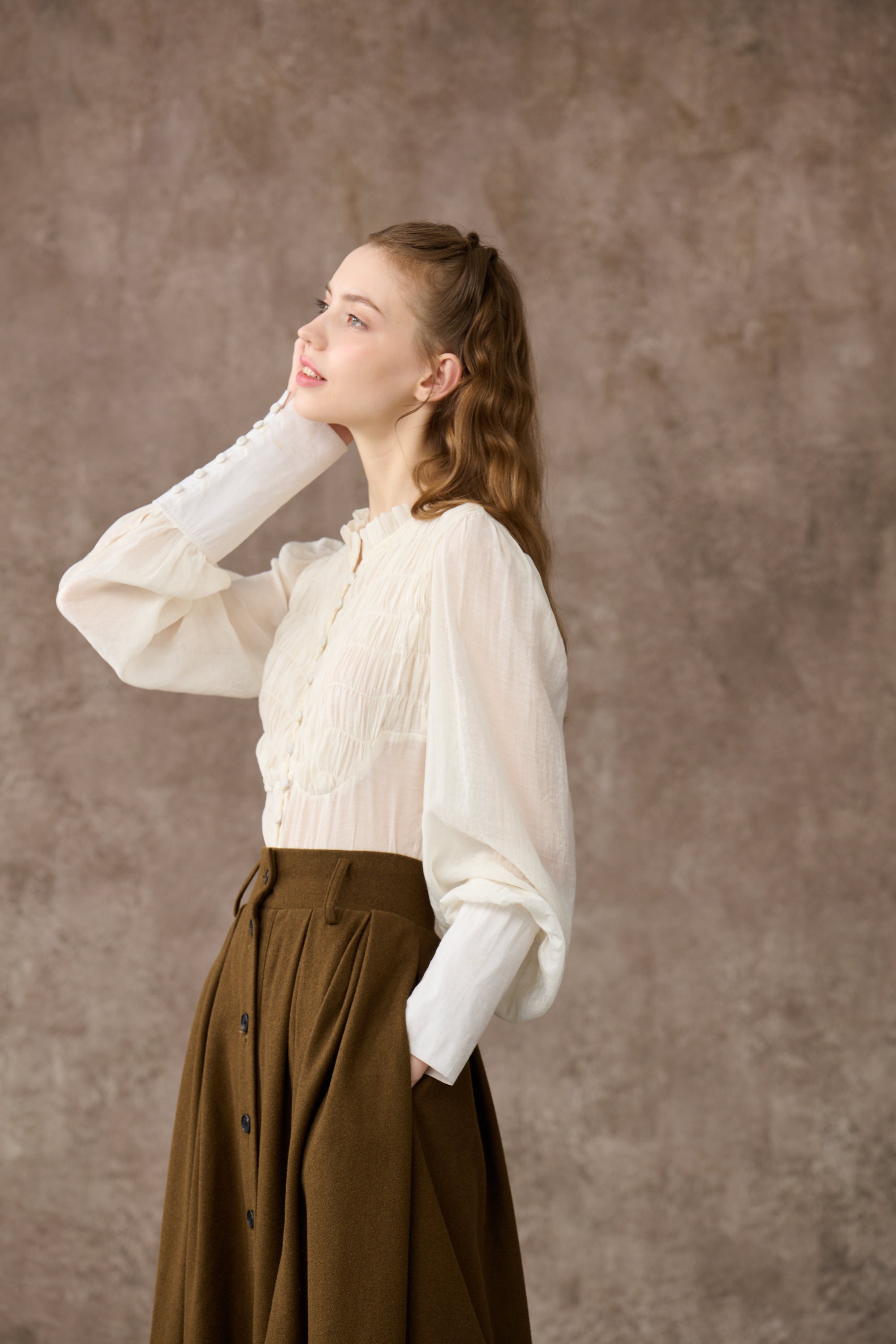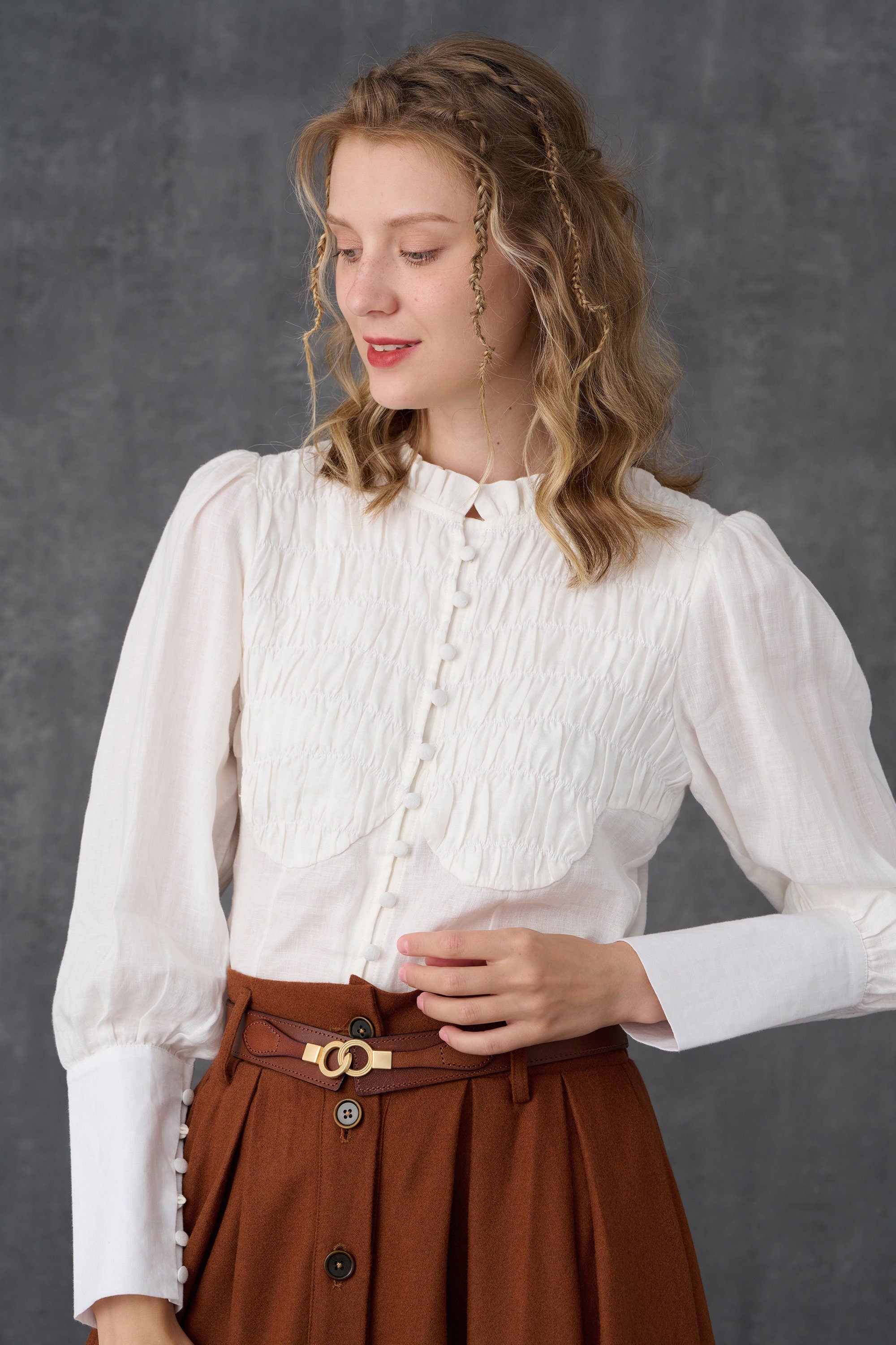 A French elegance exudes from this smocked blouse presented by Linennaive. Crafted from soft linen, this piece features smocked details on the front, a gigot sleeve design and ruffle collar inject a sense of romance into the design.