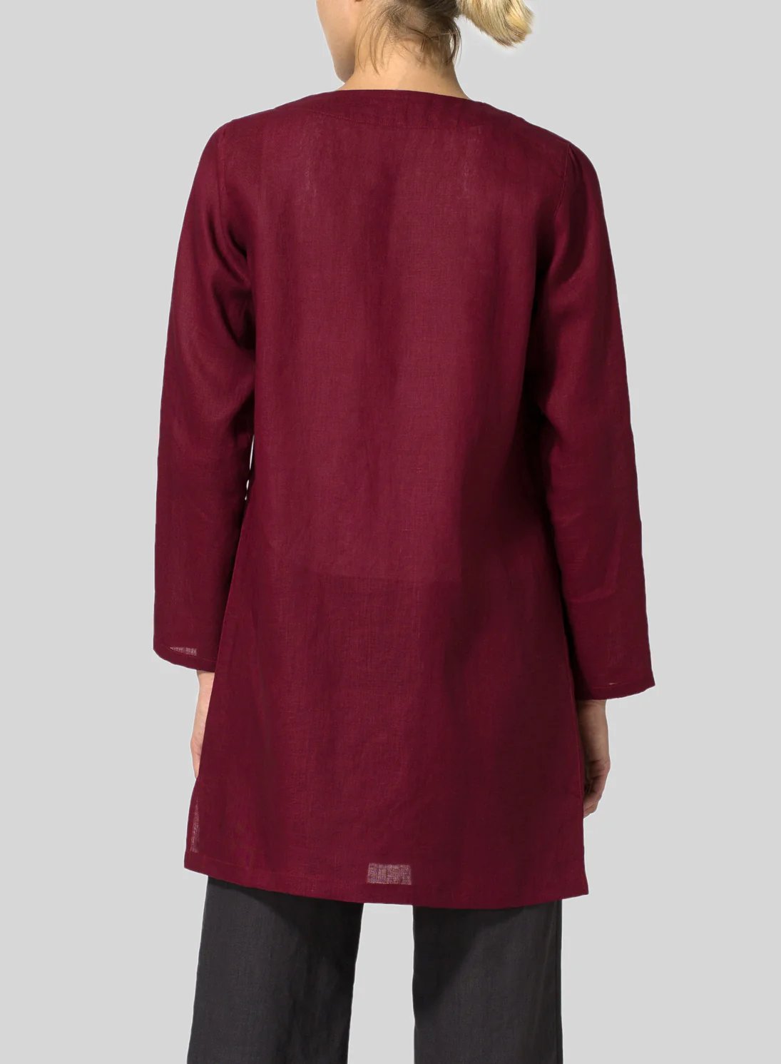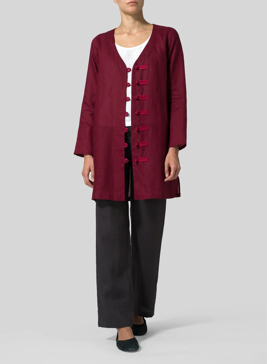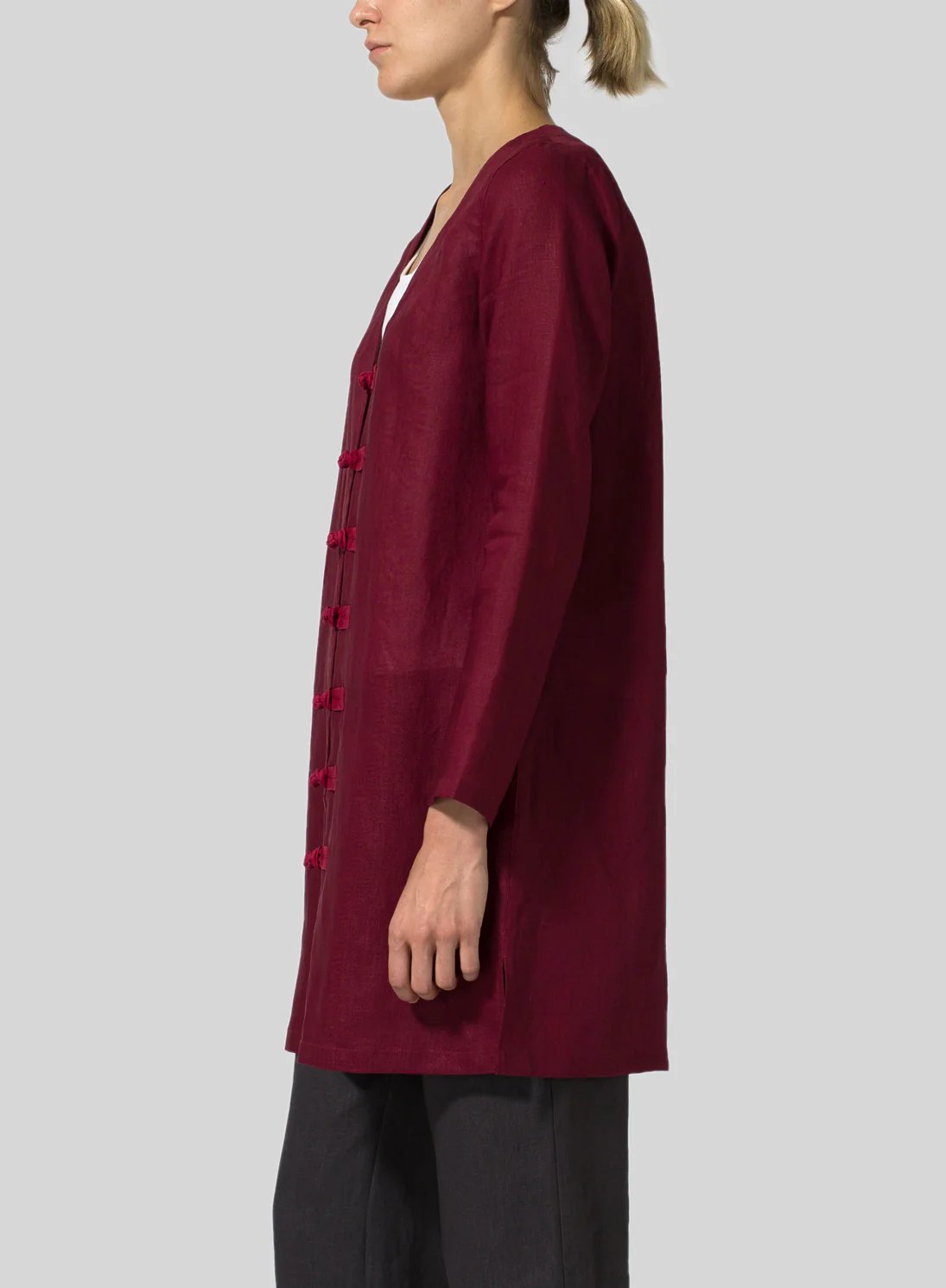 A beautifully Hand-Knotted Button Jacket.Knitted in our textured linen and cotton.With a neat collar,features a simple A-line design.V neck and length sleeves,front hand-knot button closure.Advanced and elegant color scheme in color.The handcrafted knot button is an attractive fastening. Loose fit, hem just above the knee.Wear it as a top or jacket for different styling purposes.