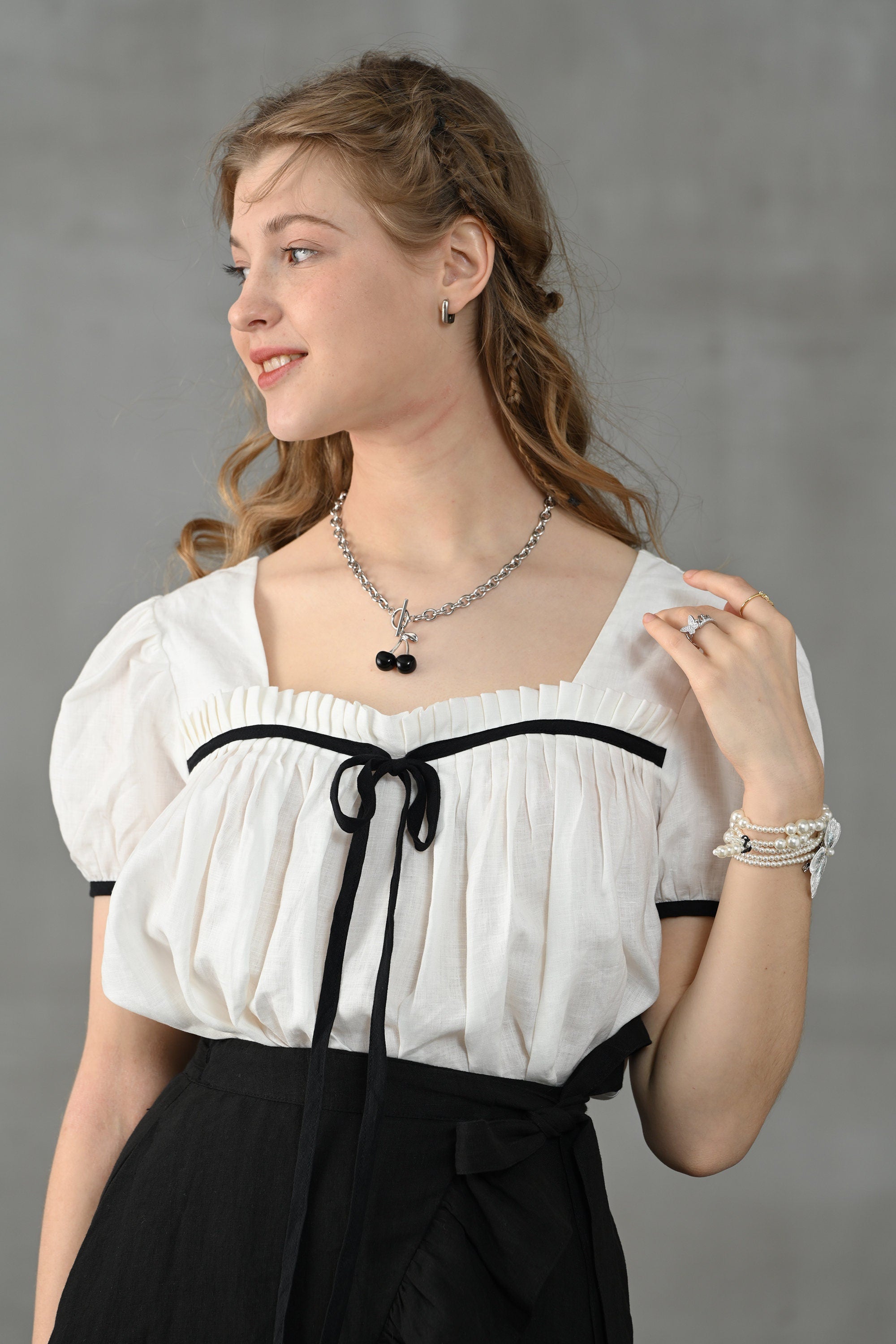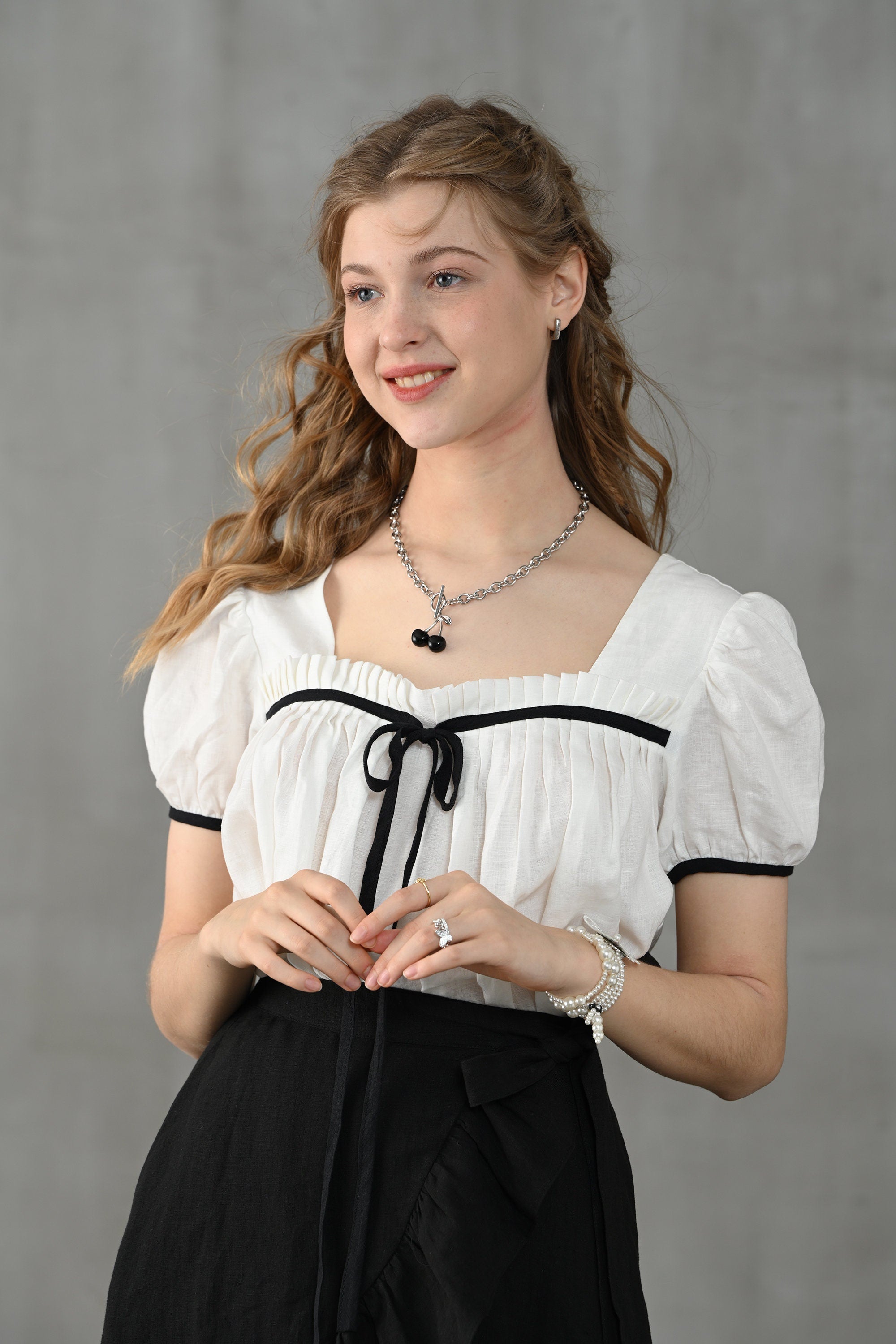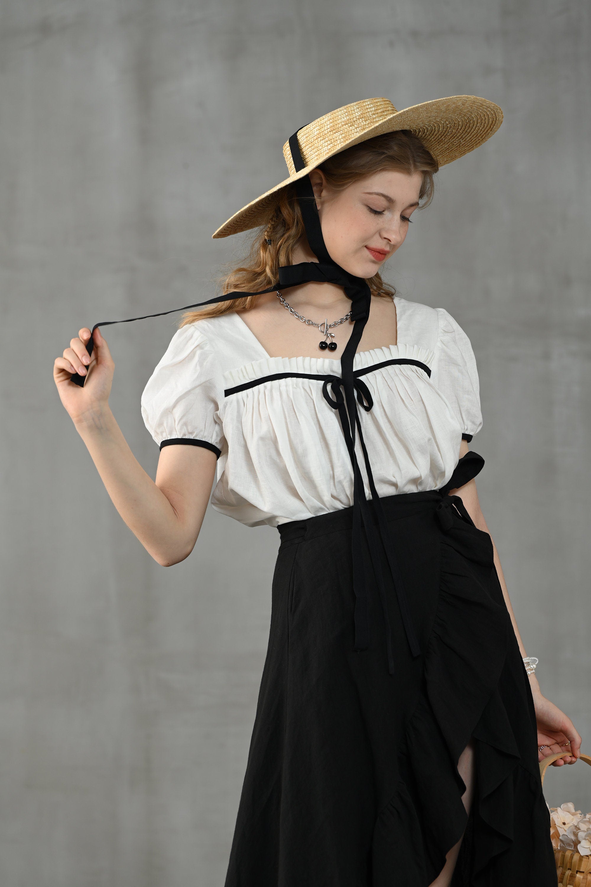 Features a ruffled neckline with contrast ties at the front for a detailed but timeless silhouette. puff sleeve silhouette adds to the piece's fresh and lightweight nature.