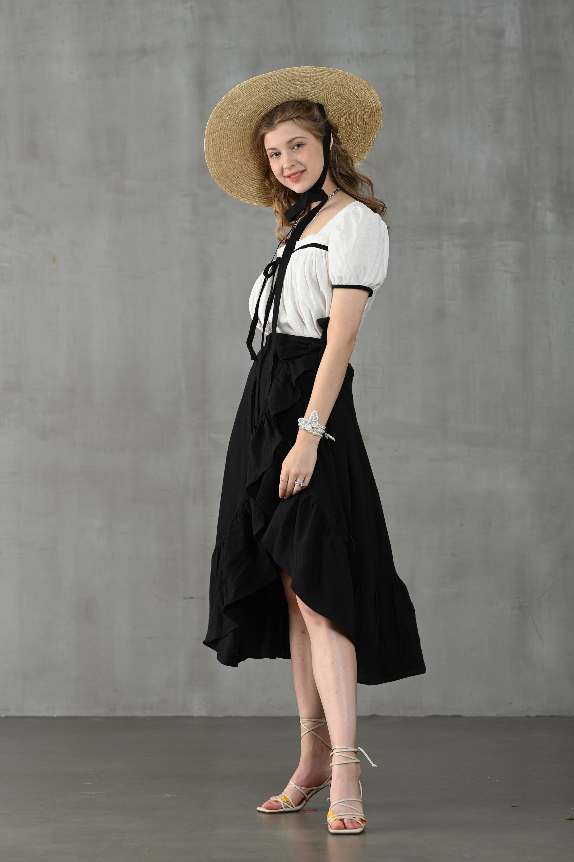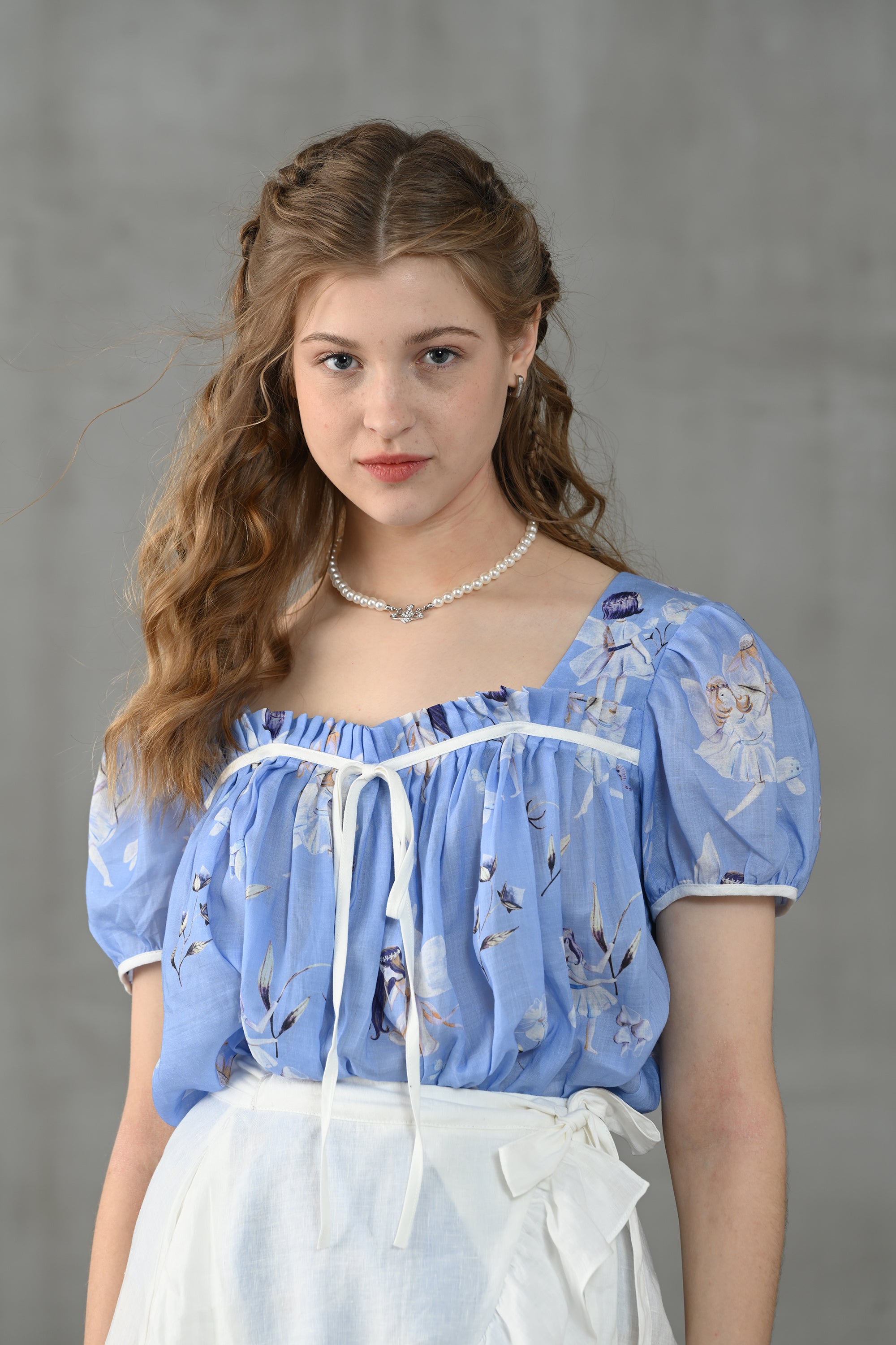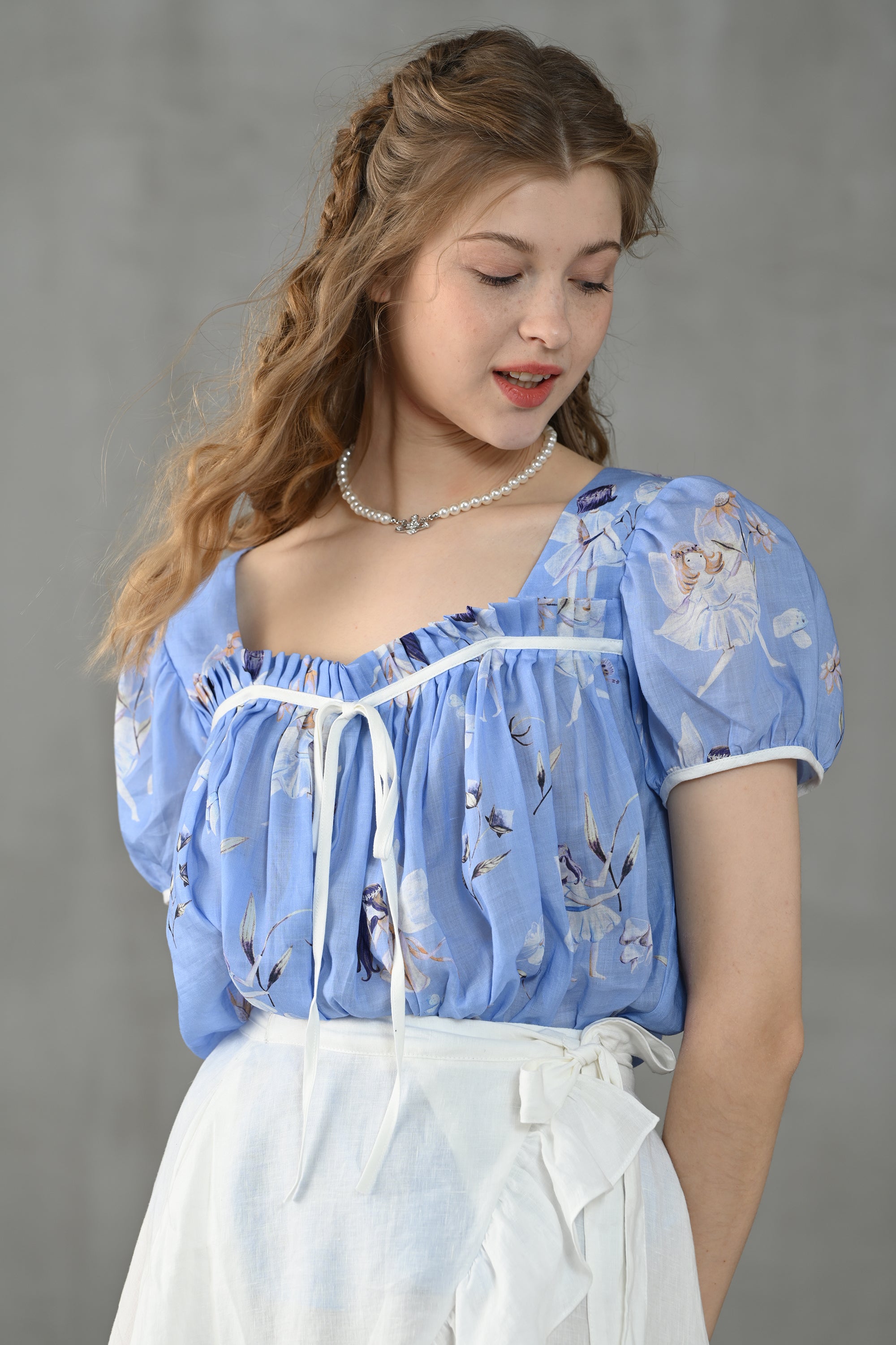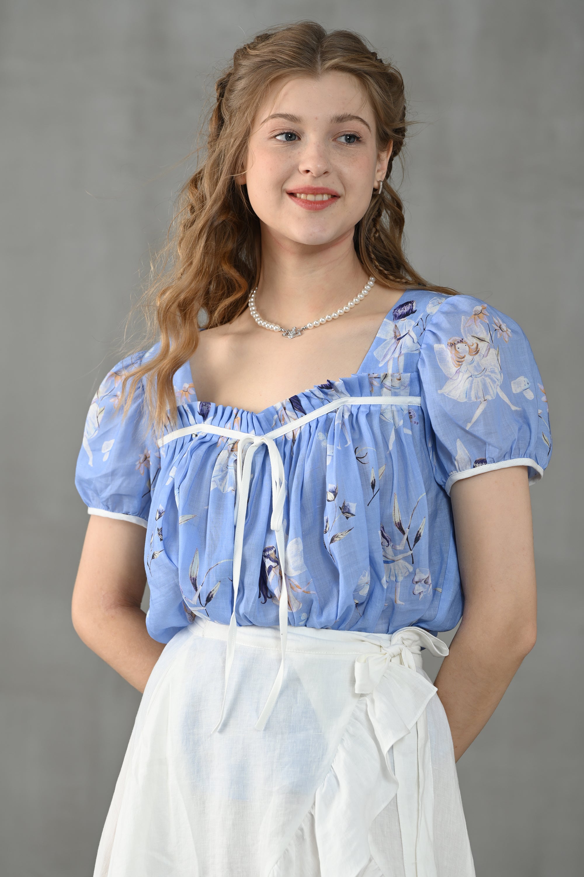 Features a ruffled neckline with contrast ties at the front for a detailed but timeless silhouette. puff sleeve silhouette adds to the piece's fresh and lightweight nature.