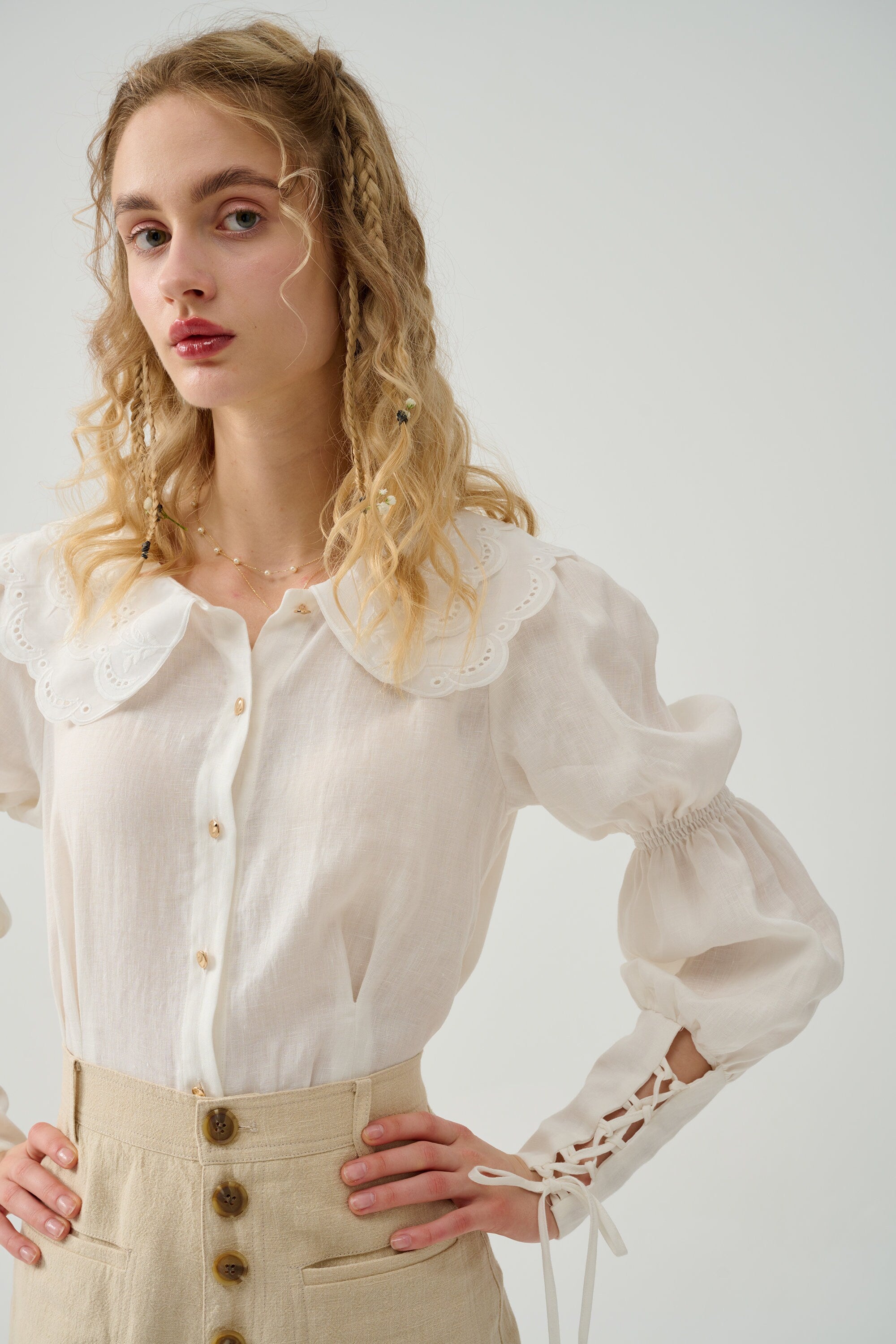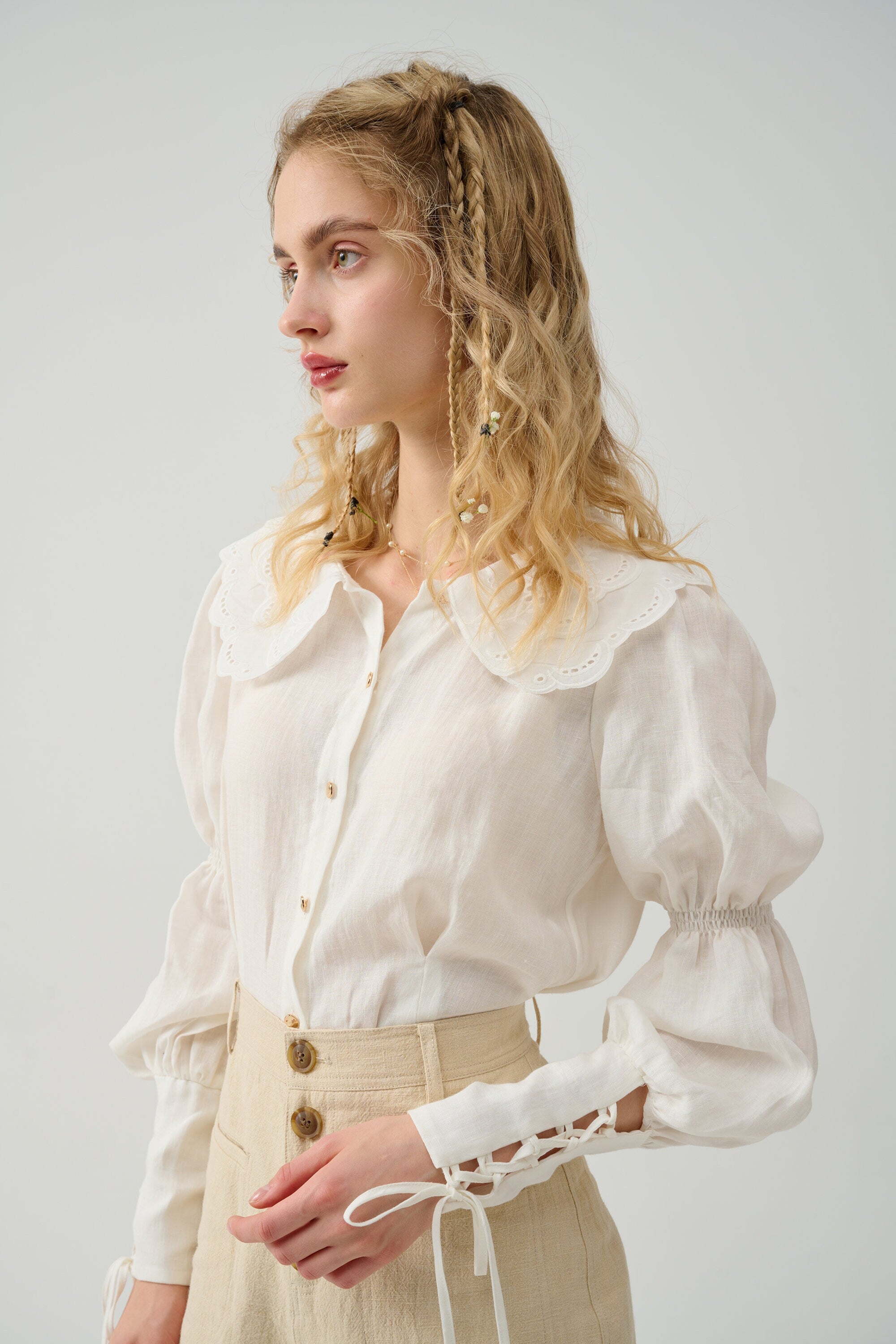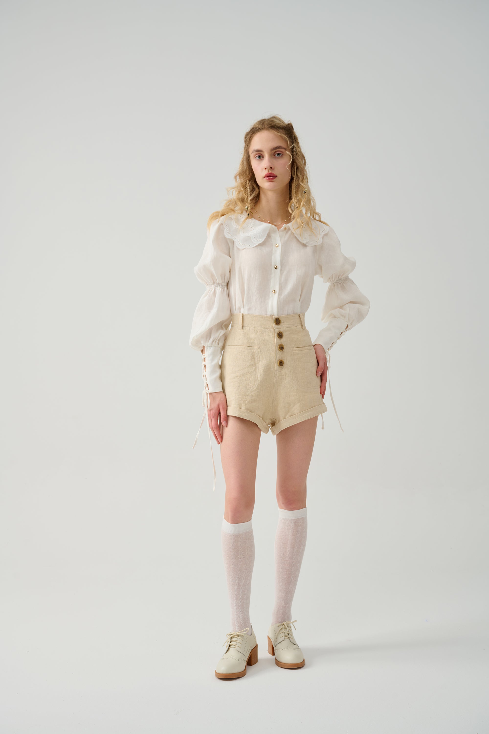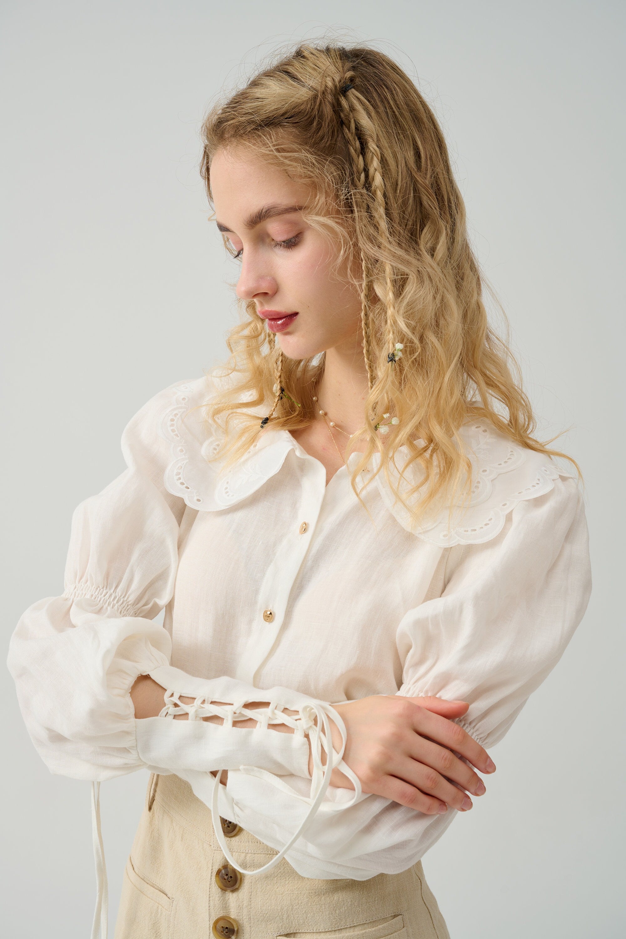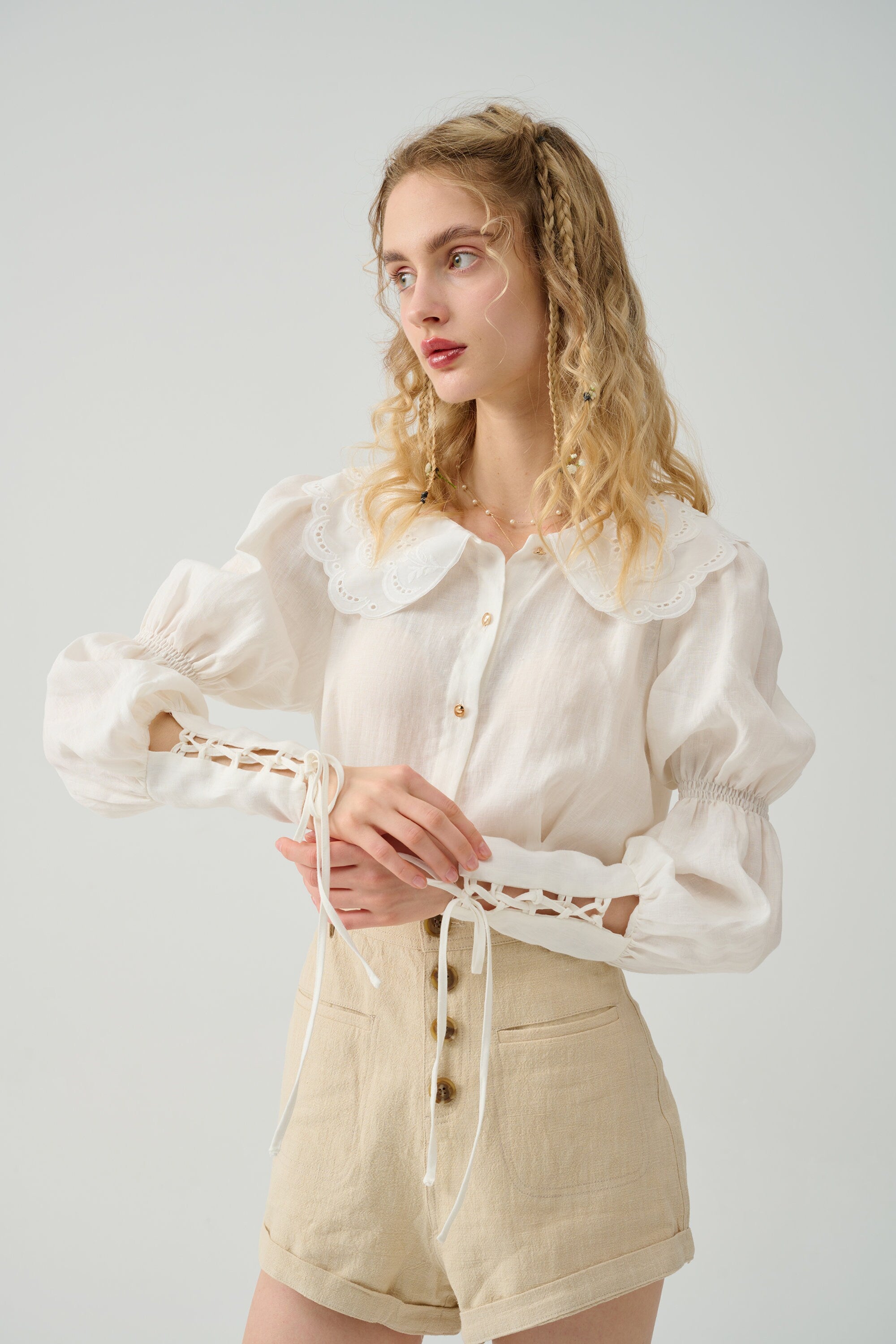 Cut for a relaxed silhouette, it has puff sleeves and elasticated lacing-up sleeves with pleated detail exude vintage elegance. Winning combination.