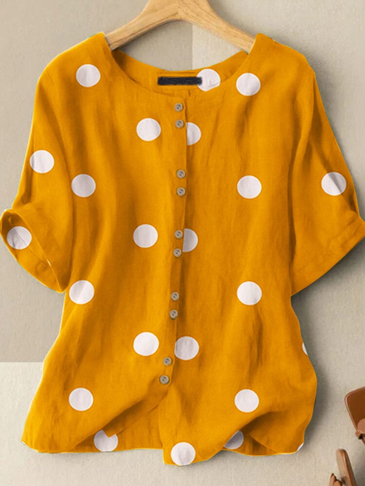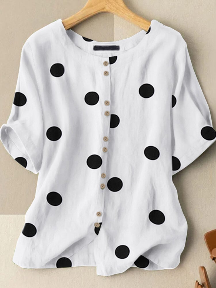 • Dot Print Button Front Crew Neck Half Sleeve Blouse