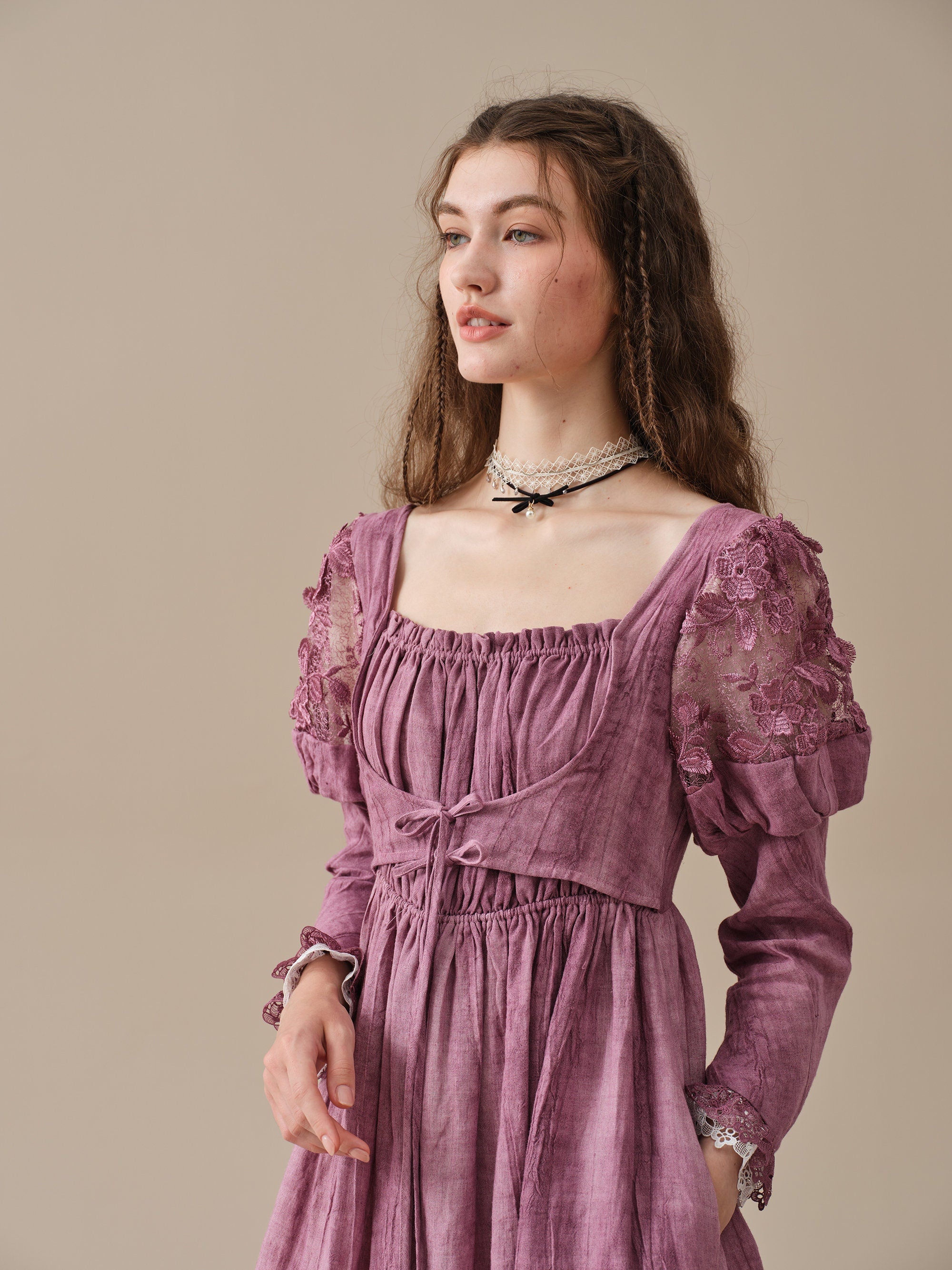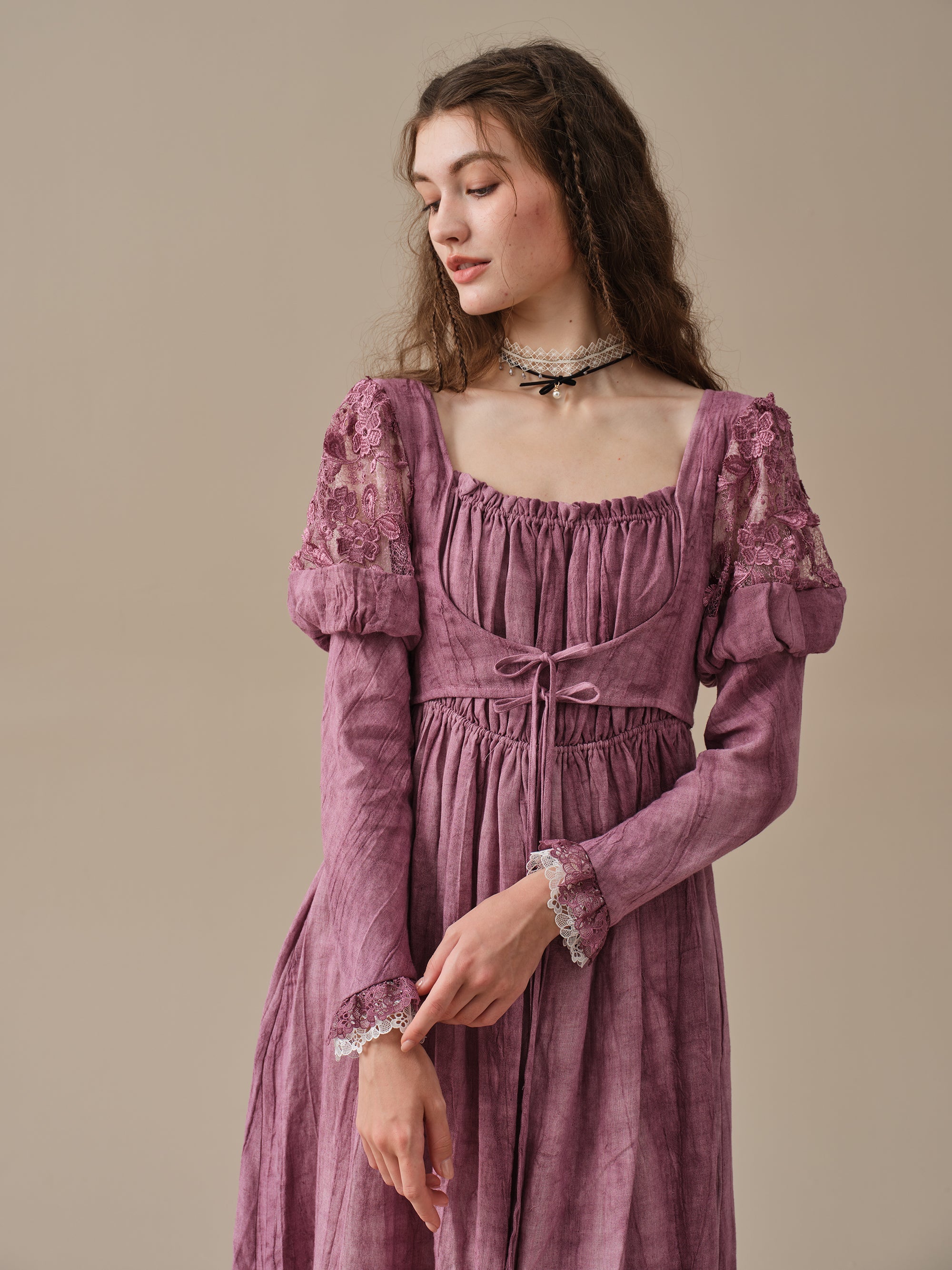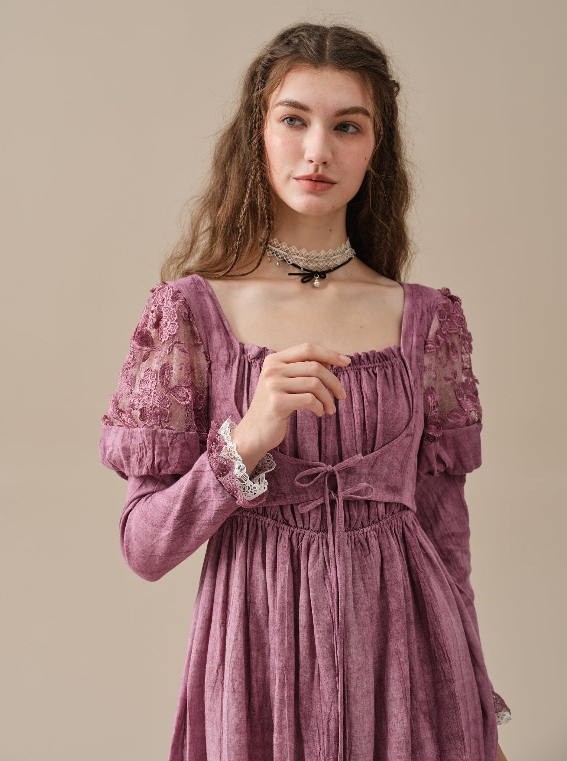 This dress is tie-dyed by hand so that each piece is truly unique, like a work of art. It's also pretty detailed - puffed sleeves with floral lace detailing are playful yet romantic, lace-up designs and layered silhouette ensure a perfect fit that will turn heads wherever you go .