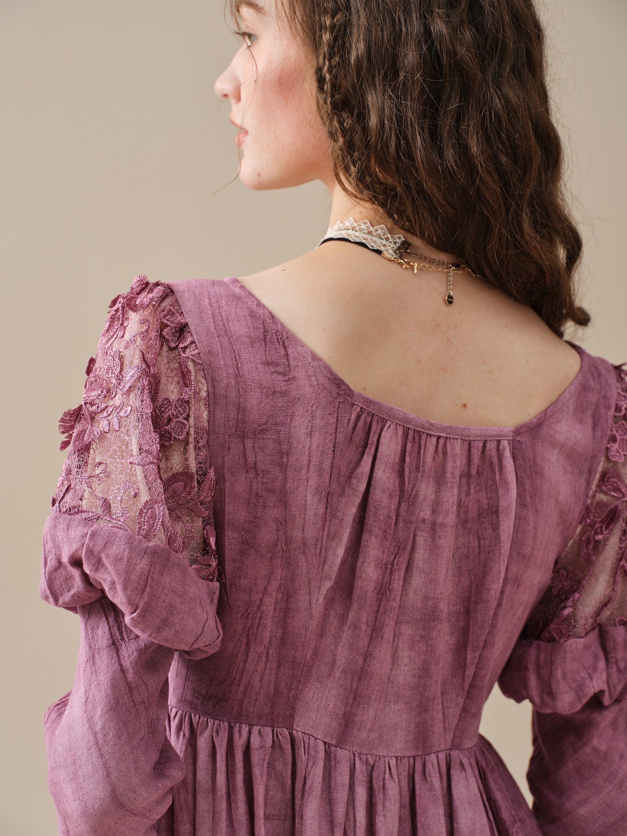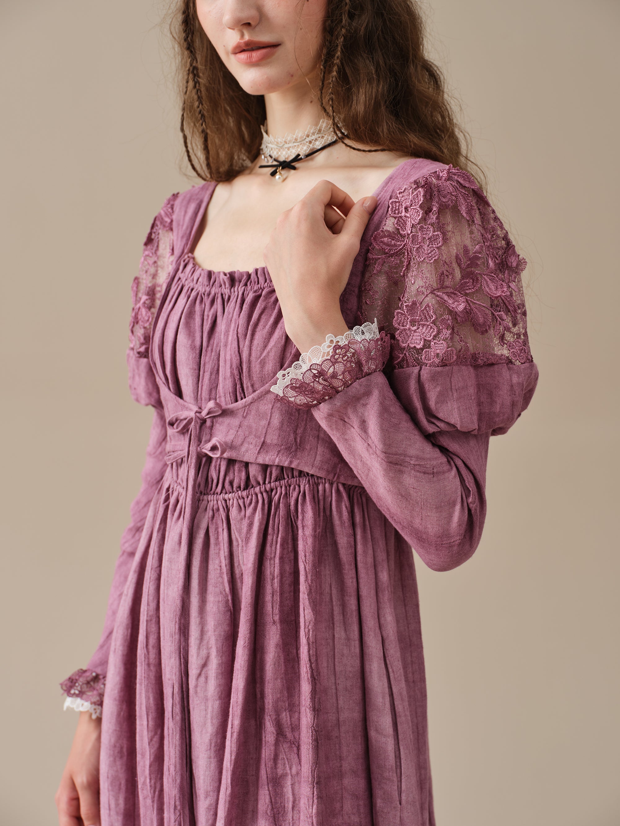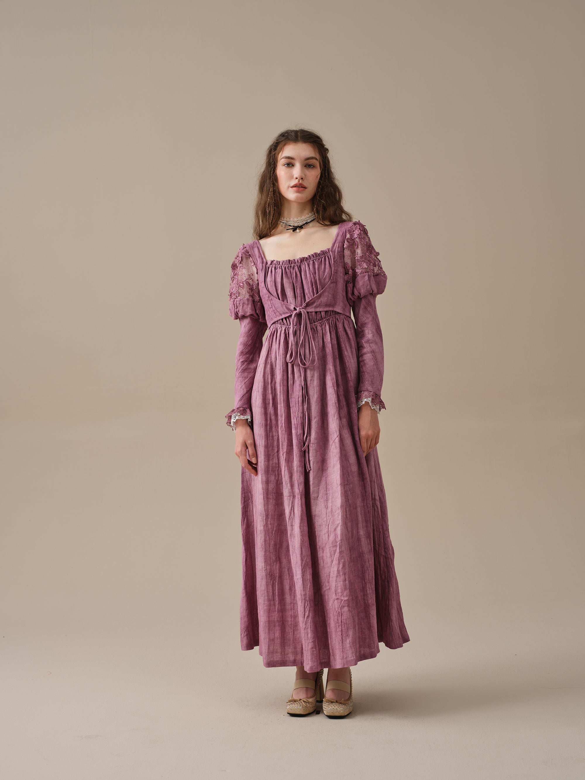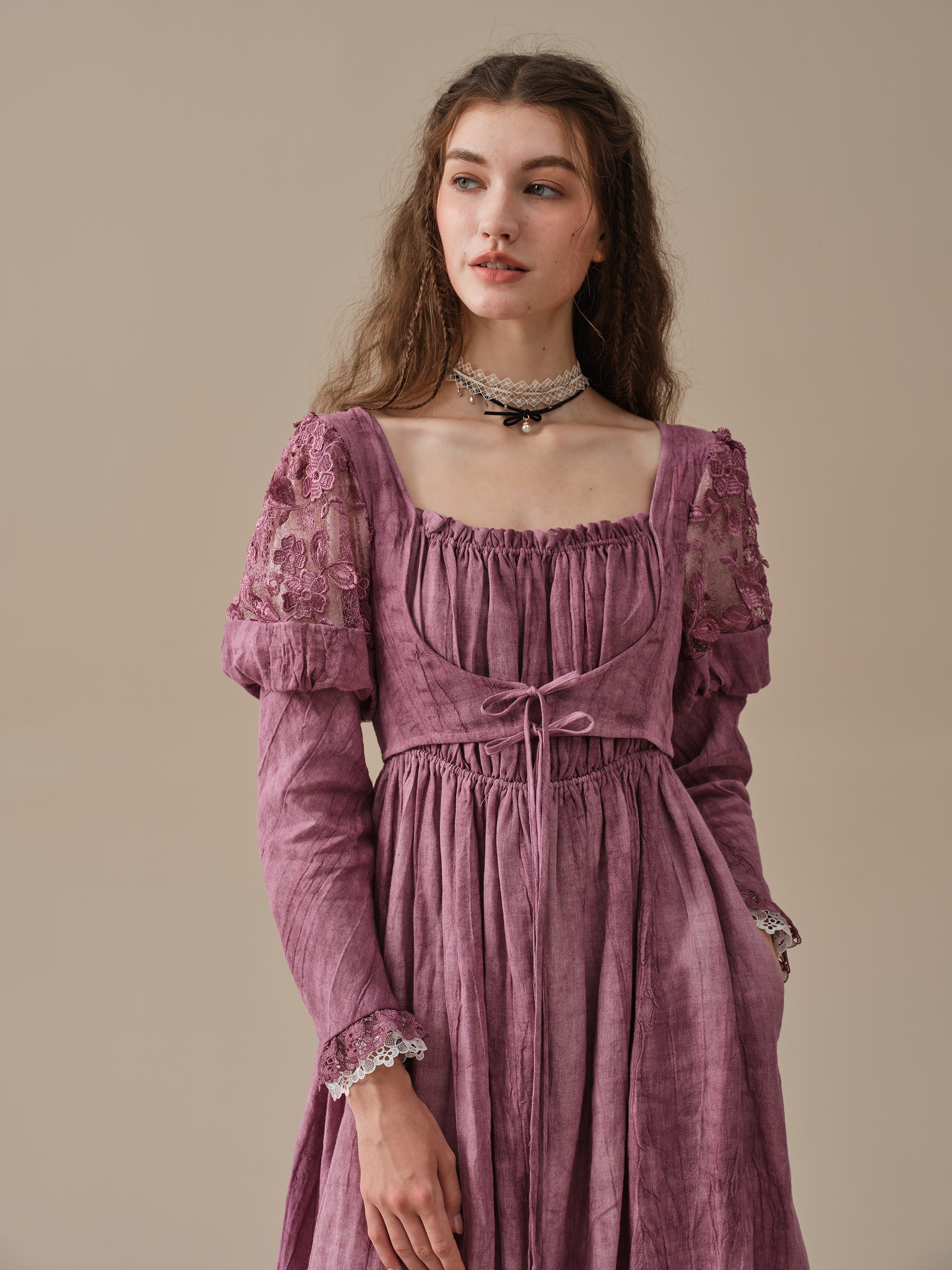 This dress is tie-dyed by hand so that each piece is truly unique, like a work of art. It's also pretty detailed - puffed sleeves with floral lace detailing are playful yet romantic, lace-up designs and layered silhouette ensure a perfect fit that will turn heads wherever you go .