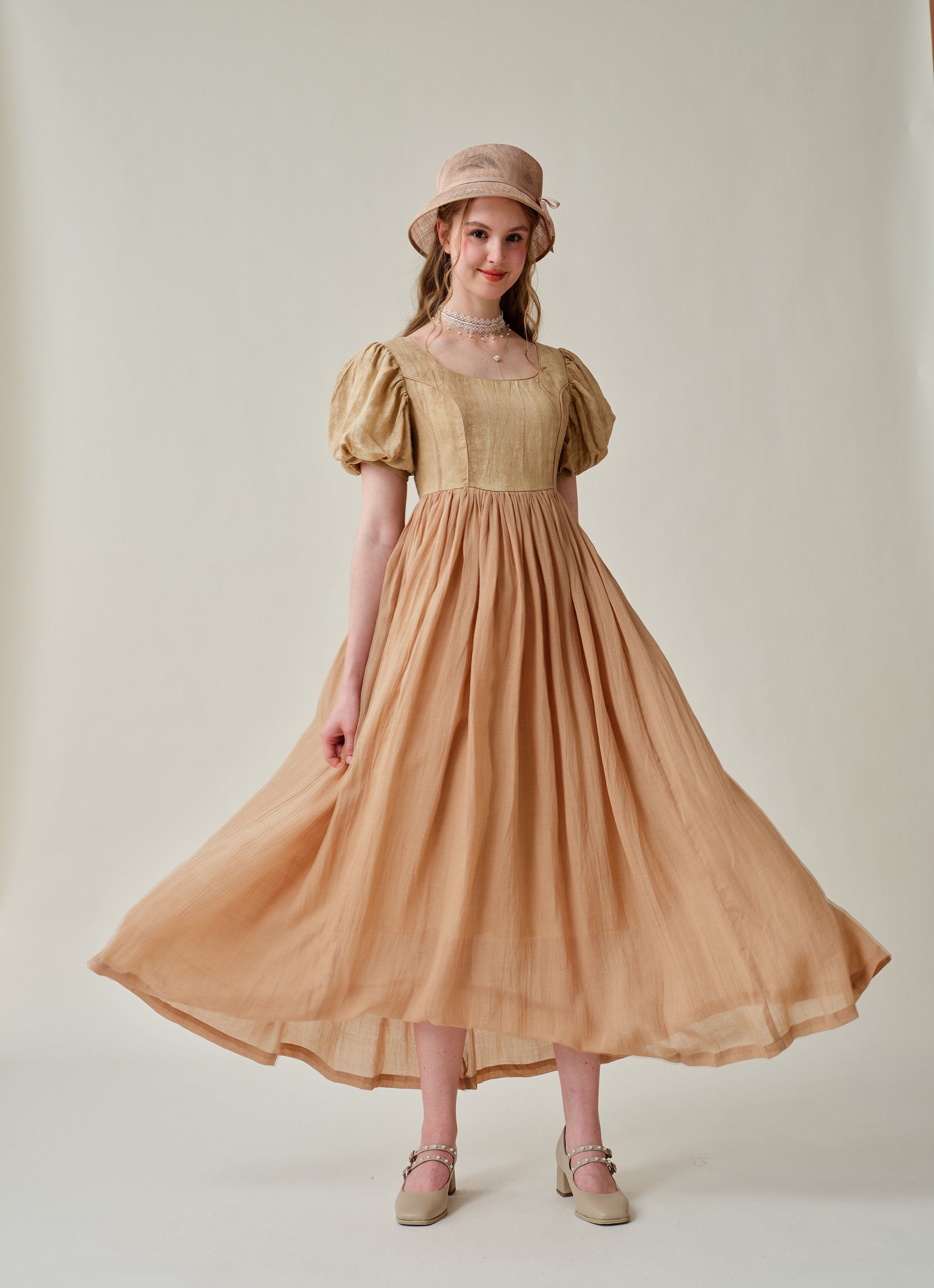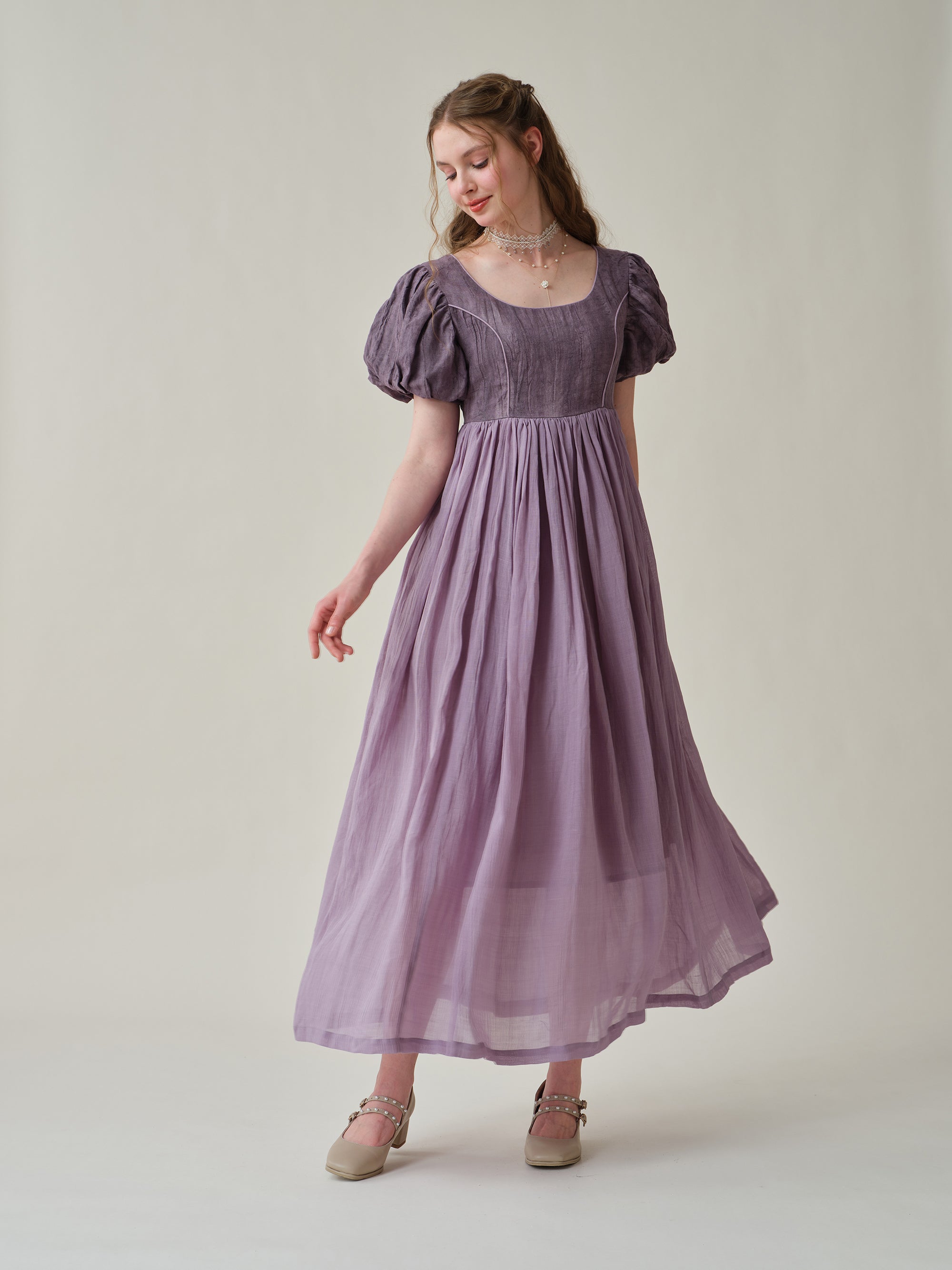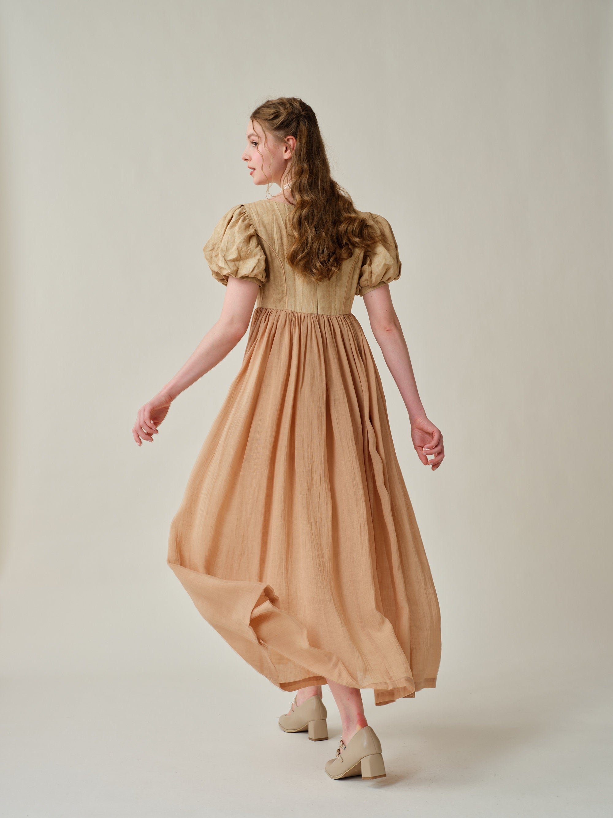 Puff sleeves with soft pleats and flowing skirt exudes vintage-inspired charm. Will make you stand out from the crowd.