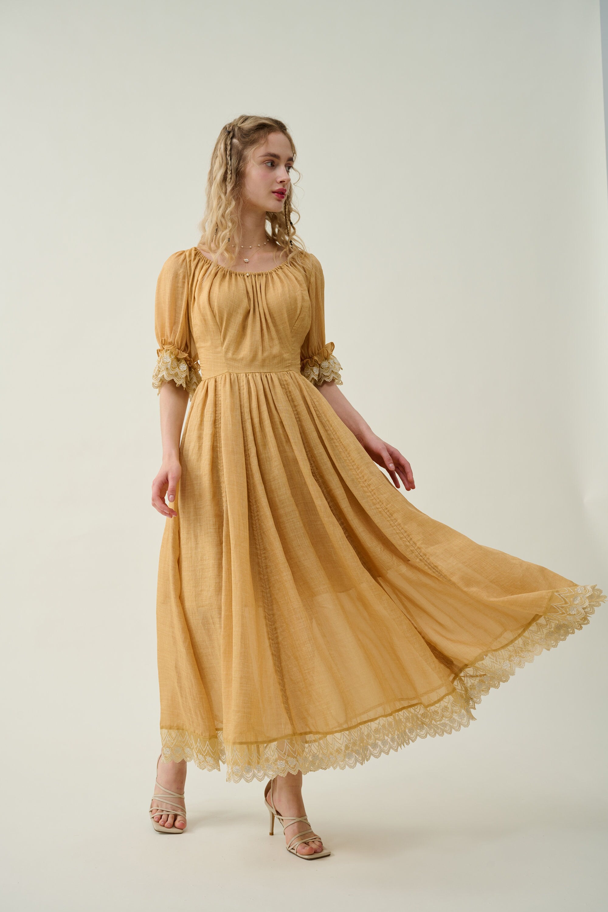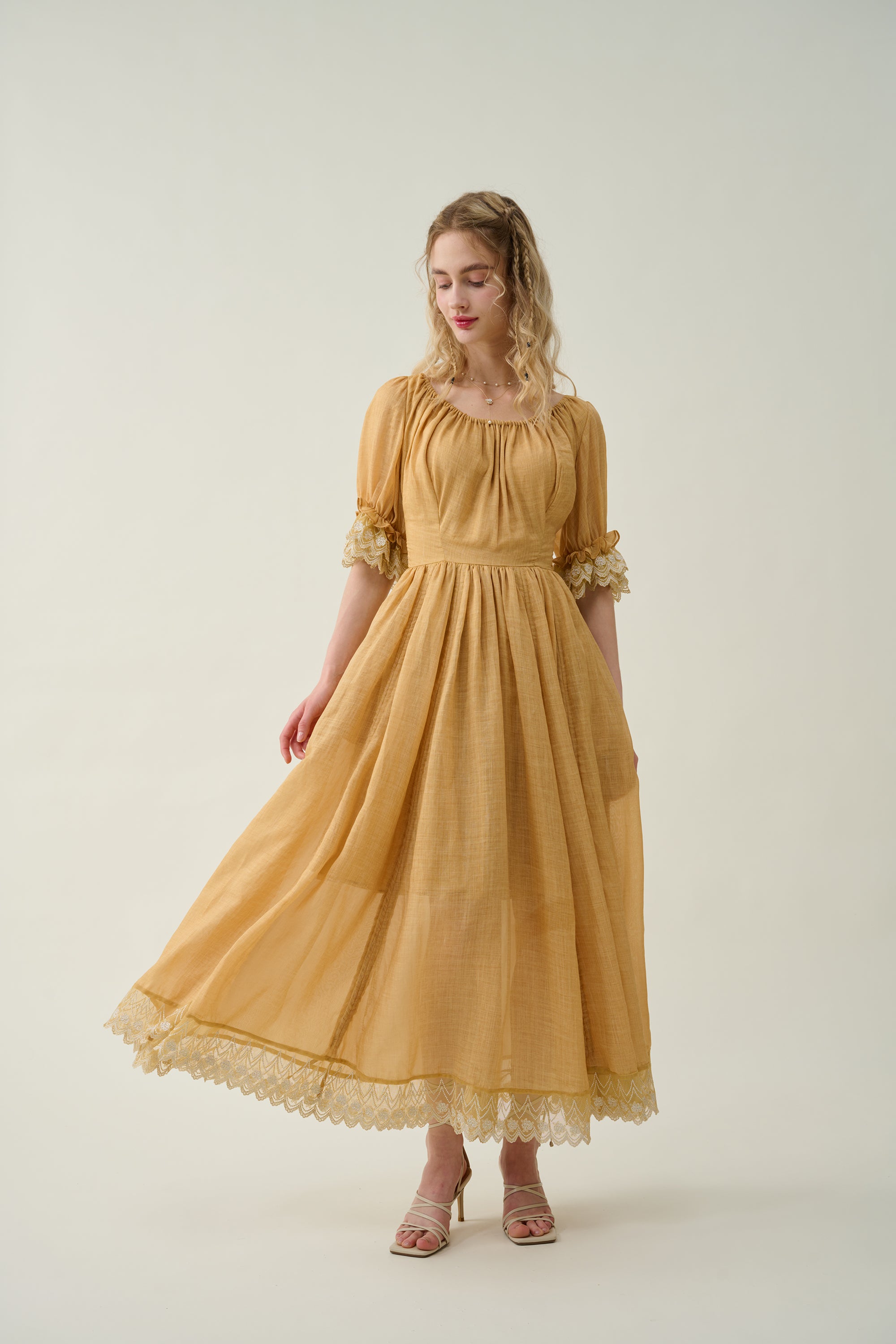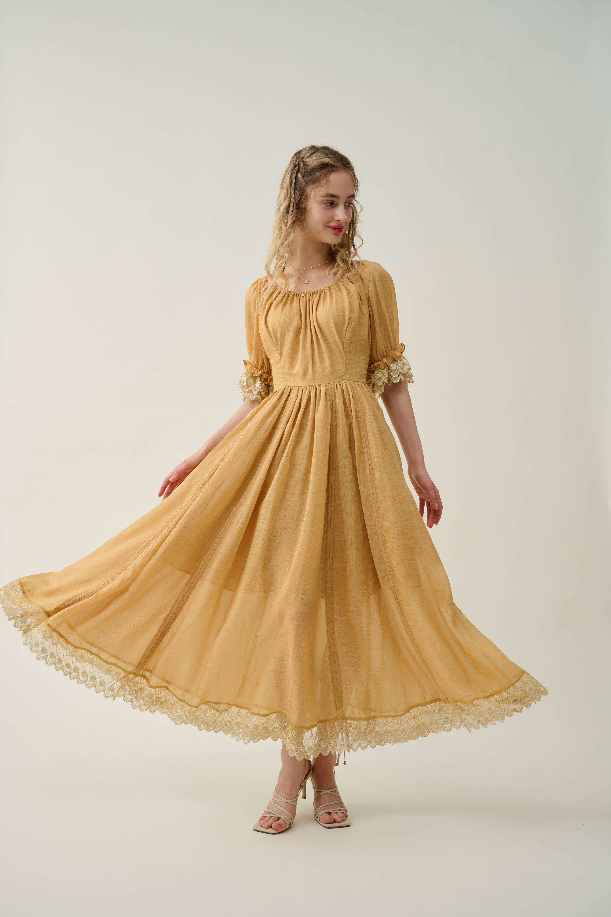 This Linen is accented with a bold lace trim made by our talented designers after lots of research into the shapes of burn—out prints lace and cutout craft. You’ll find this trim at the sleeves and the hem. This dress is just bursting with little details that will amaze you.