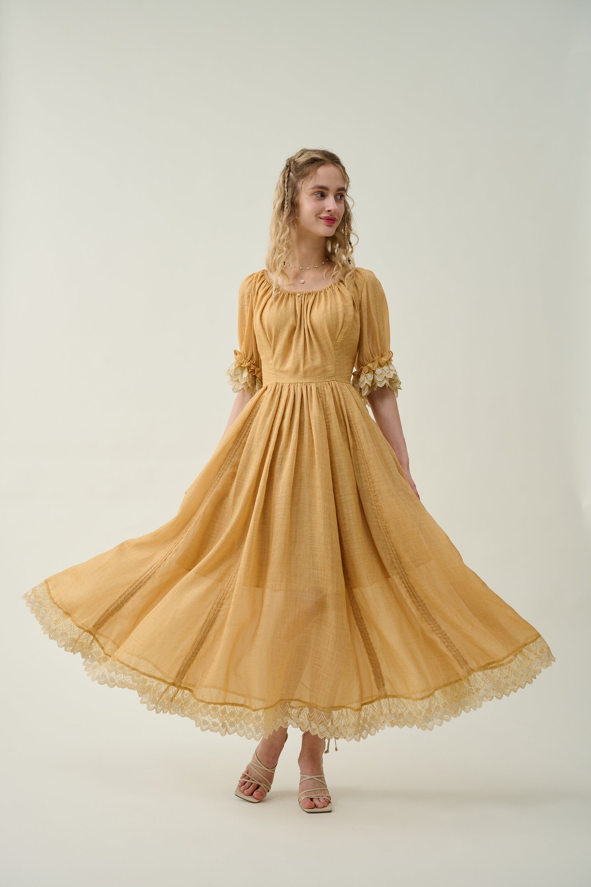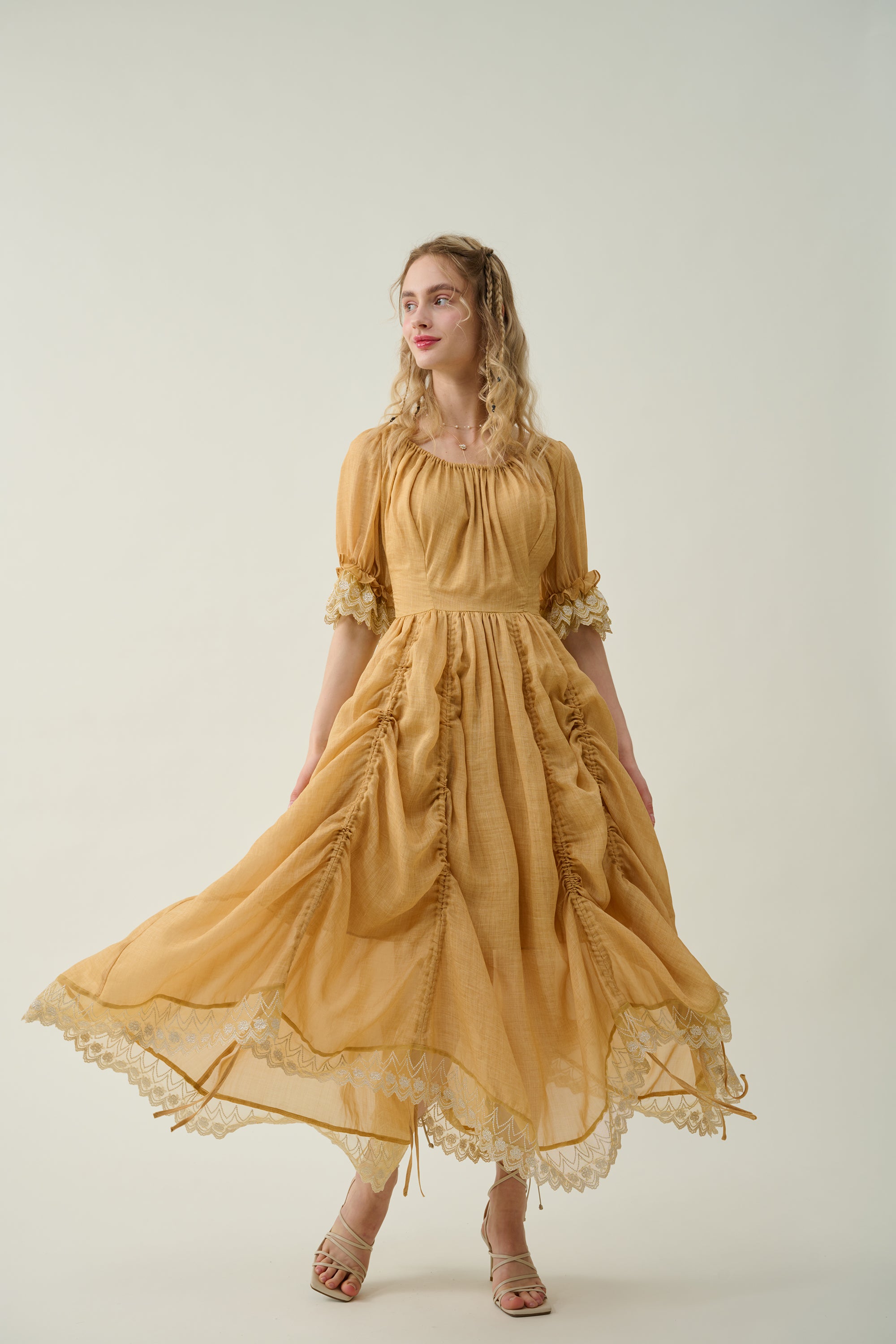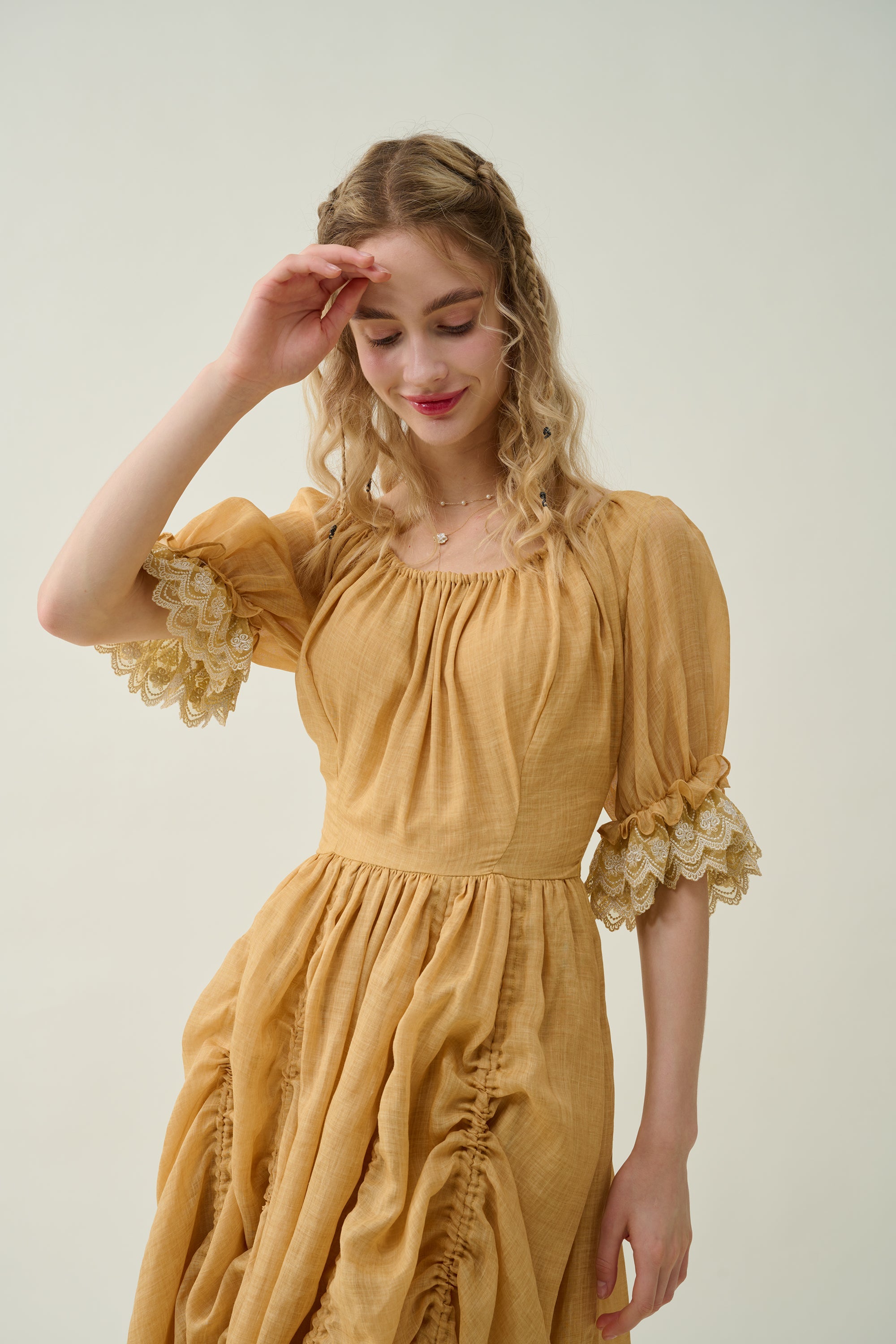 This Linen is accented with a bold lace trim made by our talented designers after lots of research into the shapes of burn—out prints lace and cutout craft. You’ll find this trim at the sleeves and the hem. This dress is just bursting with little details that will amaze you.