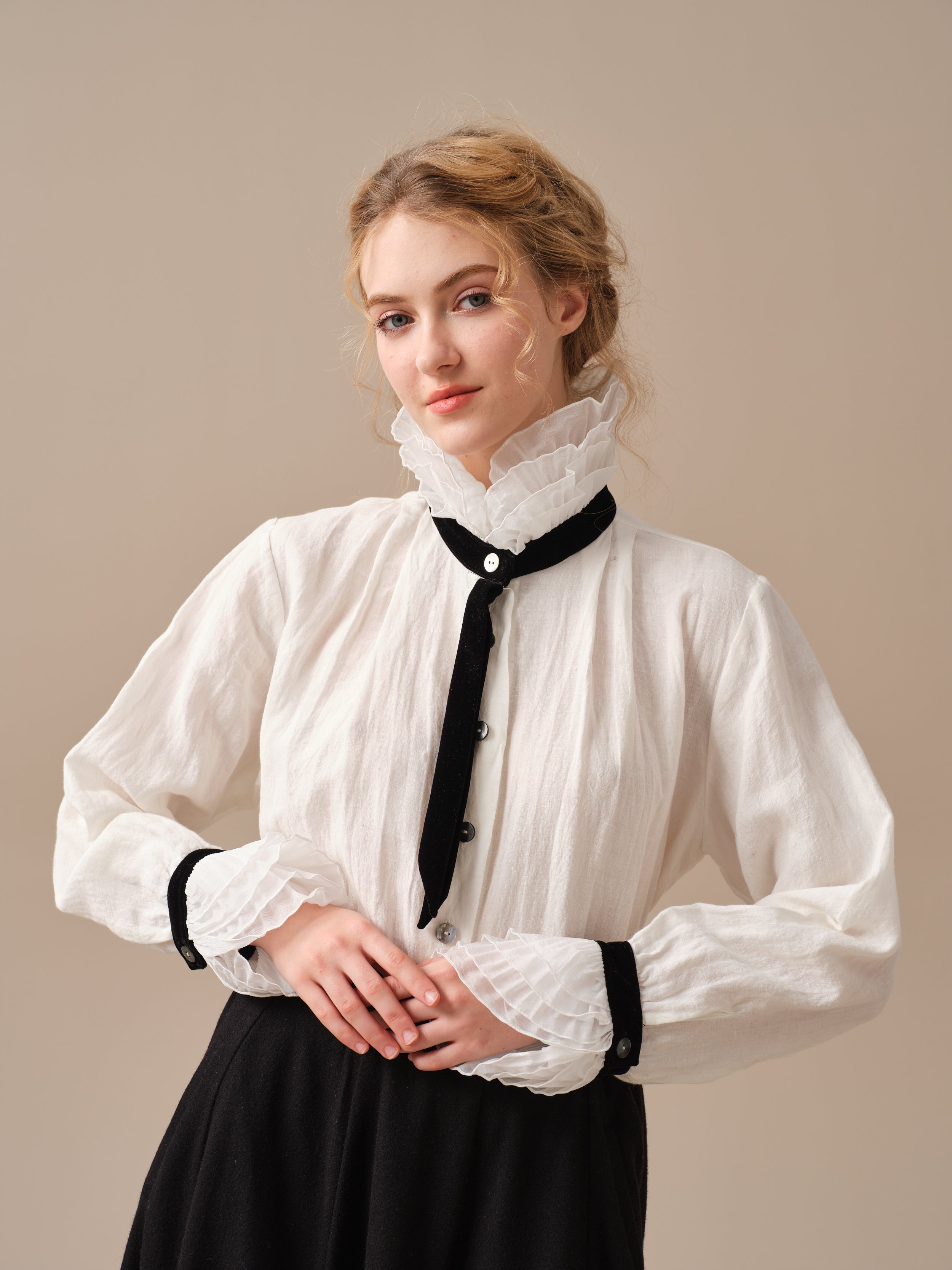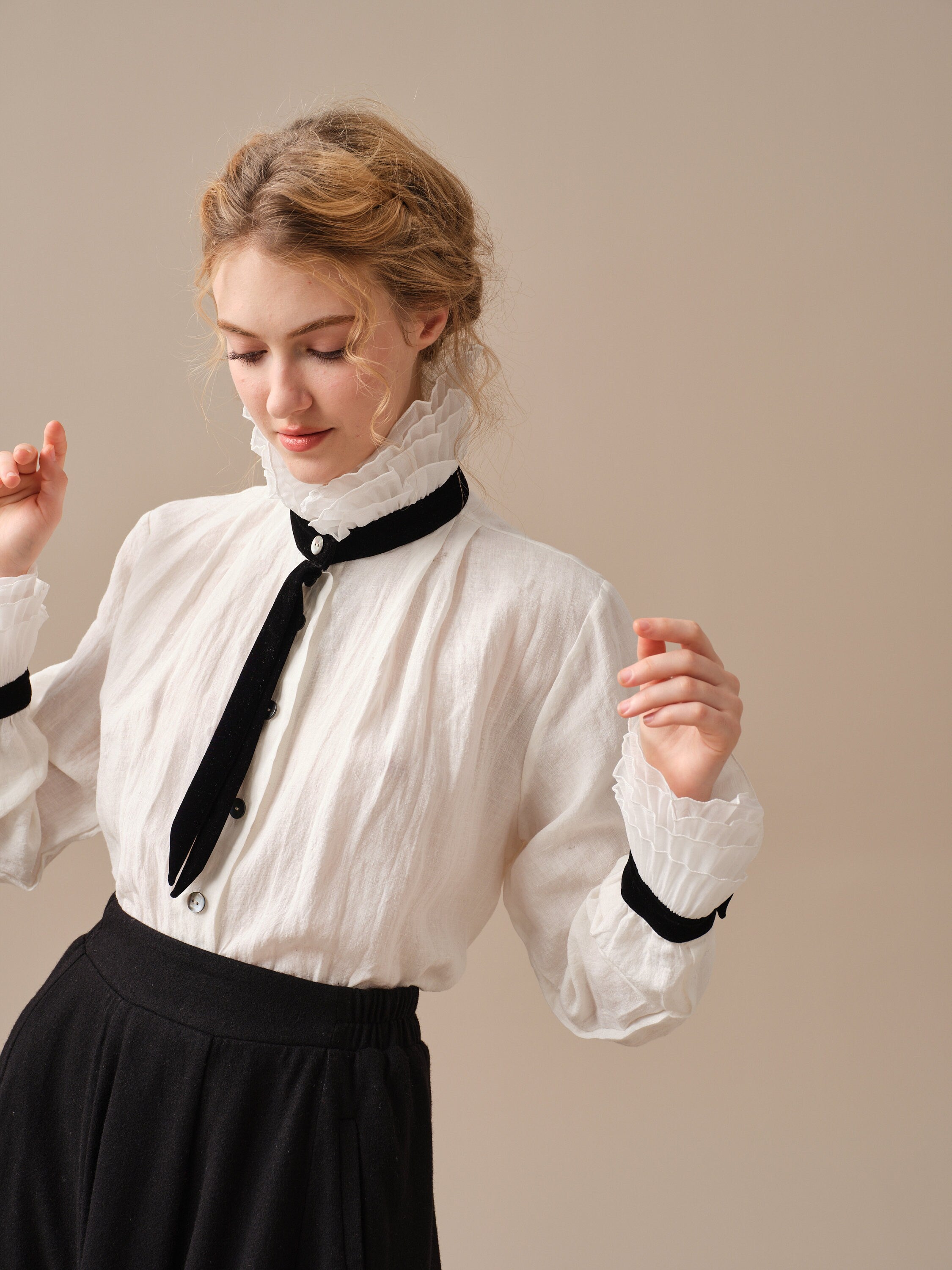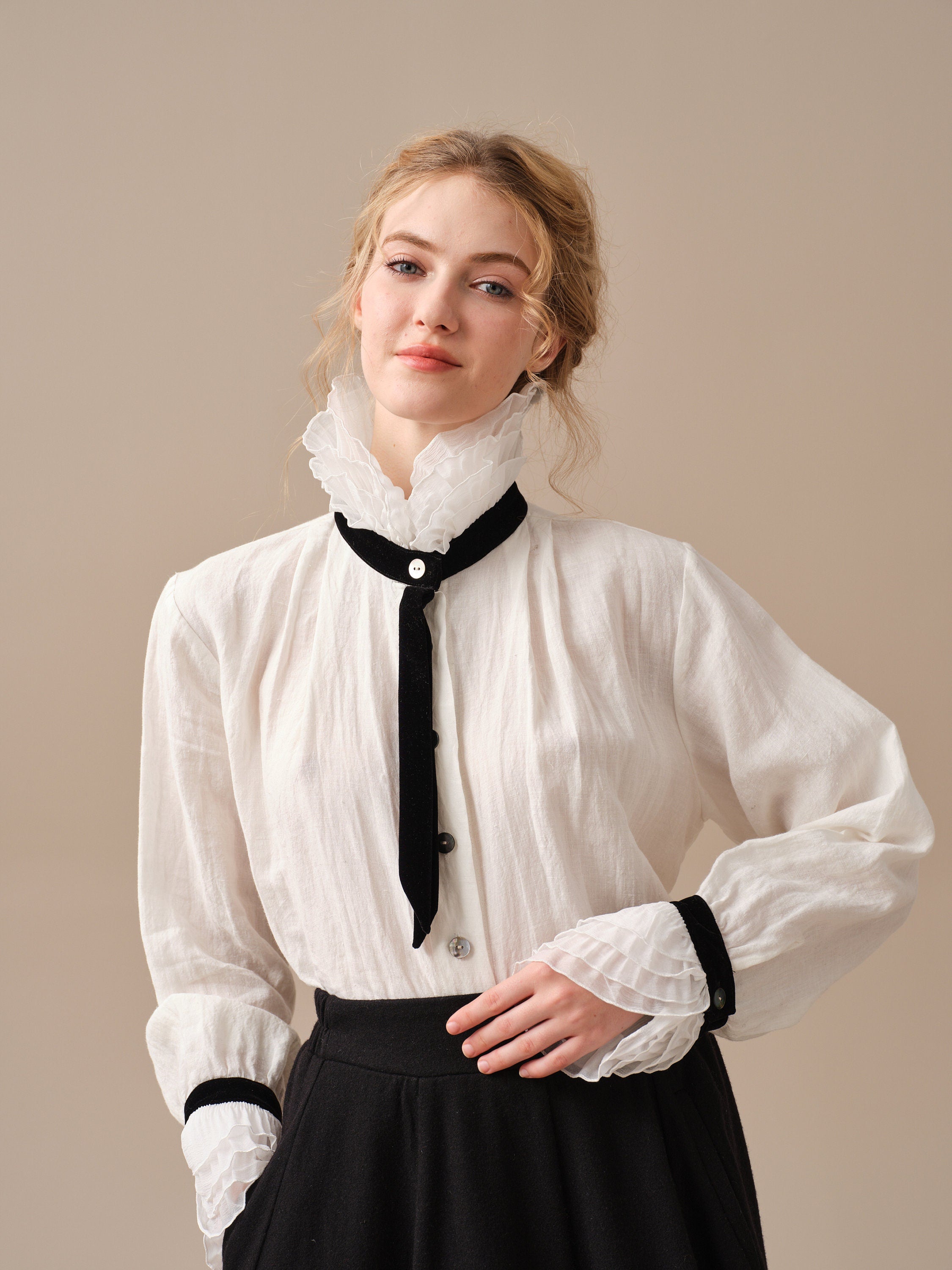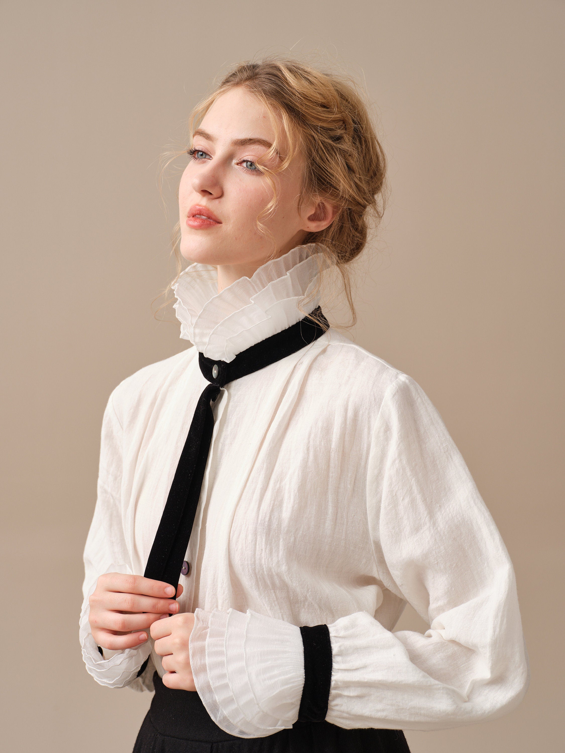 Inspired by the Renaissance, this blouse is adorned with exaggerated ruffle detailing on the collar and cuffs, adding a touch of glamour and drama to the overall look, while the black tie detailing adding an extra touch of elegance and sophistication.
