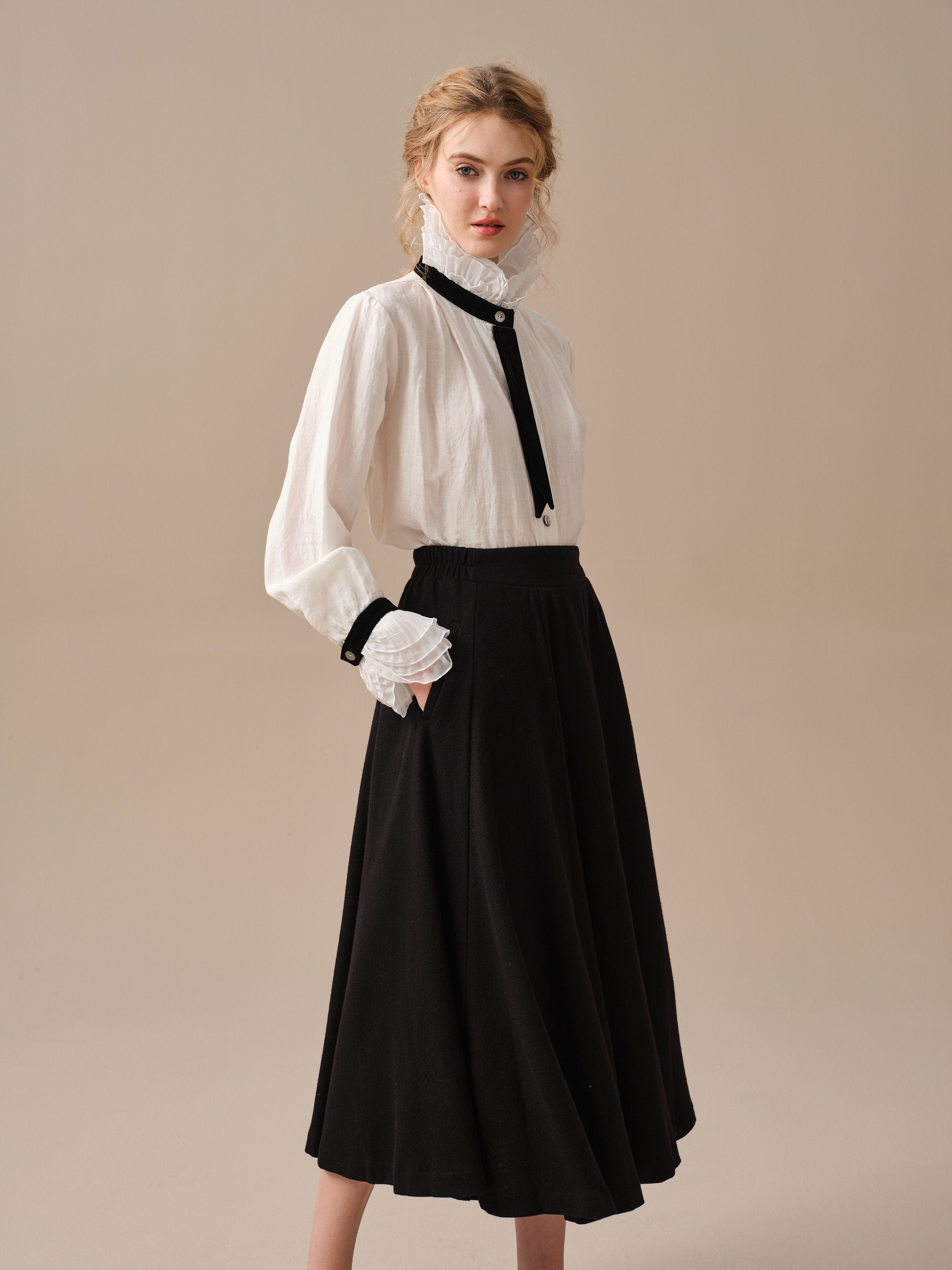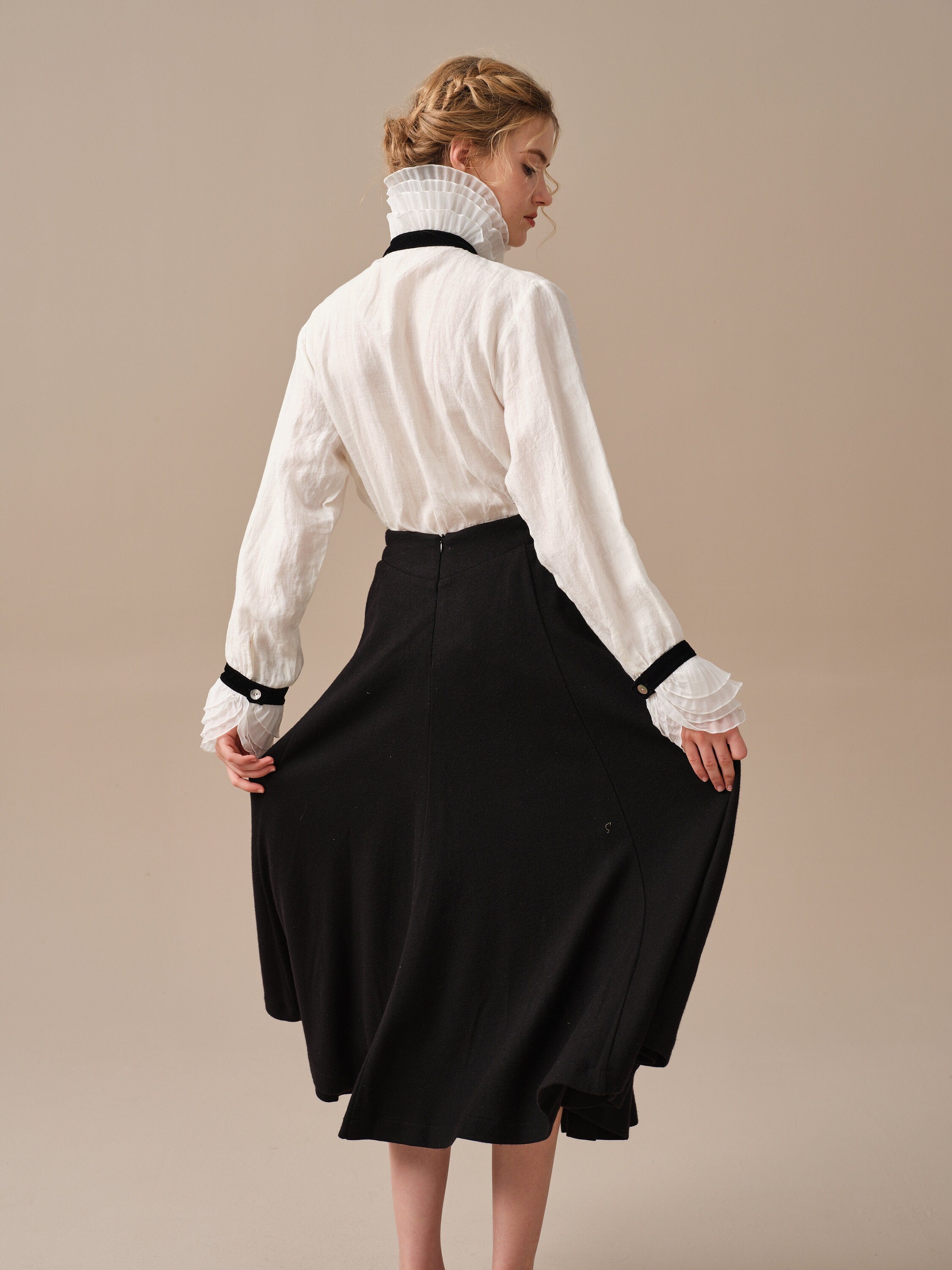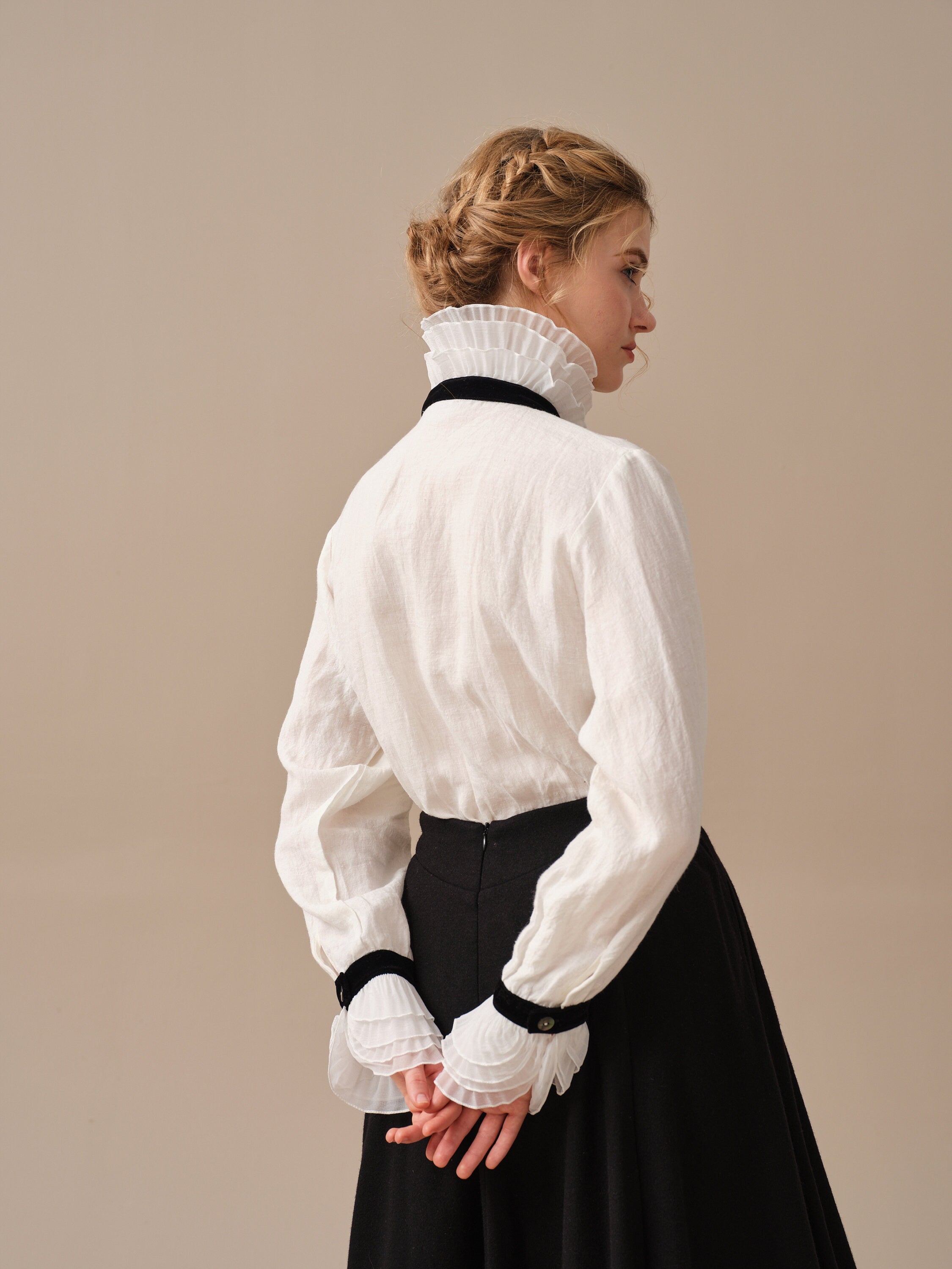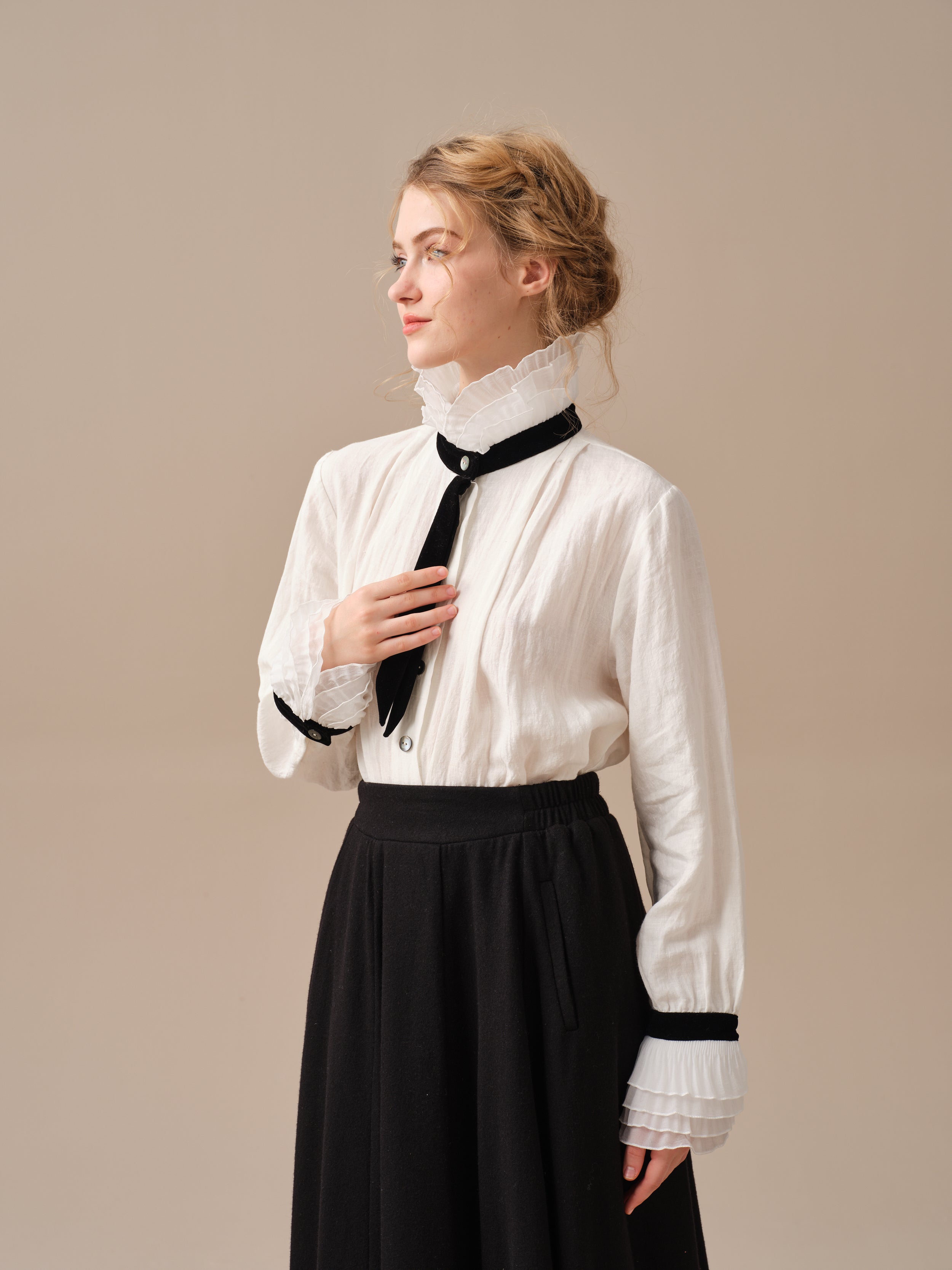 Inspired by the Renaissance, this blouse is adorned with exaggerated ruffle detailing on the collar and cuffs, adding a touch of glamour and drama to the overall look, while the black tie detailing adding an extra touch of elegance and sophistication.