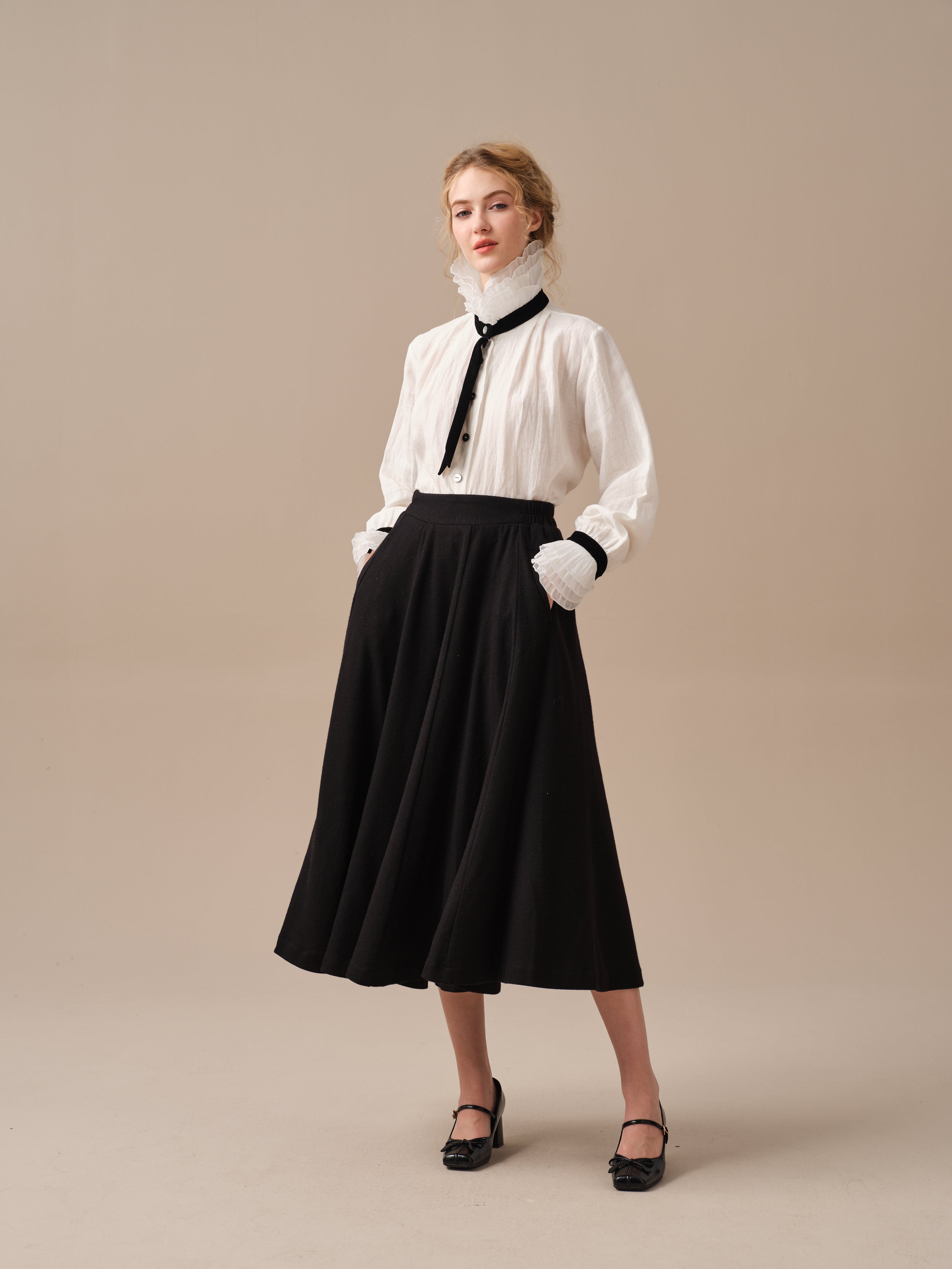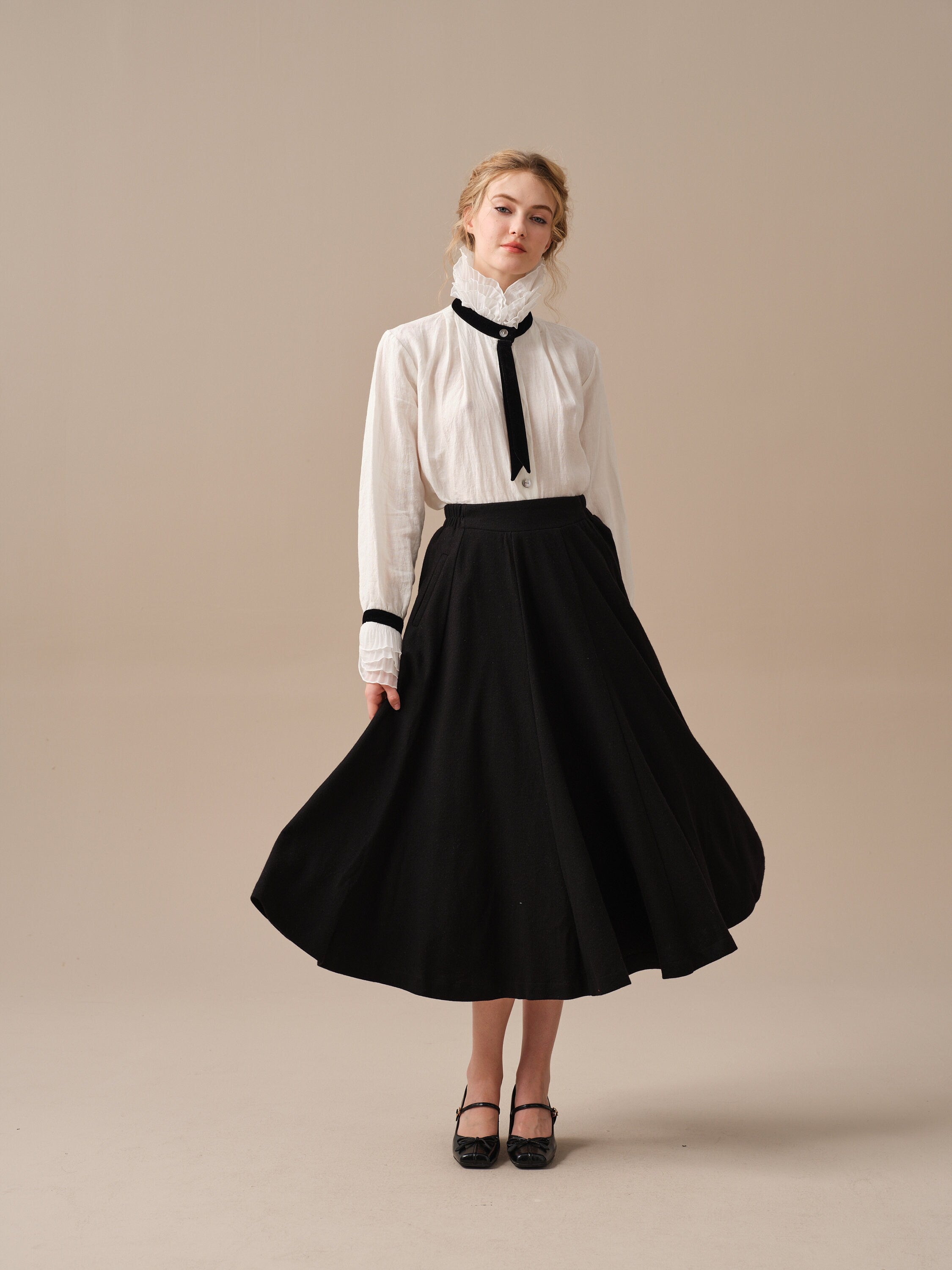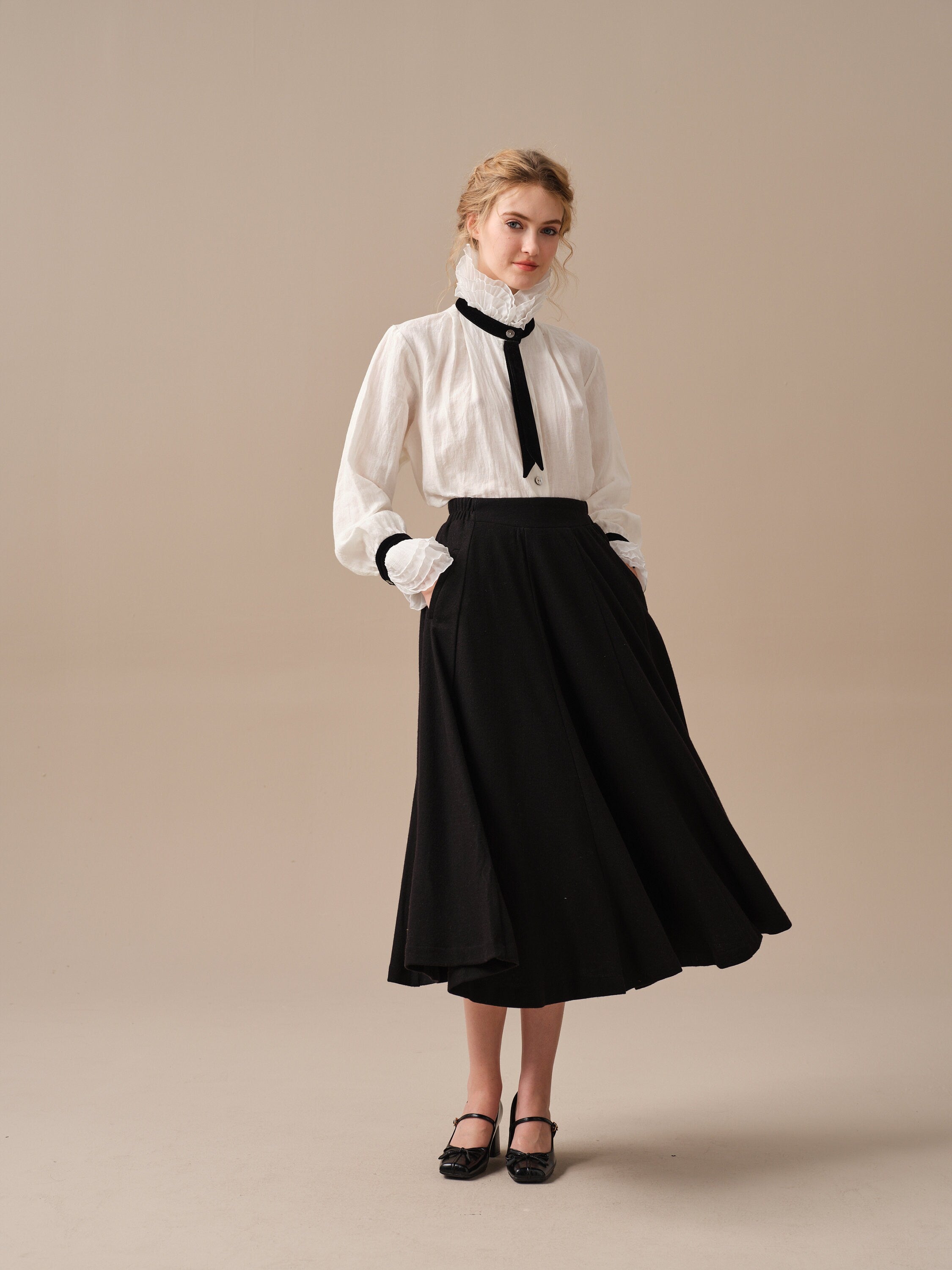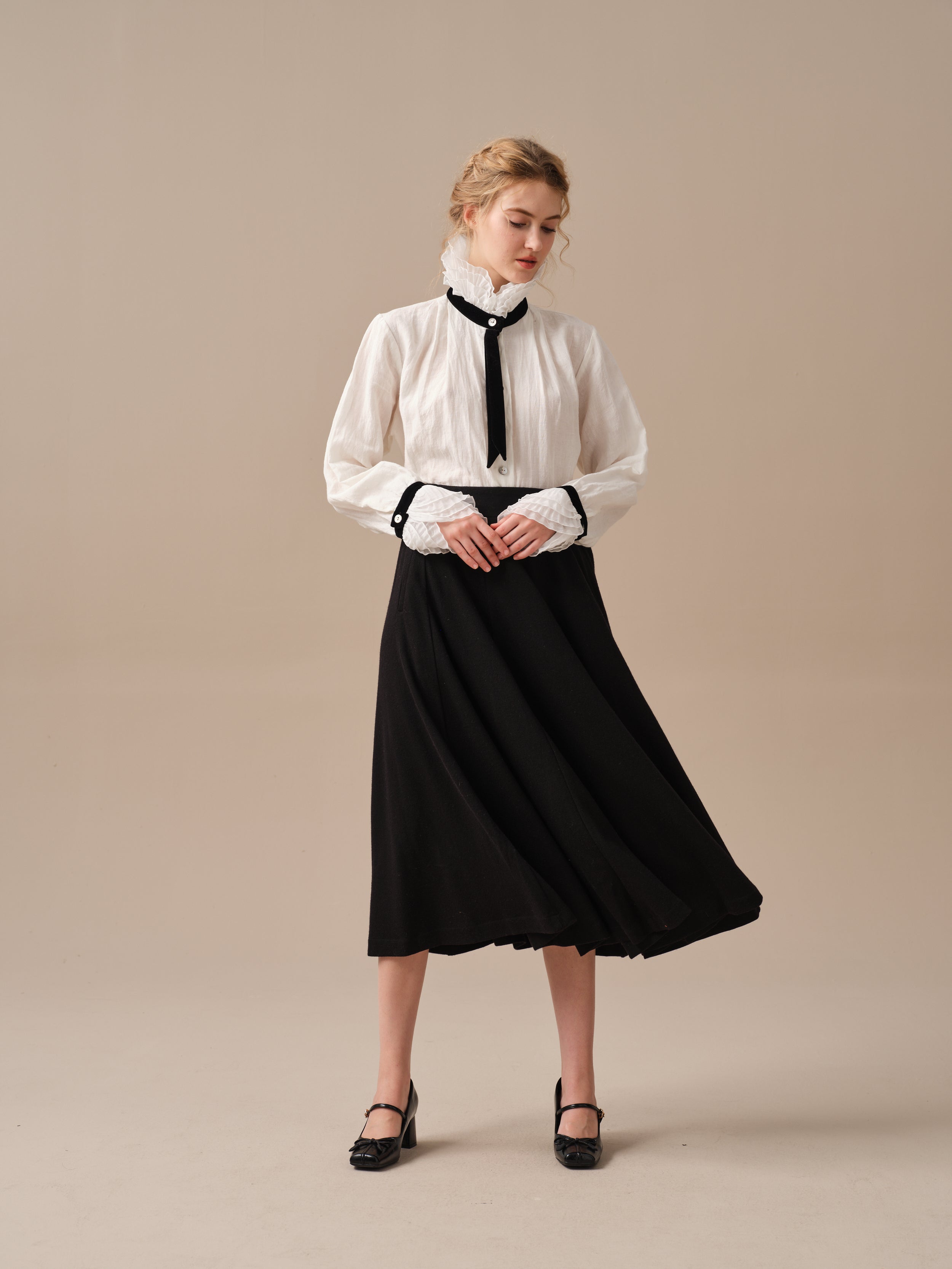 Inspired by the Renaissance, this blouse is adorned with exaggerated ruffle detailing on the collar and cuffs, adding a touch of glamour and drama to the overall look, while the black tie detailing adding an extra touch of elegance and sophistication.