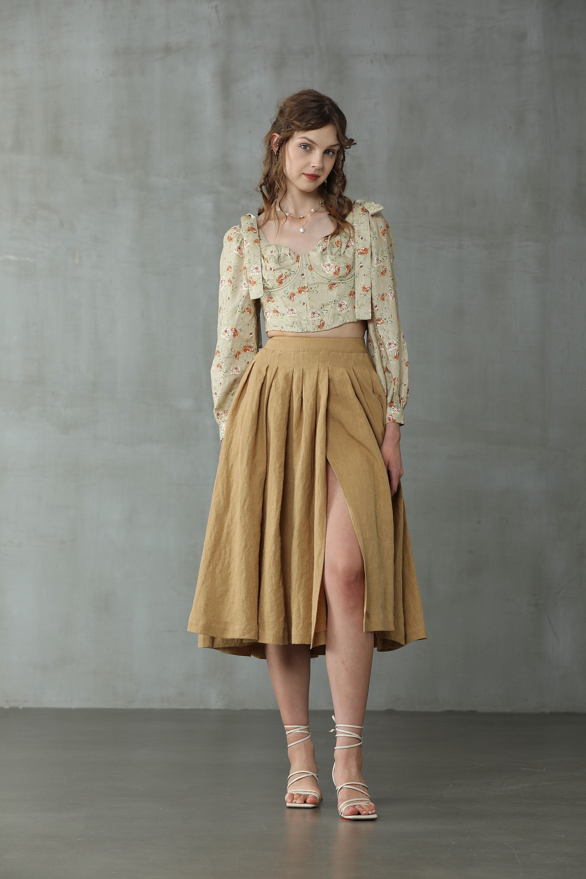 This pleated slit-detail skirt from linennaive revels just the right amount of skin. your legs will thank us.