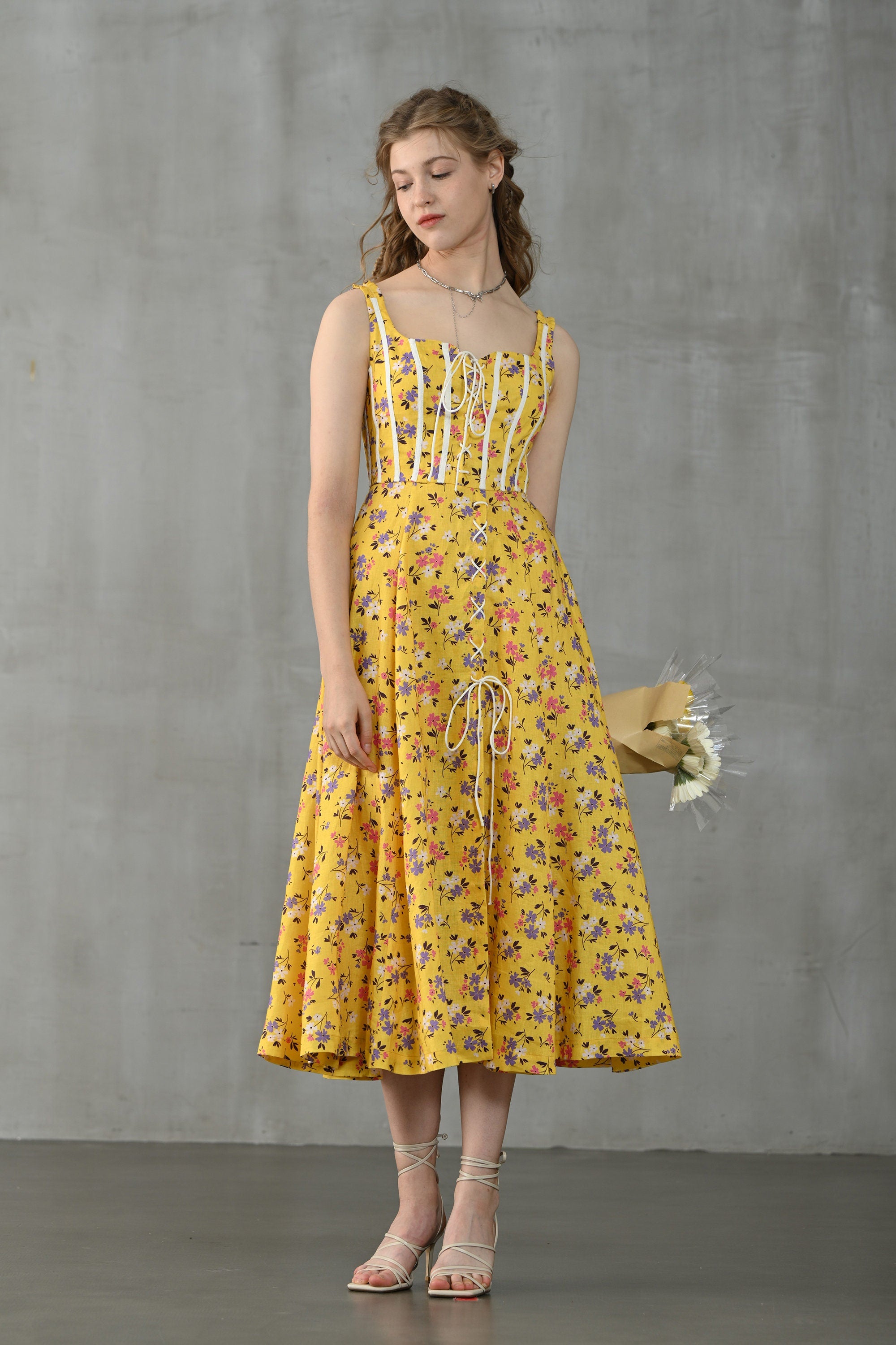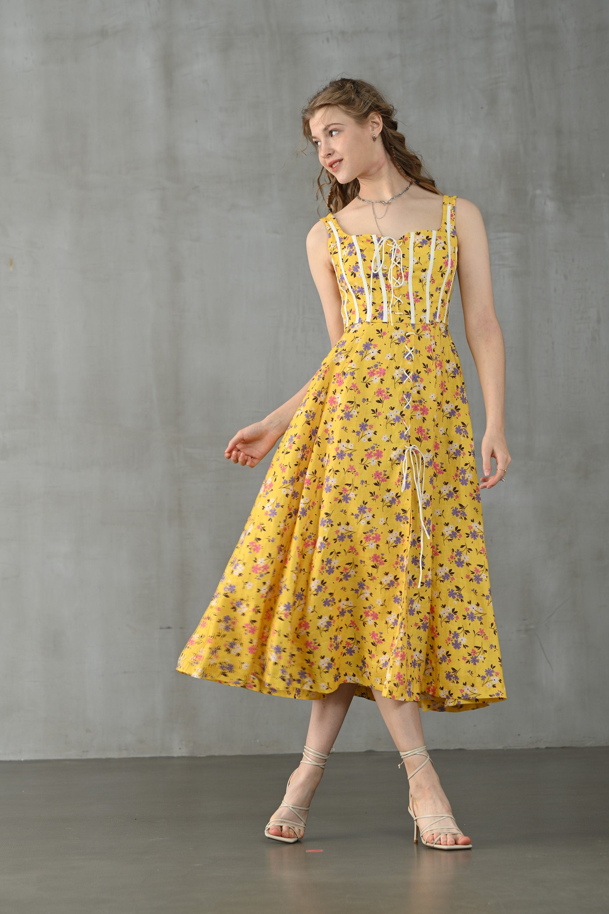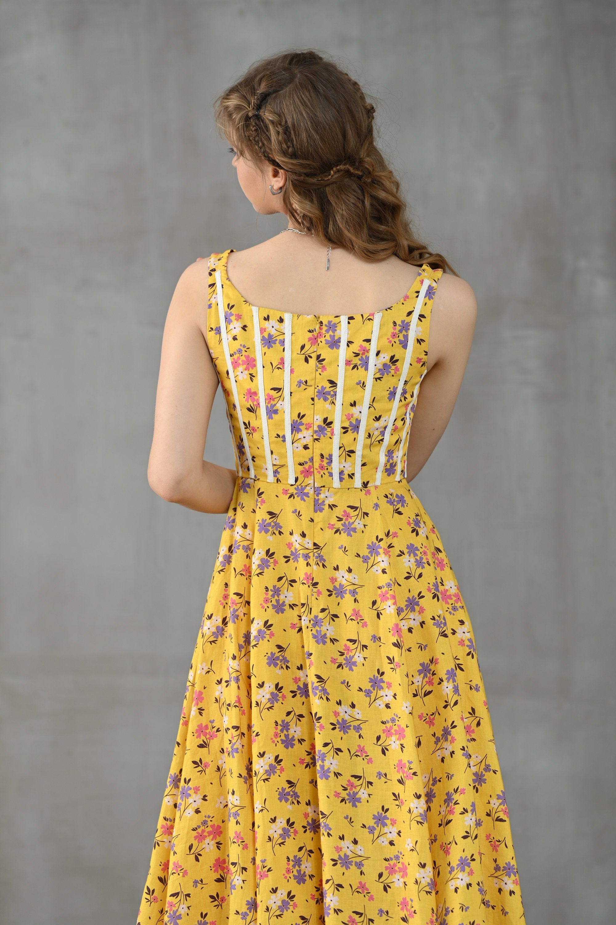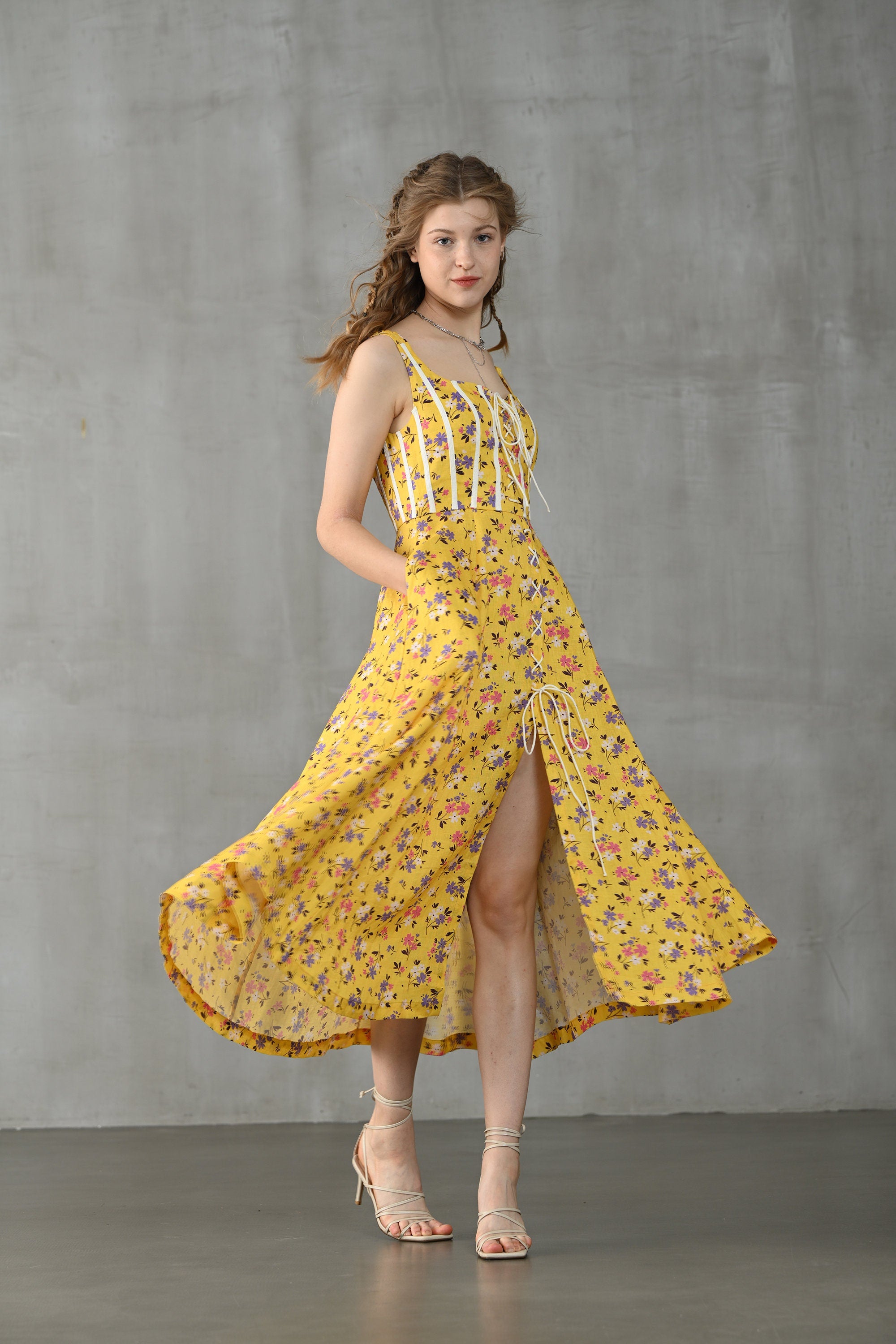 This dress from Linennaive is made from high-quality linen in a fresh shade of yellow and a pretty floral print. It has a lovely loose shape and delicate handmade pintucks. creating a look that is at once sophisticated and effortless