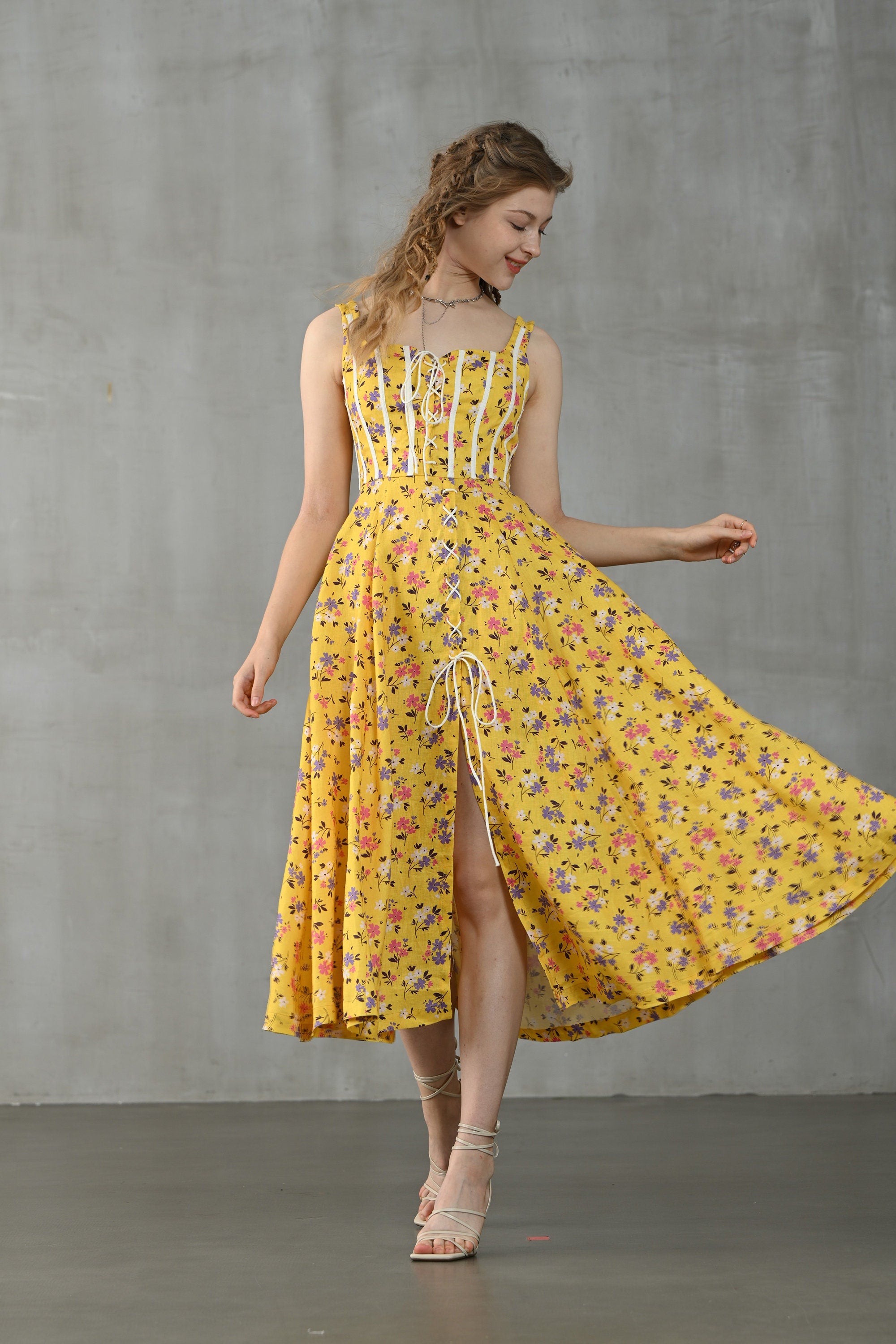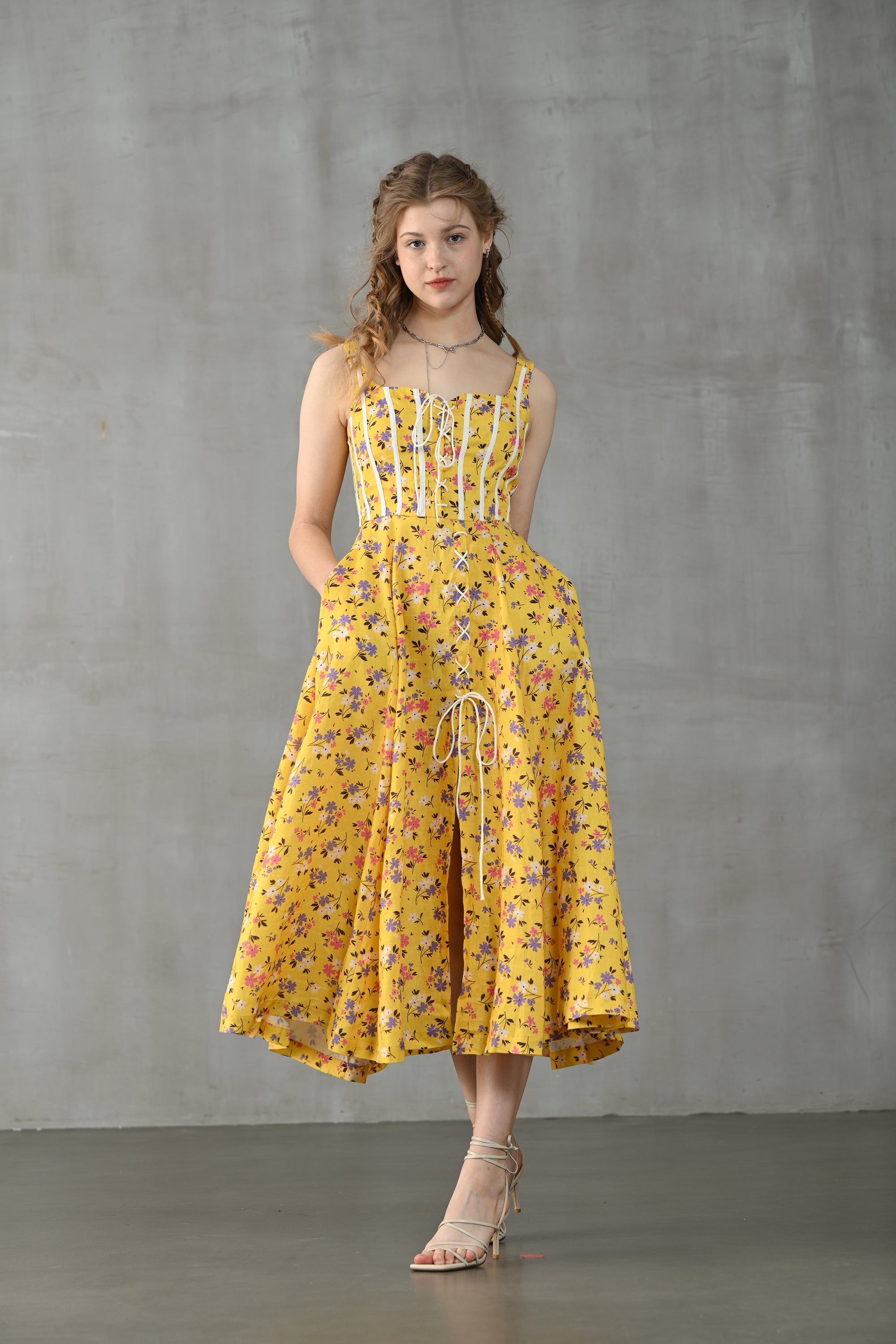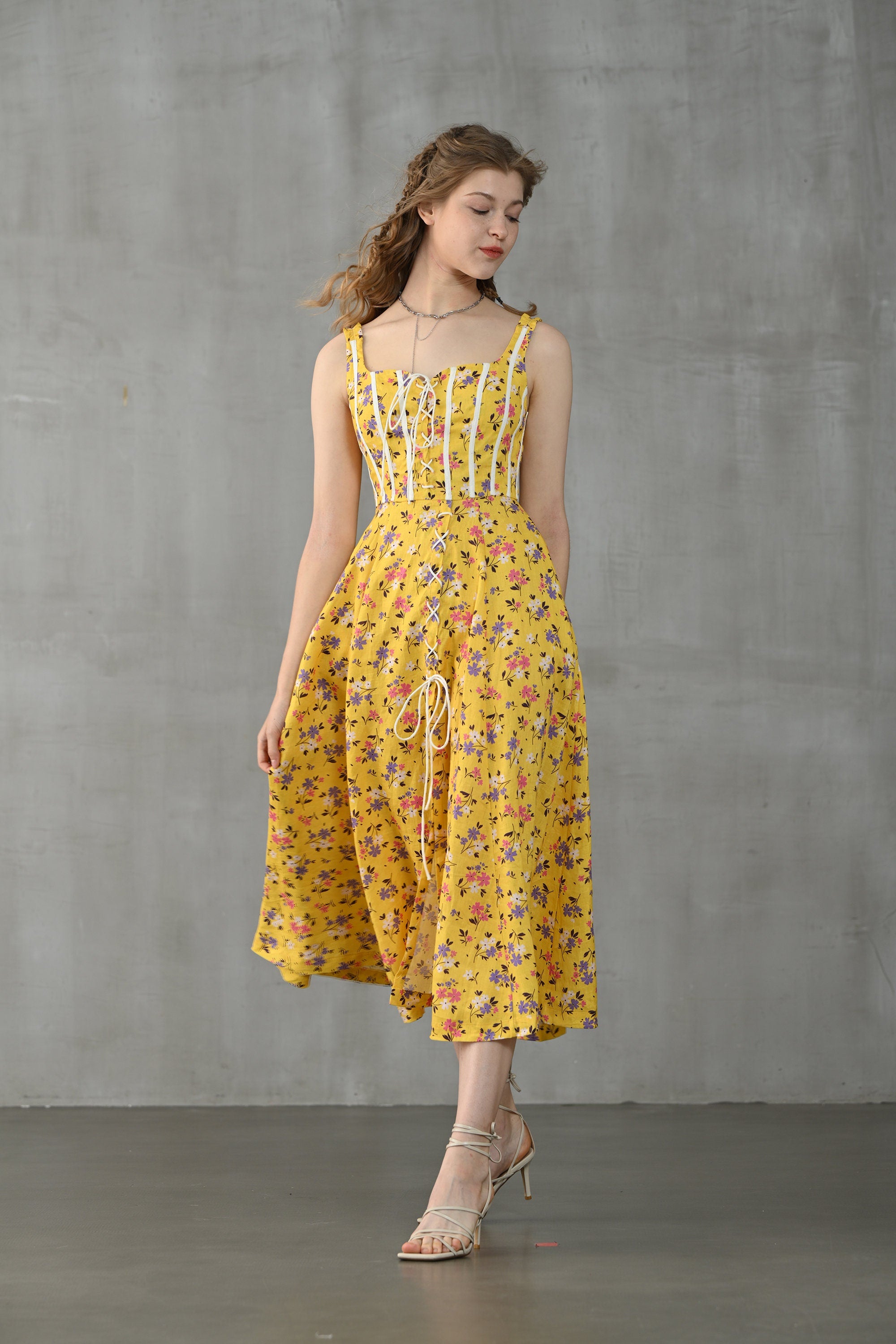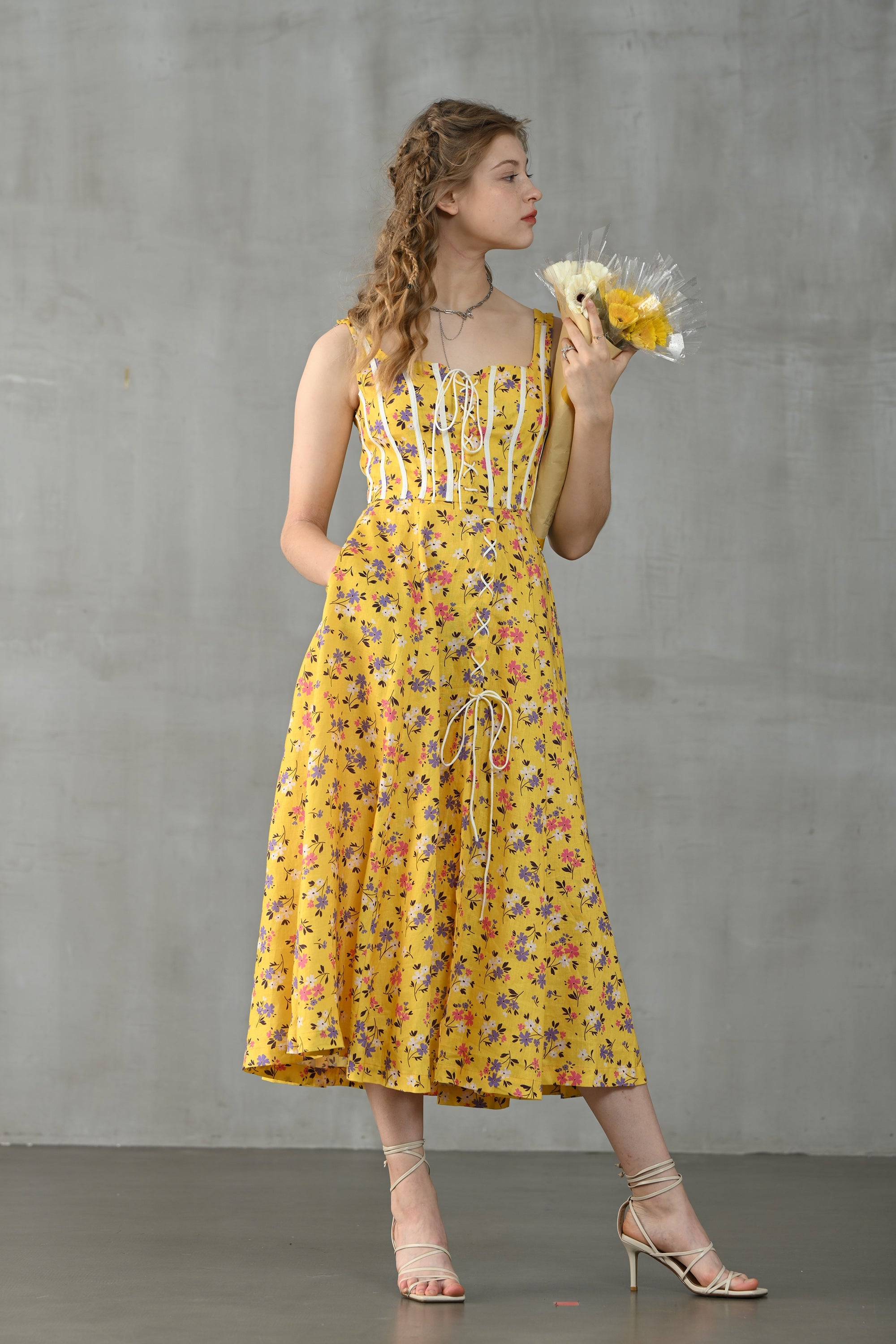 This dress from Linennaive is made from high-quality linen in a fresh shade of yellow and a pretty floral print. It has a lovely loose shape and delicate handmade pintucks. creating a look that is at once sophisticated and effortless