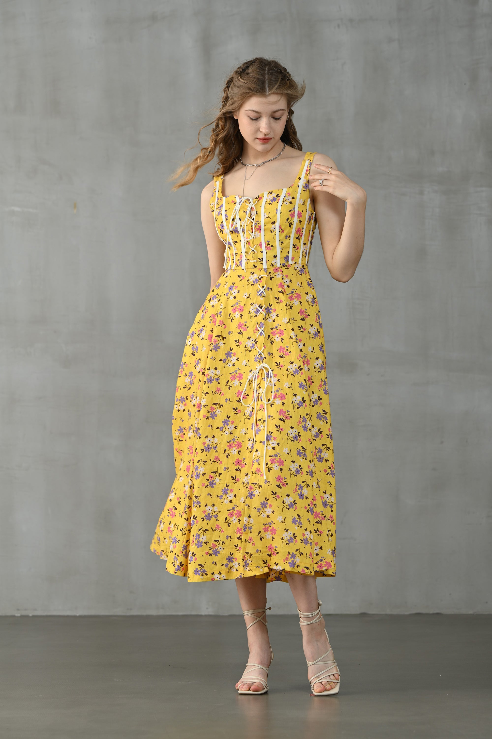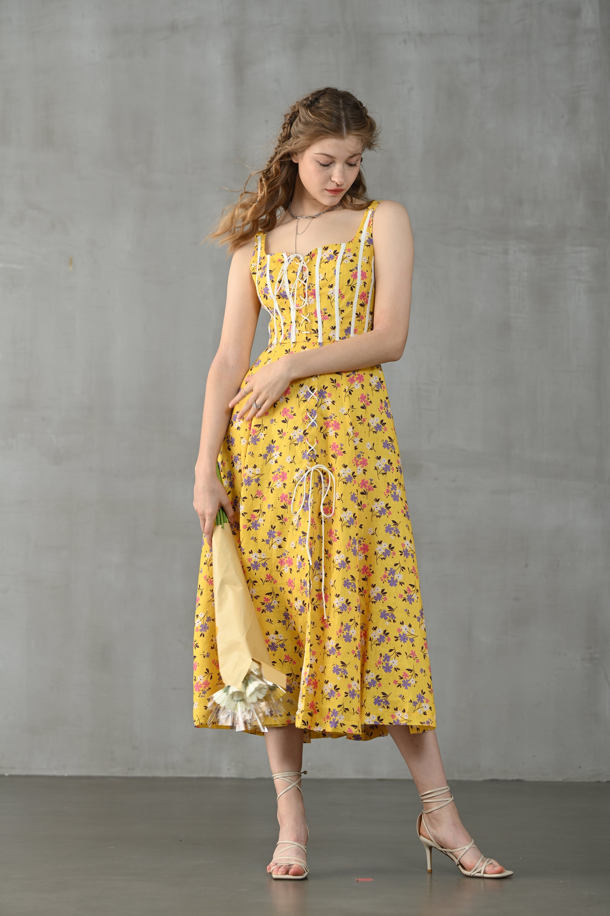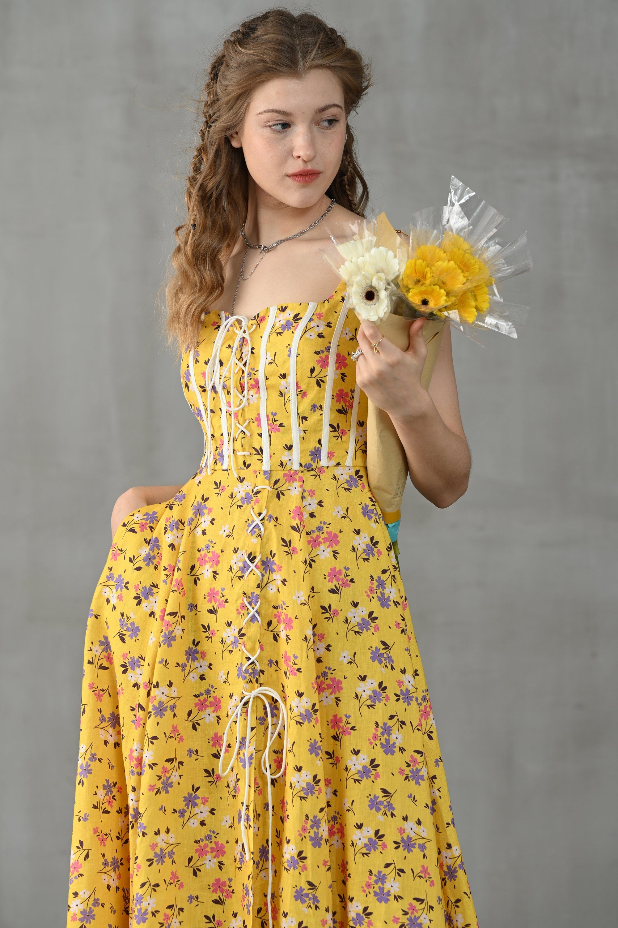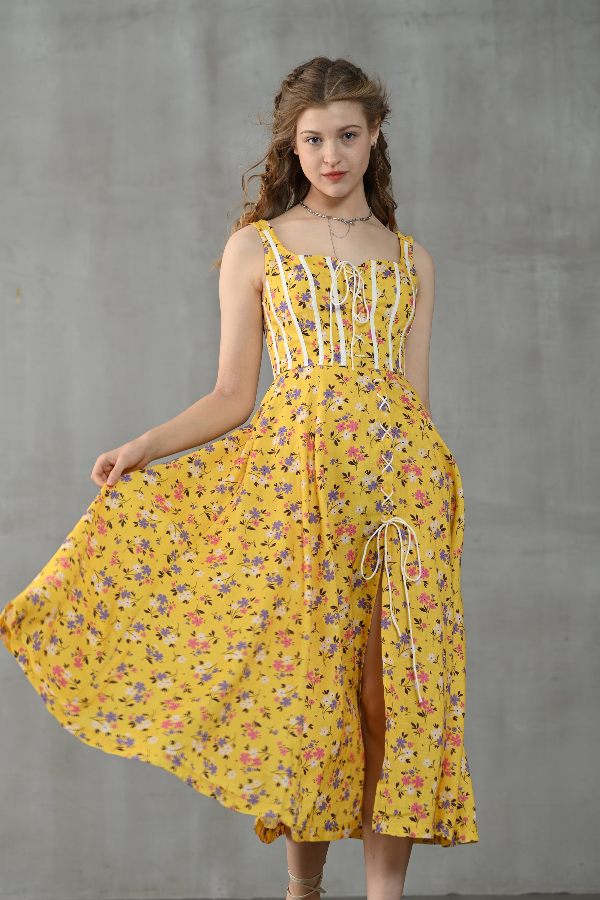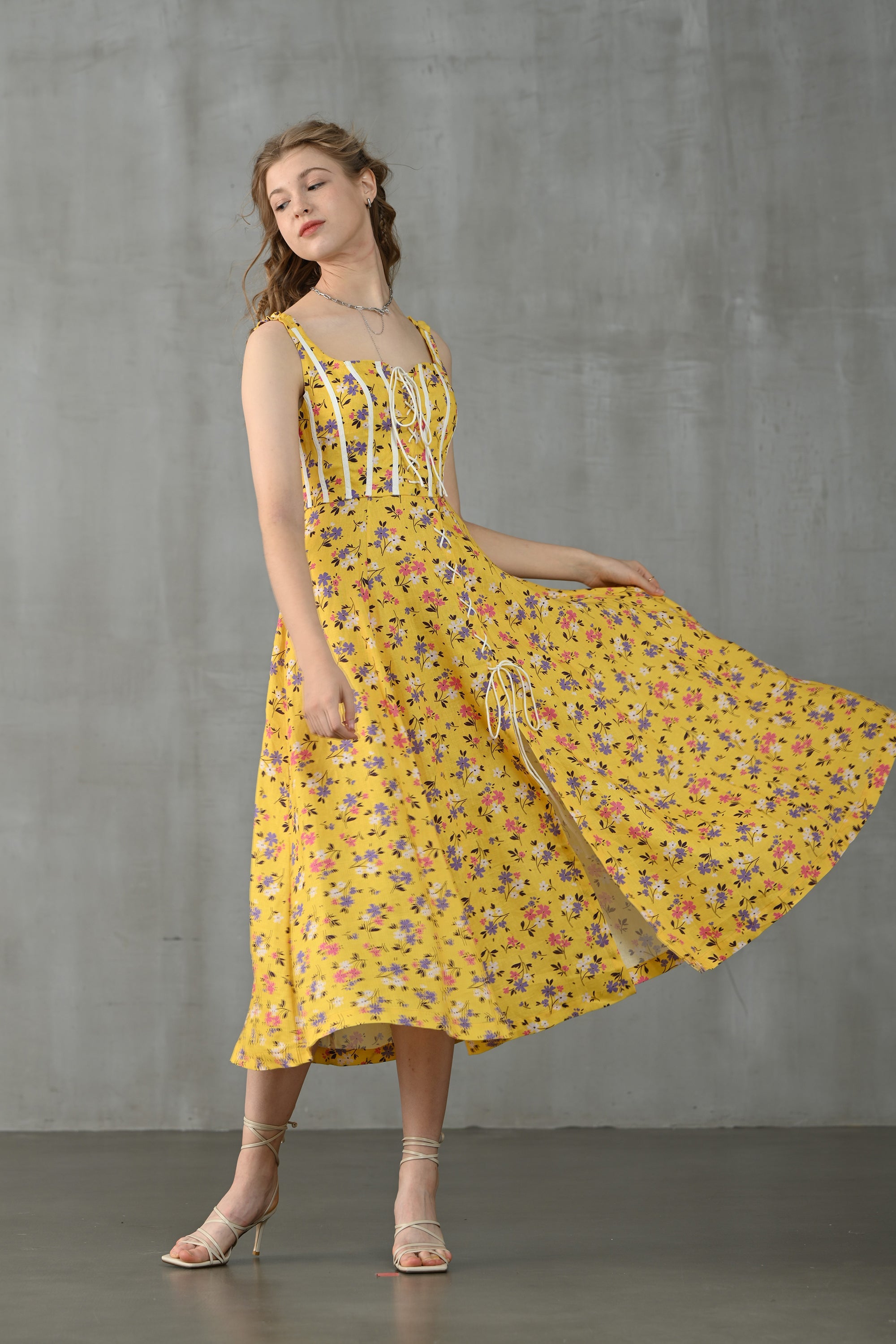 This dress from Linennaive is made from high-quality linen in a fresh shade of yellow and a pretty floral print. It has a lovely loose shape and delicate handmade pintucks. creating a look that is at once sophisticated and effortless