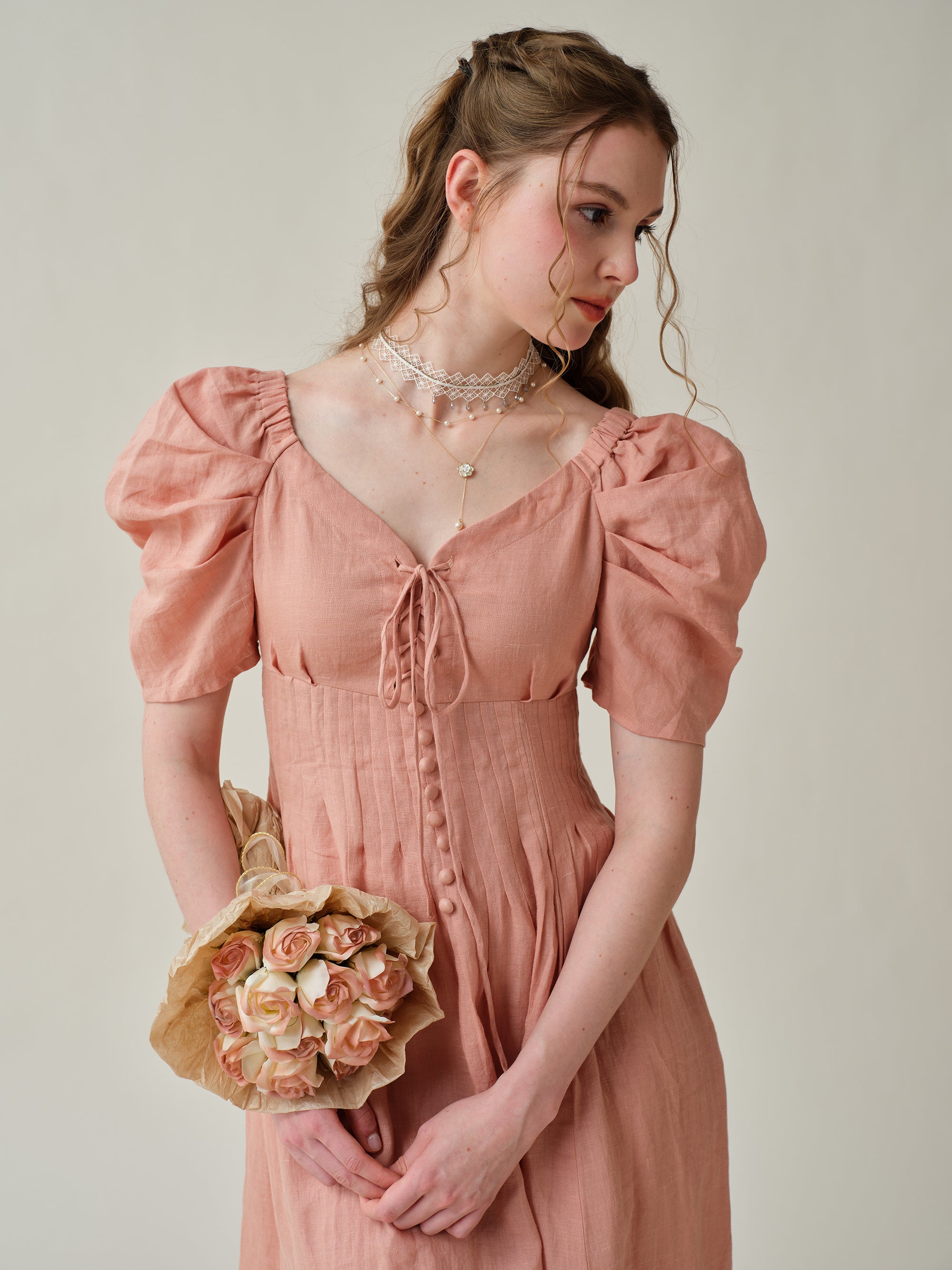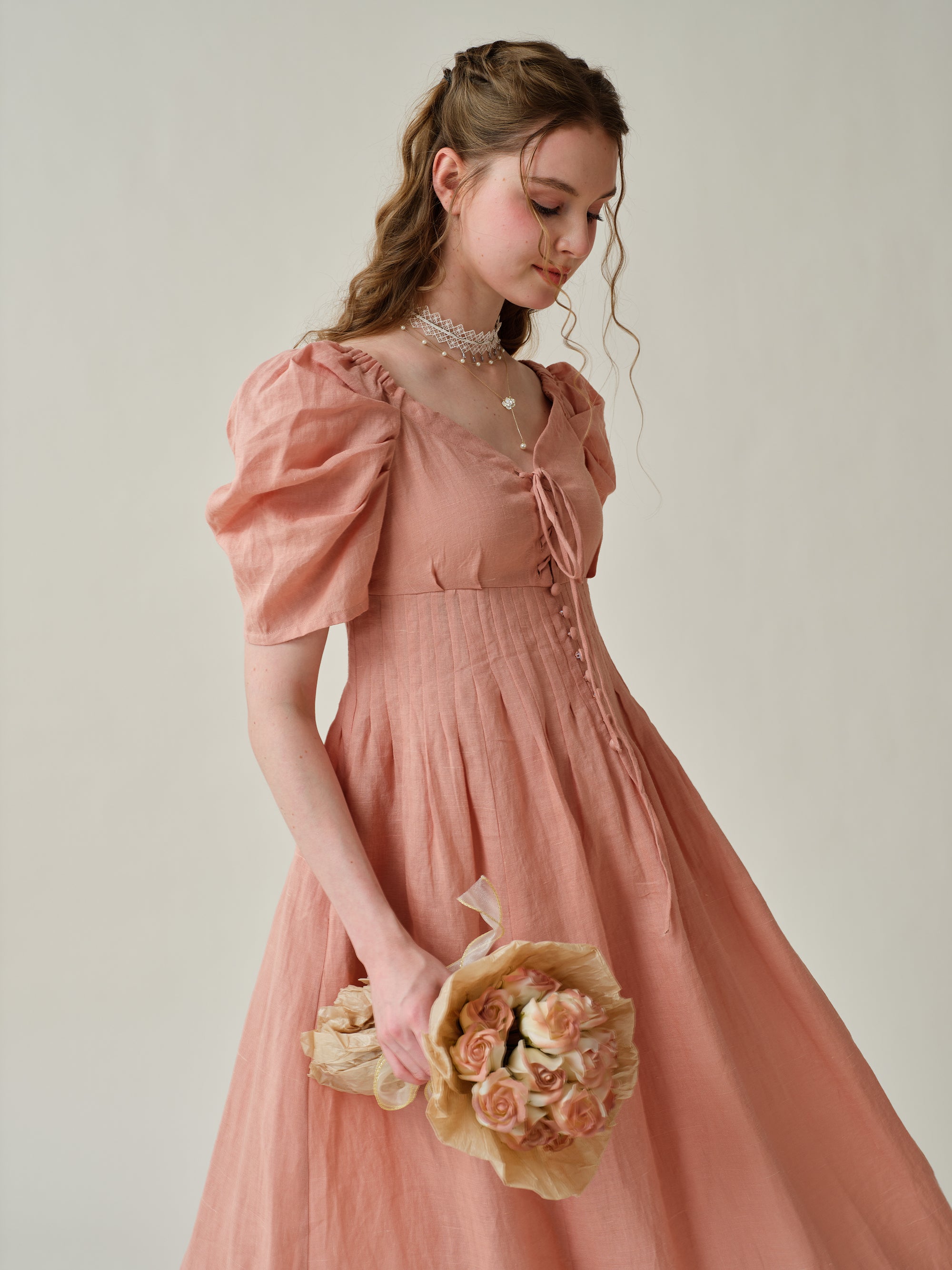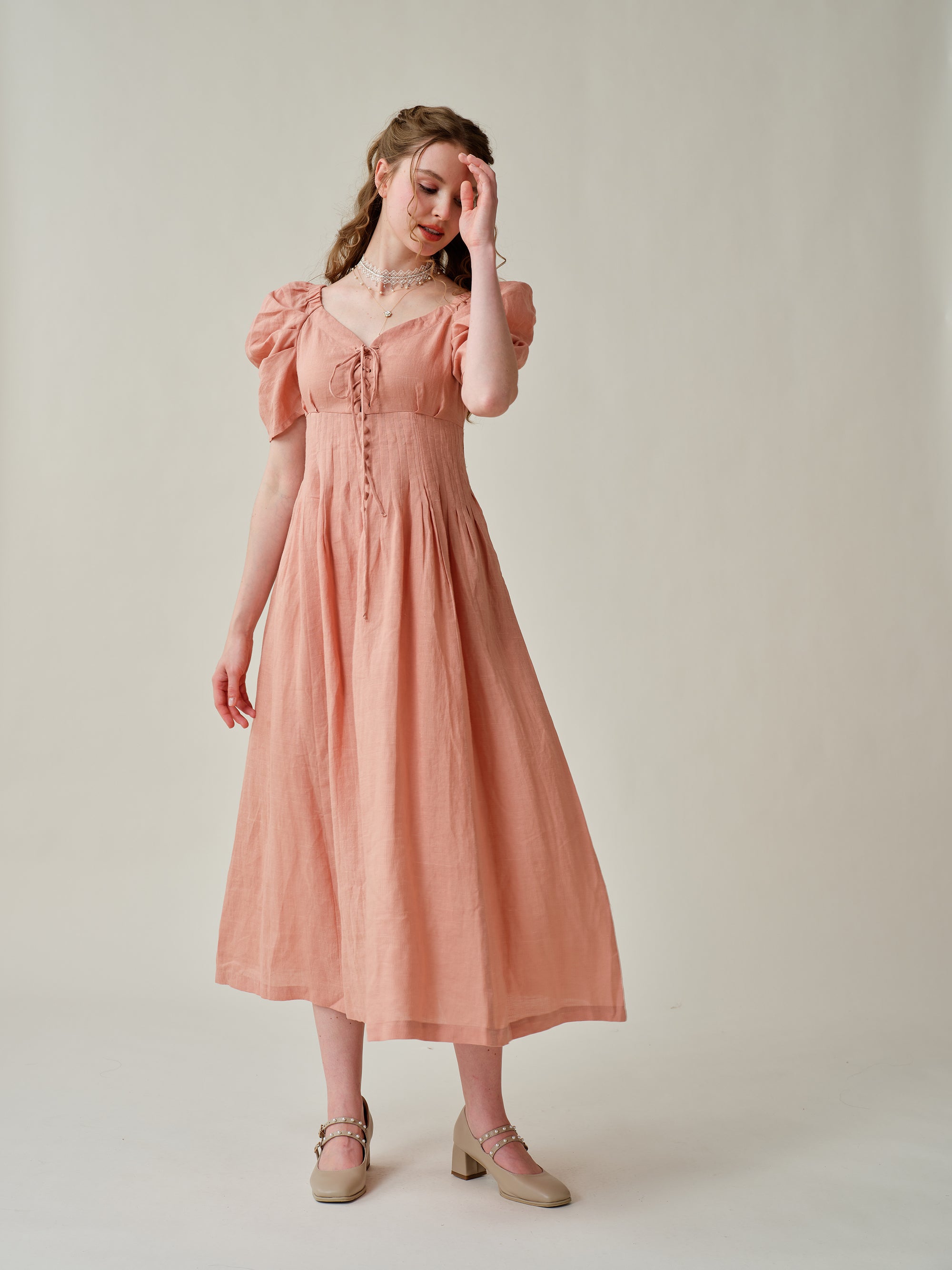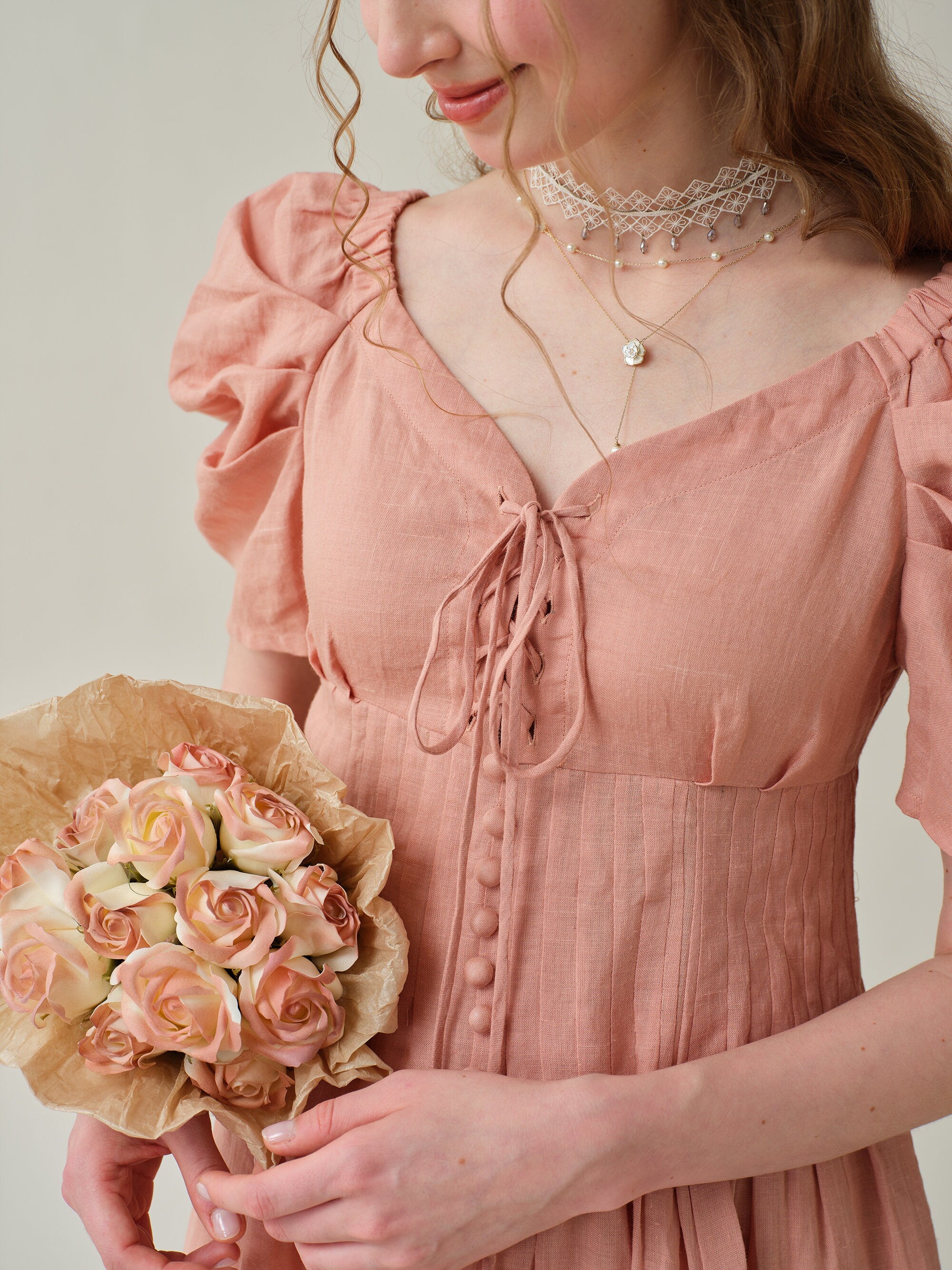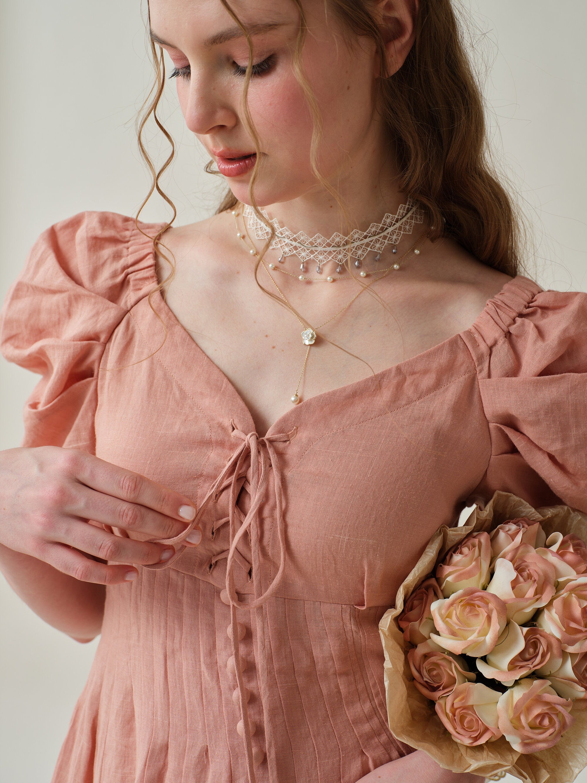 It finely demonstrates its sophisticated aesthetic. The lace-up front design is inspired by corsetry for drama, Puffed sleeves and soft gathering at the waist for a romantic touch.