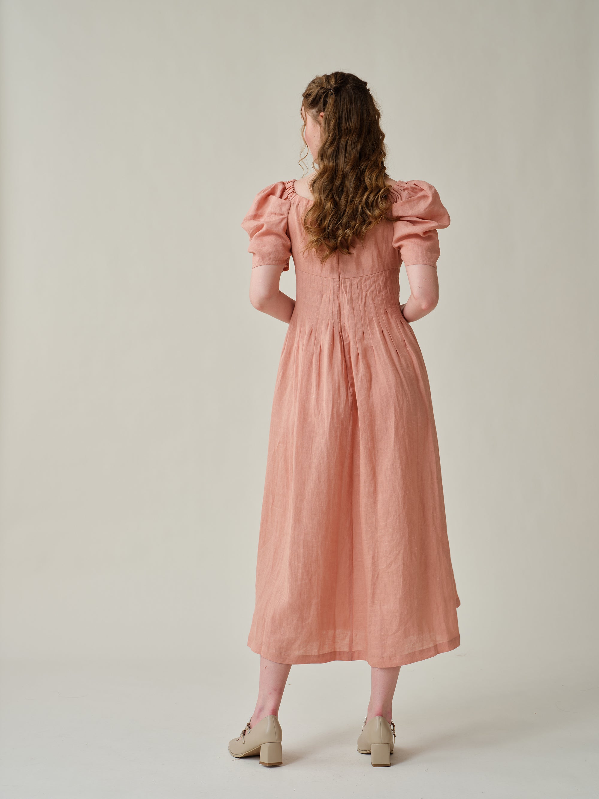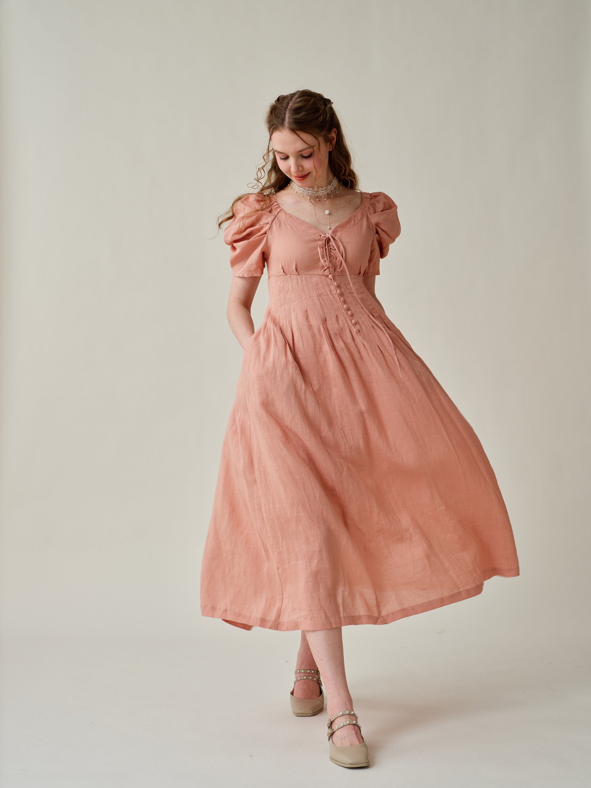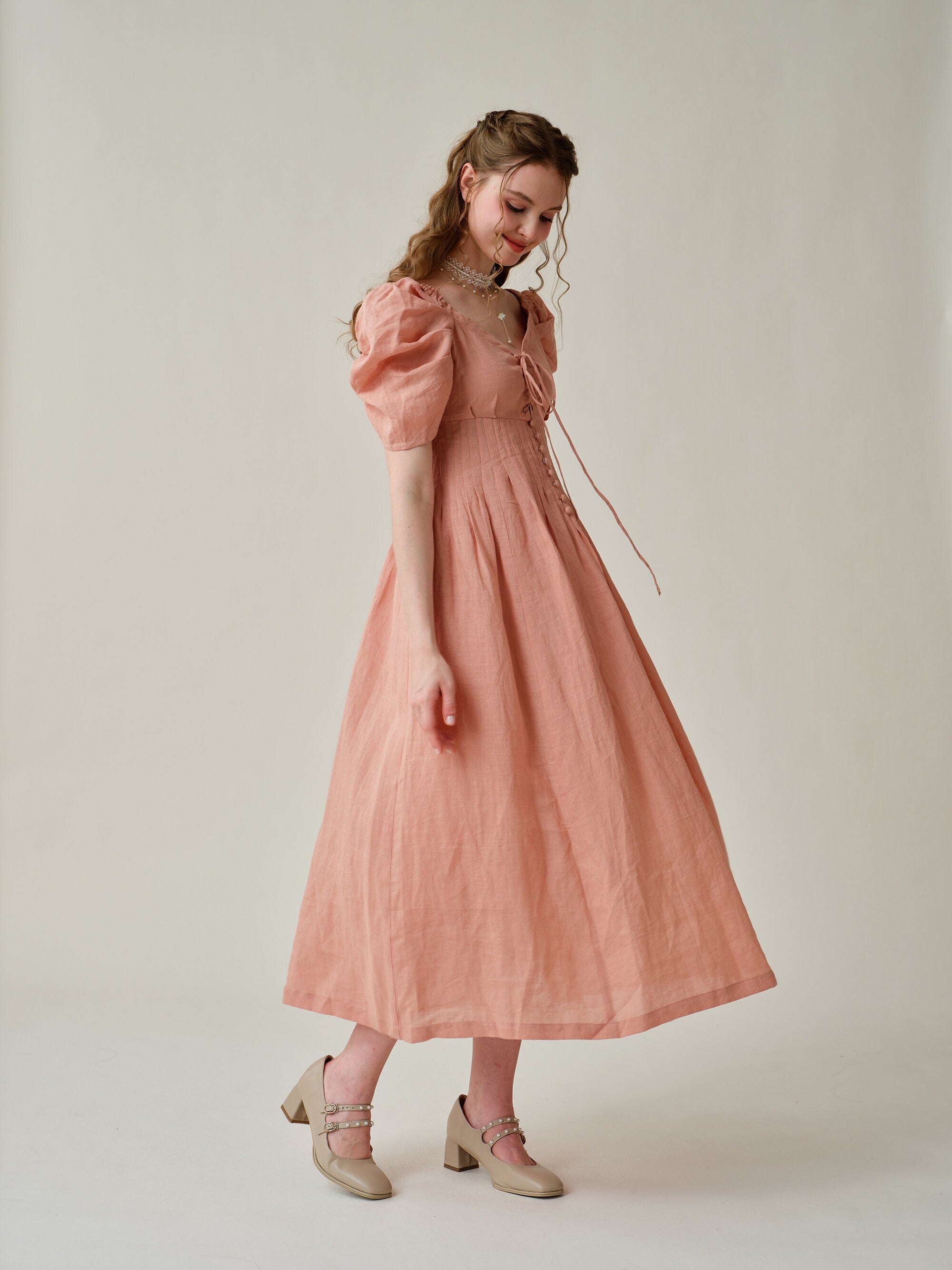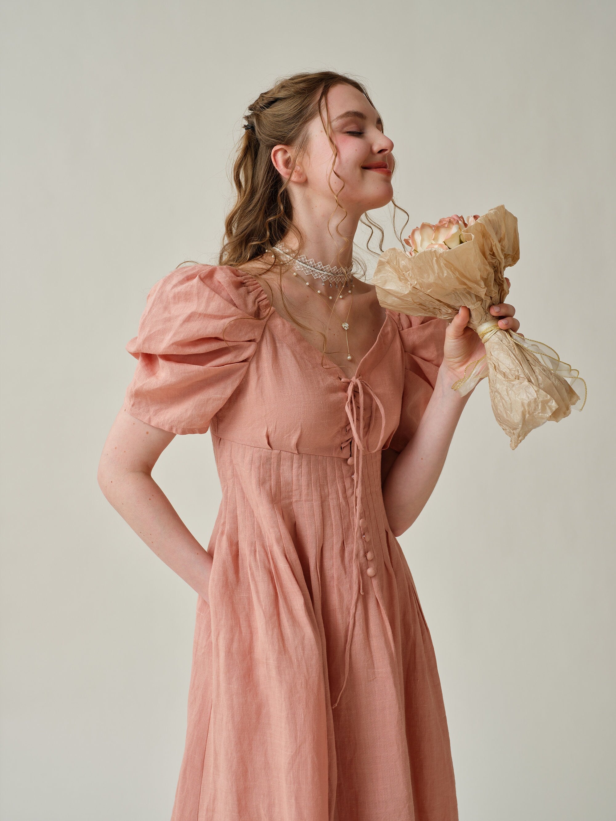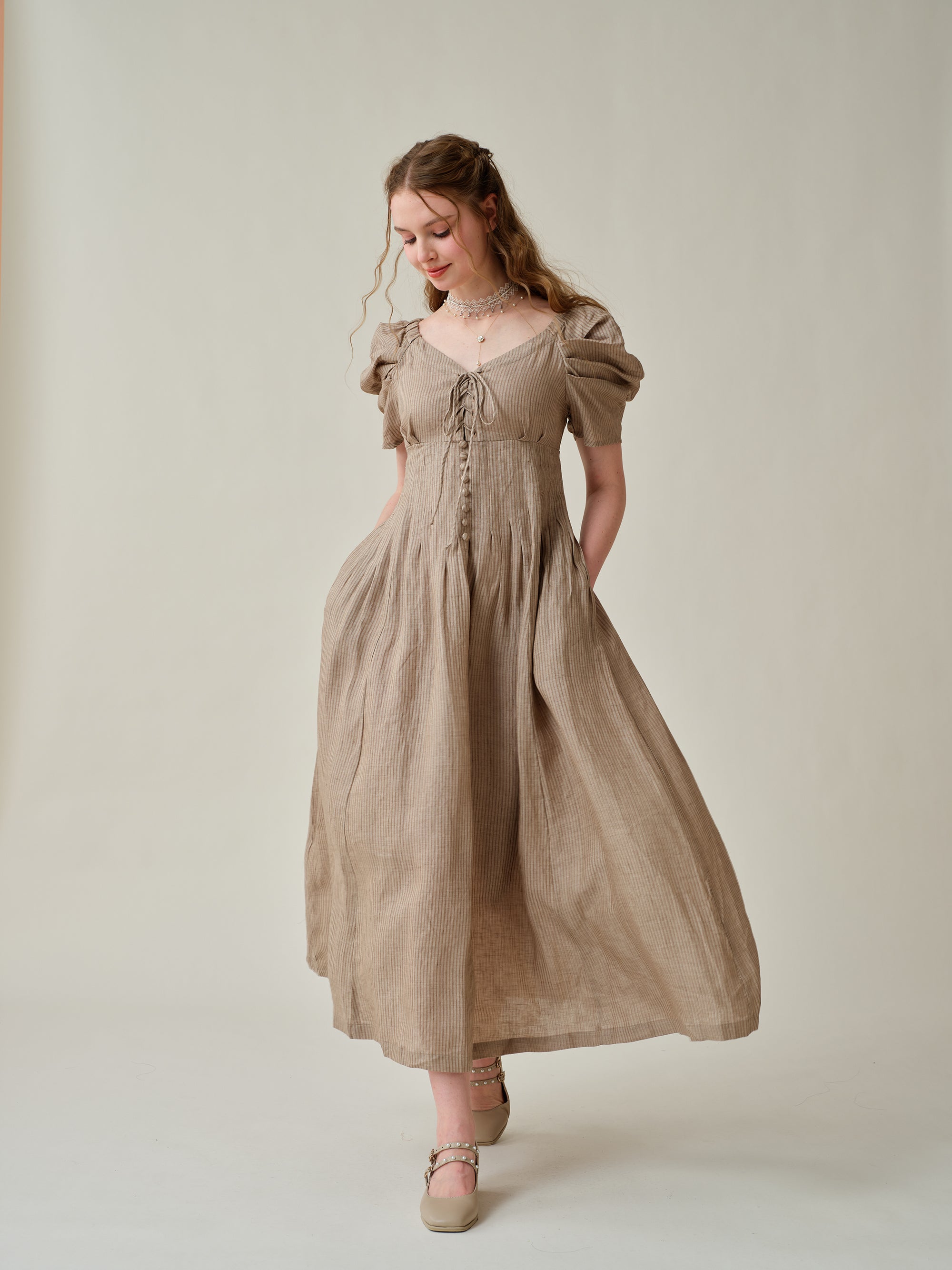 It finely demonstrates its sophisticated aesthetic. The lace-up front design is inspired by corsetry for drama, Puffed sleeves and soft gathering at the waist for a romantic touch.