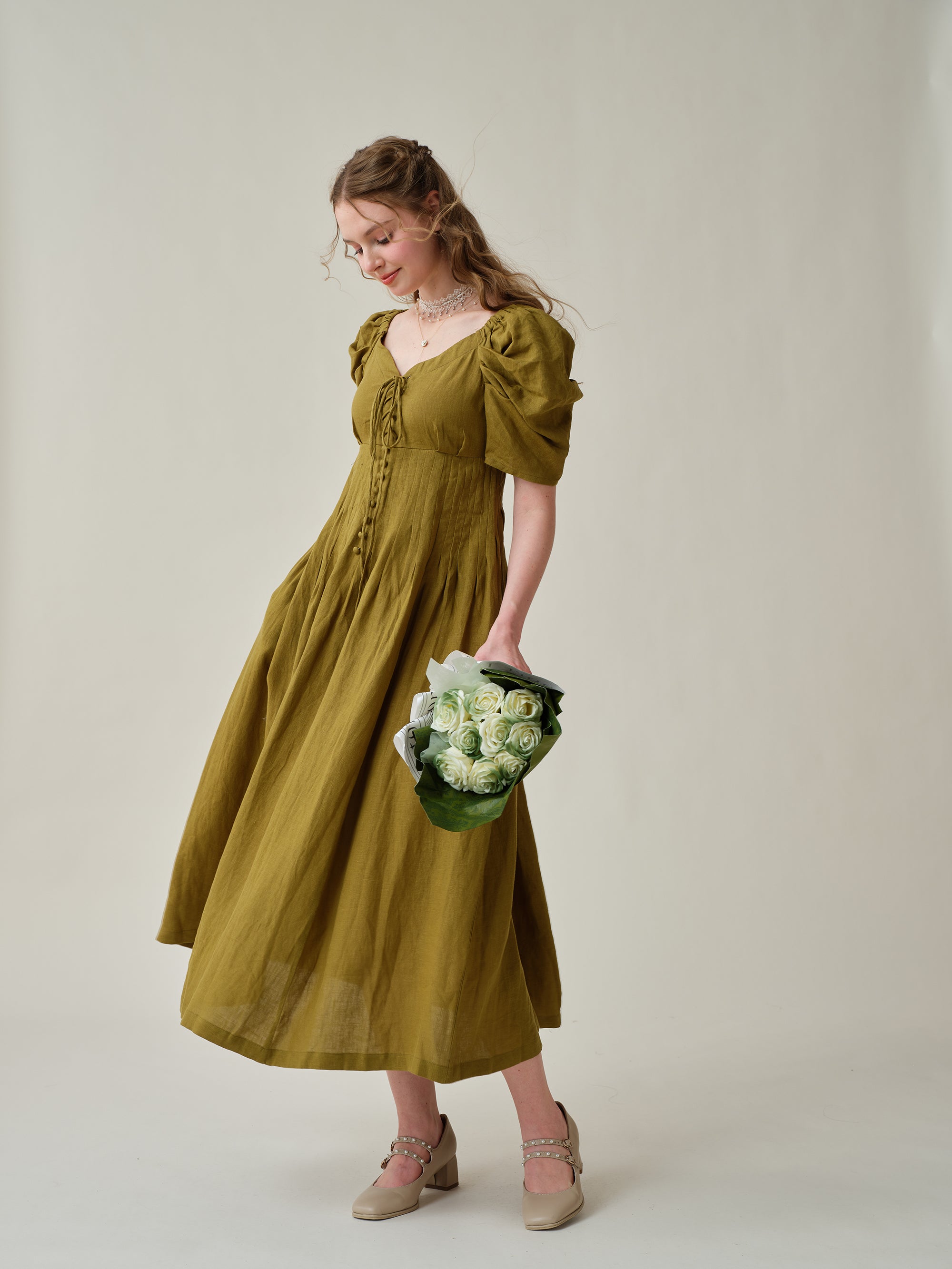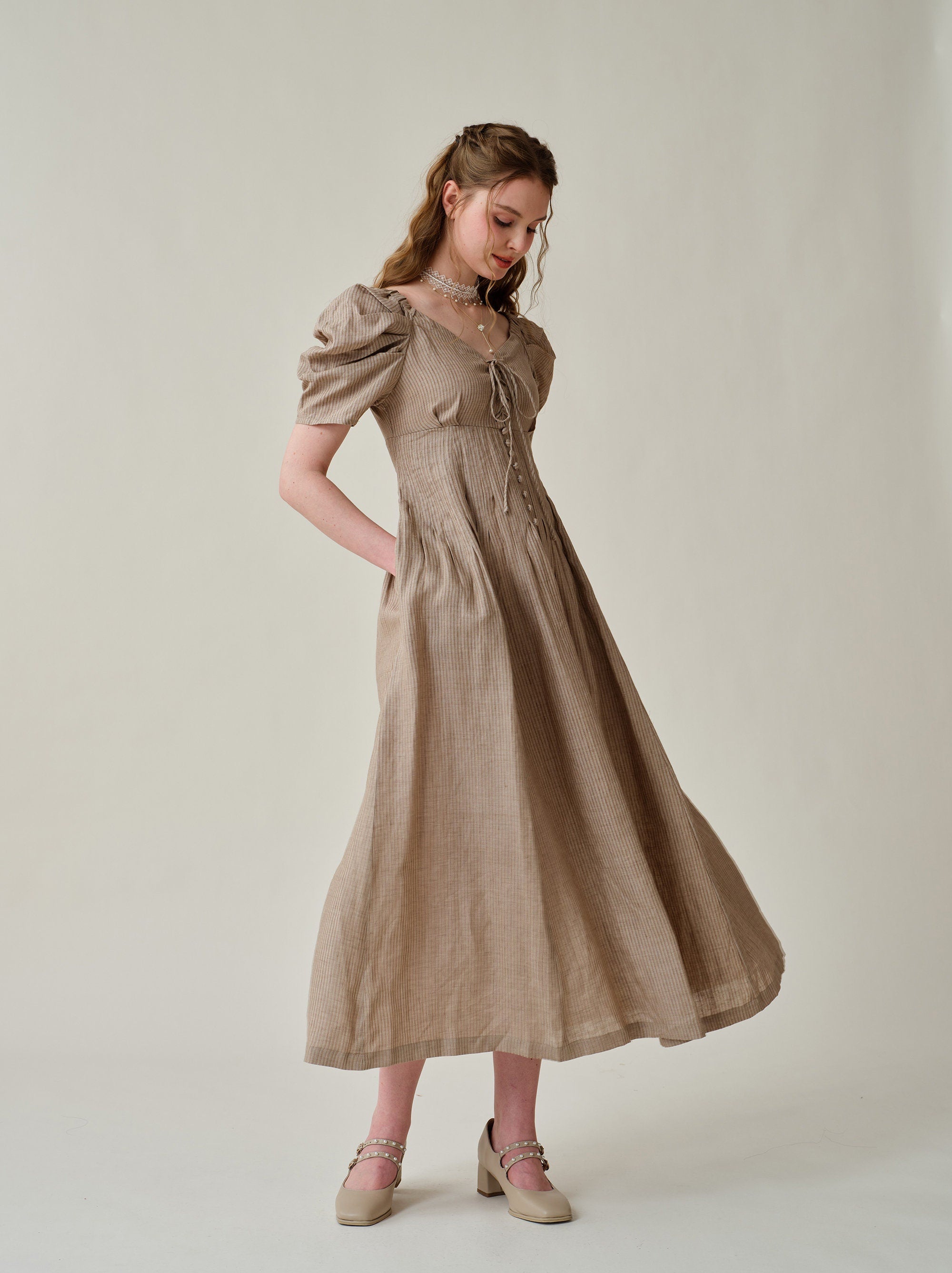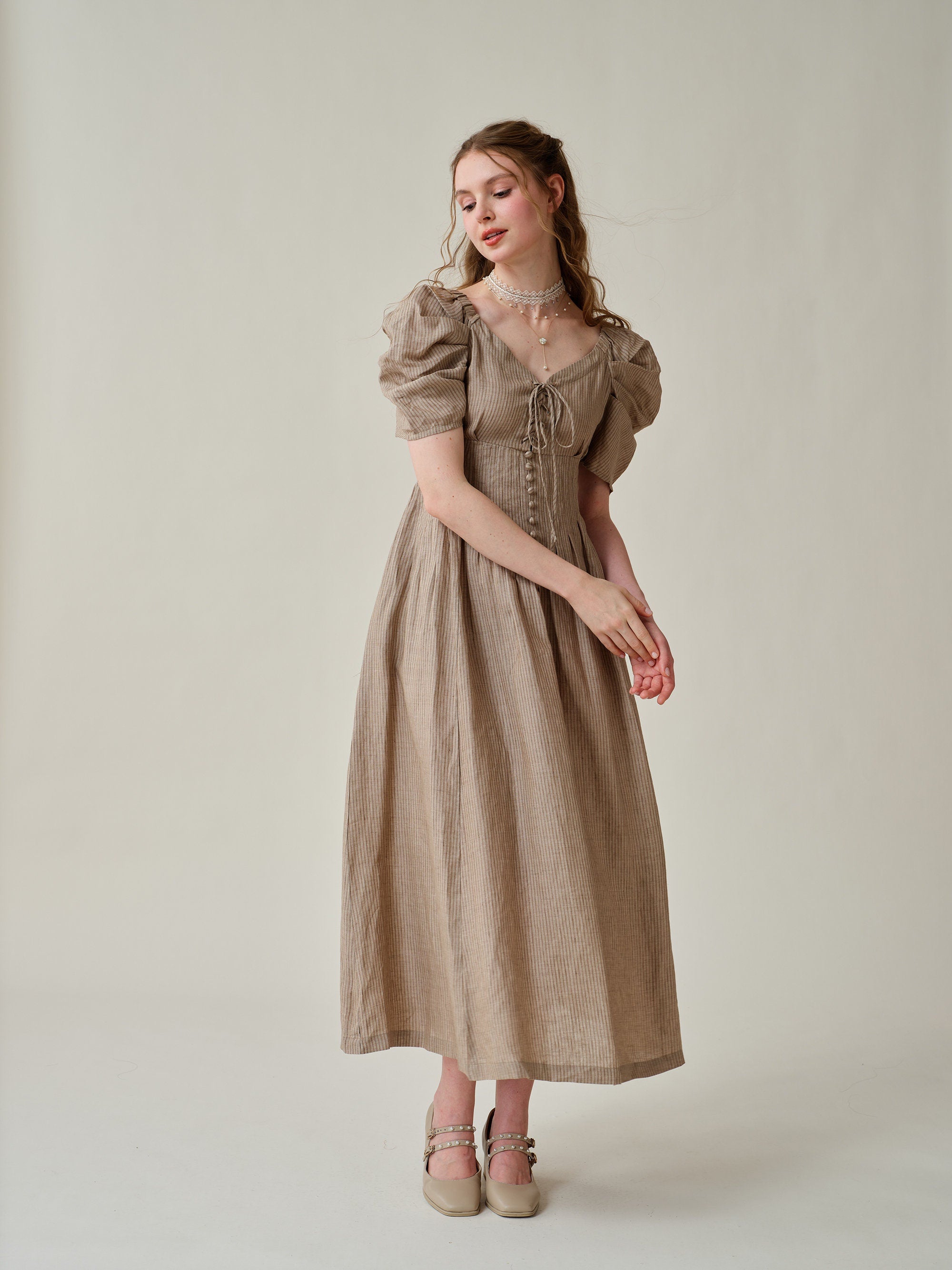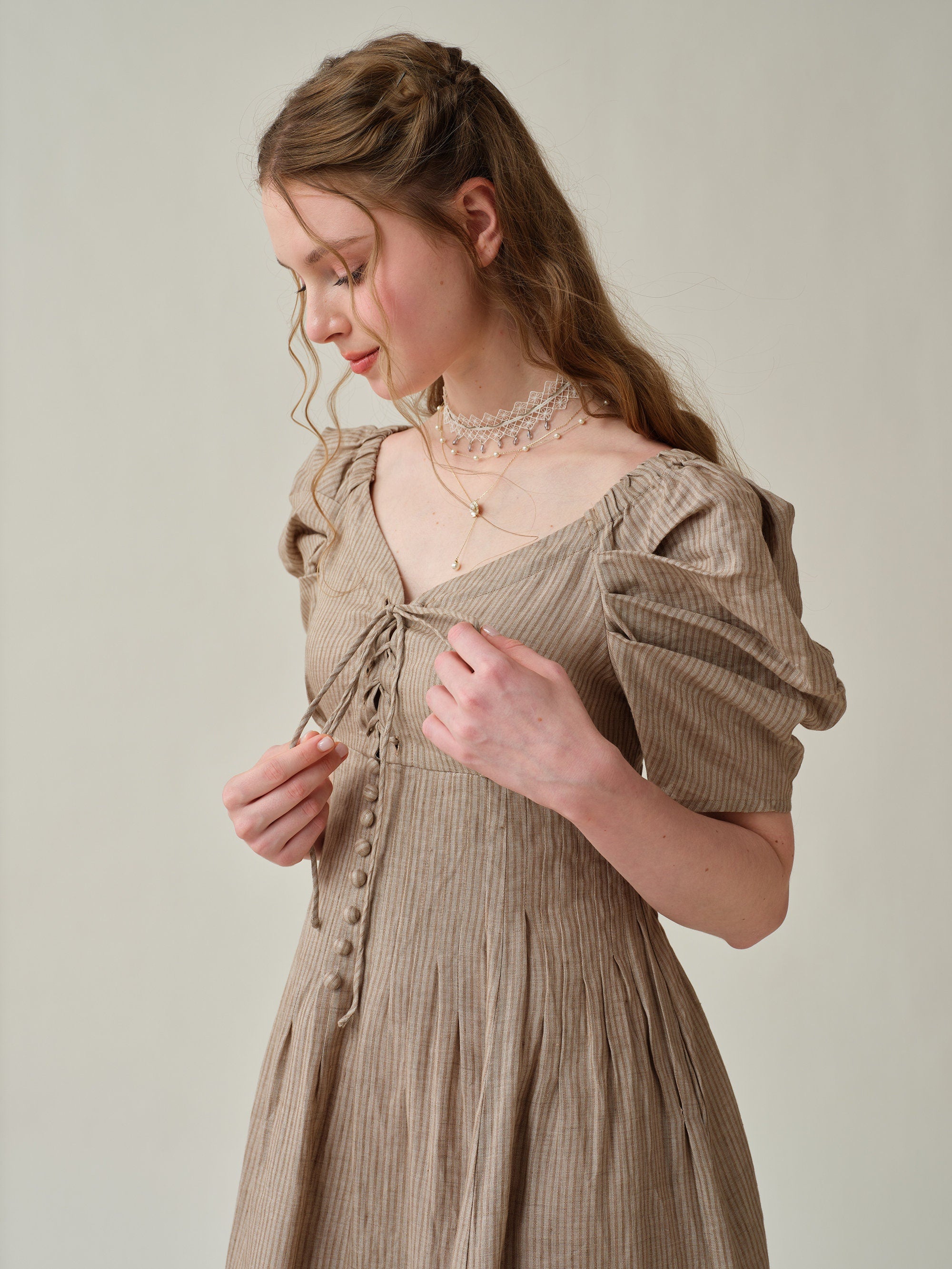 It finely demonstrates its sophisticated aesthetic. The lace-up front design is inspired by corsetry for drama, Puffed sleeves and soft gathering at the waist for a romantic touch.