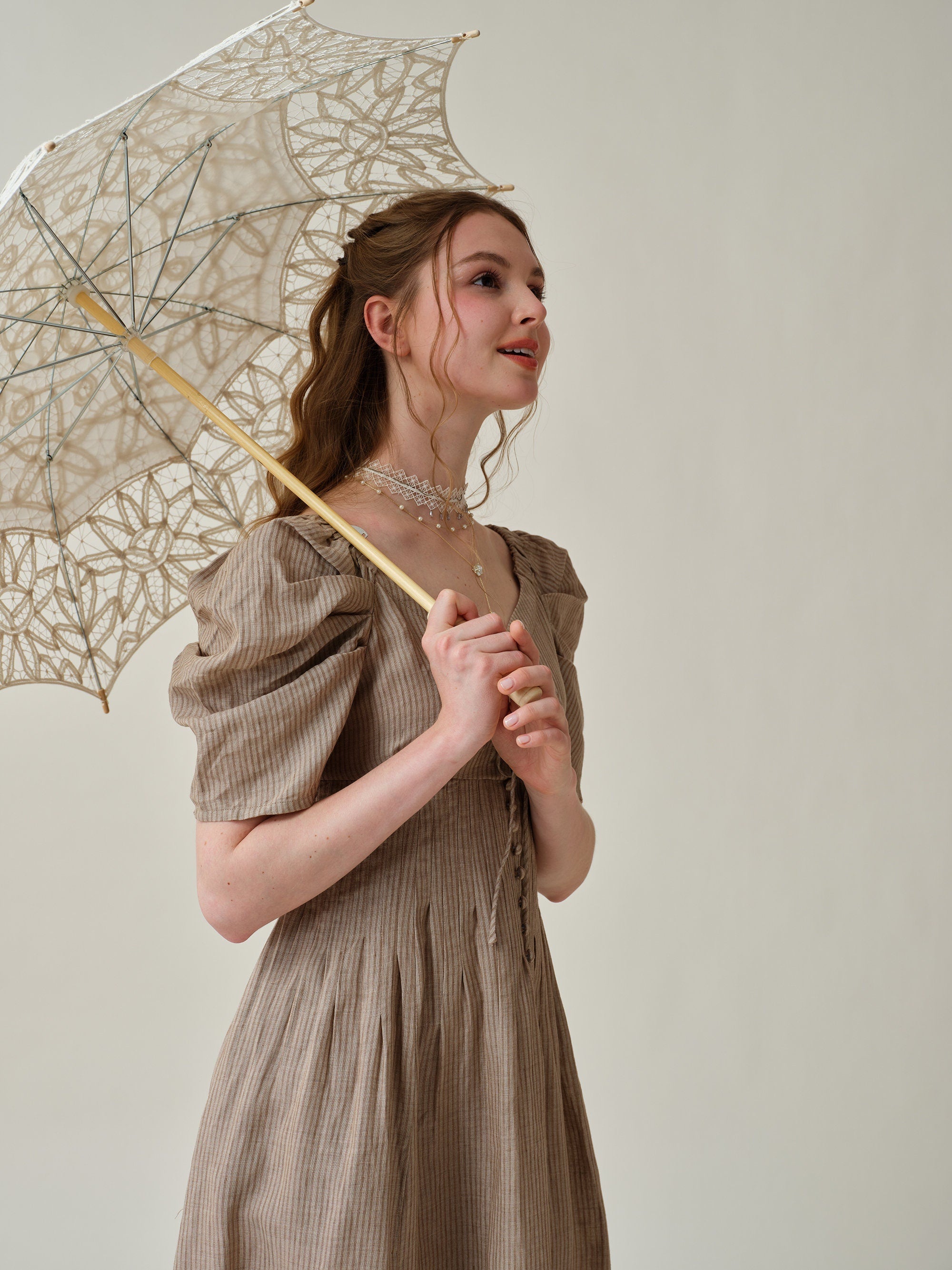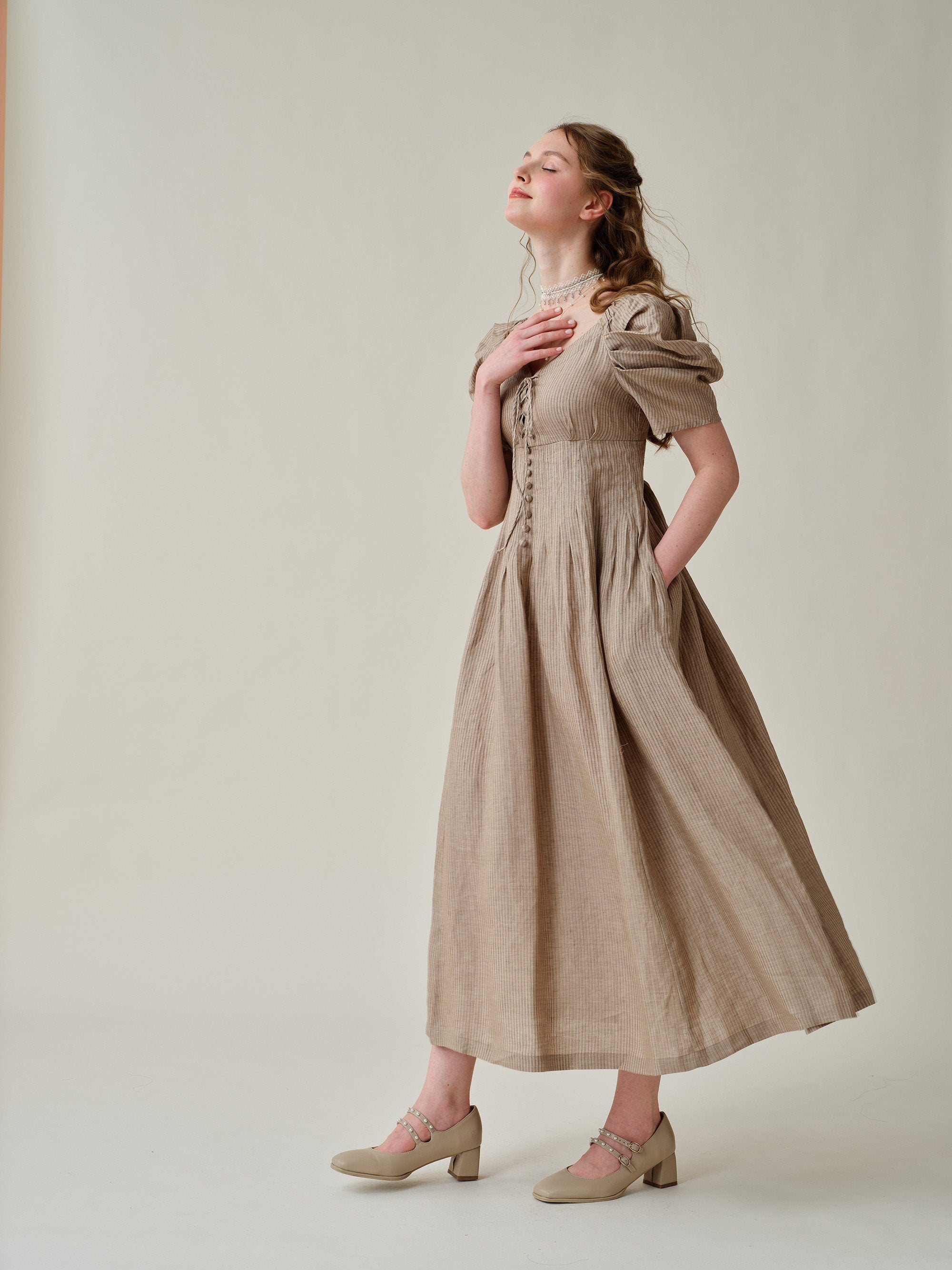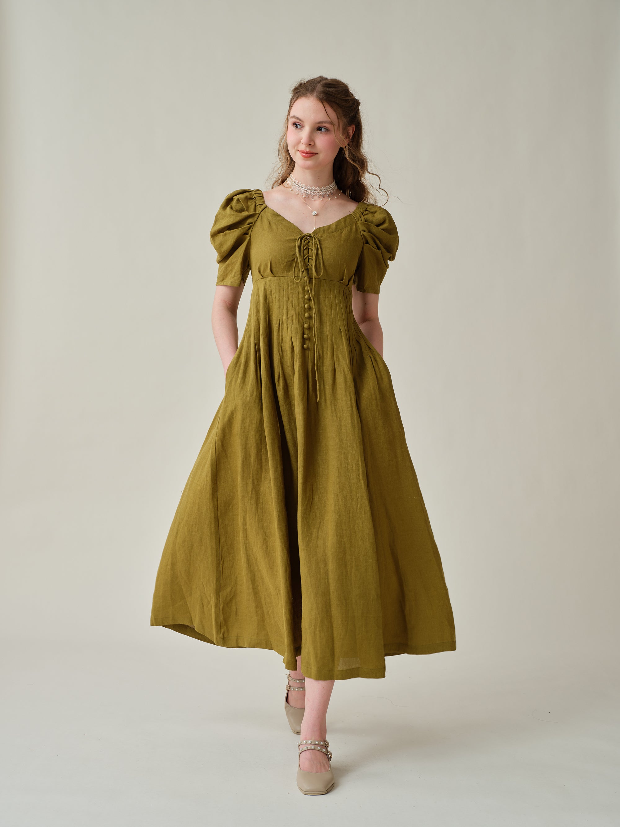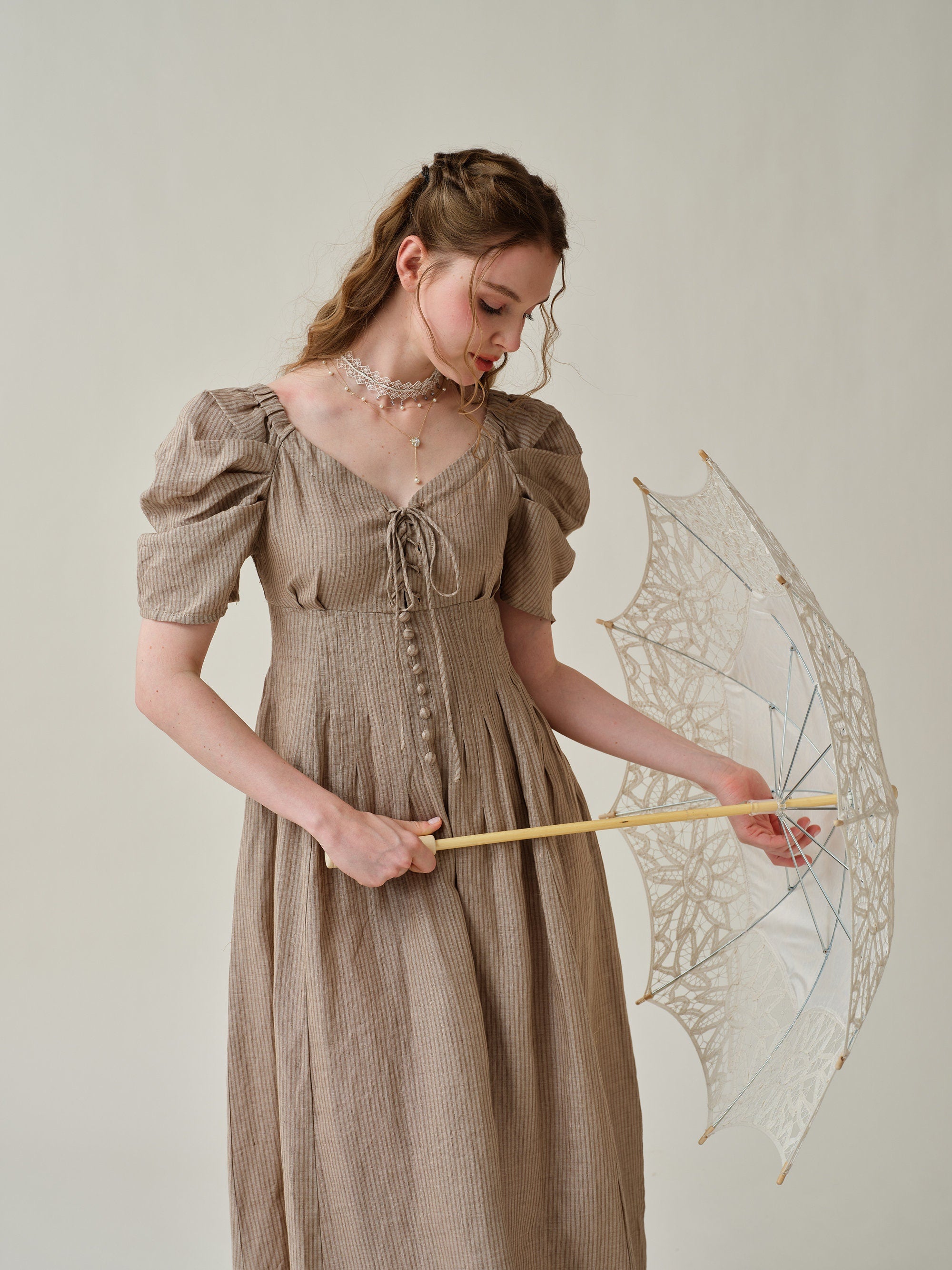 It finely demonstrates its sophisticated aesthetic. The lace-up front design is inspired by corsetry for drama, Puffed sleeves and soft gathering at the waist for a romantic touch.