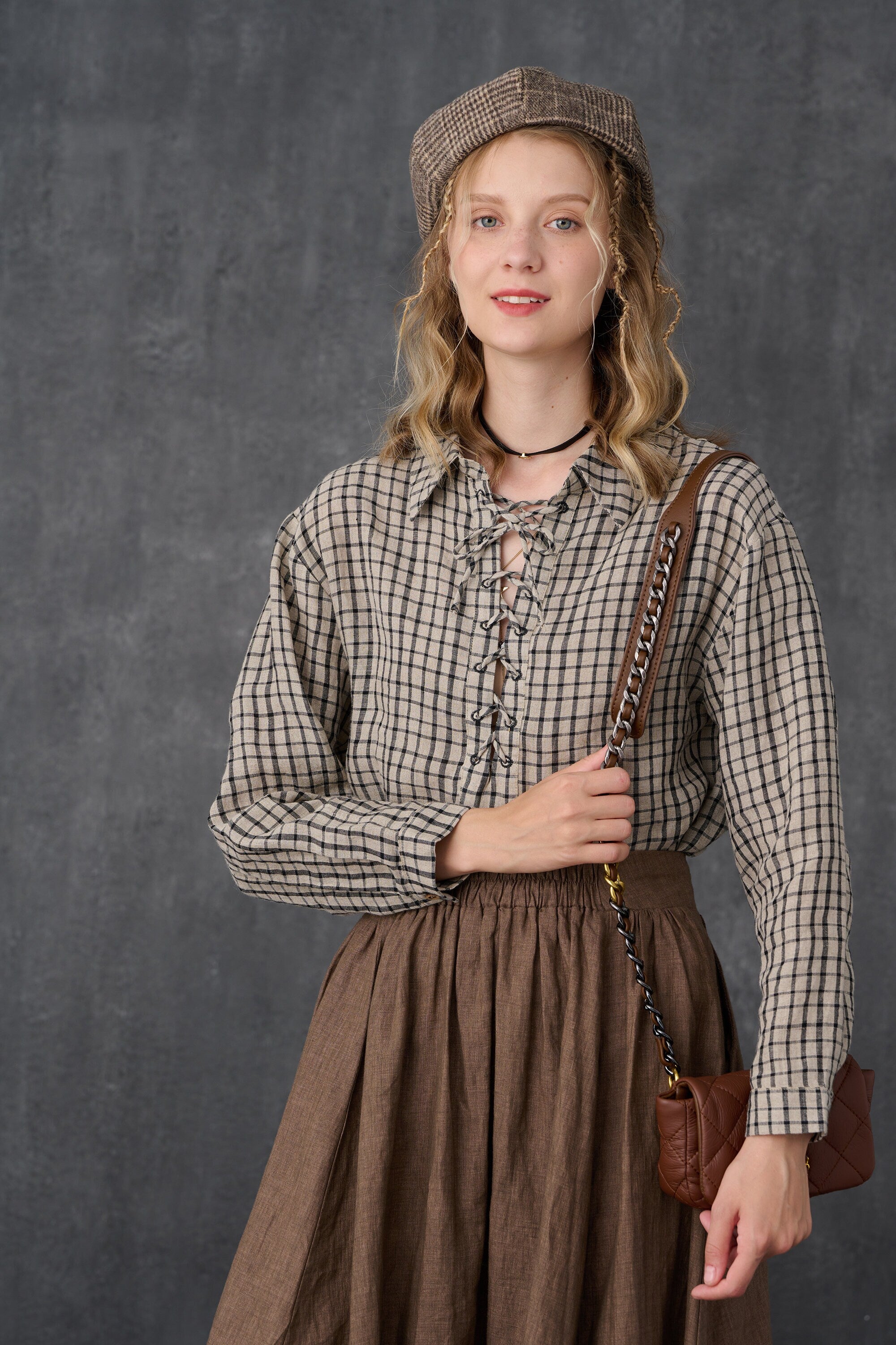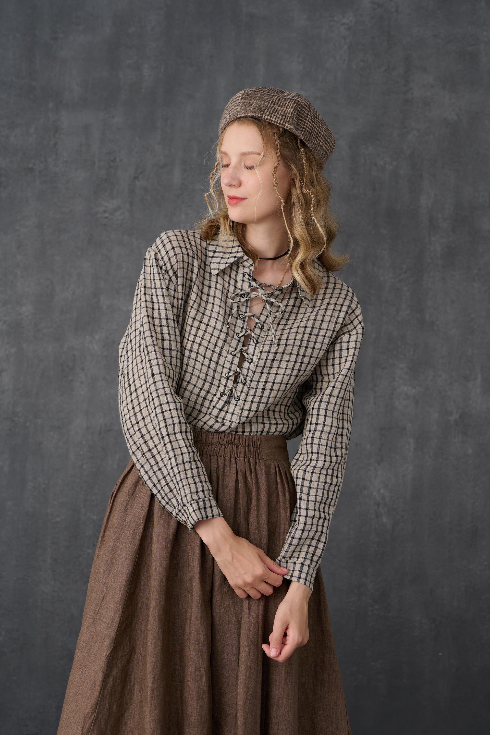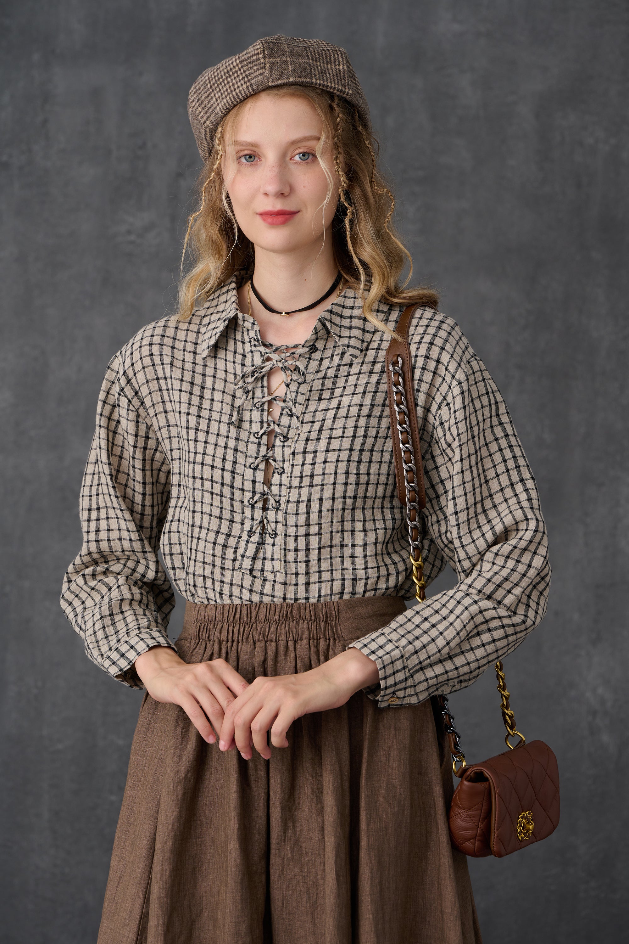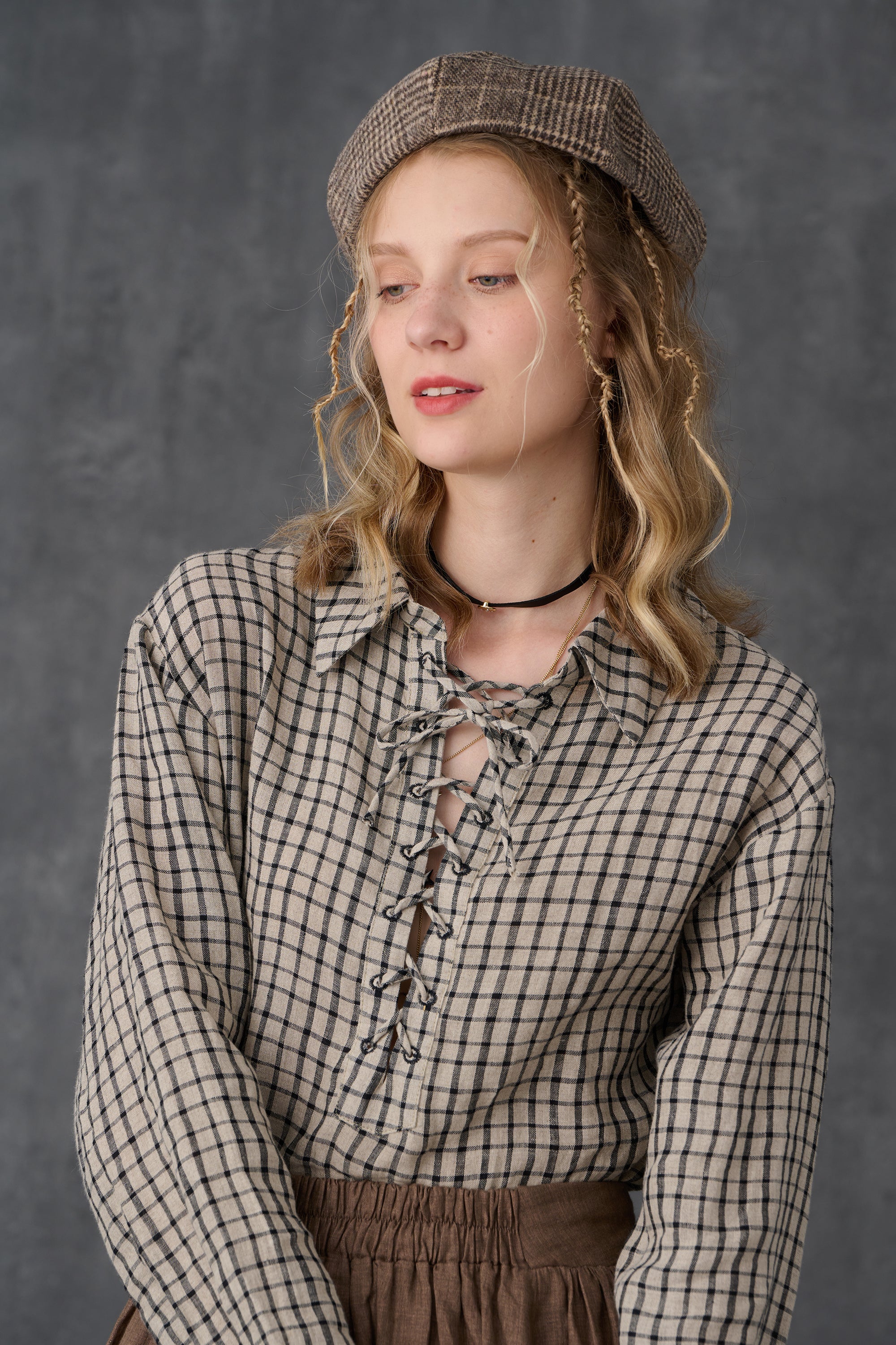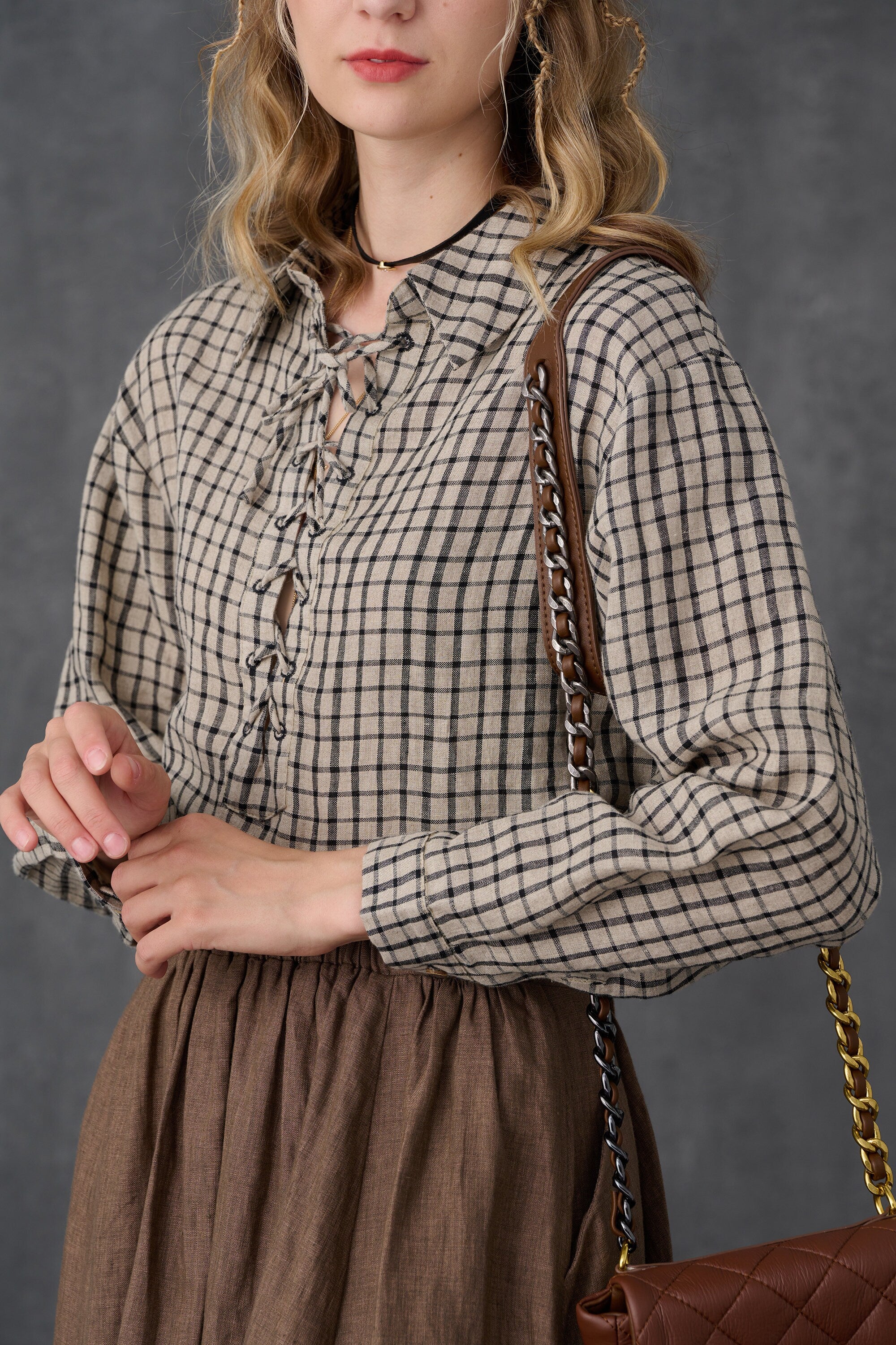 Crafted from 100% linen, a front lace up detail, Puff sleeve and metallic buttoned cuffs. offers both comfort and unrivalled style.
