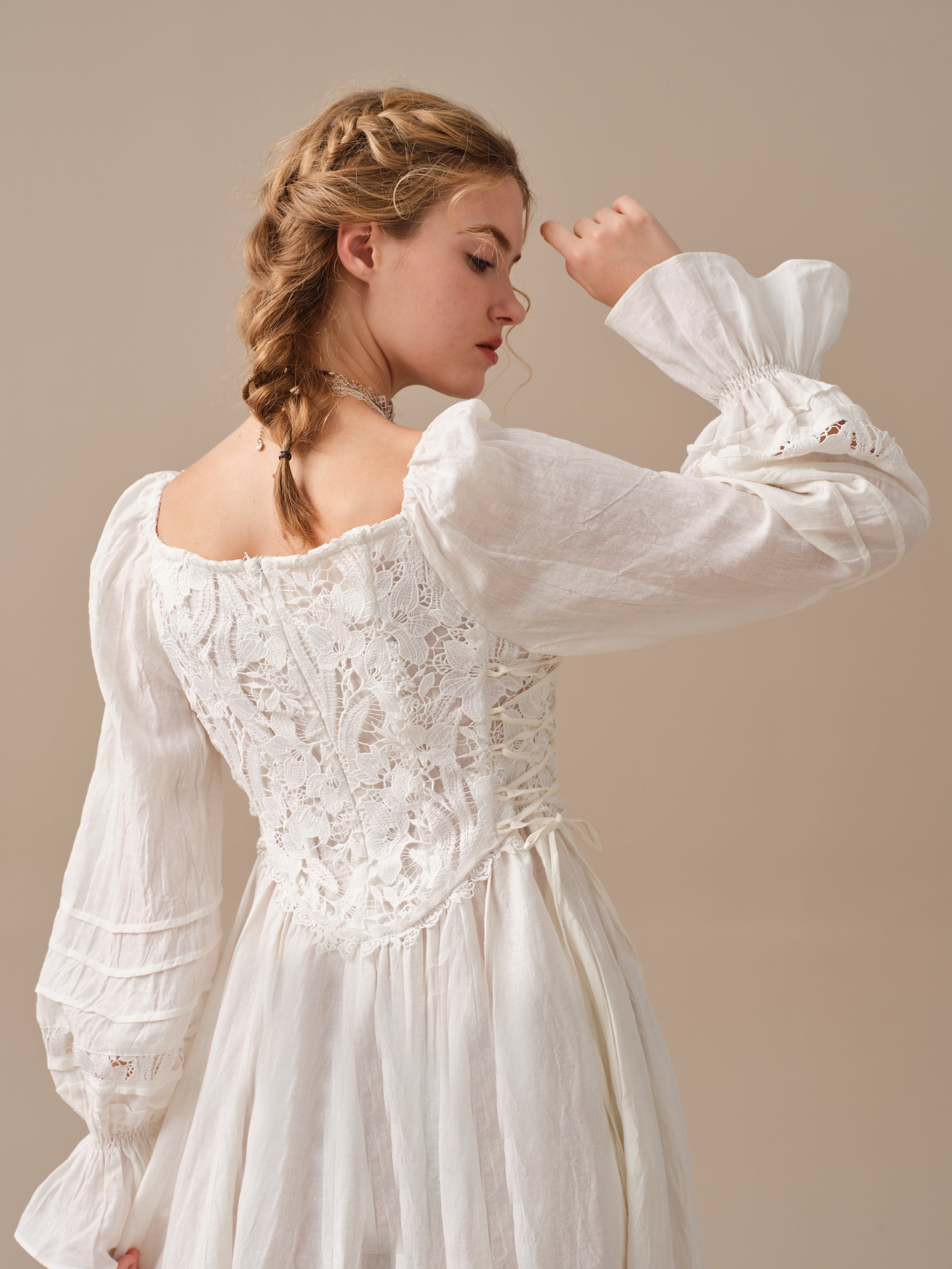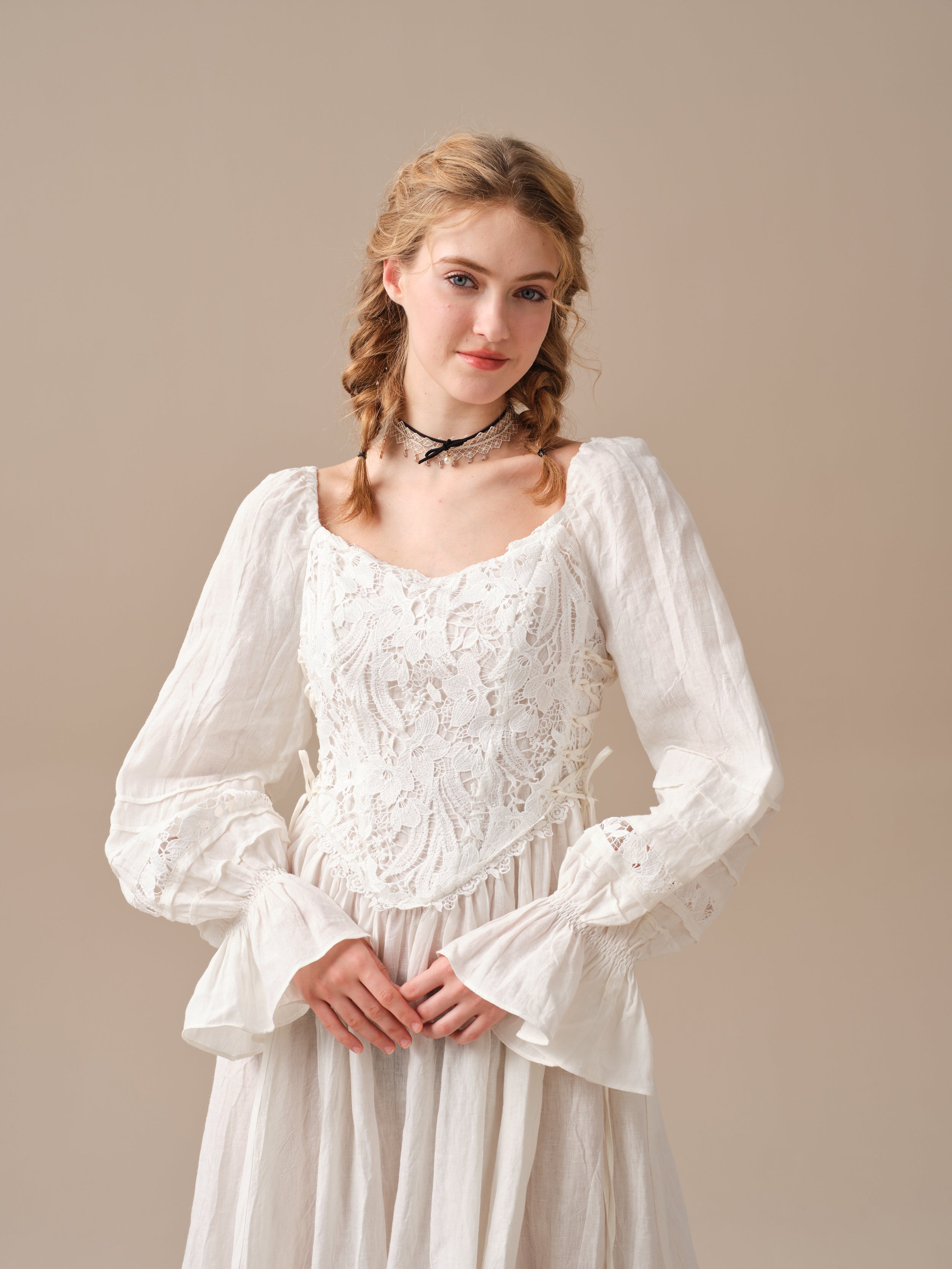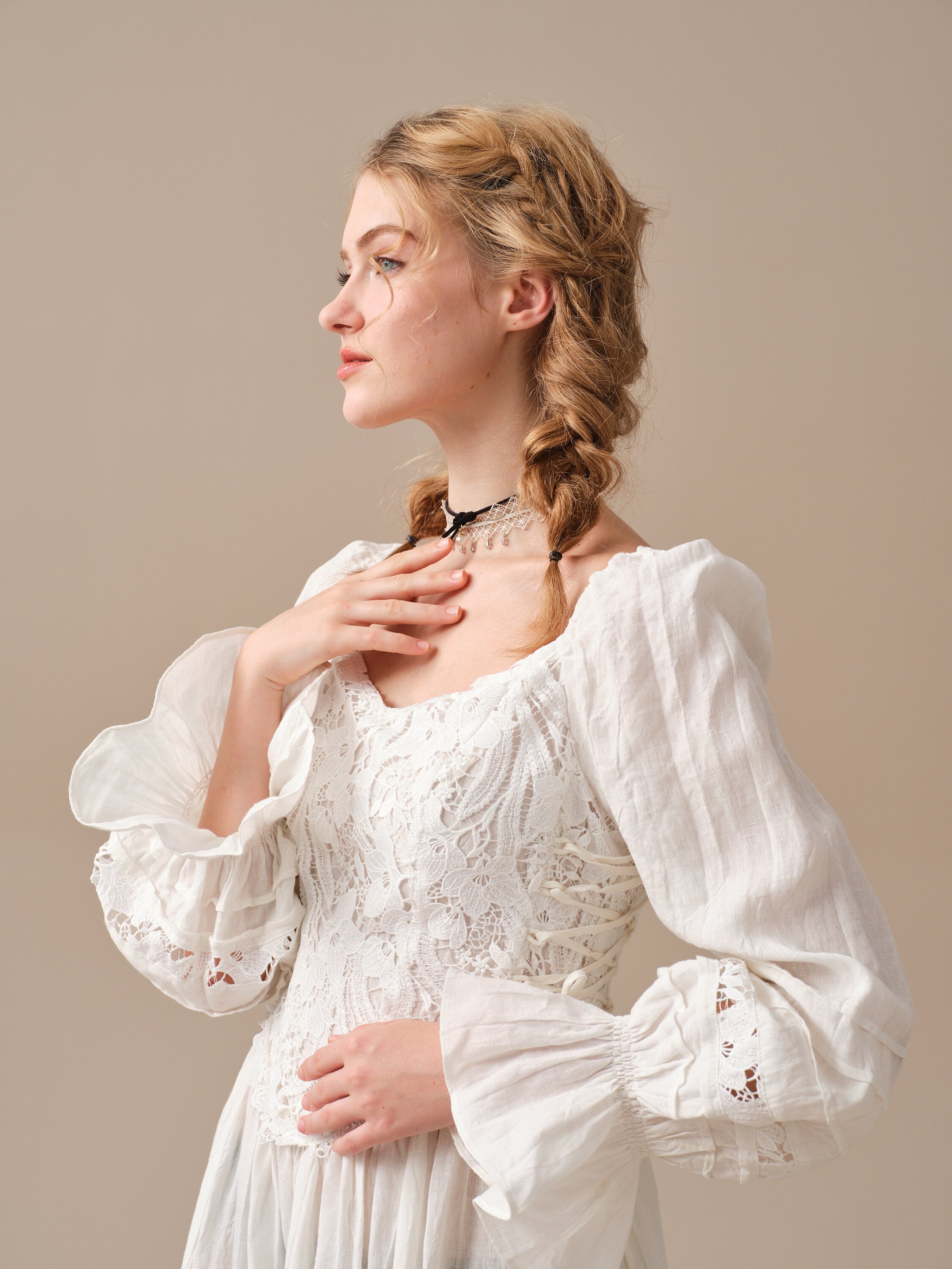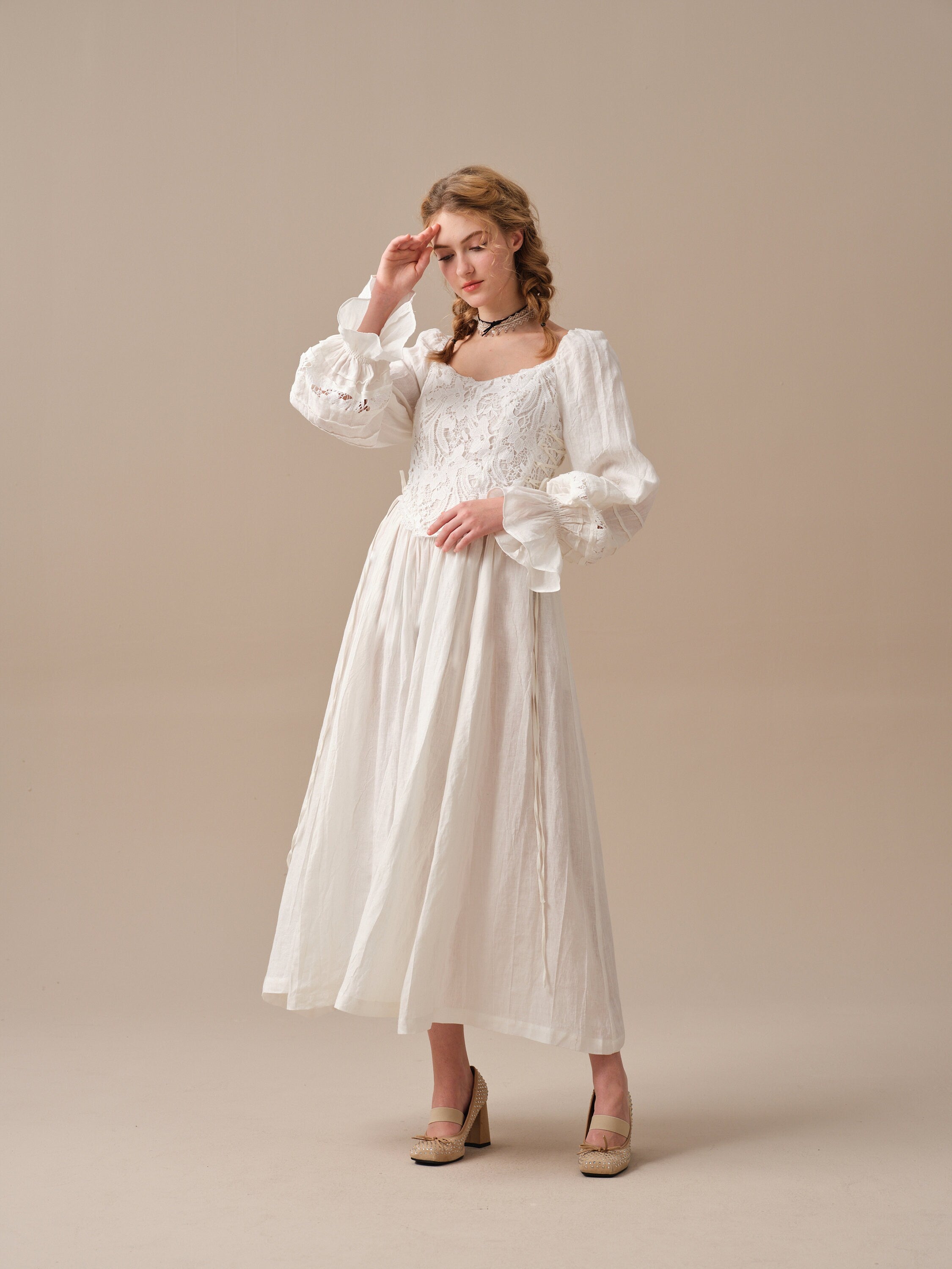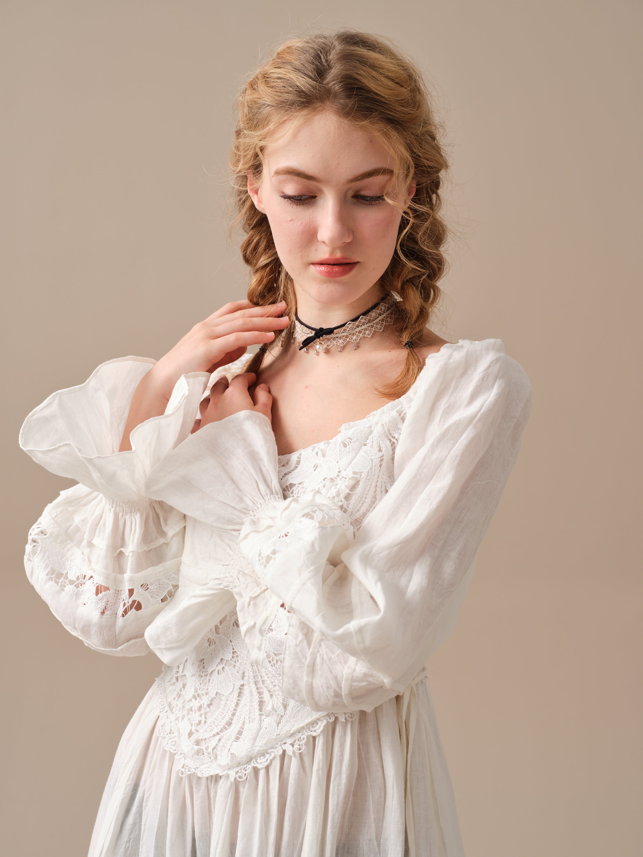 The color is so dreamy, this piece is embellished with delicate handmade lace embroidery in the same color on the front, back and sleeves, exuding timeless elegance and romance.