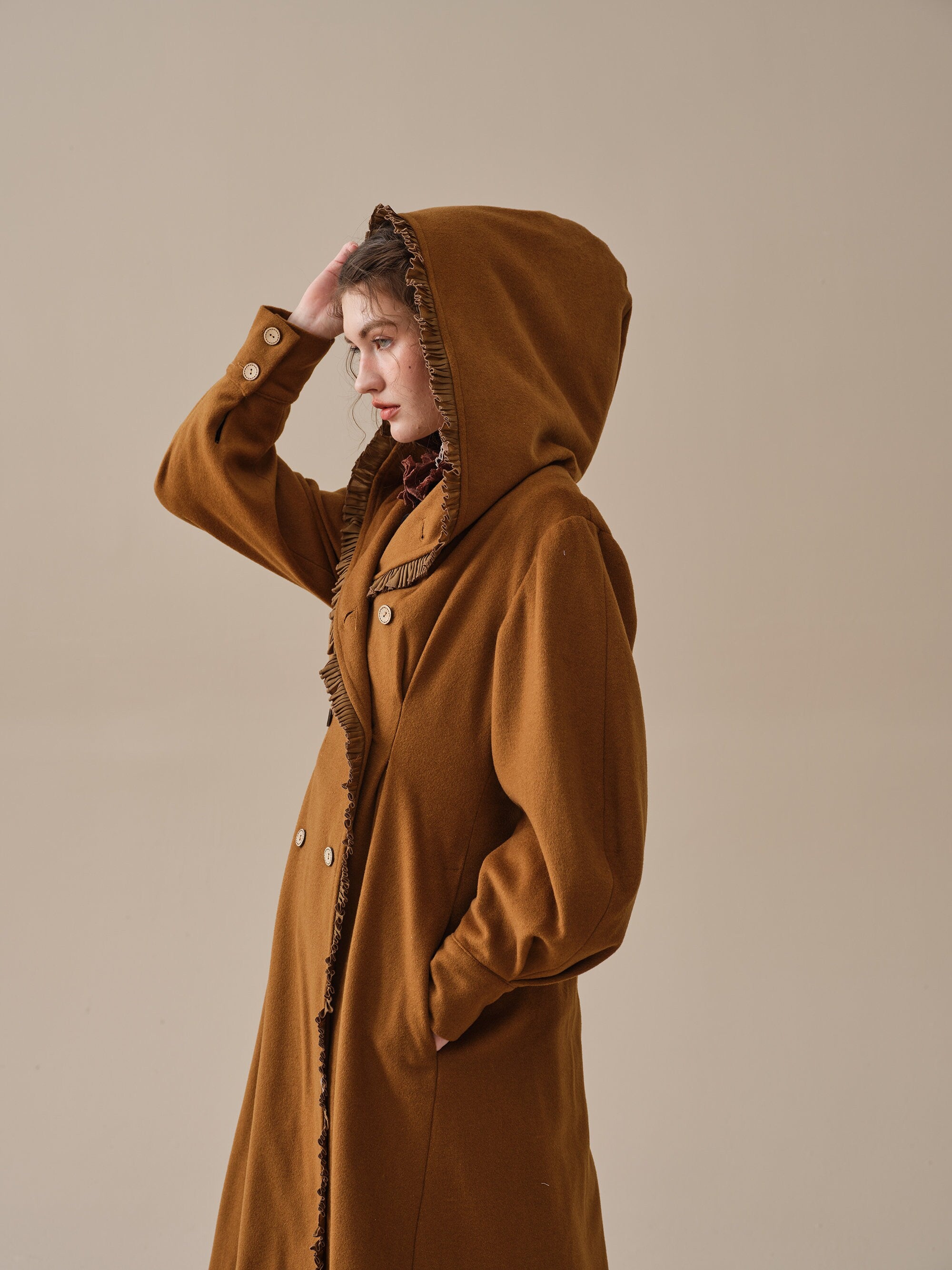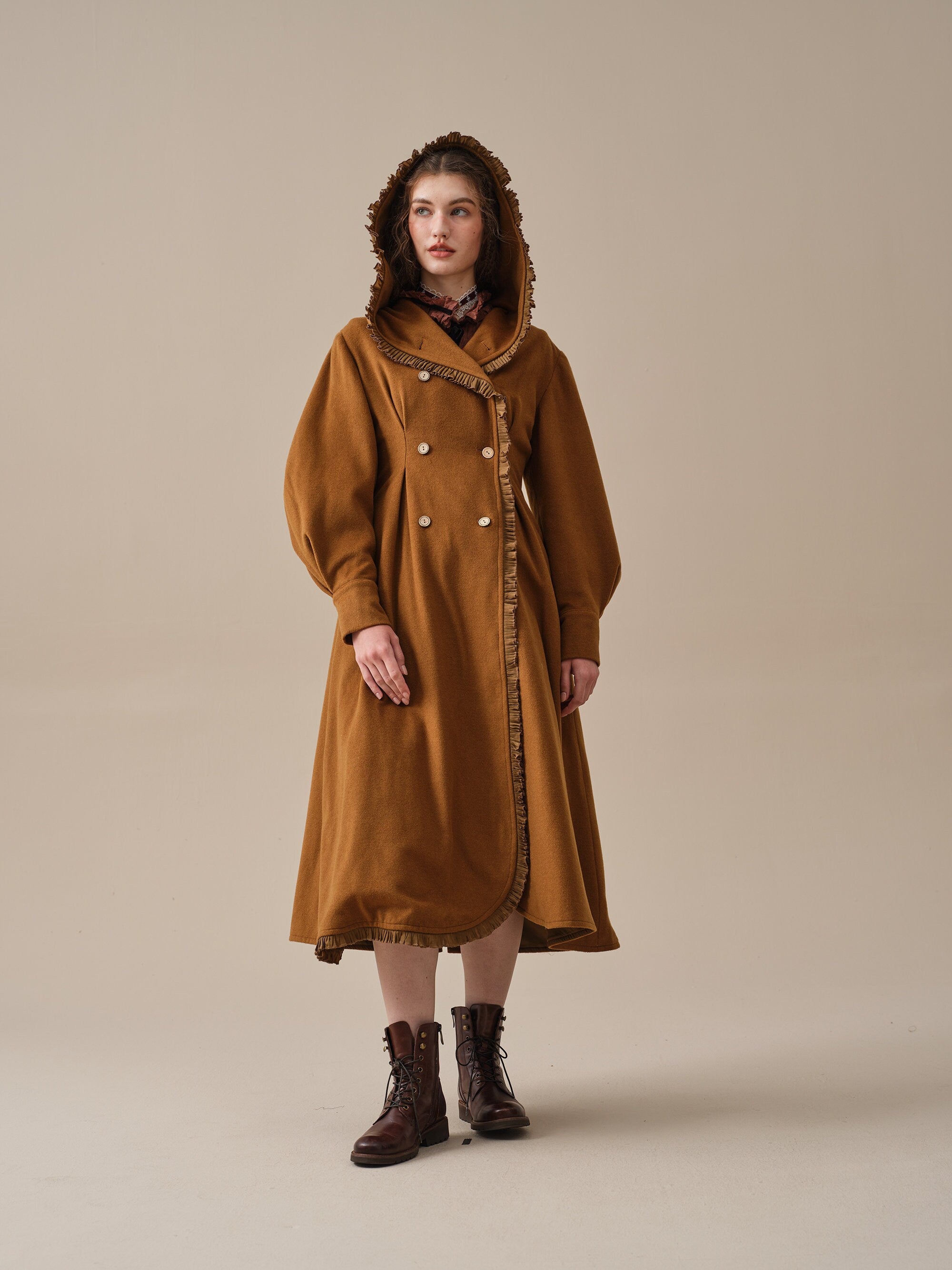 The generously-sized hood, reminiscent of fairytale coats, offers both protection against the elements and a touch of whimsy. The delicate ruffle trims akin to the petals of a blossoming flower, flutter playfully in the breeze, infusing your every step with a sense of enchantment.