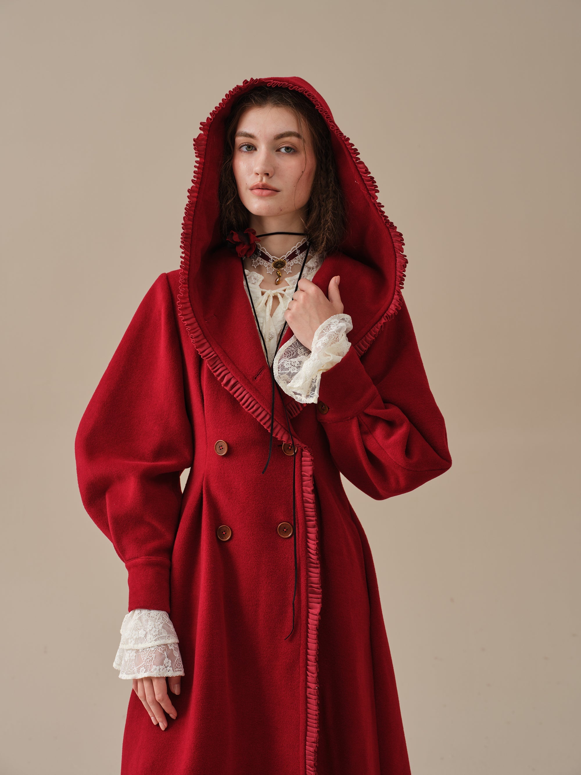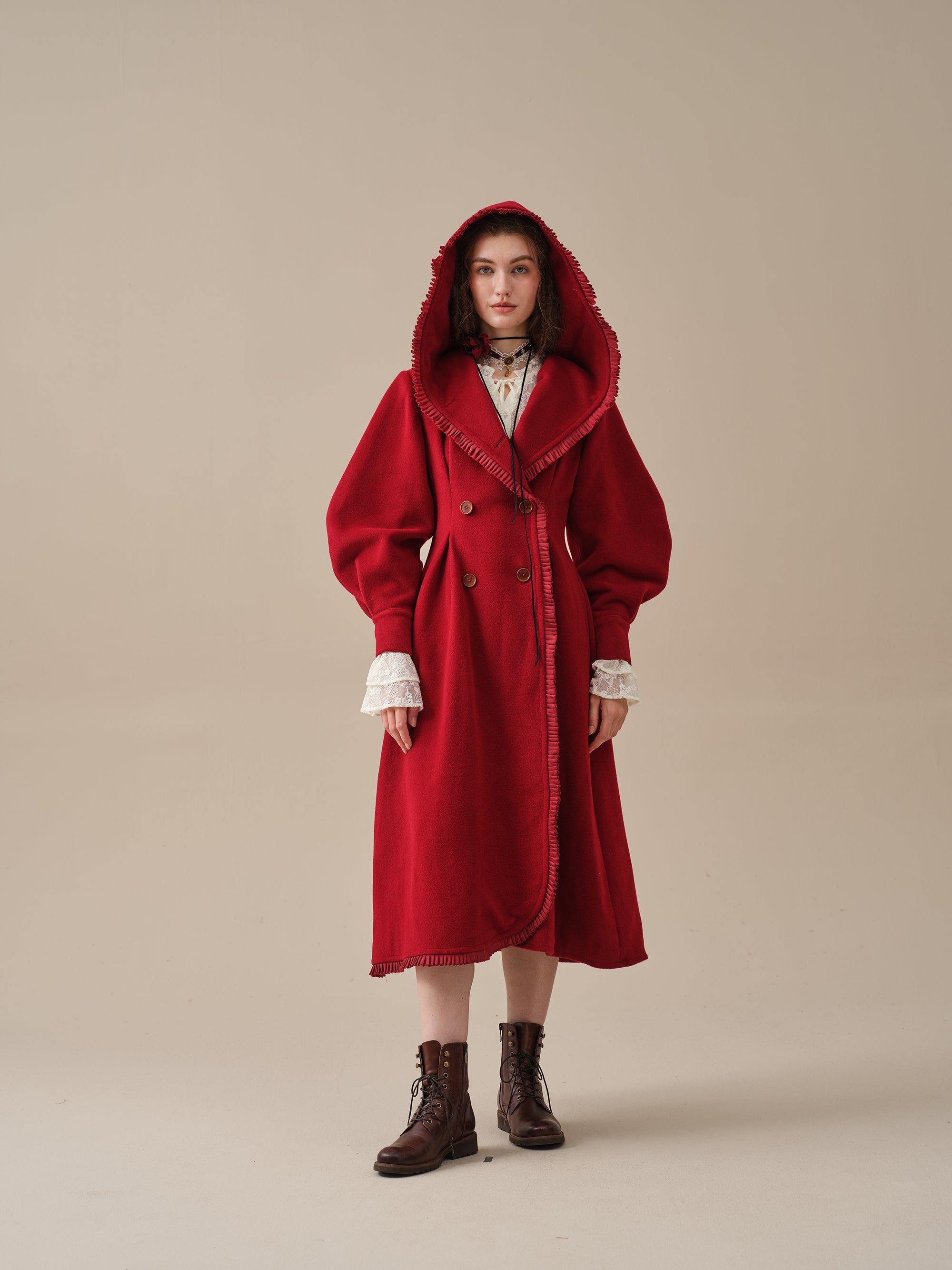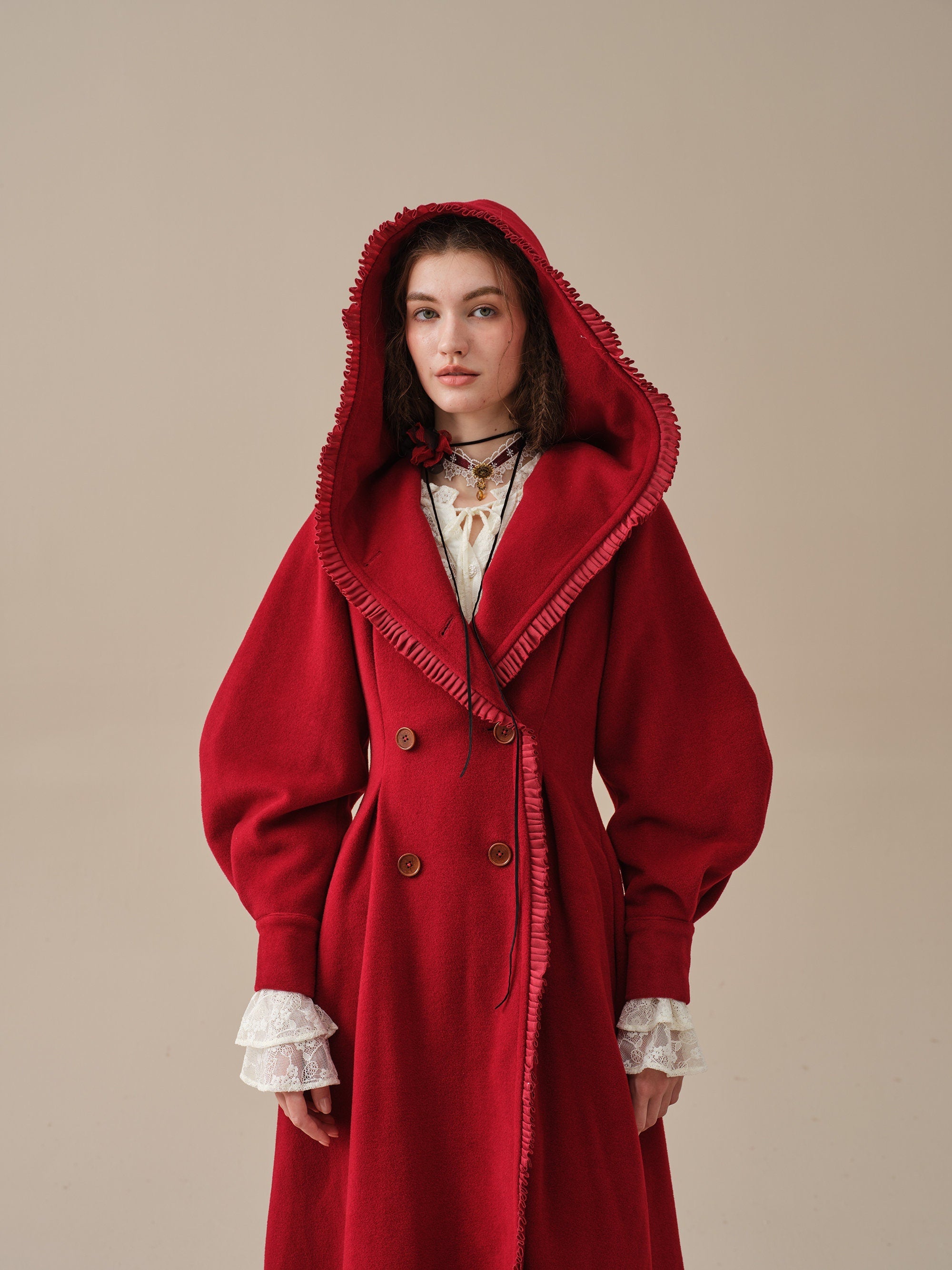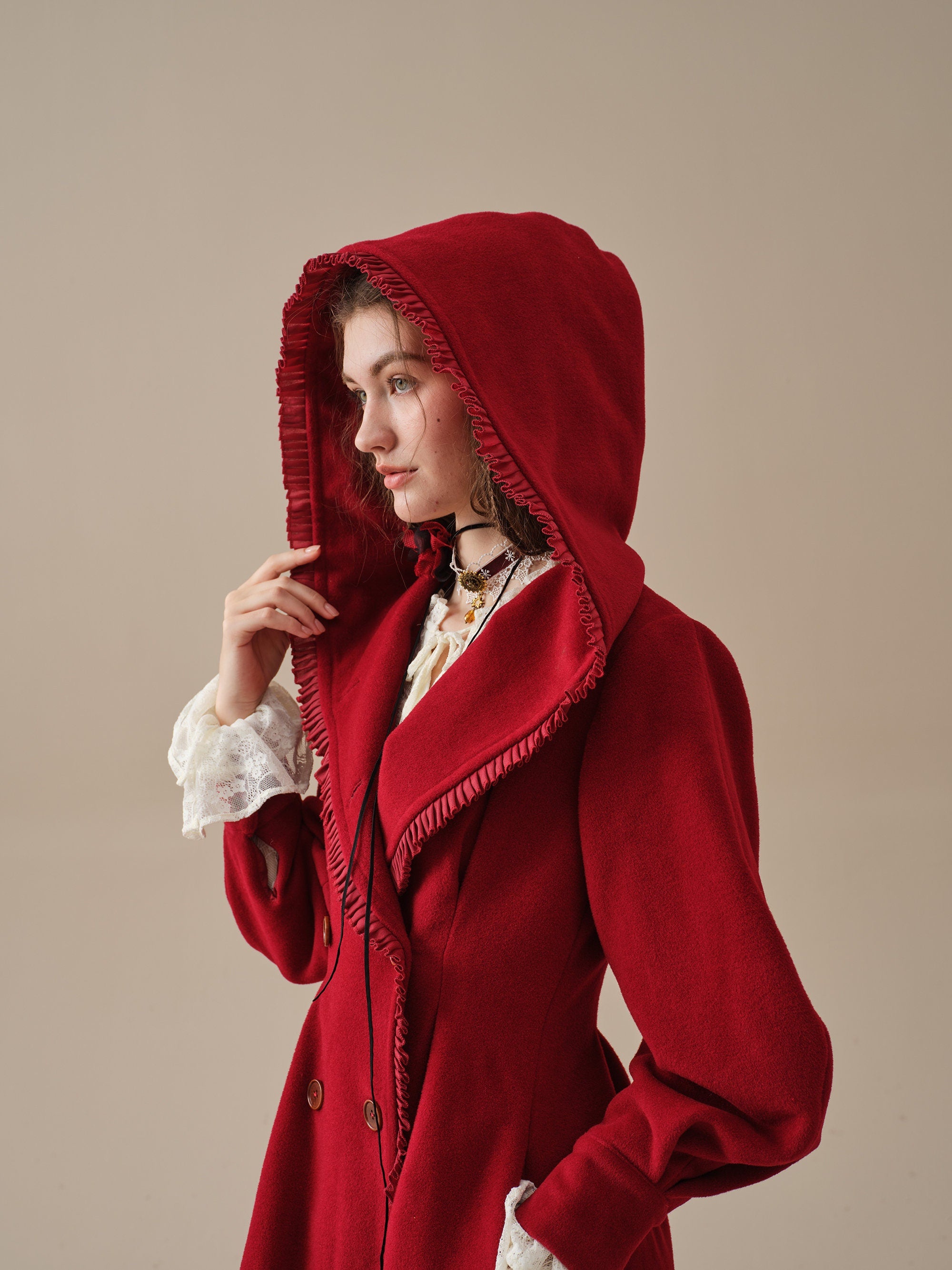 The generously-sized hood, reminiscent of fairytale coats, offers both protection against the elements and a touch of whimsy. The delicate ruffle trims akin to the petals of a blossoming flower, flutter playfully in the breeze, infusing your every step with a sense of enchantment.