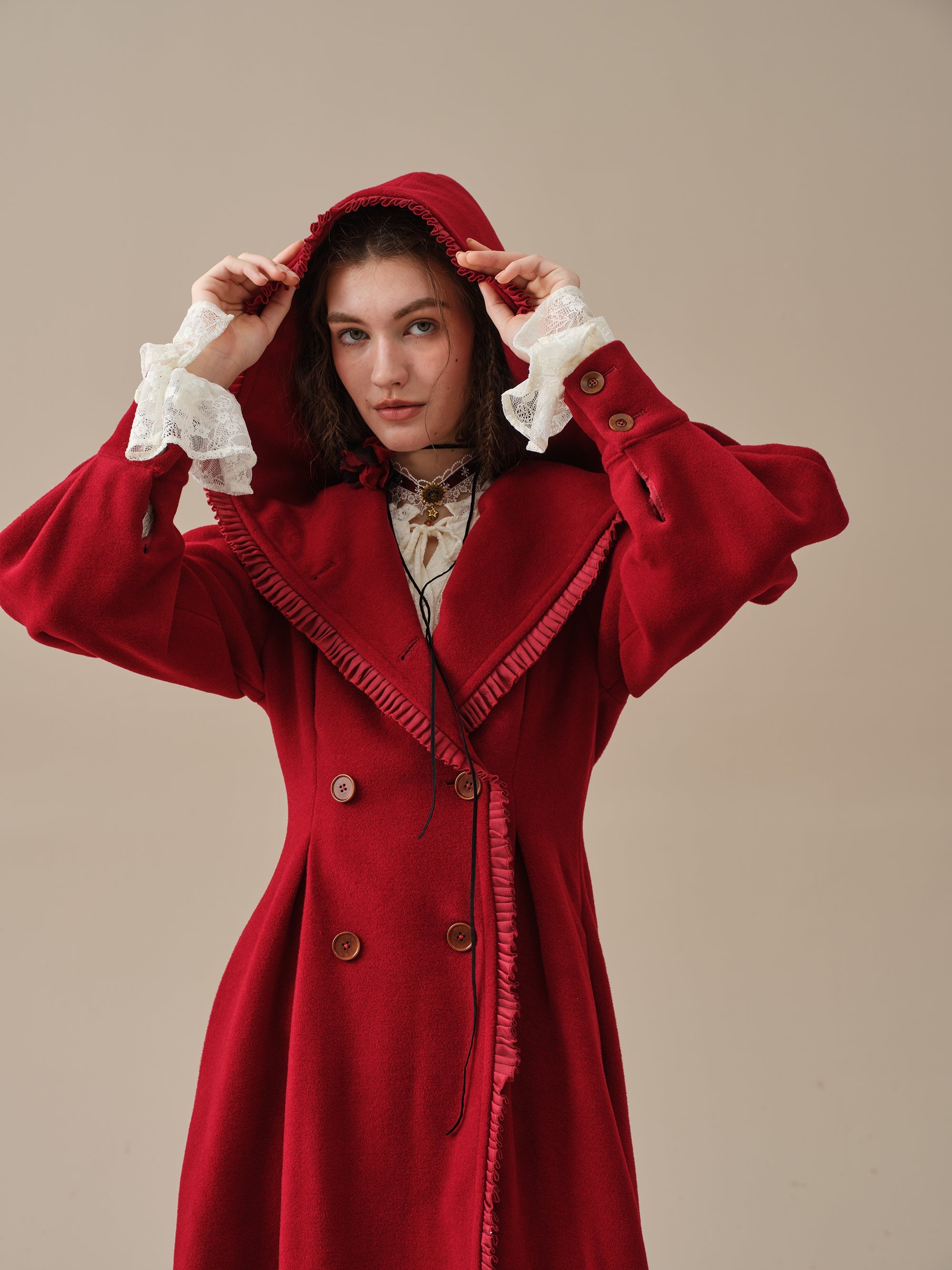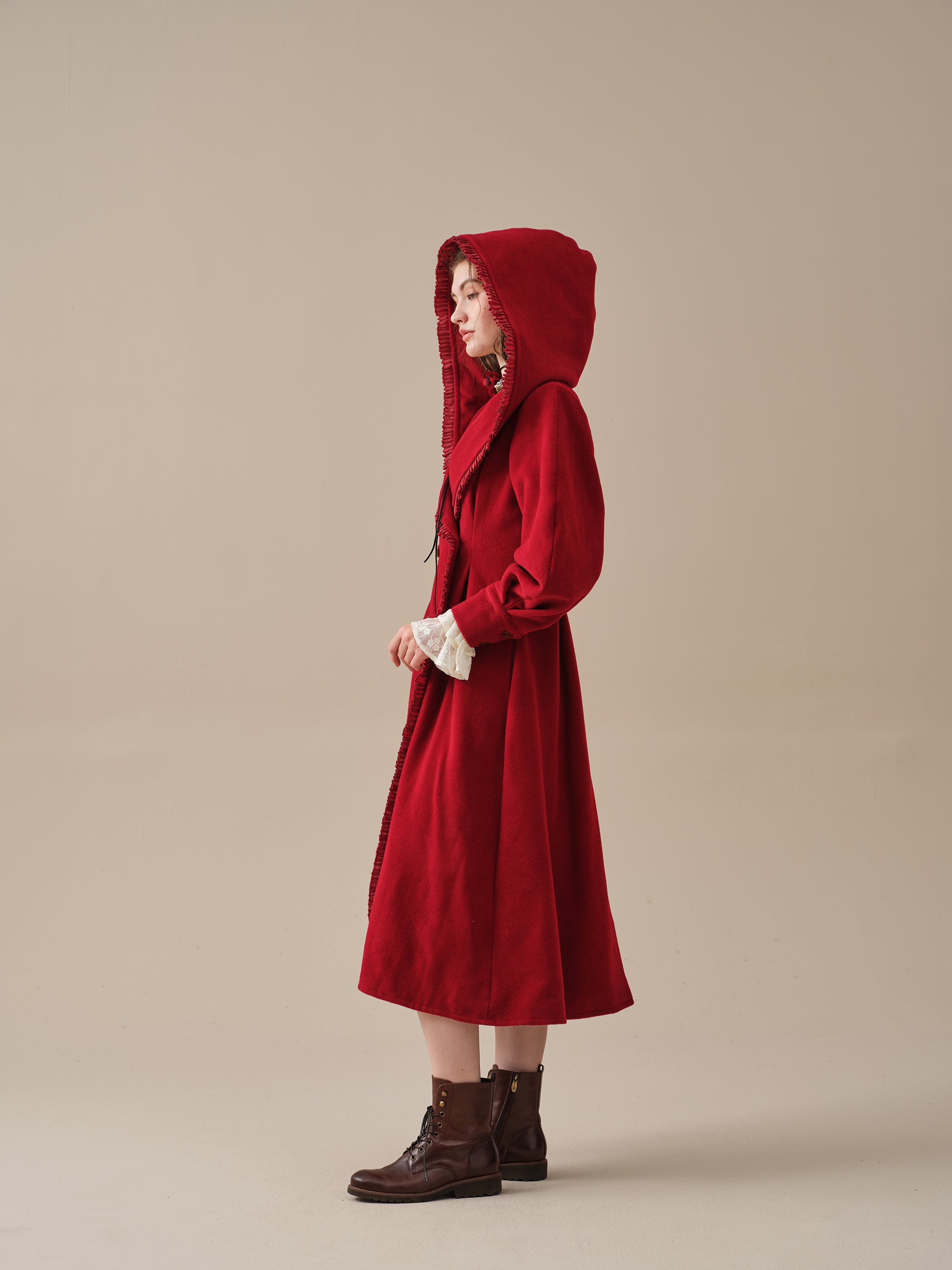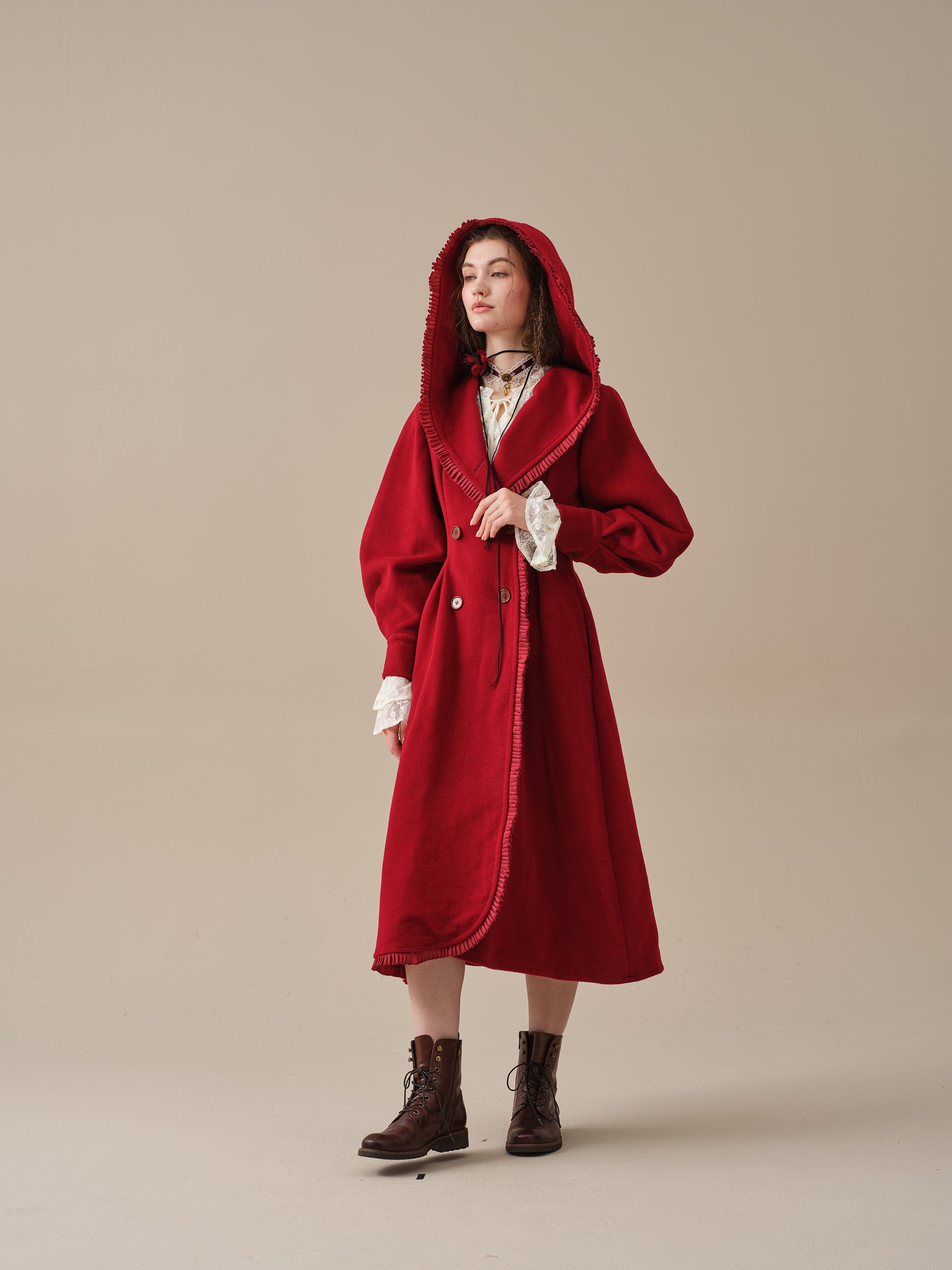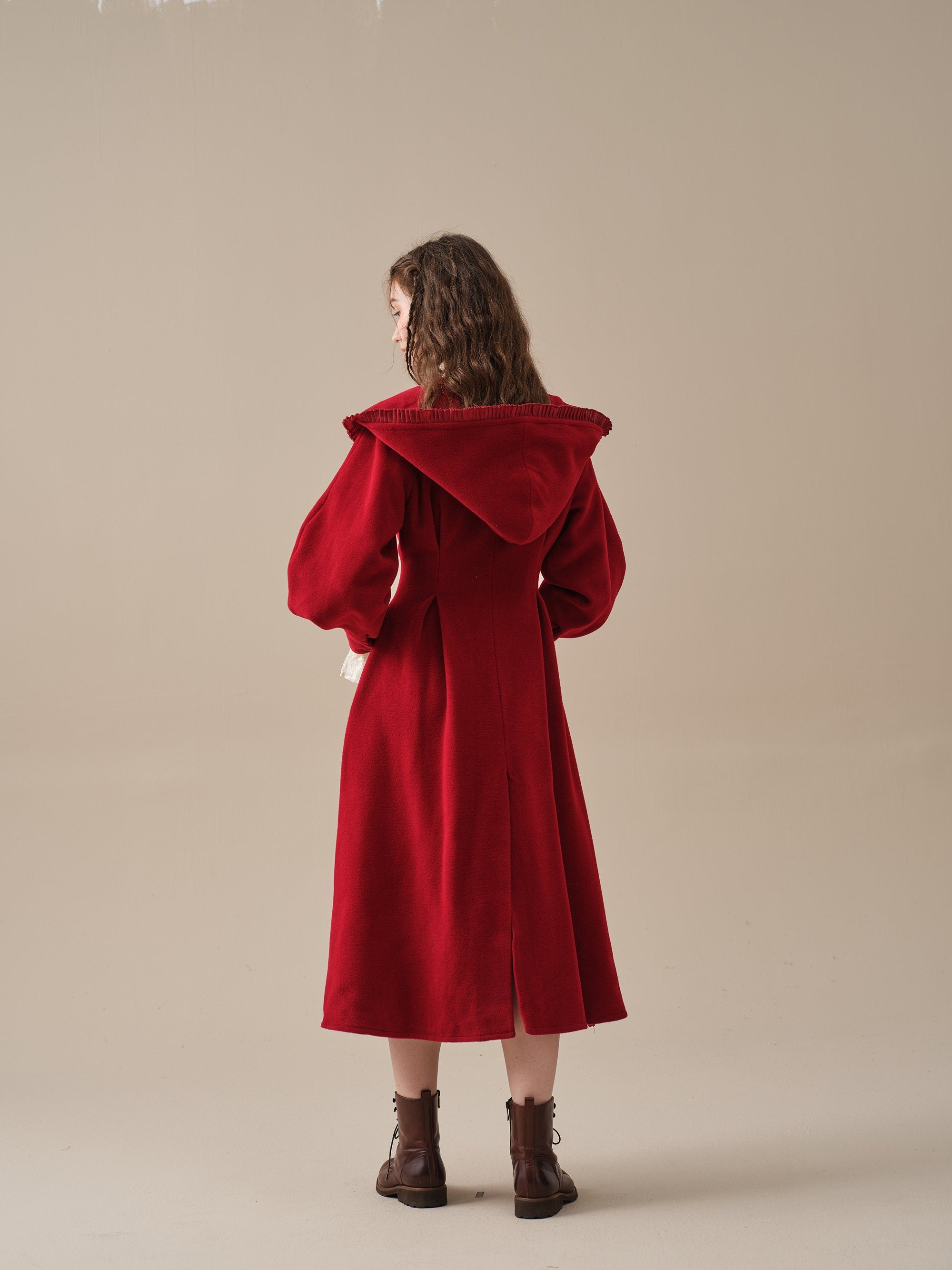 The generously-sized hood, reminiscent of fairytale coats, offers both protection against the elements and a touch of whimsy. The delicate ruffle trims akin to the petals of a blossoming flower, flutter playfully in the breeze, infusing your every step with a sense of enchantment.