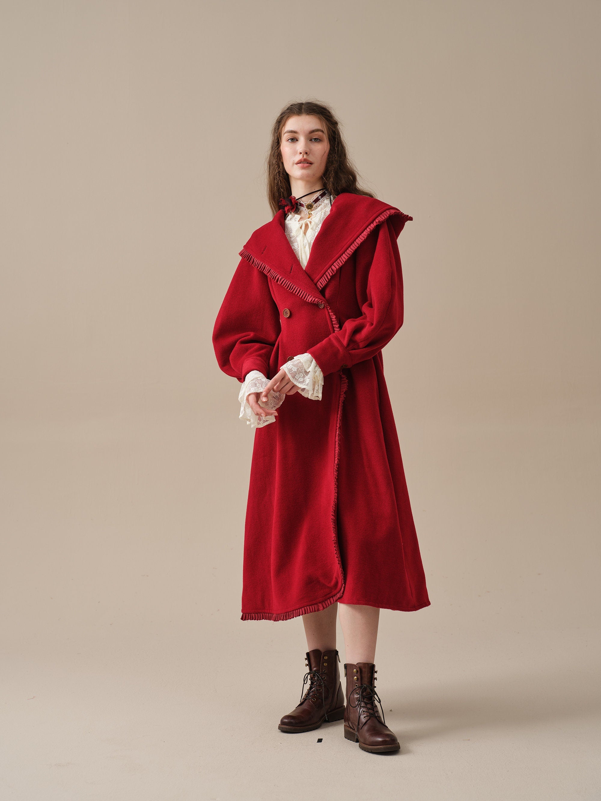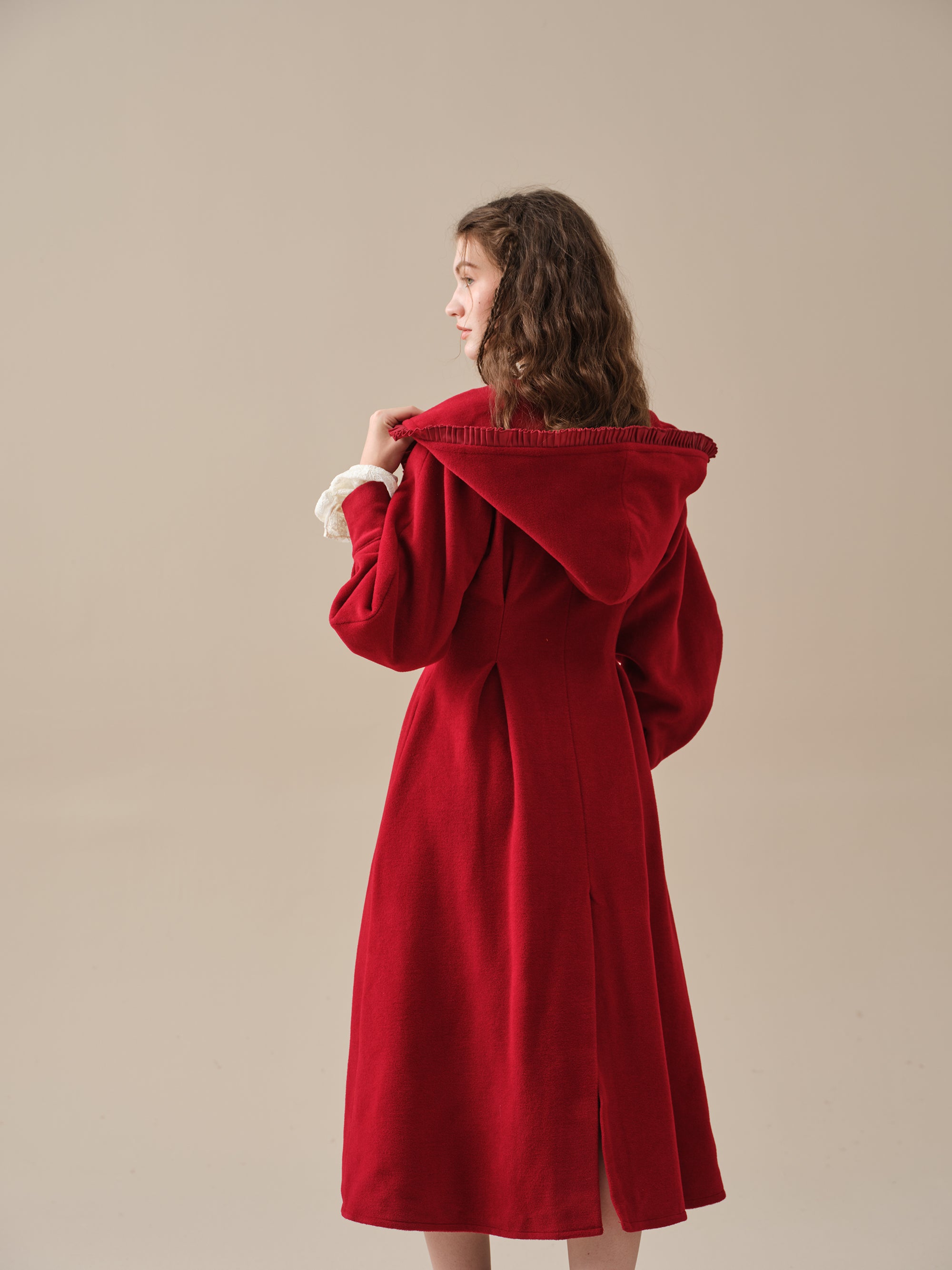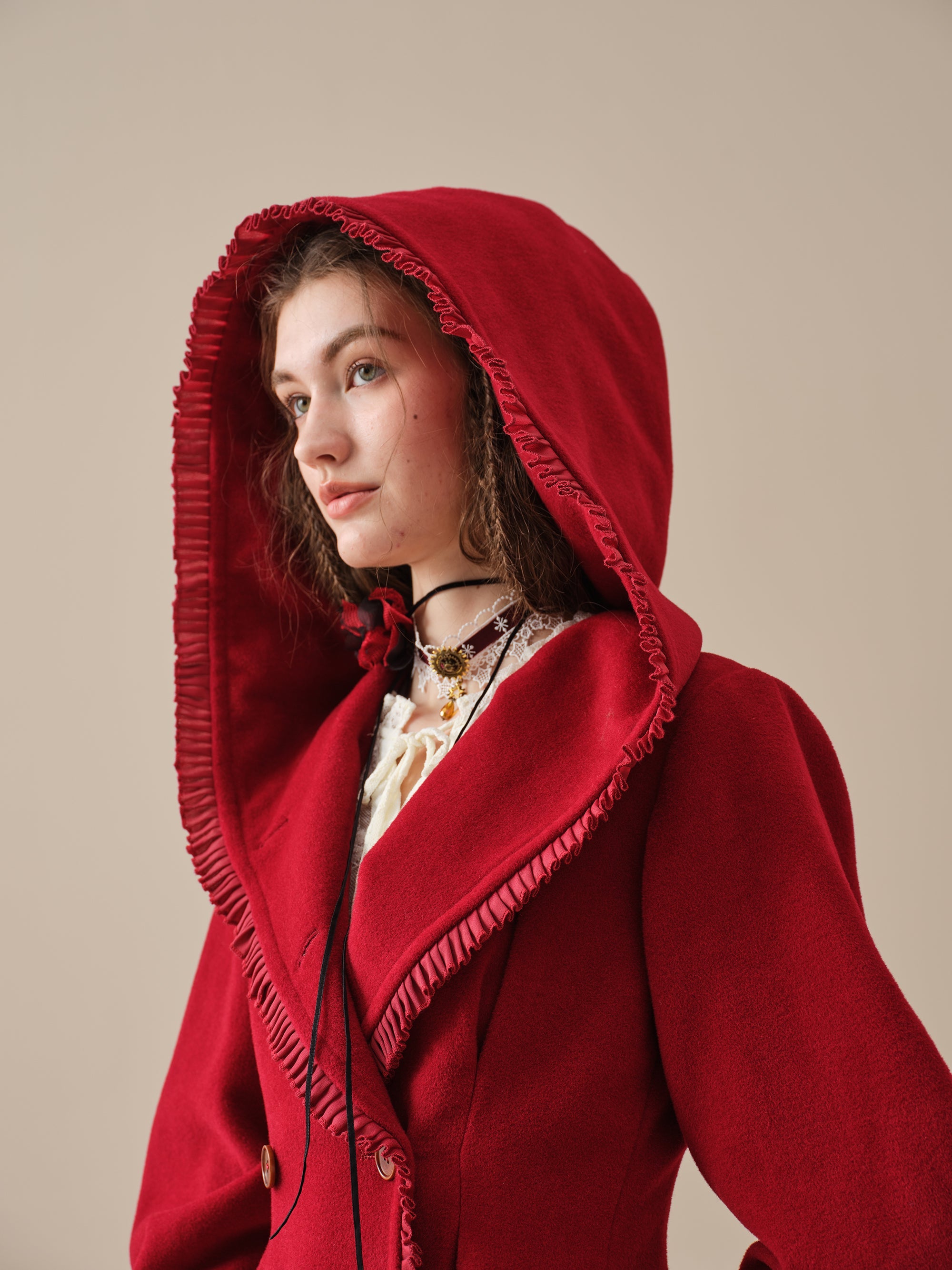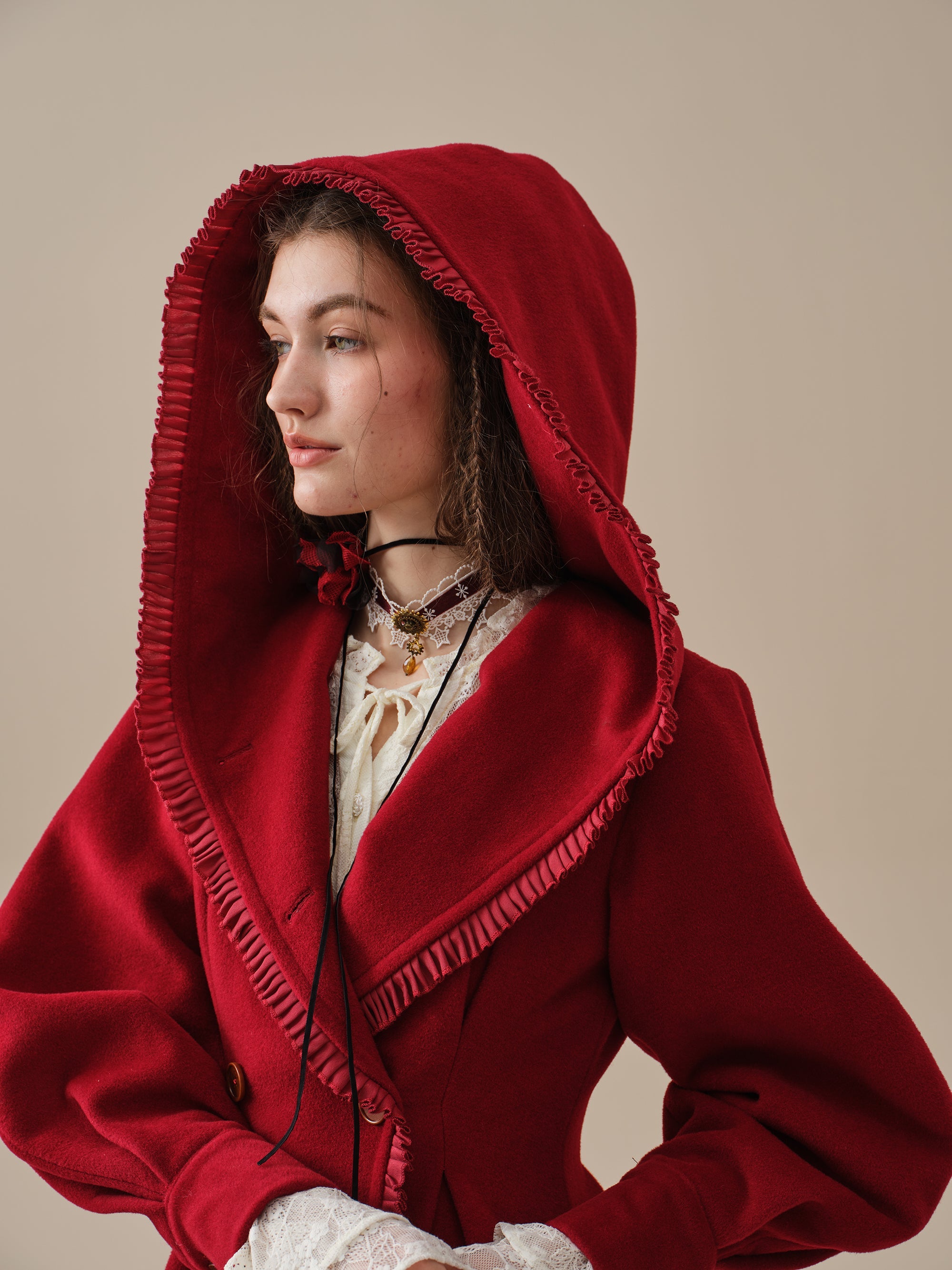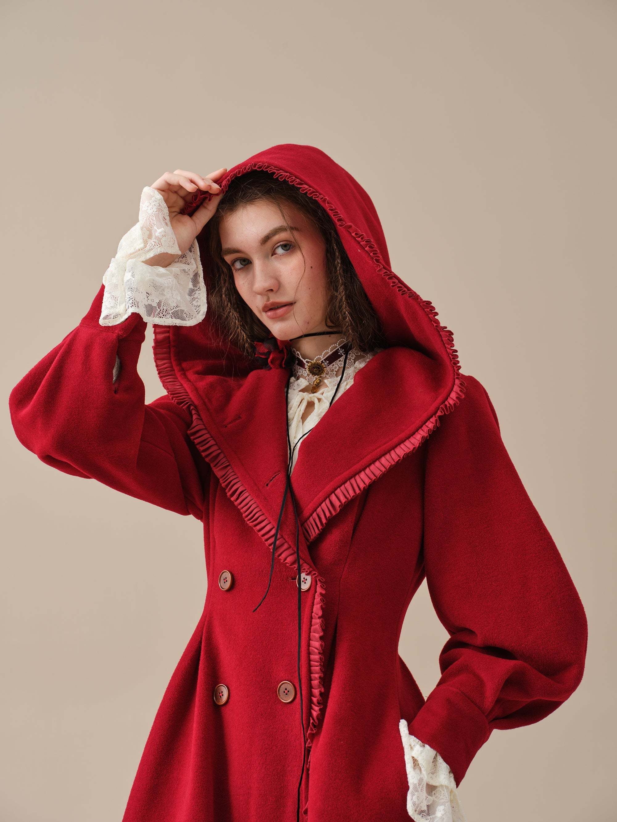 The generously-sized hood, reminiscent of fairytale coats, offers both protection against the elements and a touch of whimsy. The delicate ruffle trims akin to the petals of a blossoming flower, flutter playfully in the breeze, infusing your every step with a sense of enchantment.