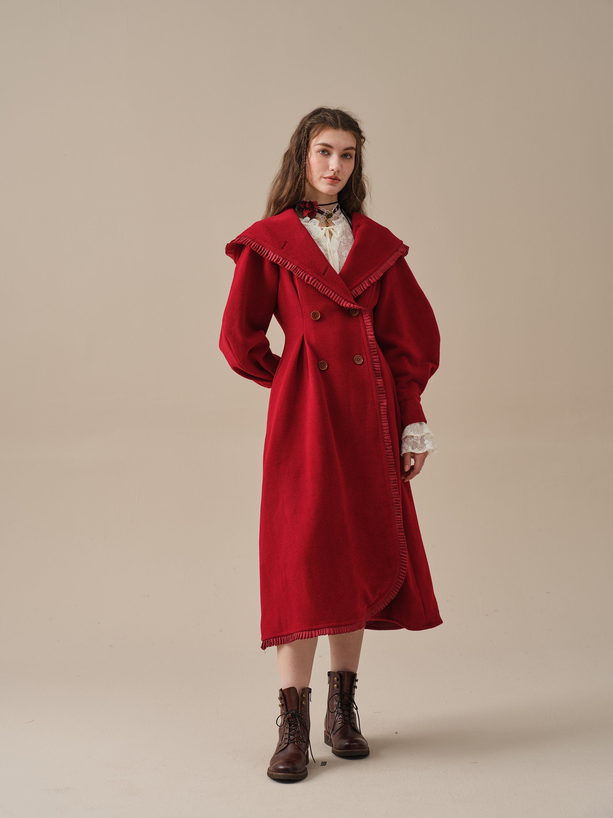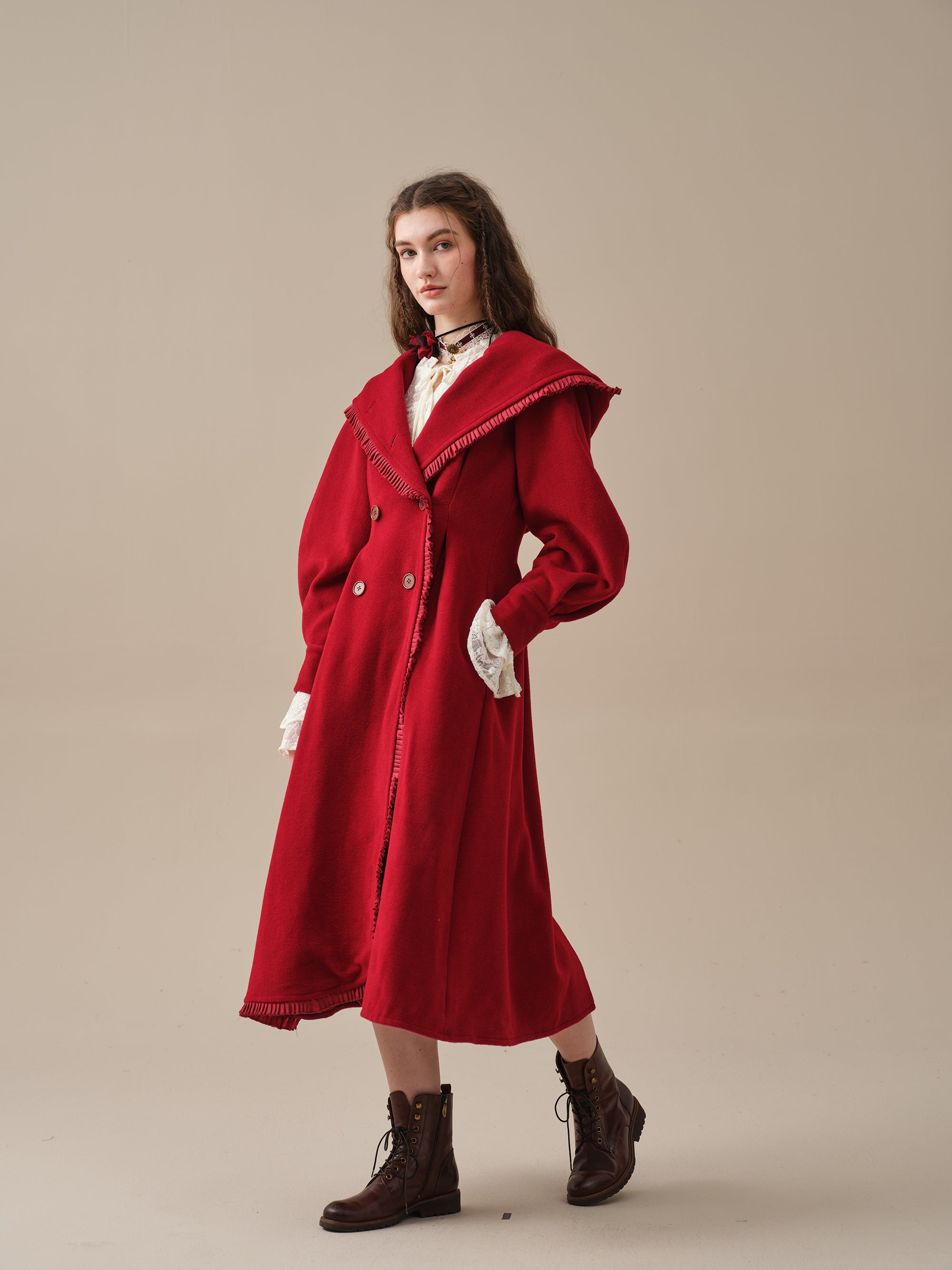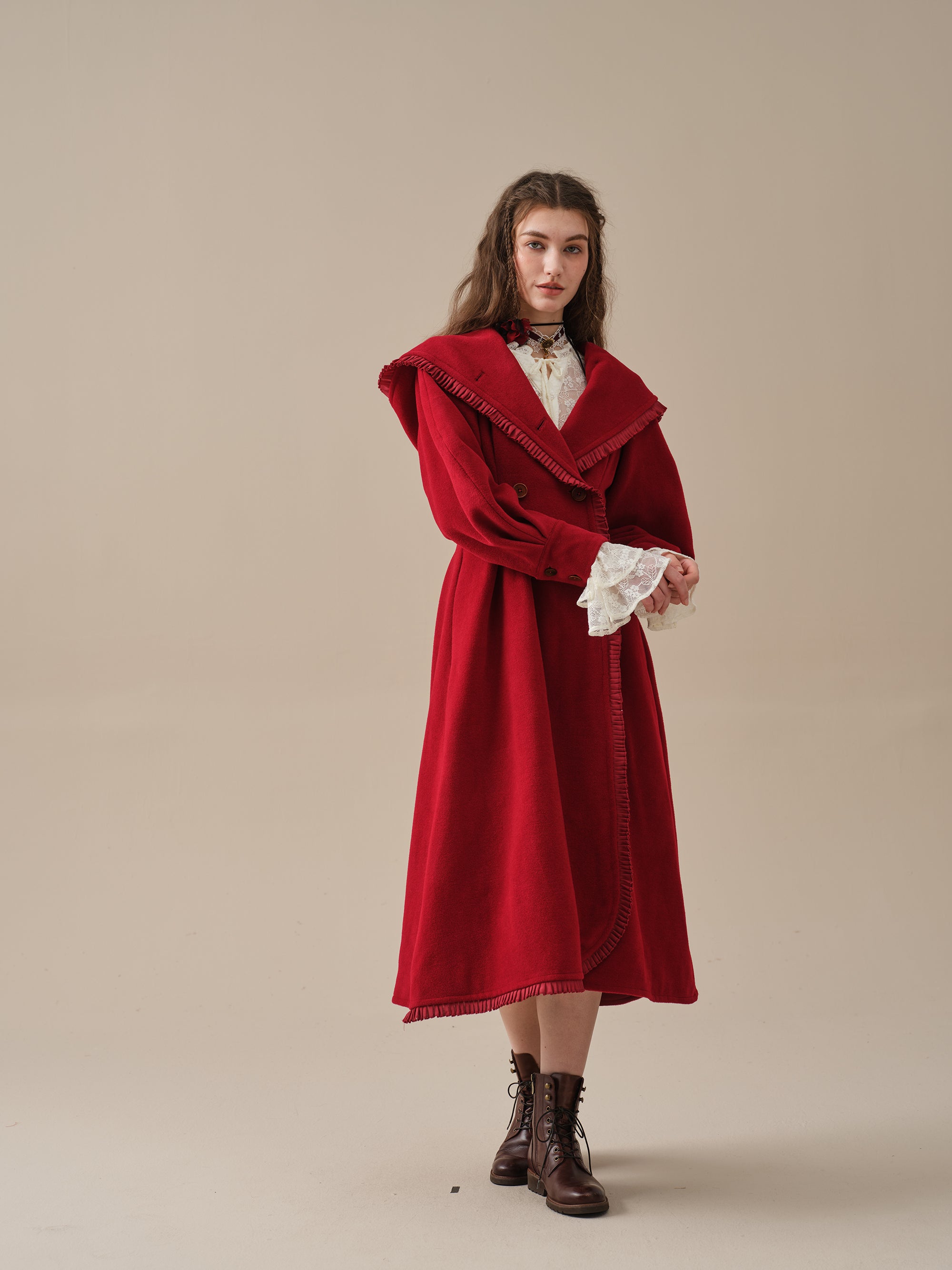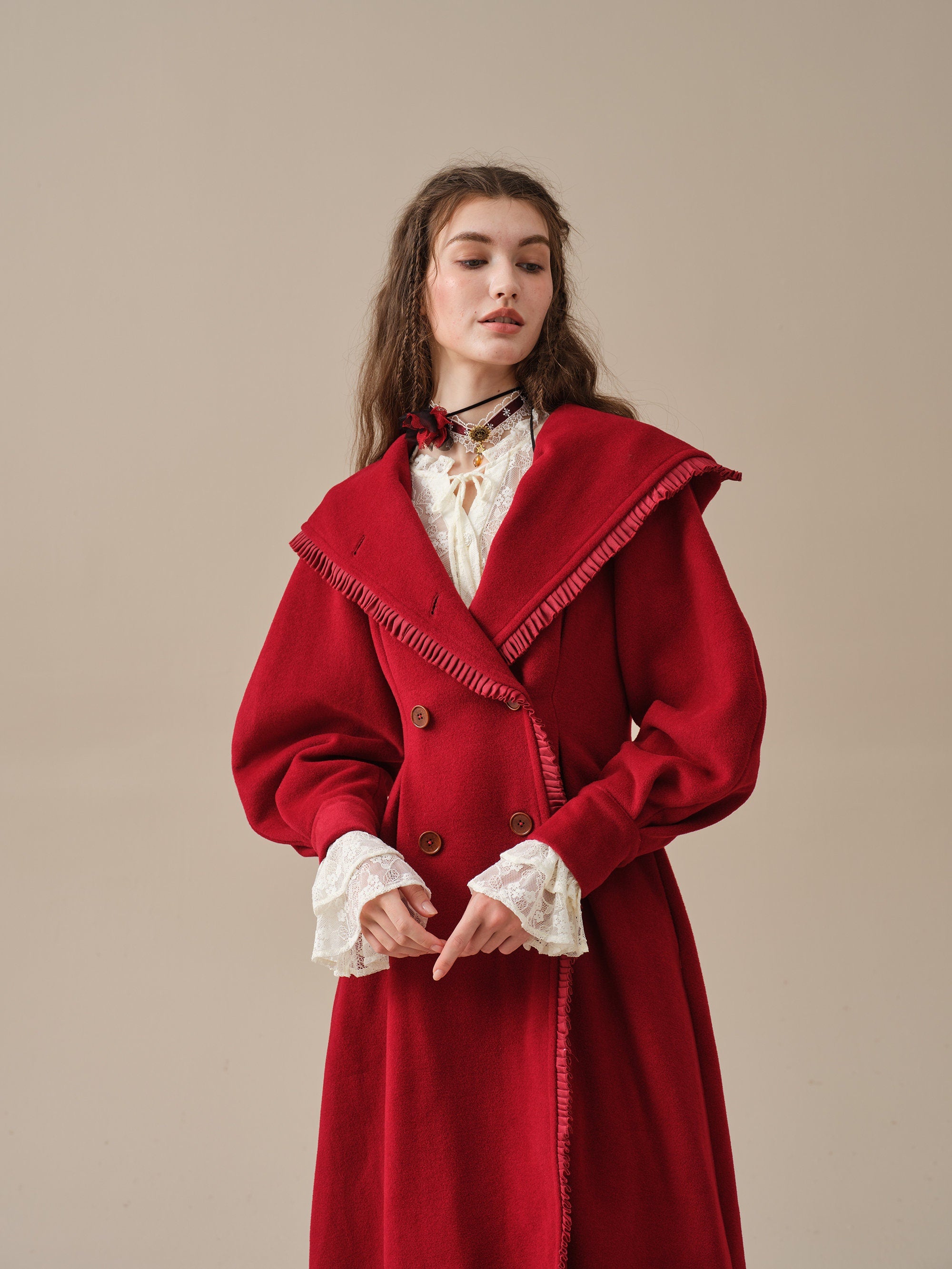 The generously-sized hood, reminiscent of fairytale coats, offers both protection against the elements and a touch of whimsy. The delicate ruffle trims akin to the petals of a blossoming flower, flutter playfully in the breeze, infusing your every step with a sense of enchantment.