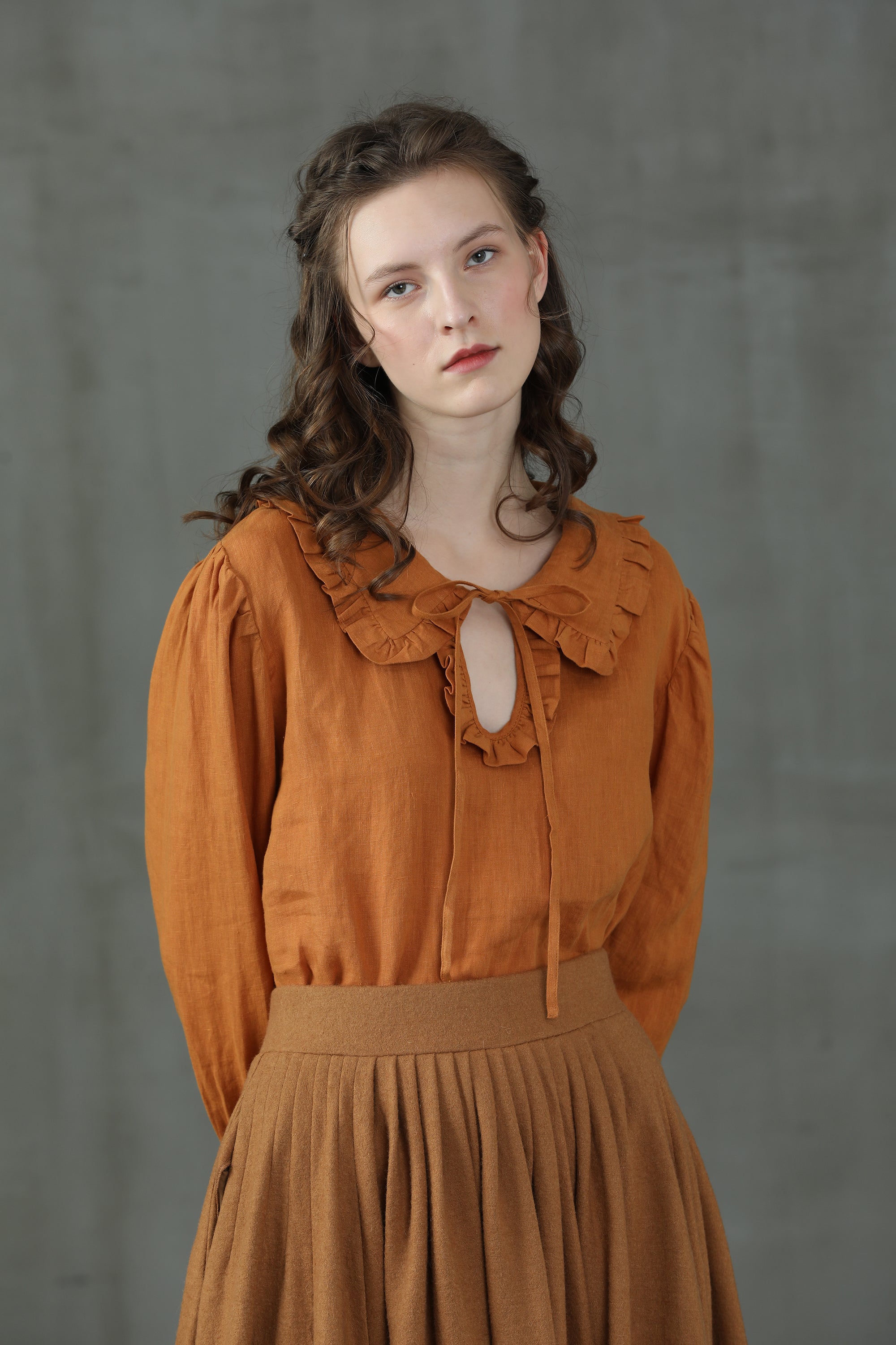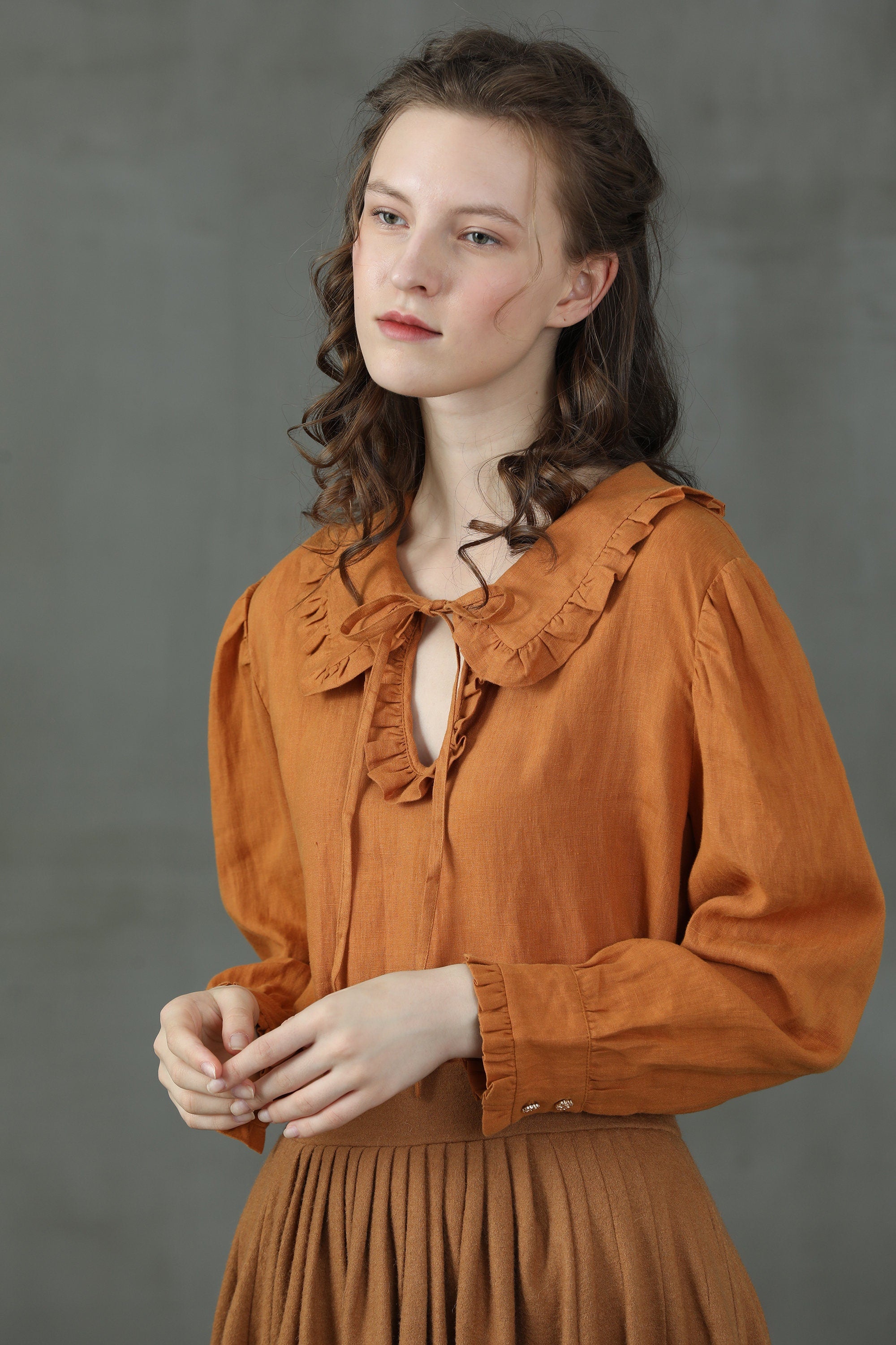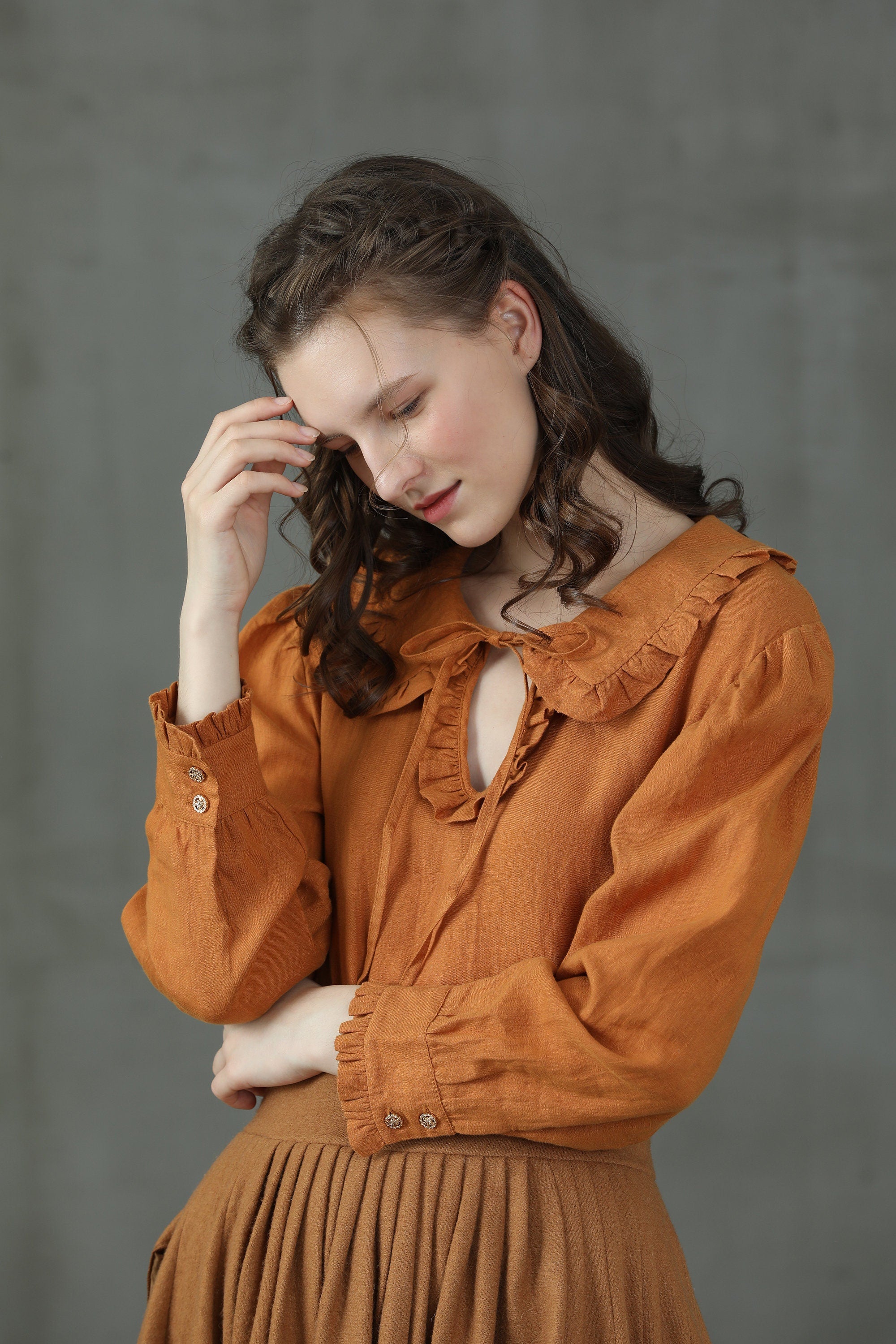 It's time to update your formal wardrobe. A cross between a shirt and blouse, this piece from linennaive boasts a round split neck version of the ruffled peter-pan collar and a front lace-up fastening. A shirt, but a little different.