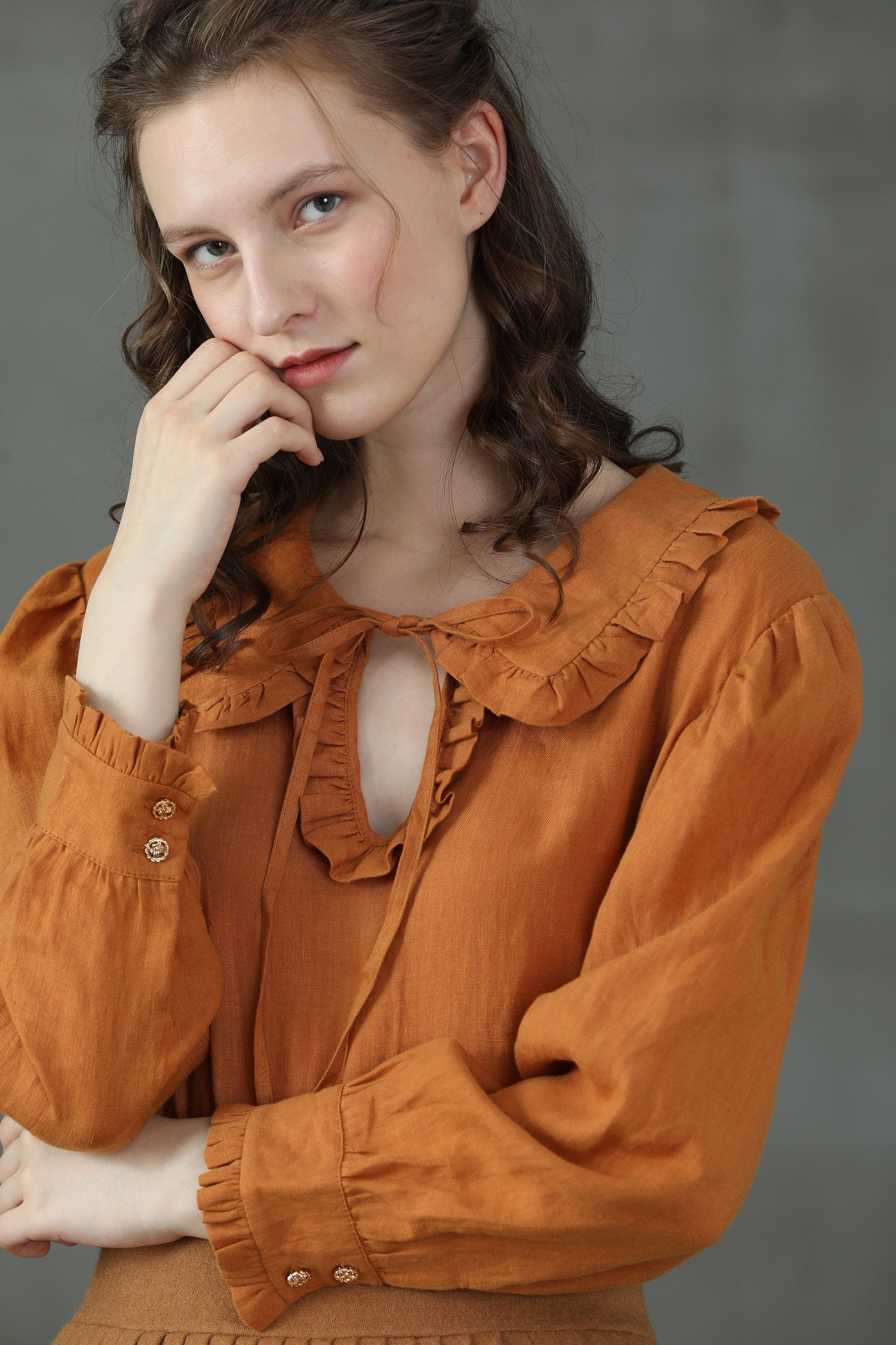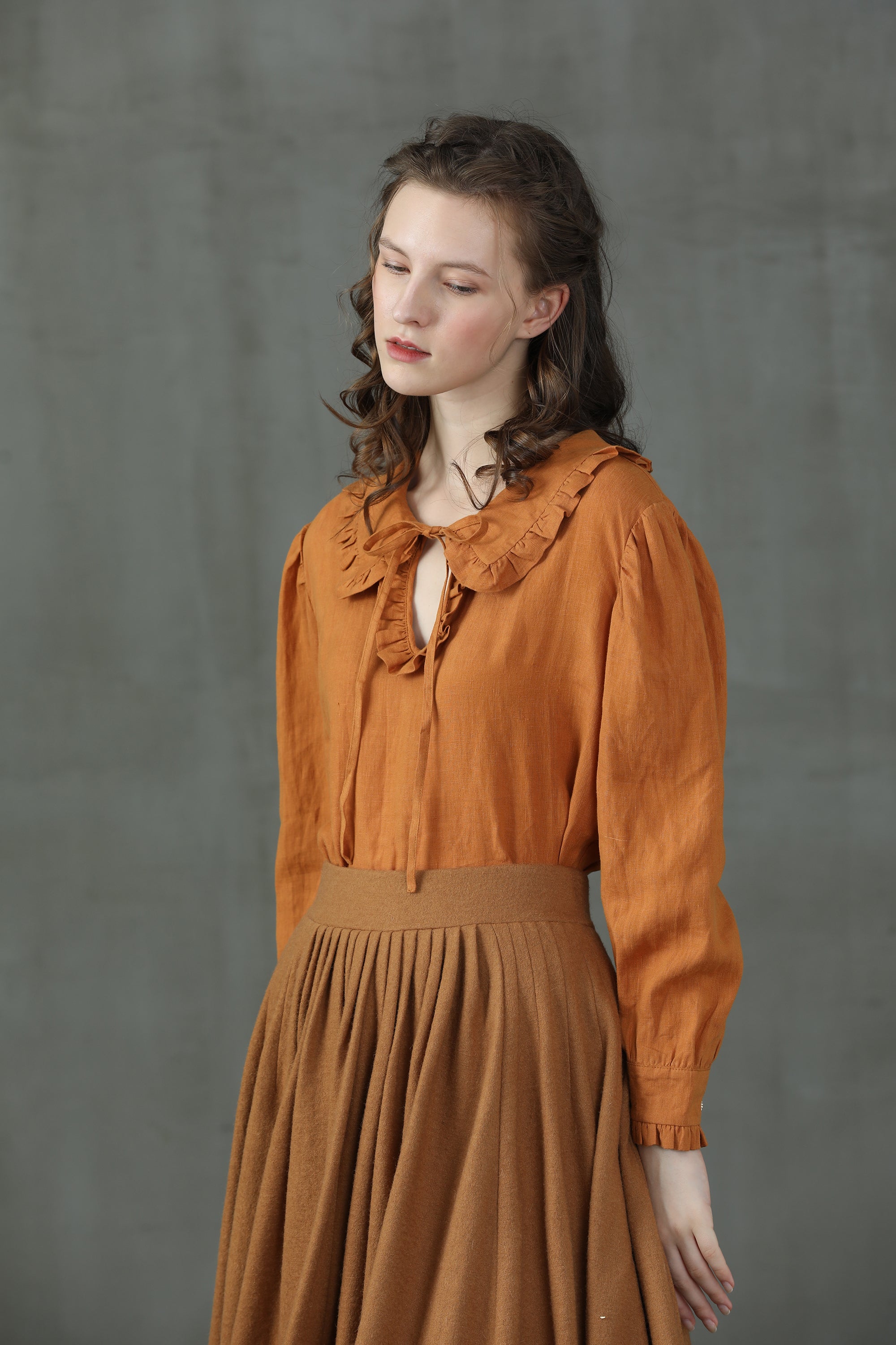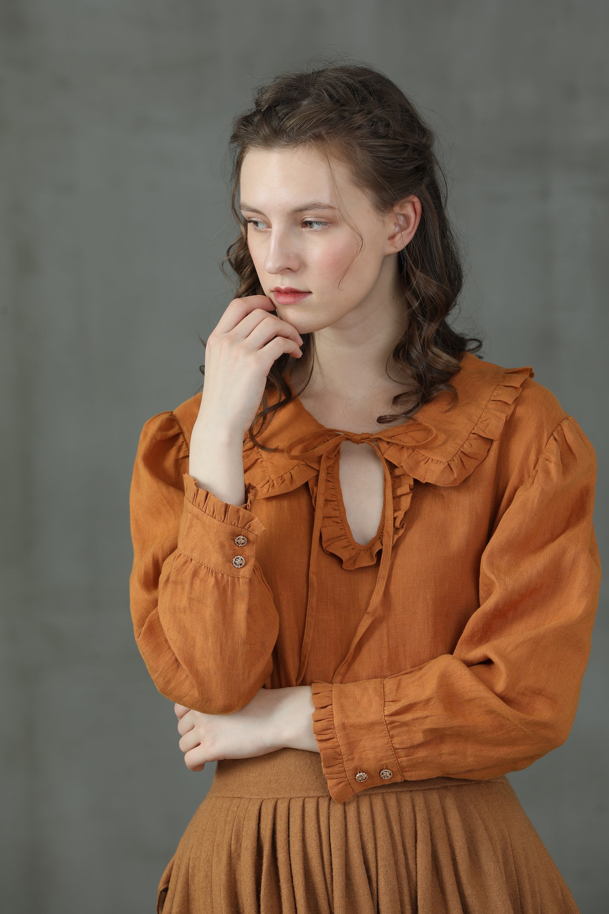 It's time to update your formal wardrobe. A cross between a shirt and blouse, this piece from linennaive boasts a round split neck version of the ruffled peter-pan collar and a front lace-up fastening. A shirt, but a little different.