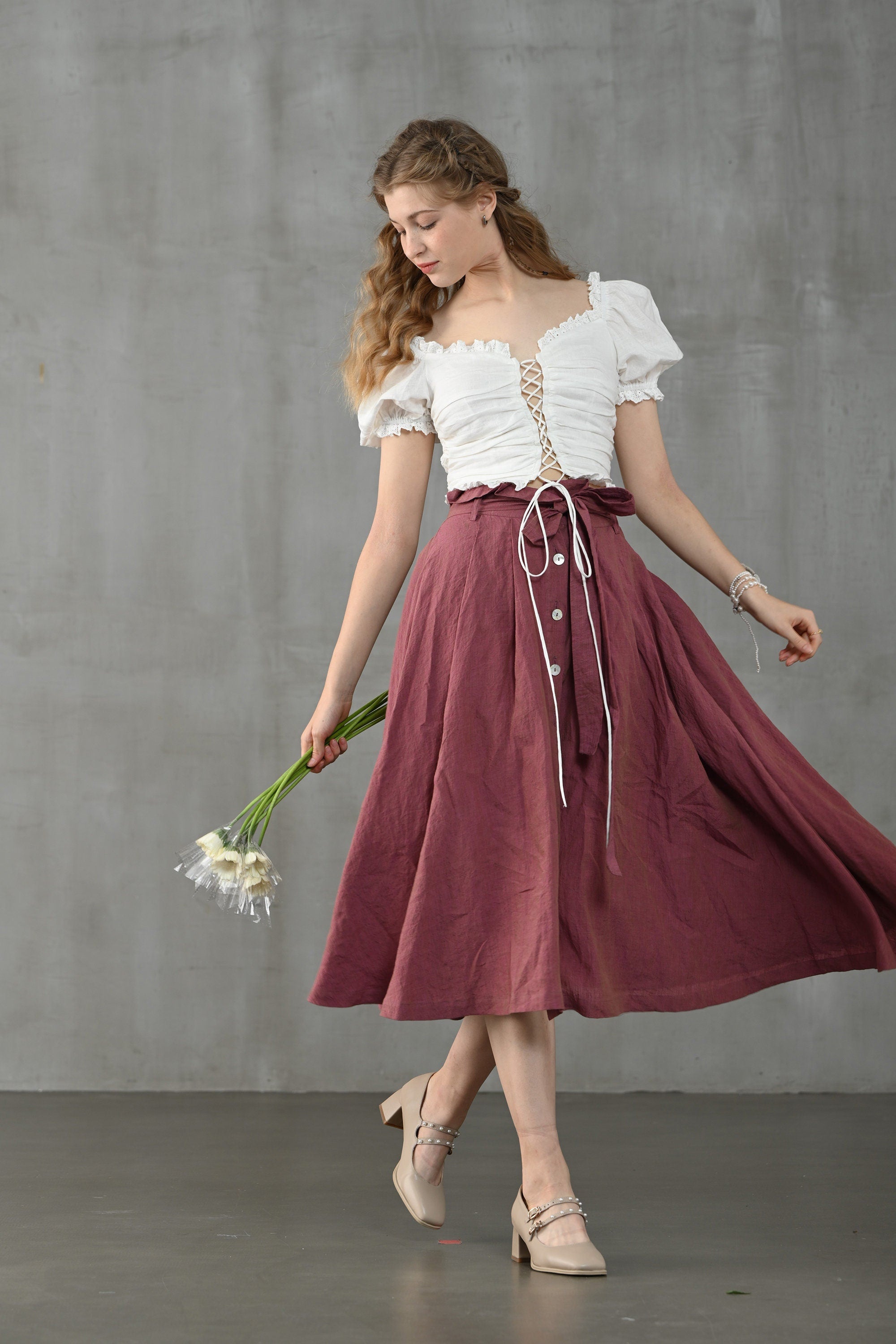 Cut from lightweight linen, this blouse features sweet puff sleeves and a ruched bodice, for a detailed but timeless silhouette. pairs a lace design with ruffled detailing to creating an effortlessly refined look.