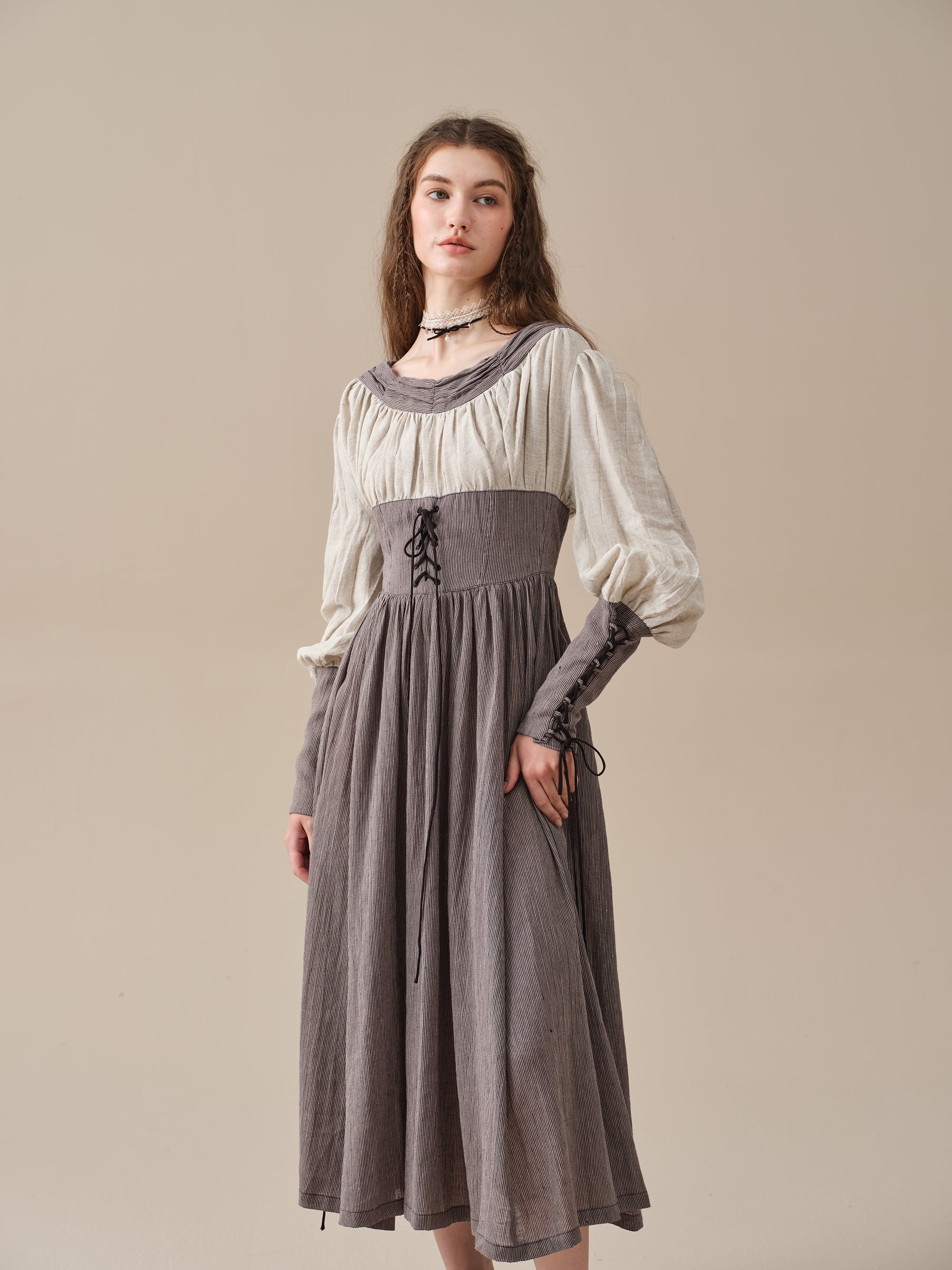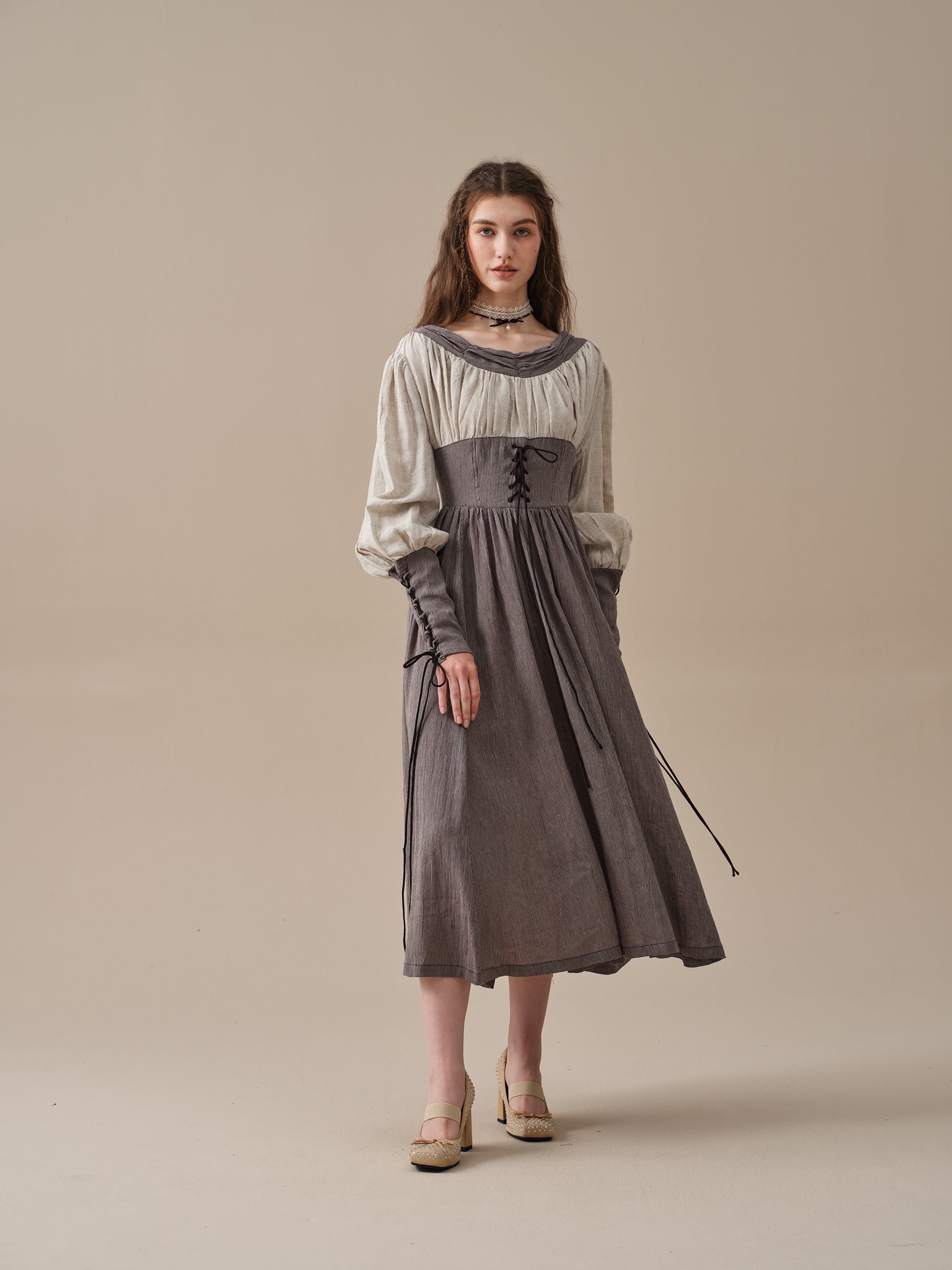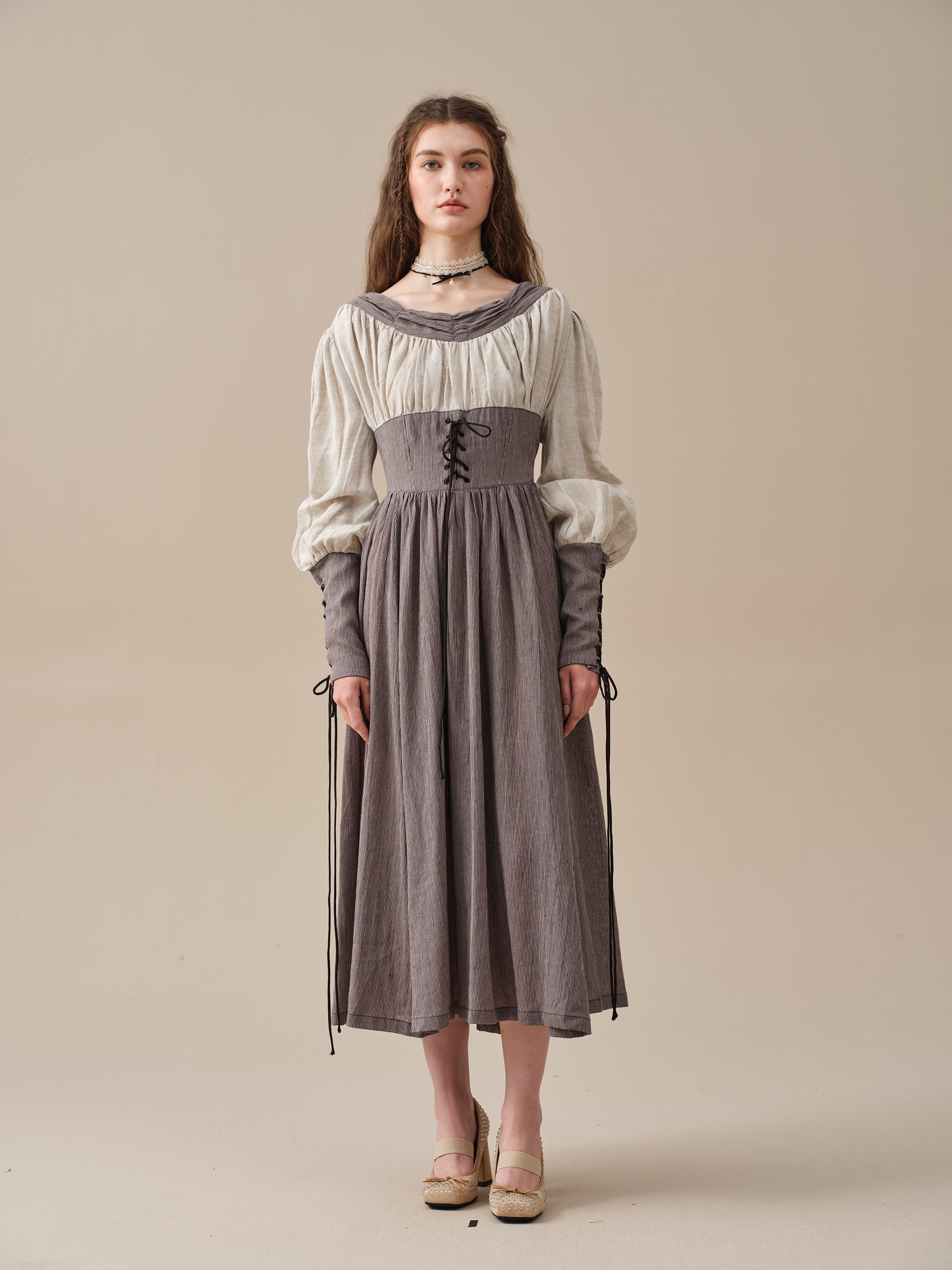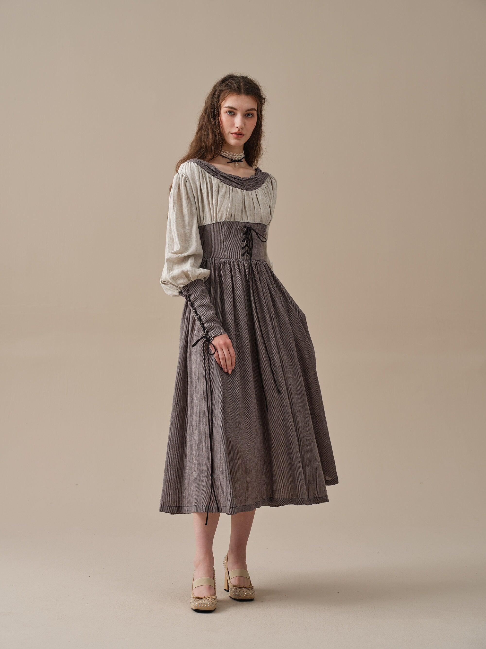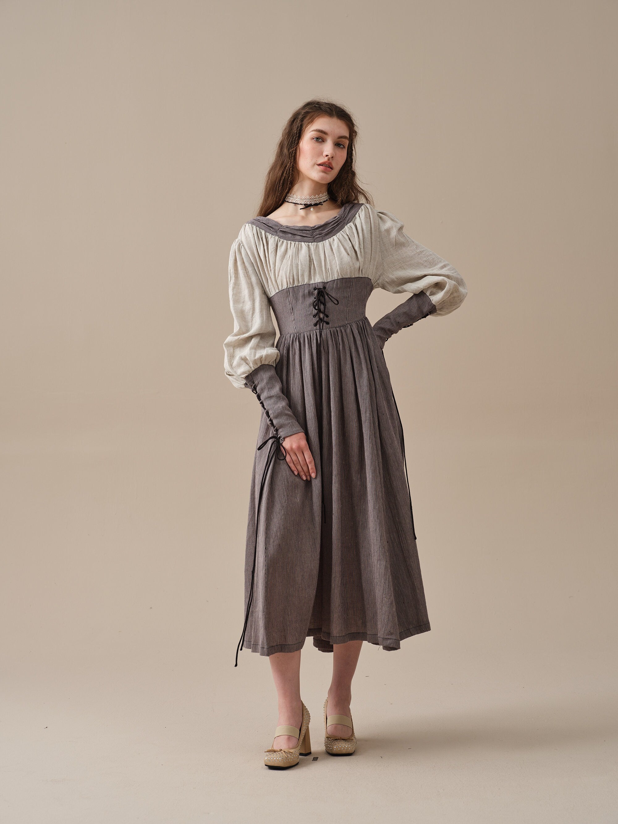 Inspired by vintage fashion, this dress captures the essence of femininity and romance.The pleated detail at the neckline adds sophistication while giving it a whimsical feel. The lace up at the waist and sleeves adds a romantic touch to the piece.