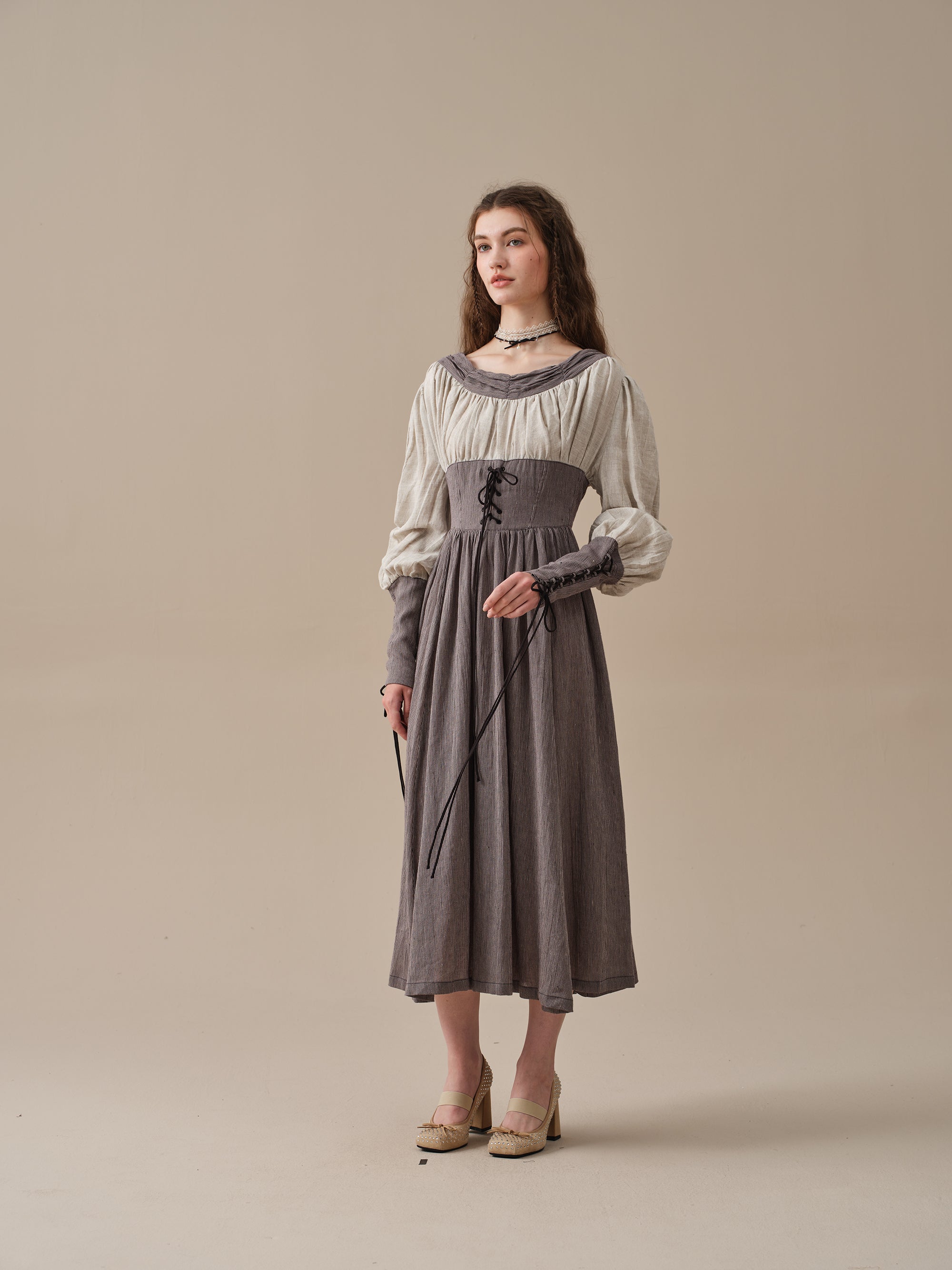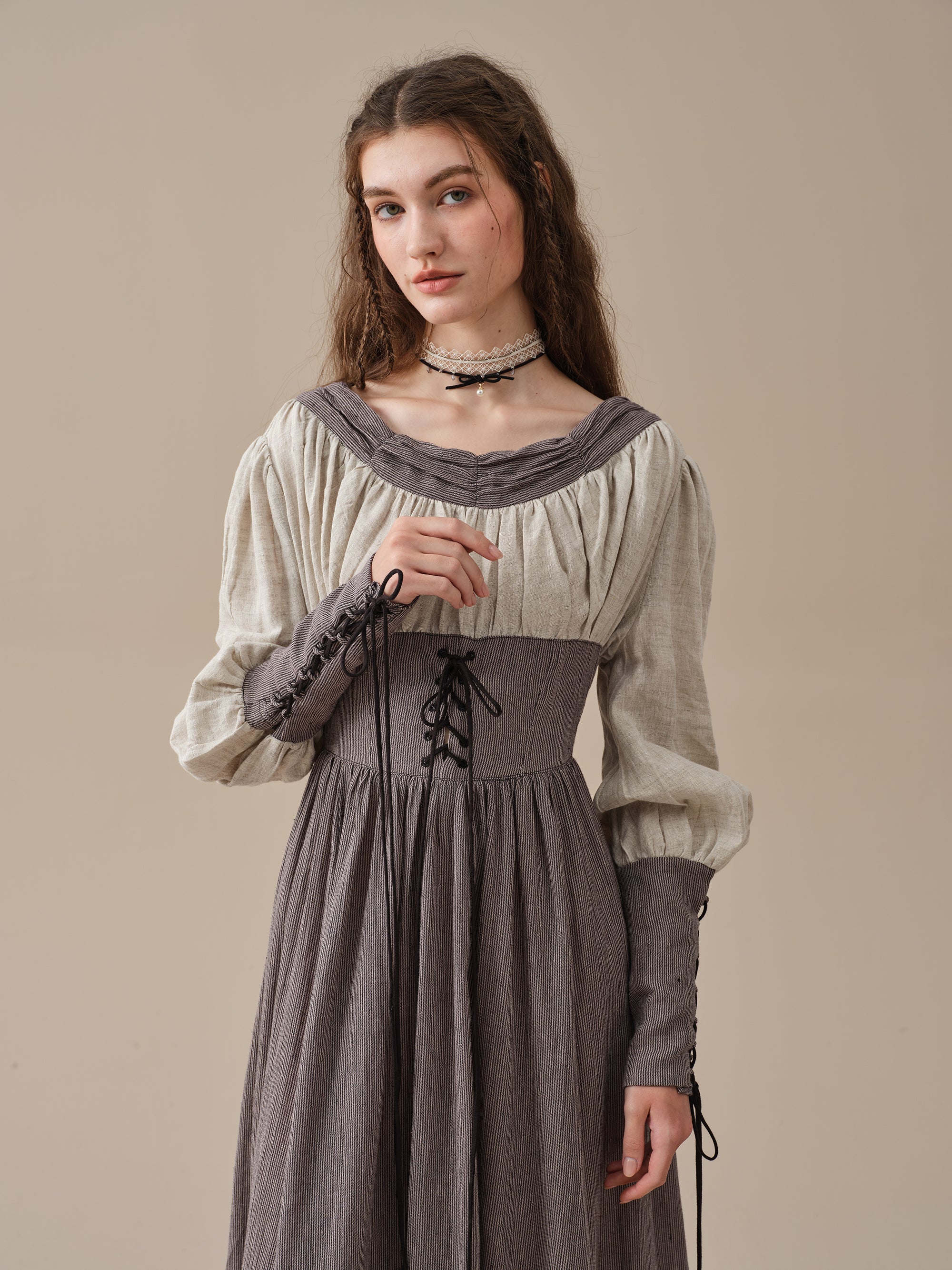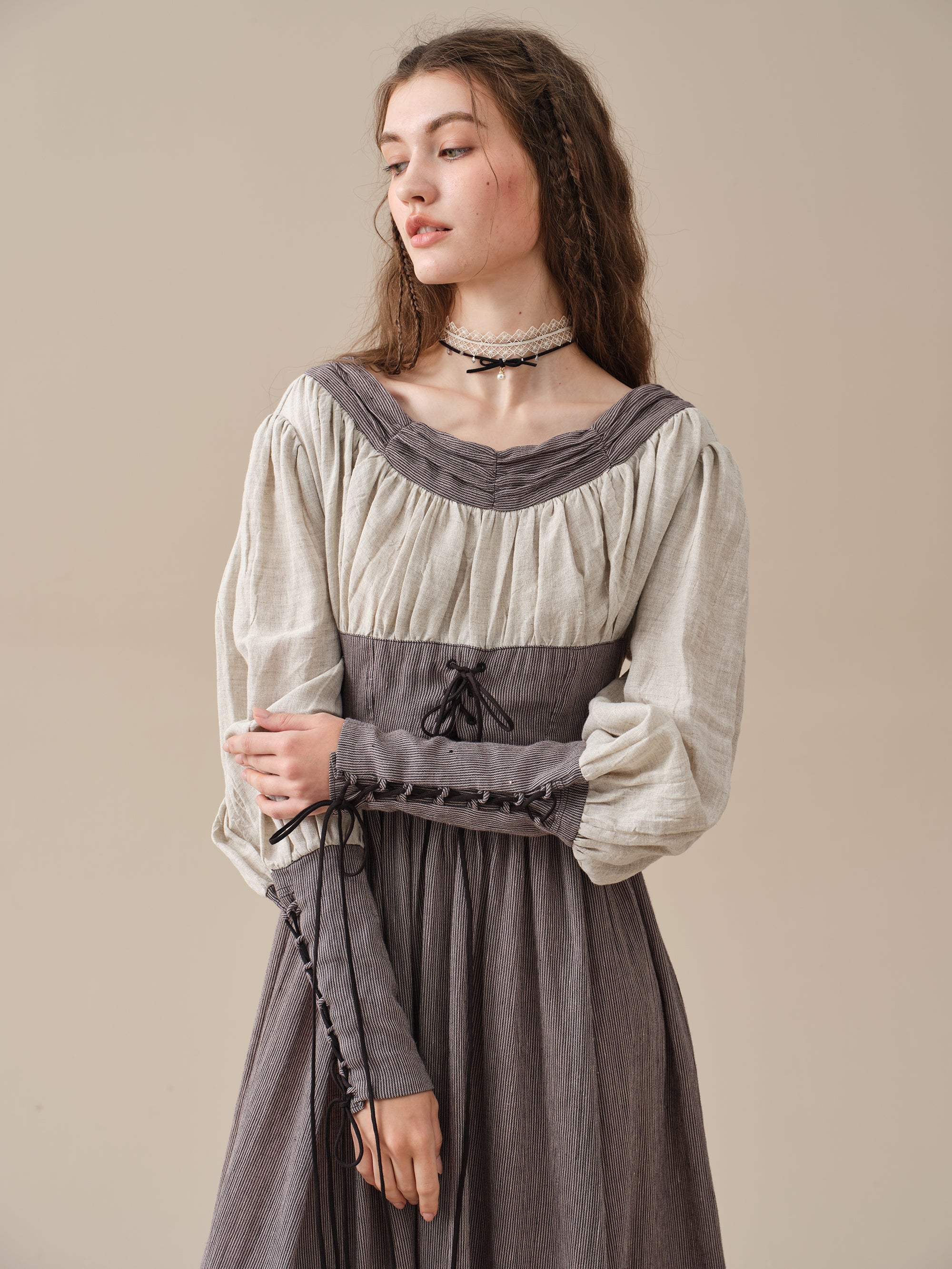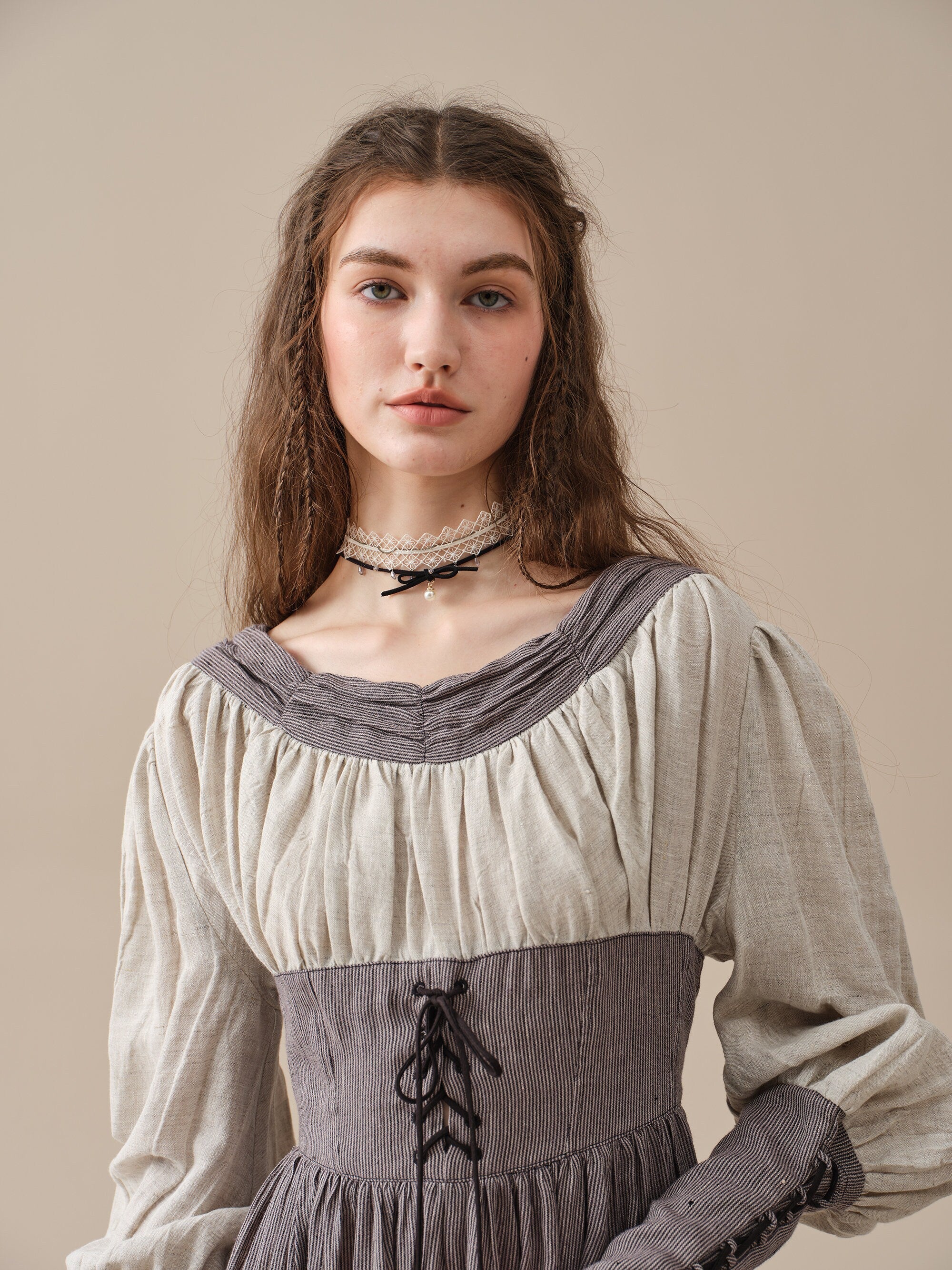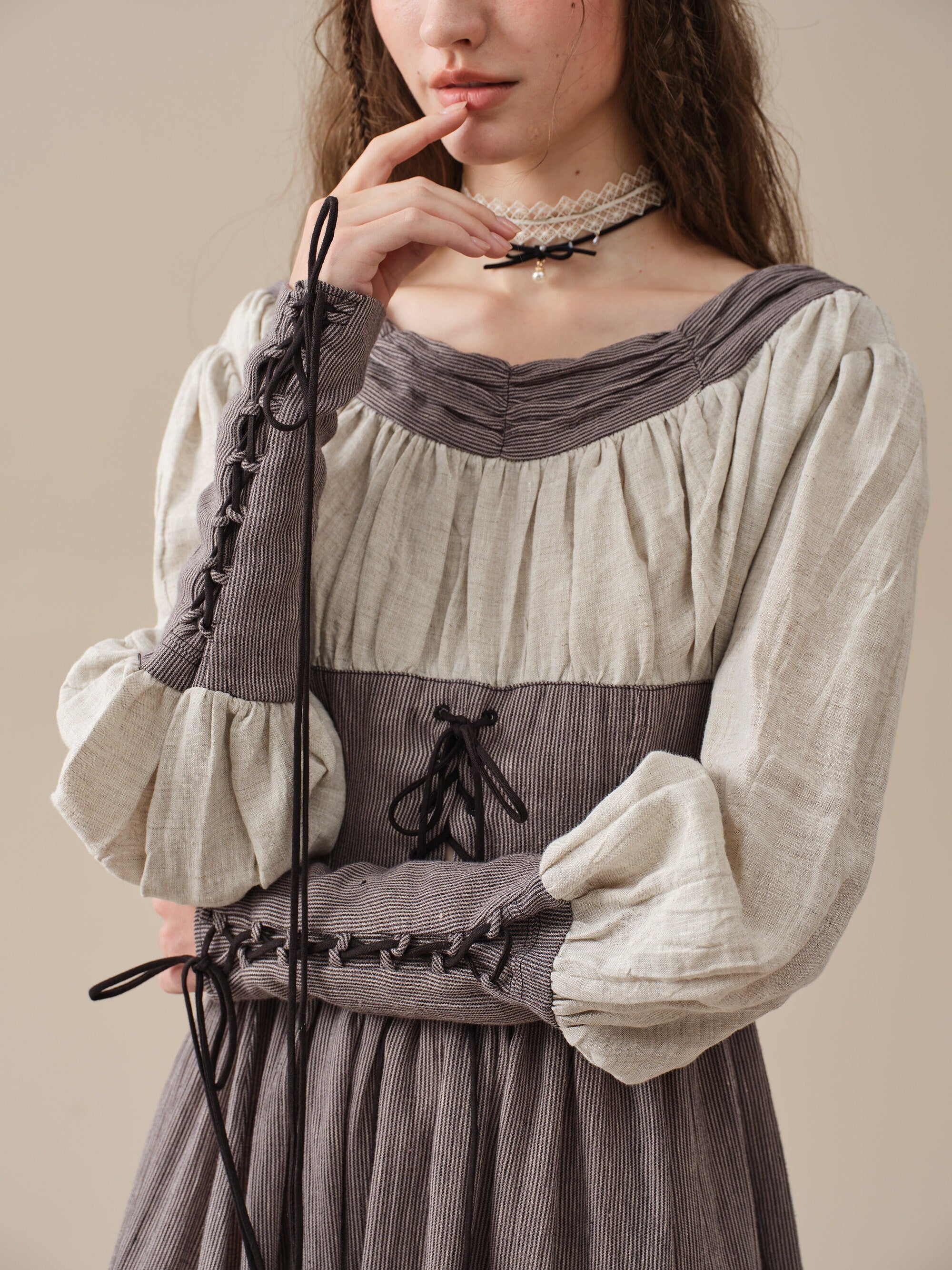 Inspired by vintage fashion, this dress captures the essence of femininity and romance.The pleated detail at the neckline adds sophistication while giving it a whimsical feel. The lace up at the waist and sleeves adds a romantic touch to the piece.