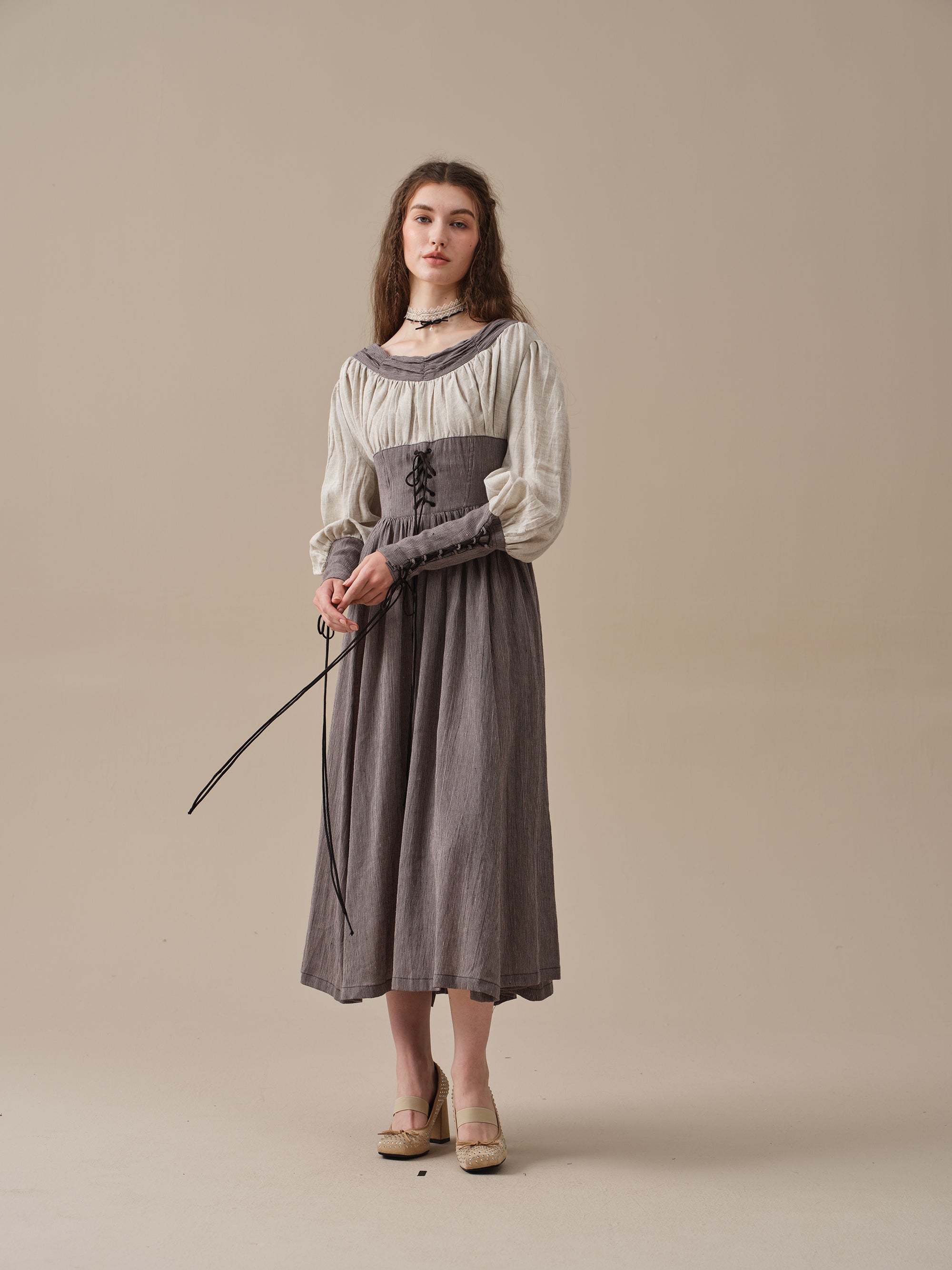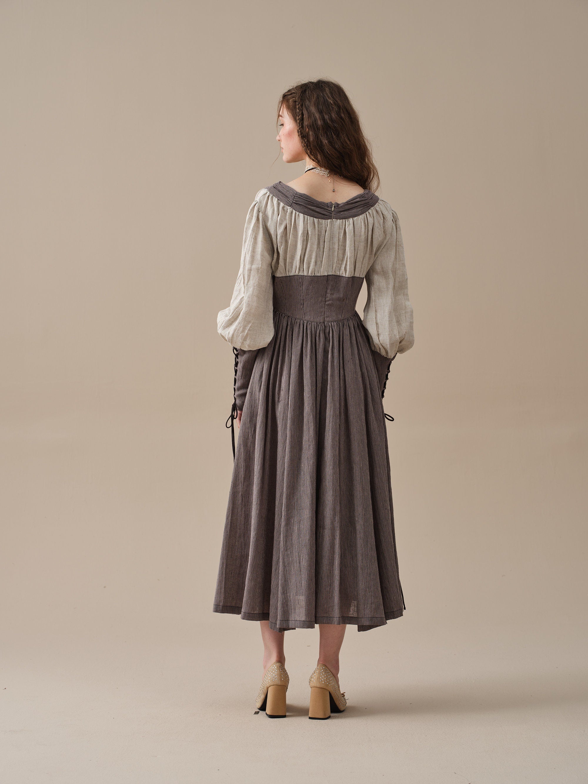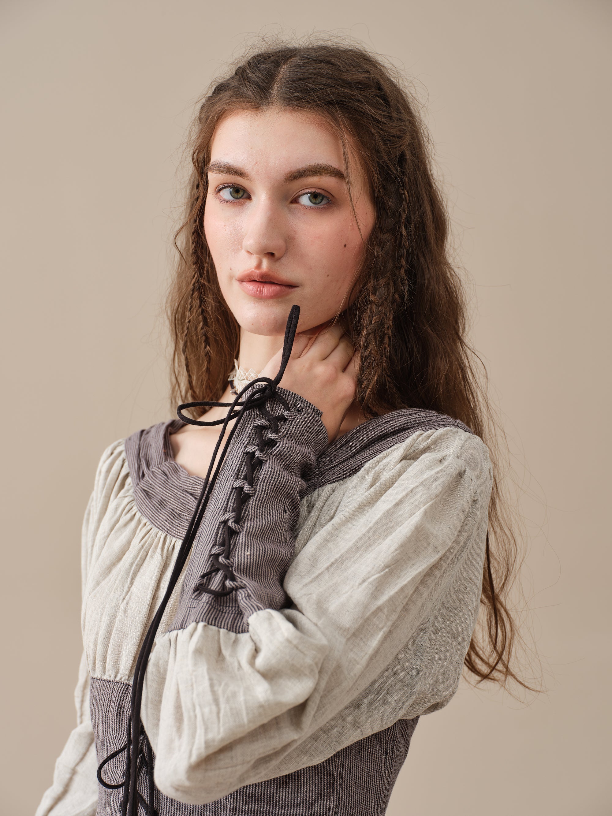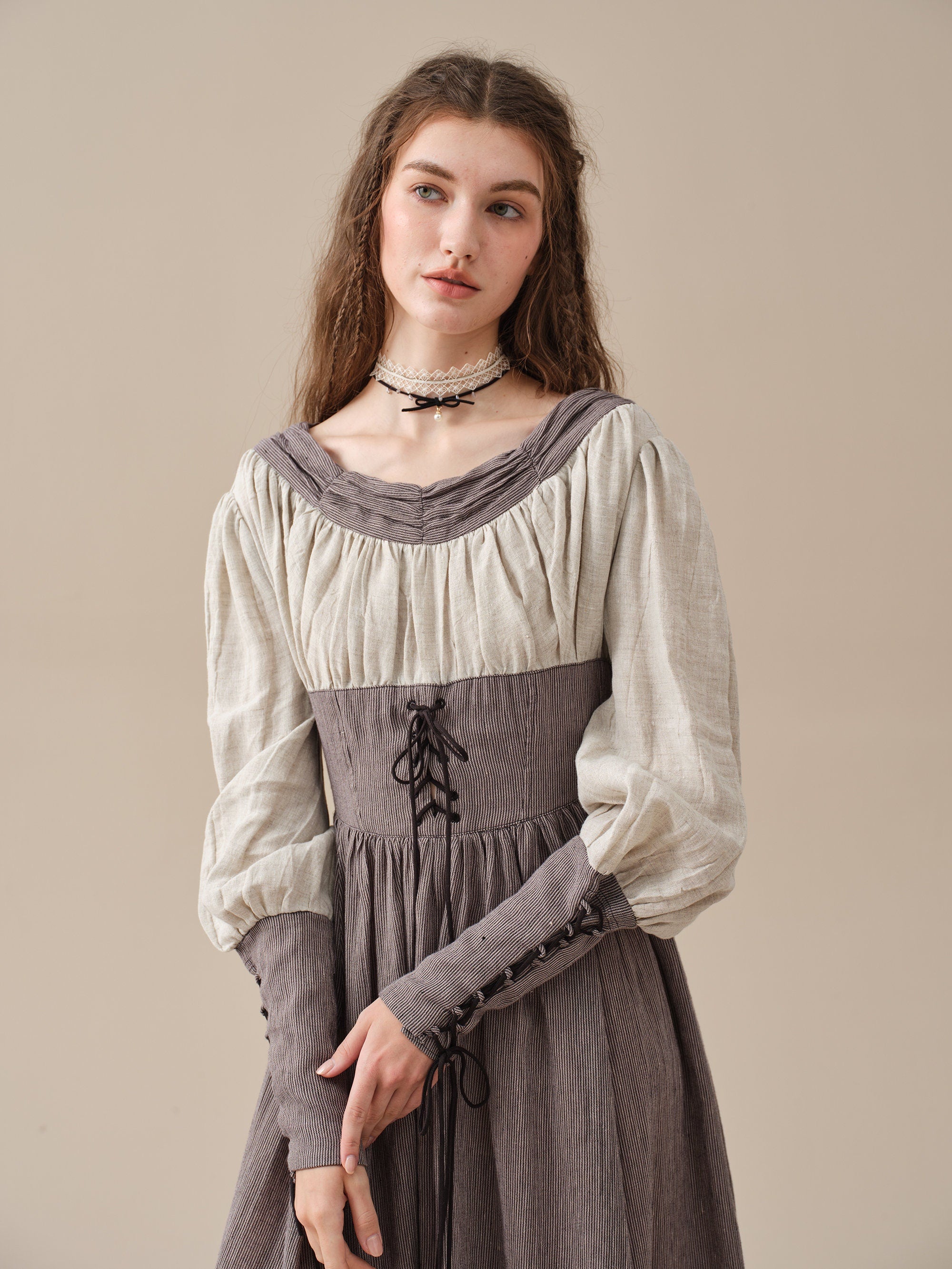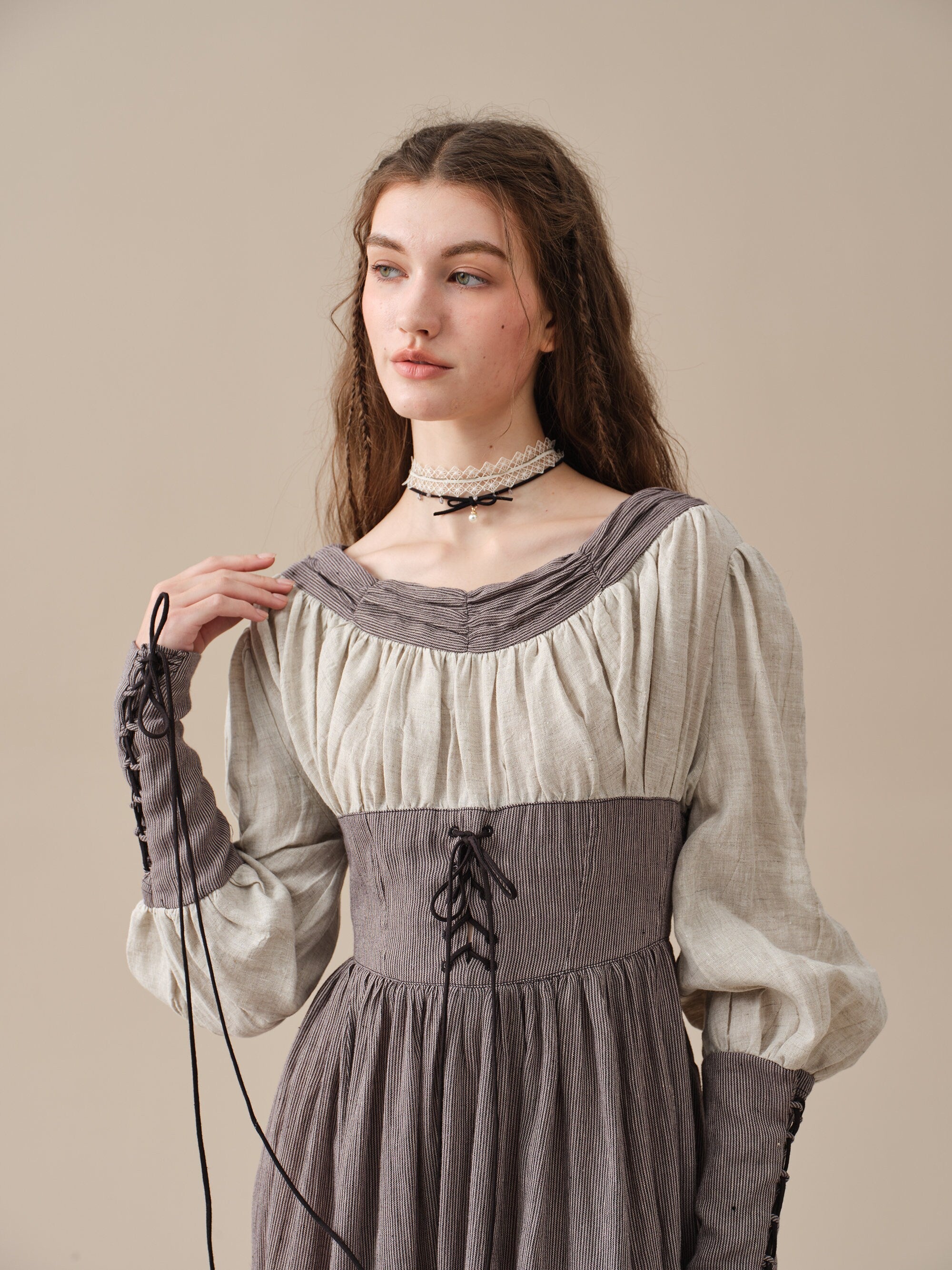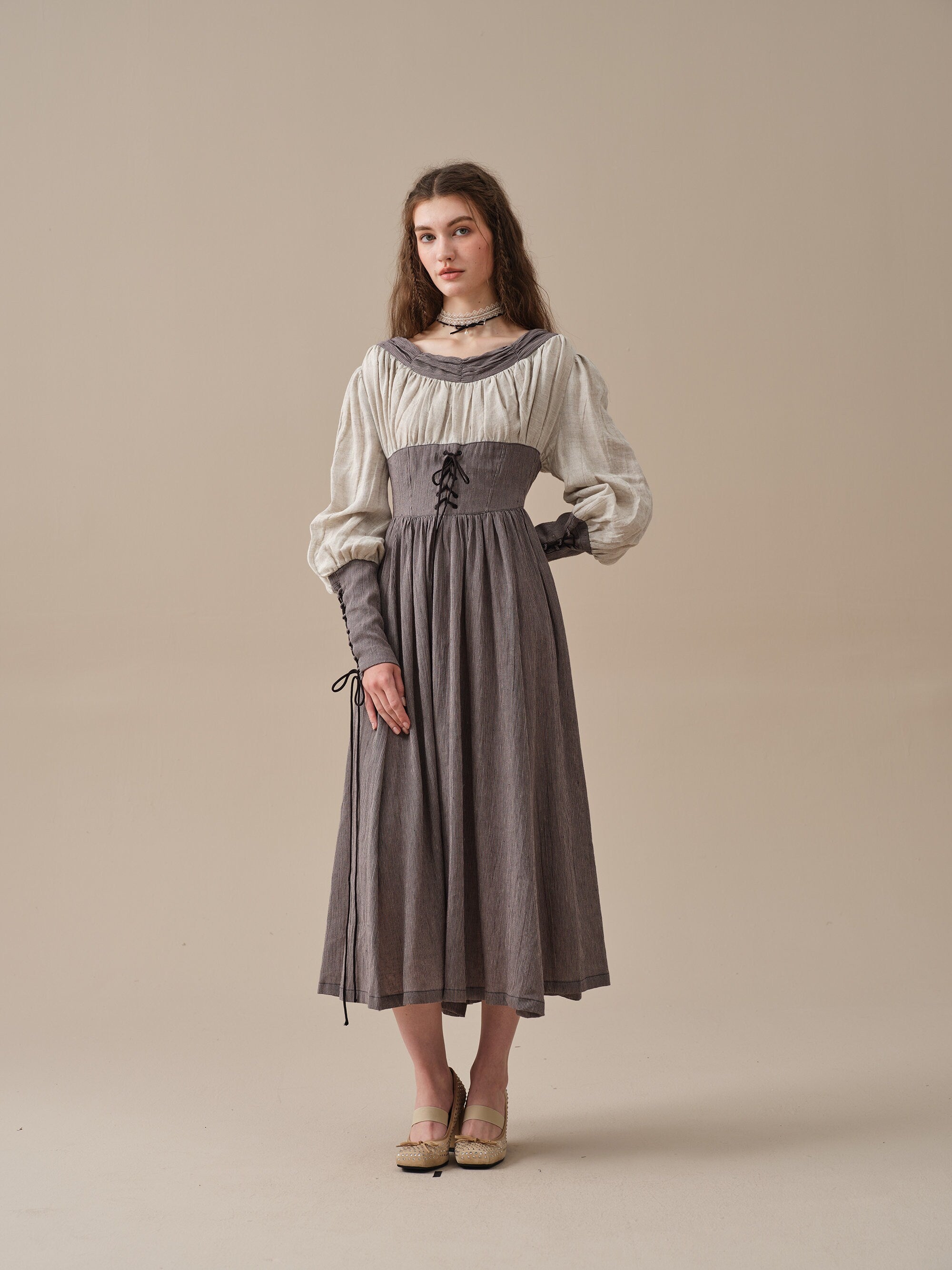 Inspired by vintage fashion, this dress captures the essence of femininity and romance.The pleated detail at the neckline adds sophistication while giving it a whimsical feel. The lace up at the waist and sleeves adds a romantic touch to the piece.